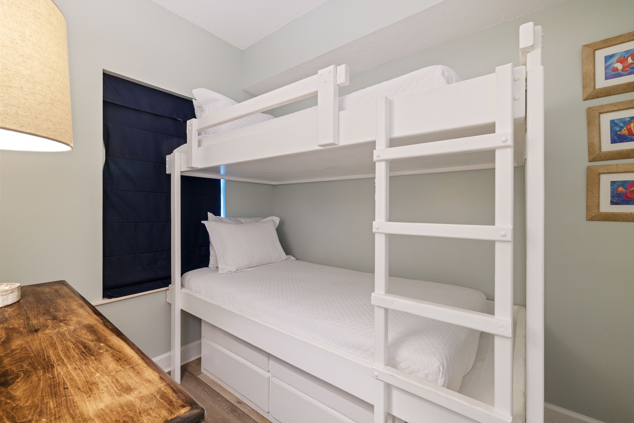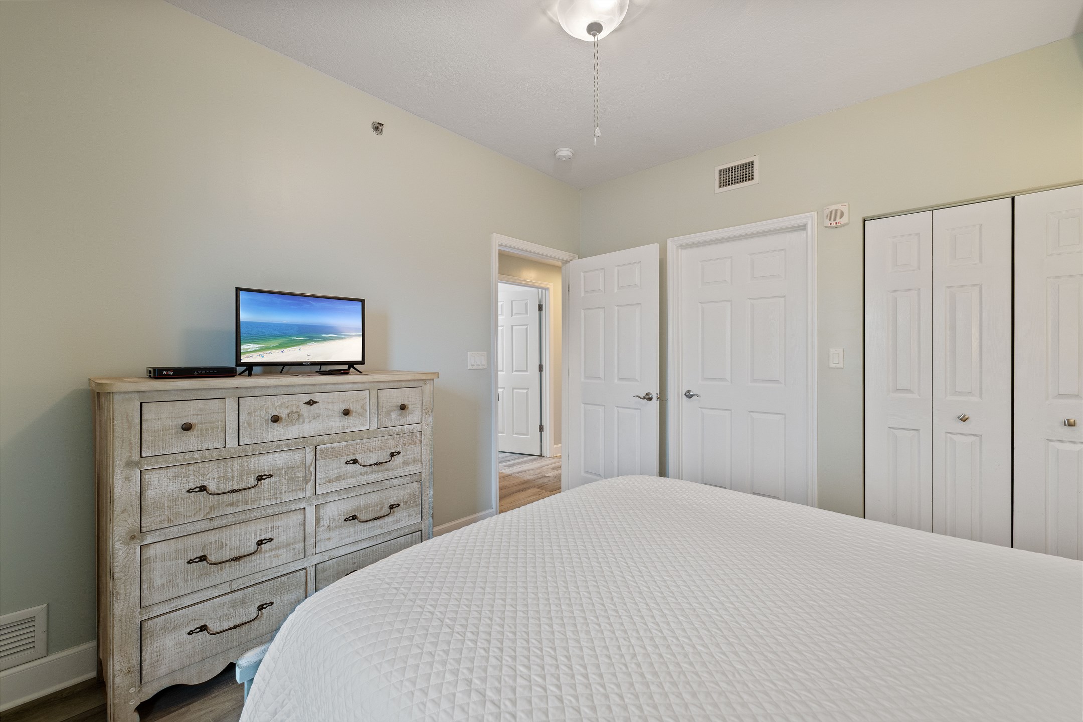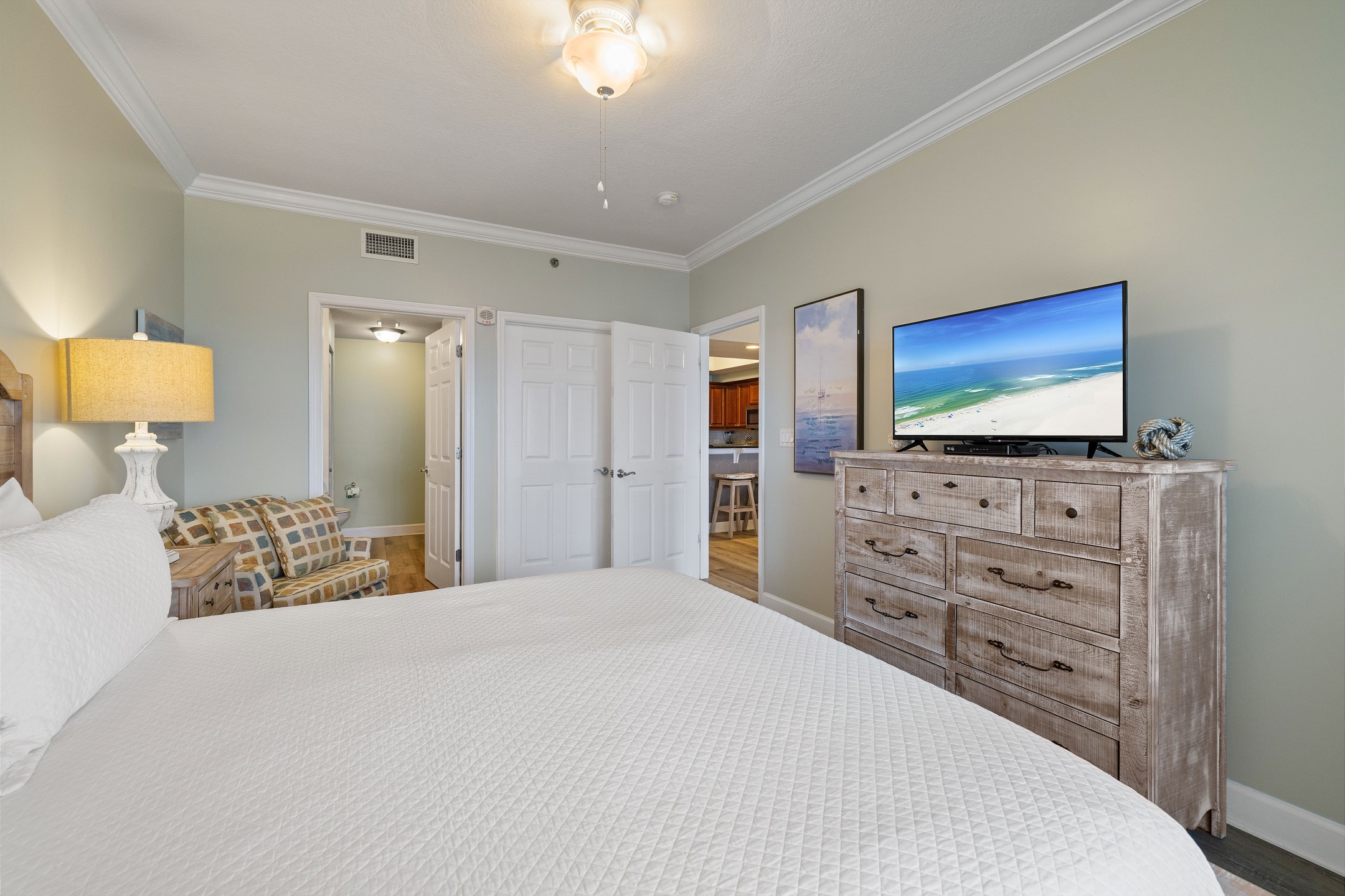 The primary bedroom boasts a king bed, balcony access, and an ensuite bathroom with a tiled walk-in shower. The second bedroom includes a queen bed and convenient access to a shared hall bathroom. The third bedroom is designed with twin-over-twin bunks, ideal for additional guests. The living room also features a queen sofa sleeper for extra accommodations.