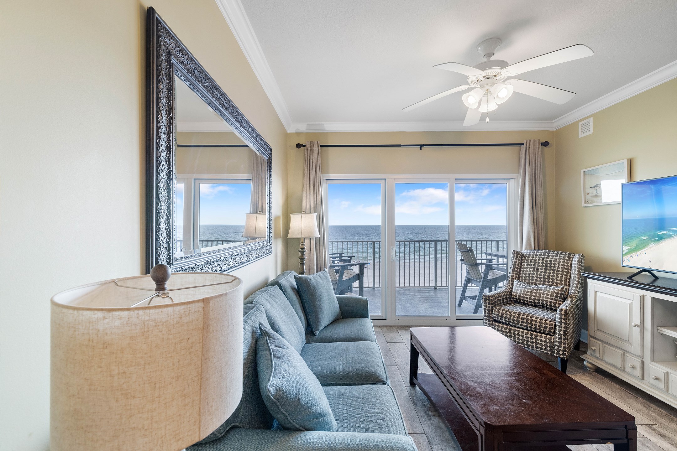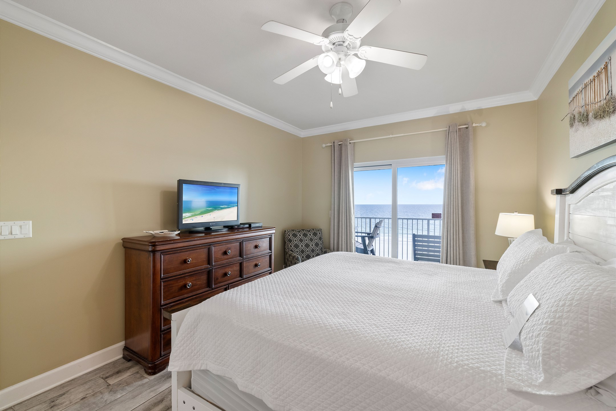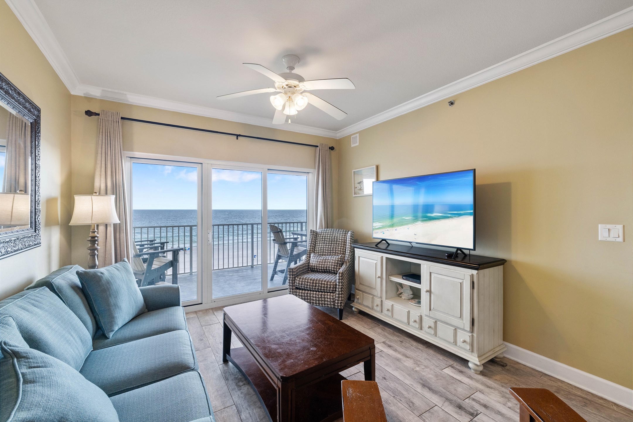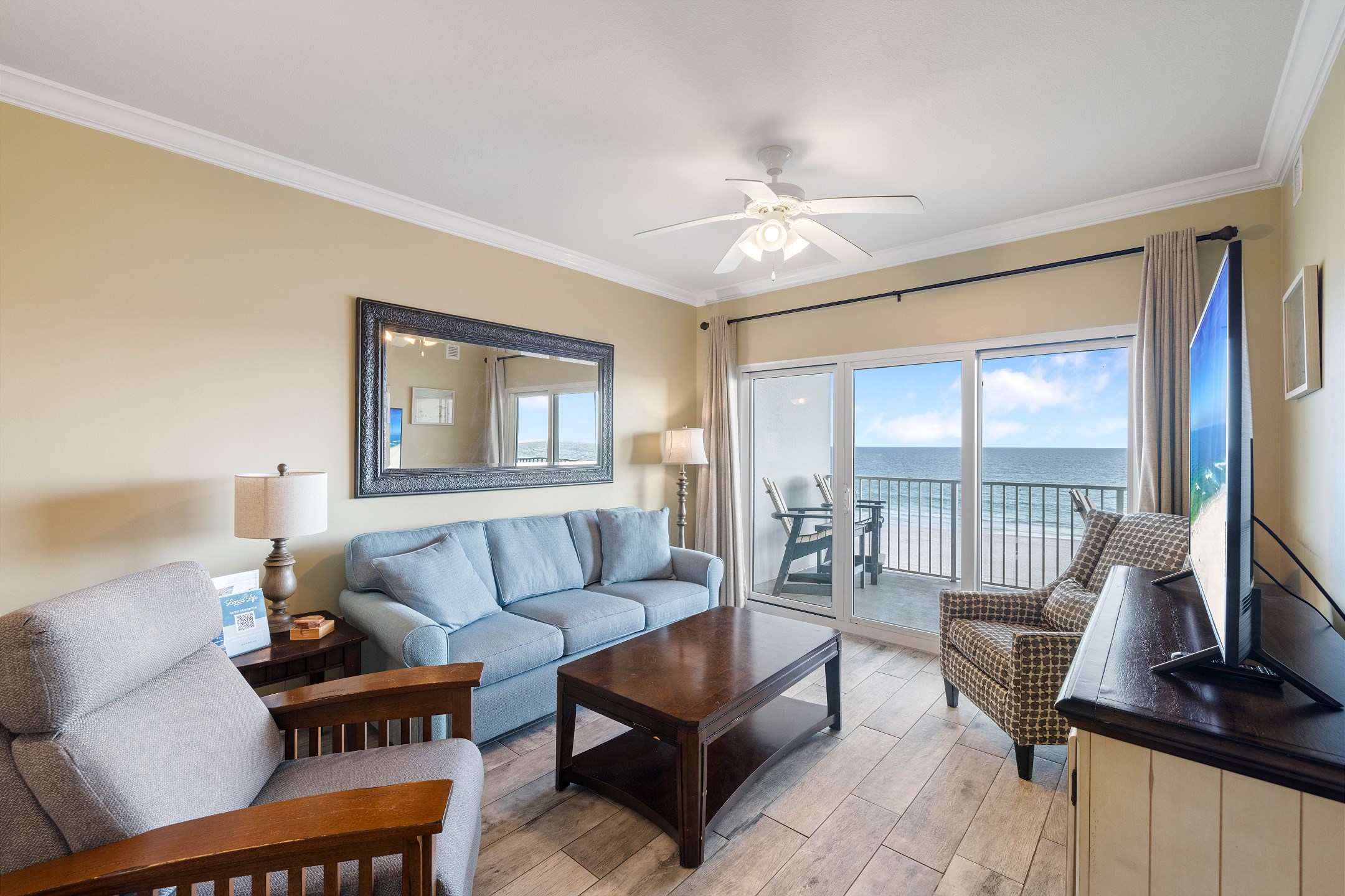Nestled on the 4th floor of this Gulf Shores retreat, Seawind 406 offers a serene coastal escape. Step inside to discover a Primary suite fit for royalty, boasting a plush King bed, a walk-in closet, a flat-screen TV, balcony access, and a private bath. The second bedroom features a cozy Queen bed and a flat-screen TV, while the third bedroom provides a full-sized bed for additional sleeping space for guests. In the living room, a sofa sleeper offers extra accommodations, along with a large flat-screen TV and balcony access where you can soak in mesmerizing Gulf views.