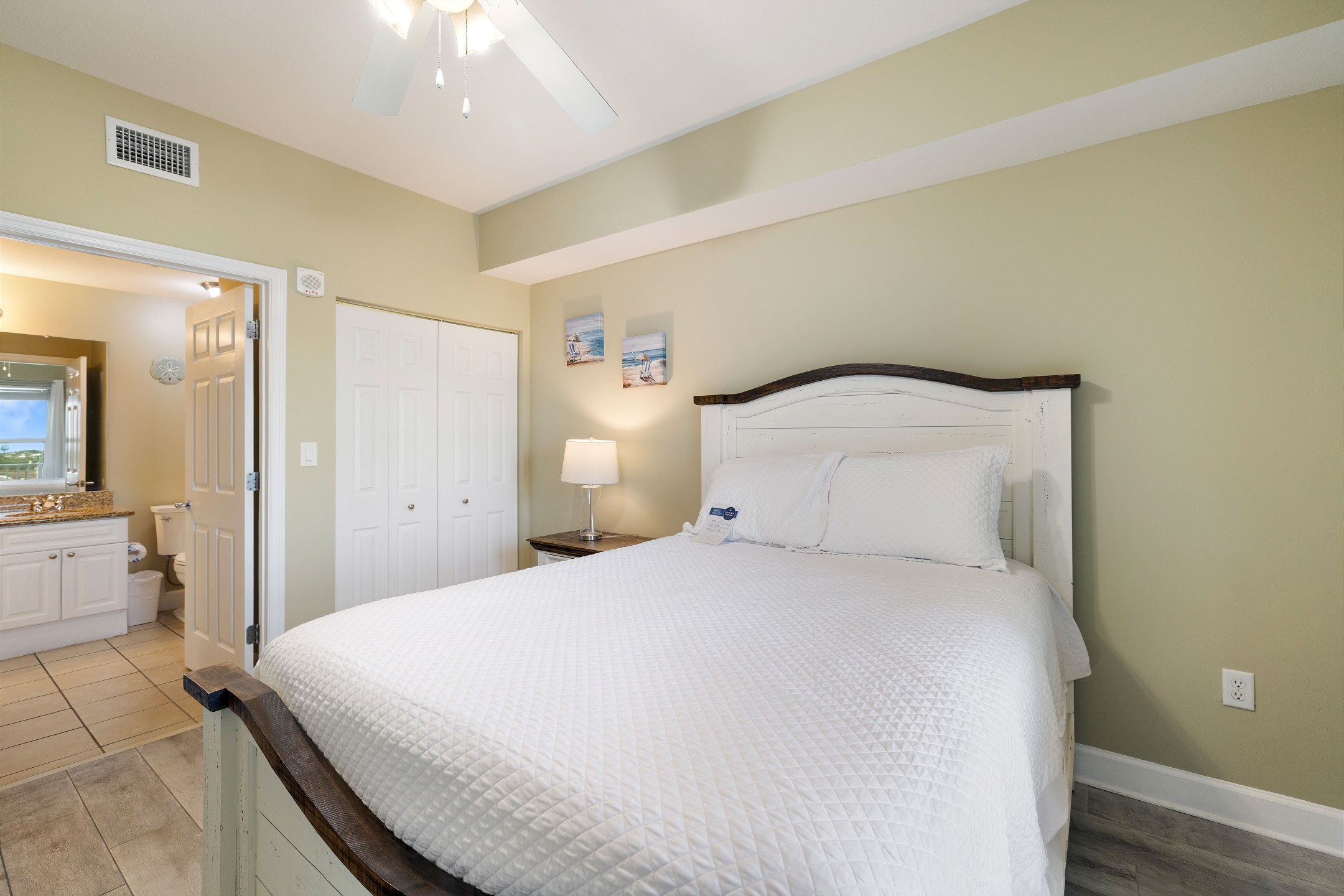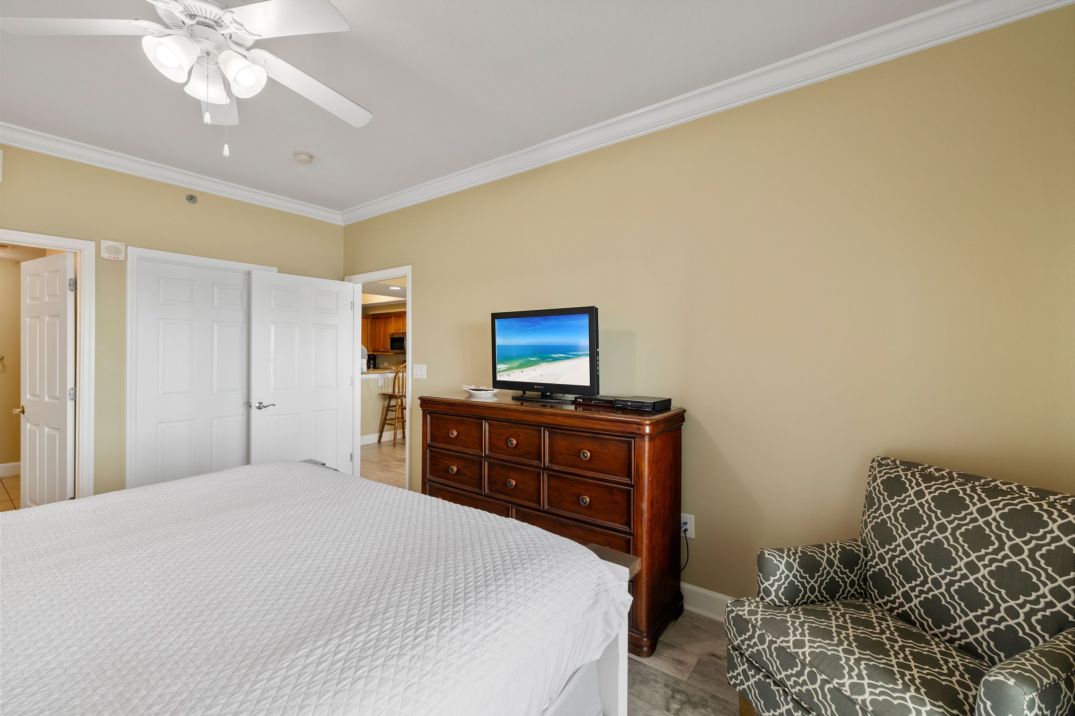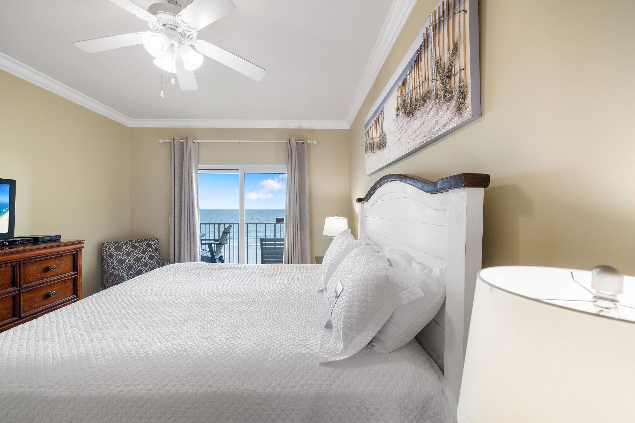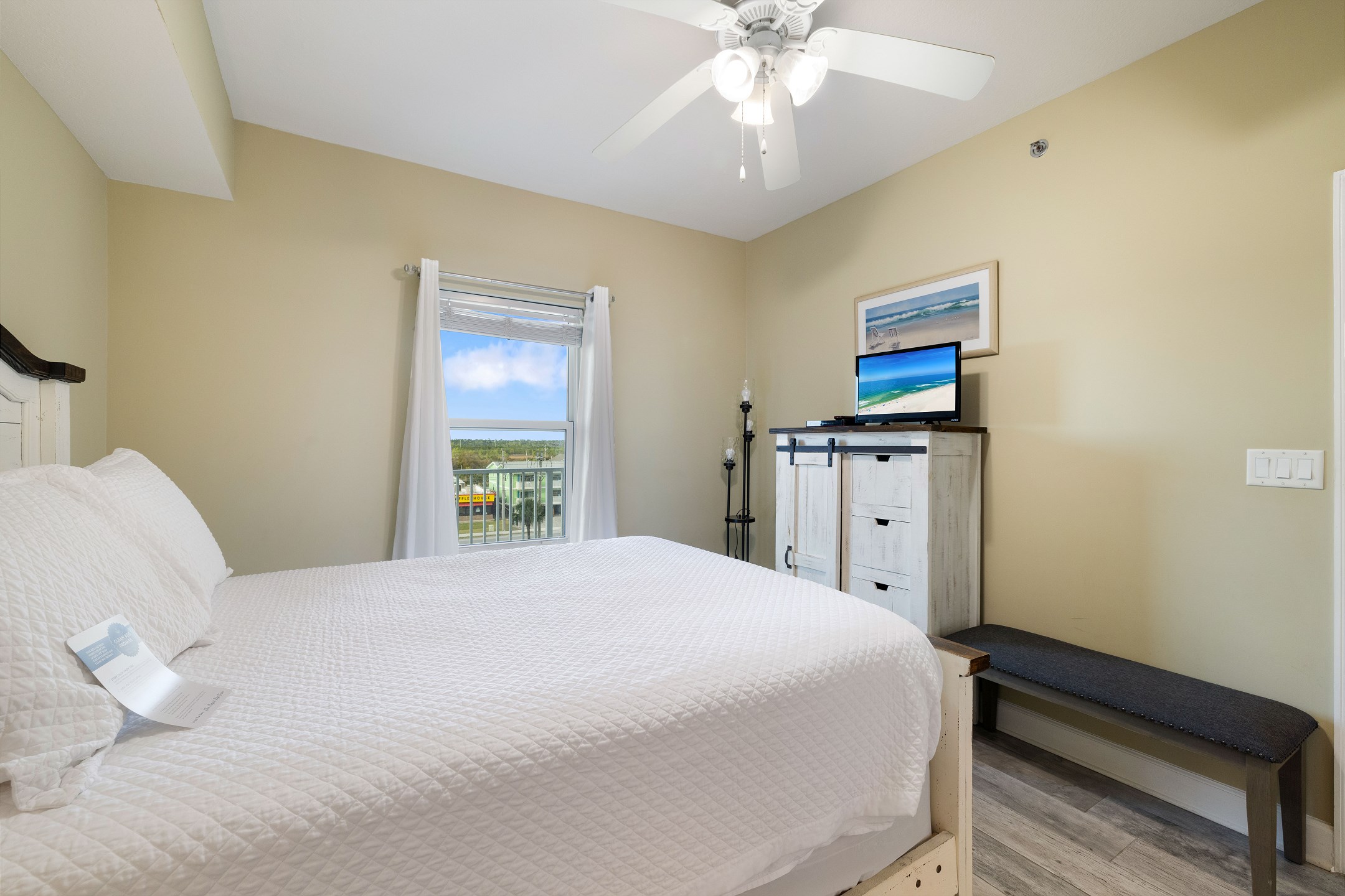 Nestled on the 4th floor of this Gulf Shores retreat, Seawind 406 offers a serene coastal escape. Step inside to discover a Primary suite fit for royalty, boasting a plush King bed, a walk-in closet, a flat-screen TV, balcony access, and a private bath. The second bedroom features a cozy Queen bed and a flat-screen TV, while the third bedroom provides a full-sized bed for additional sleeping space for guests. In the living room, a sofa sleeper offers extra accommodations, along with a large flat-screen TV and balcony access where you can soak in mesmerizing Gulf views.