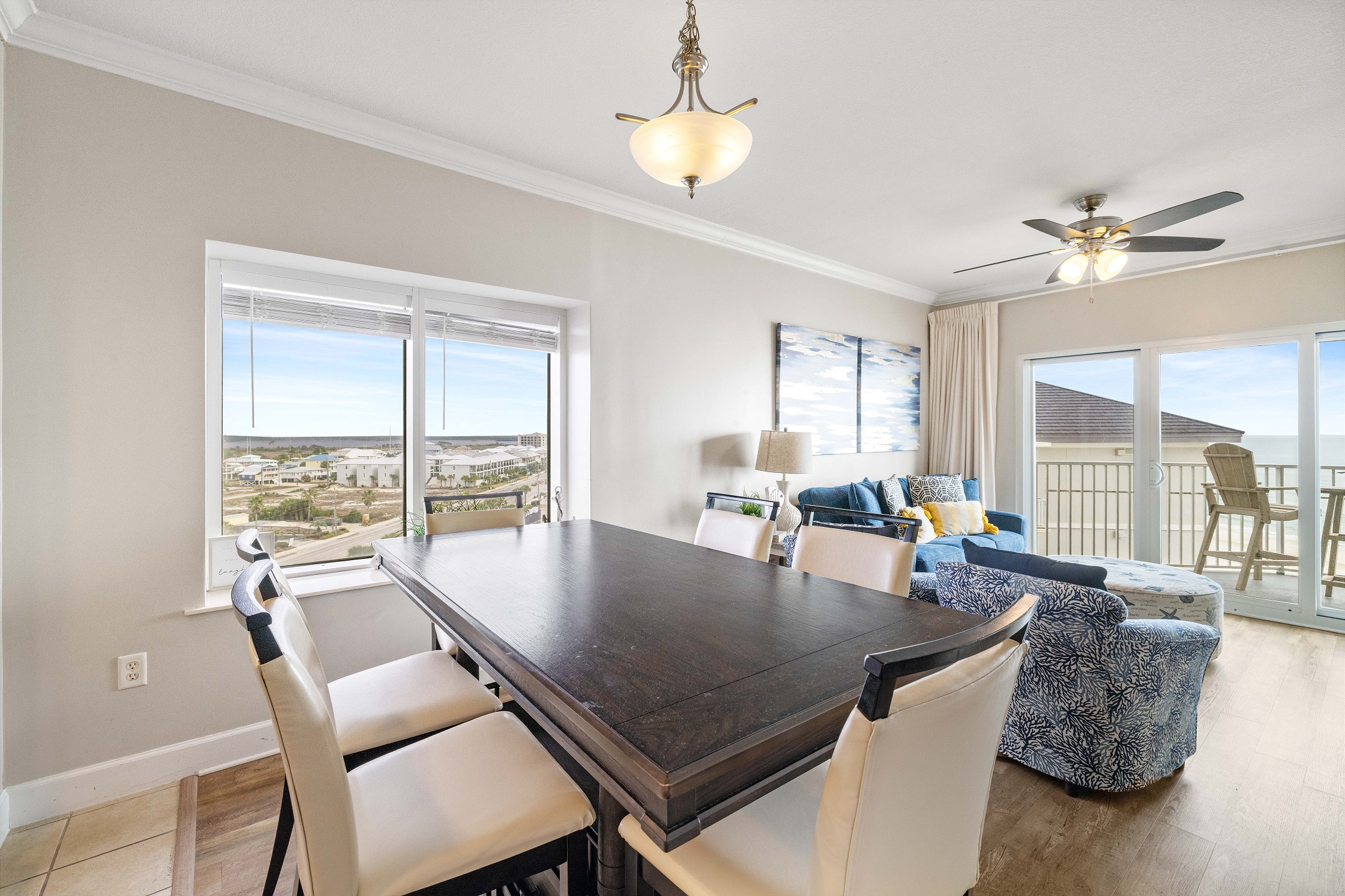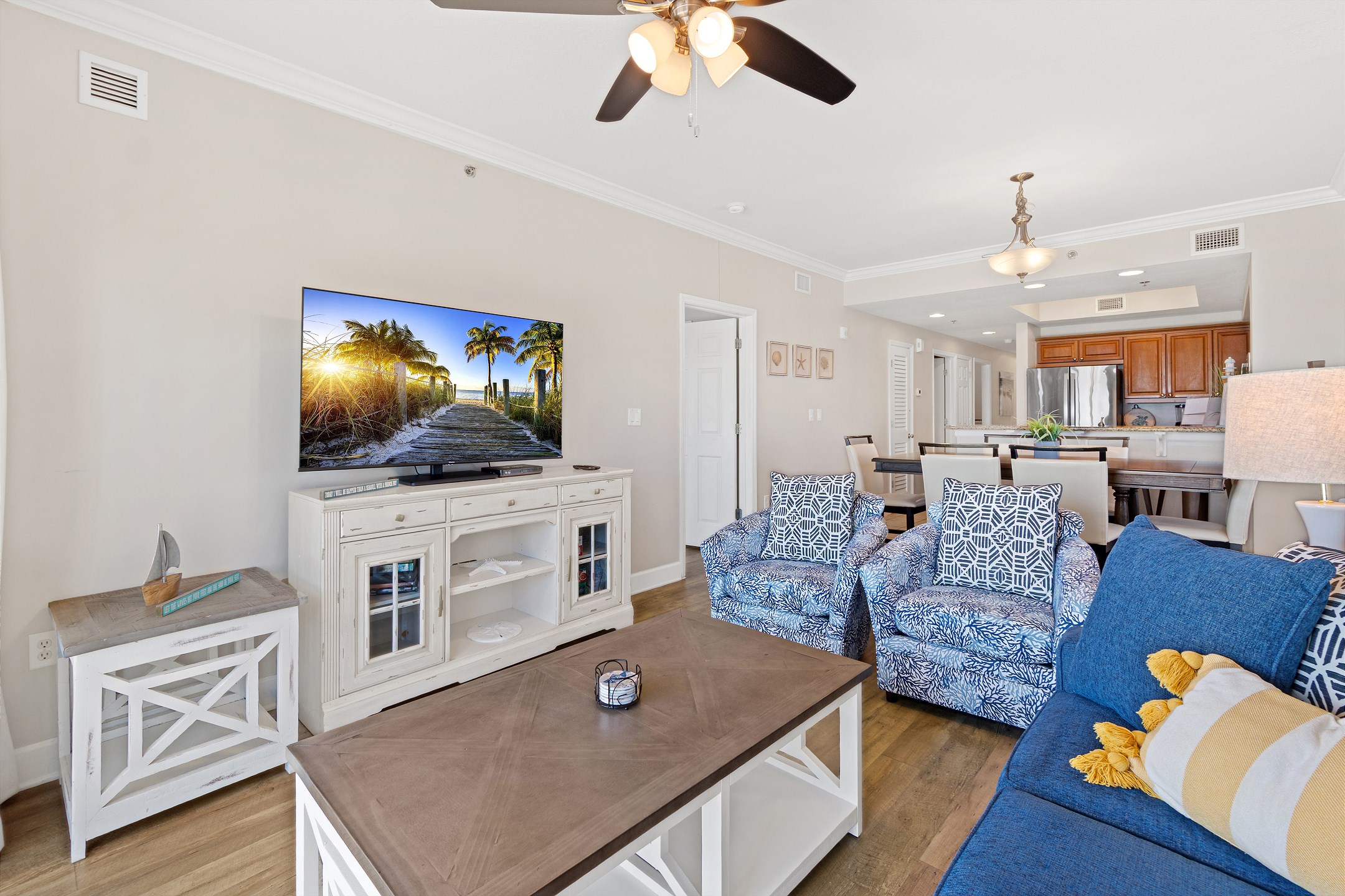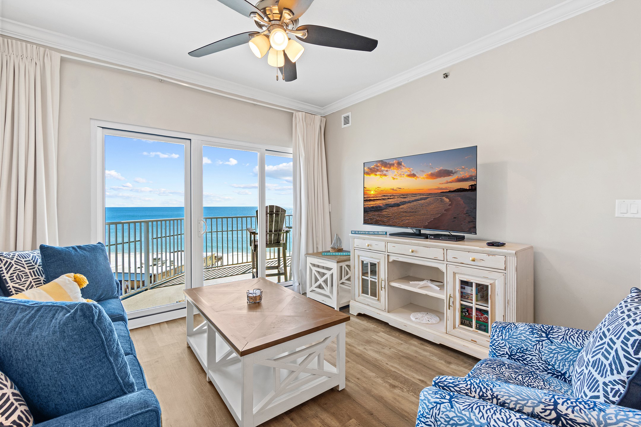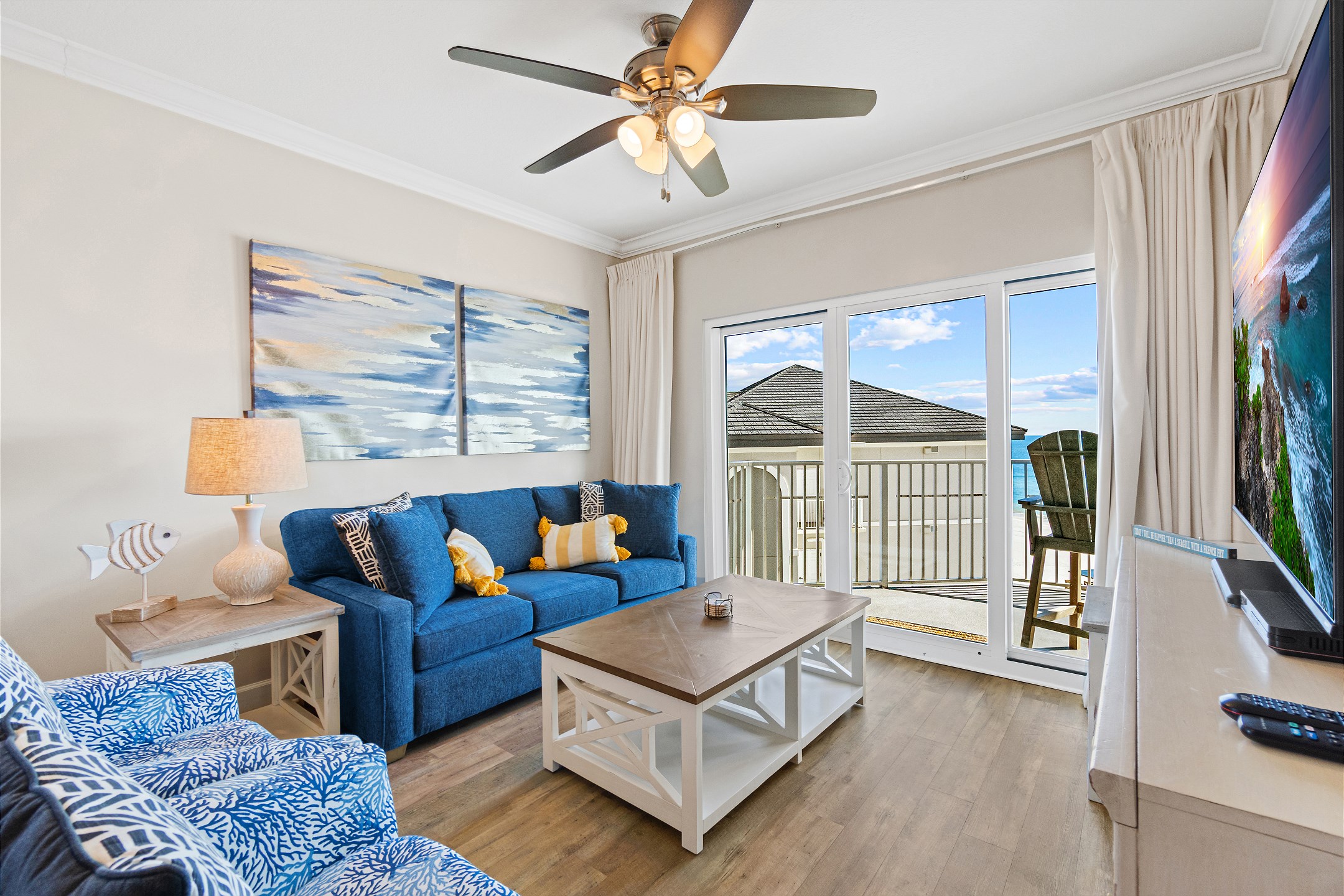 The living room serves as a welcoming gathering space, featuring comfortable furnishings, a flat-screen TV, and balcony access where you can soak in the stunning coastal views.