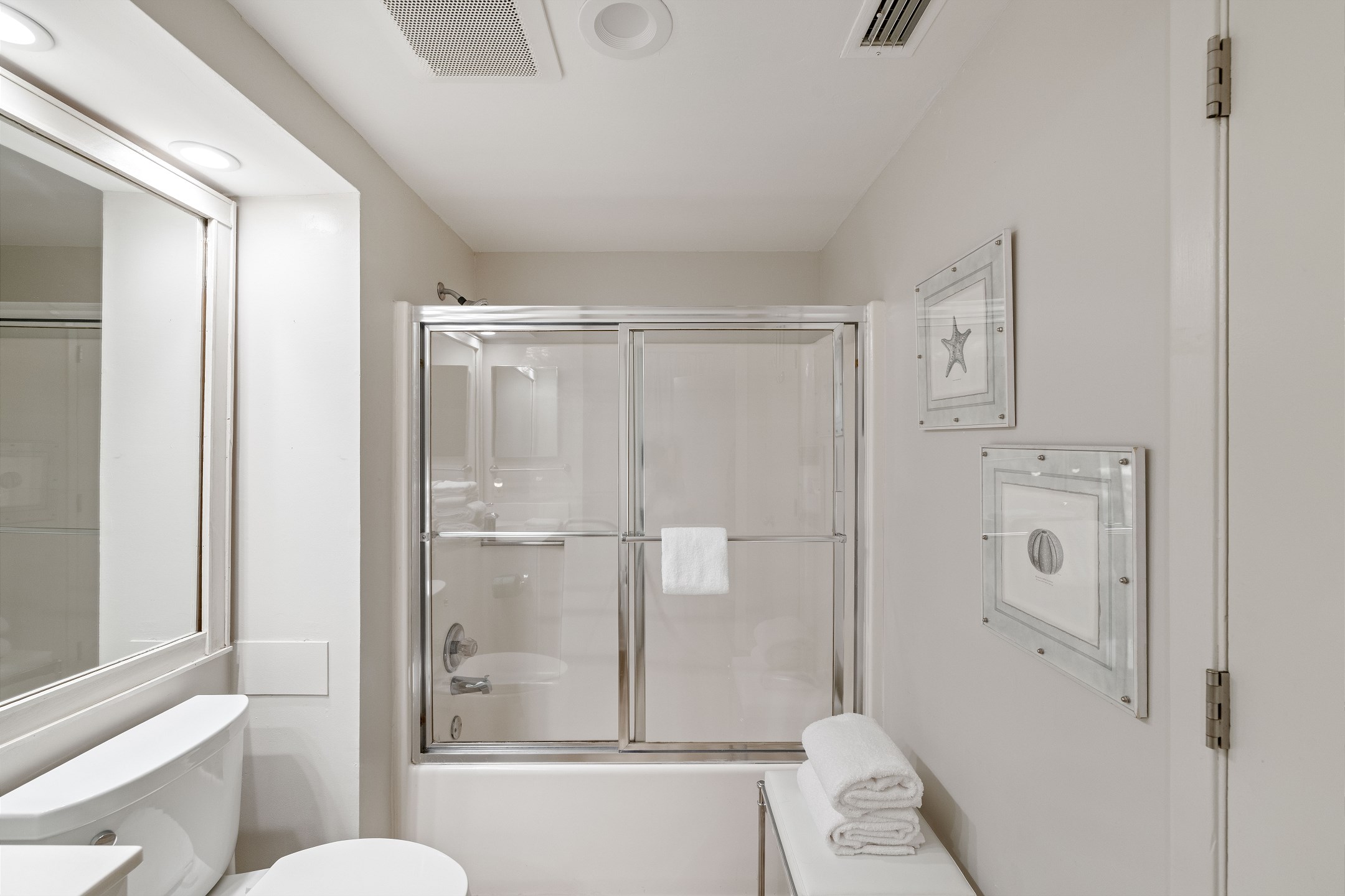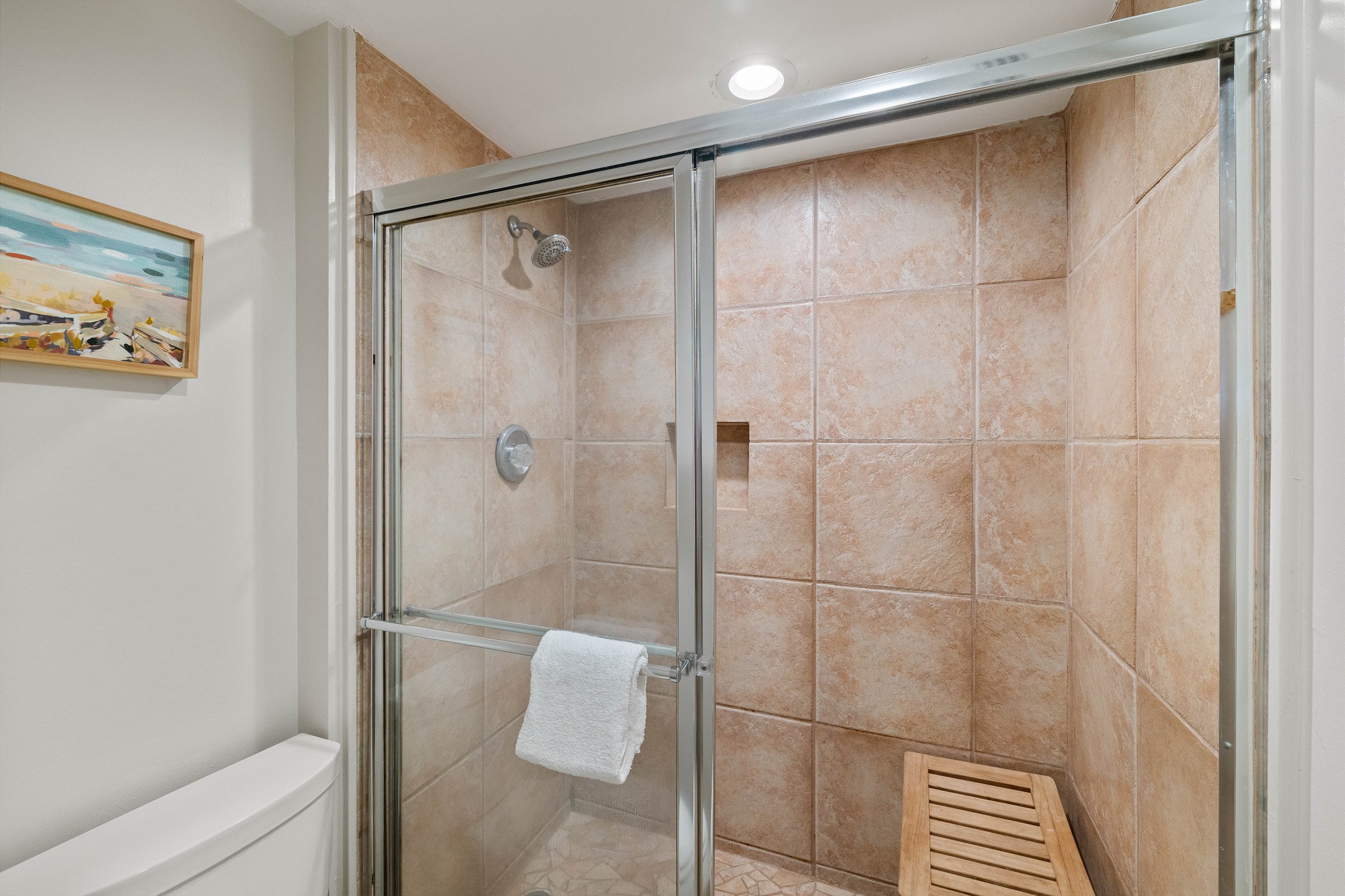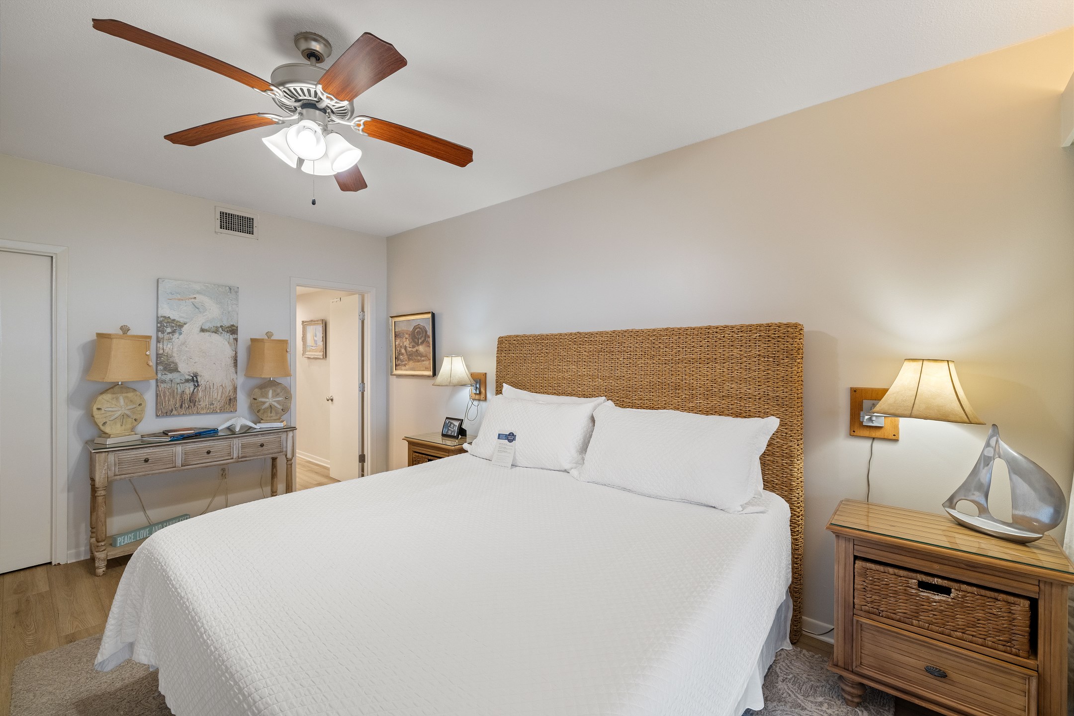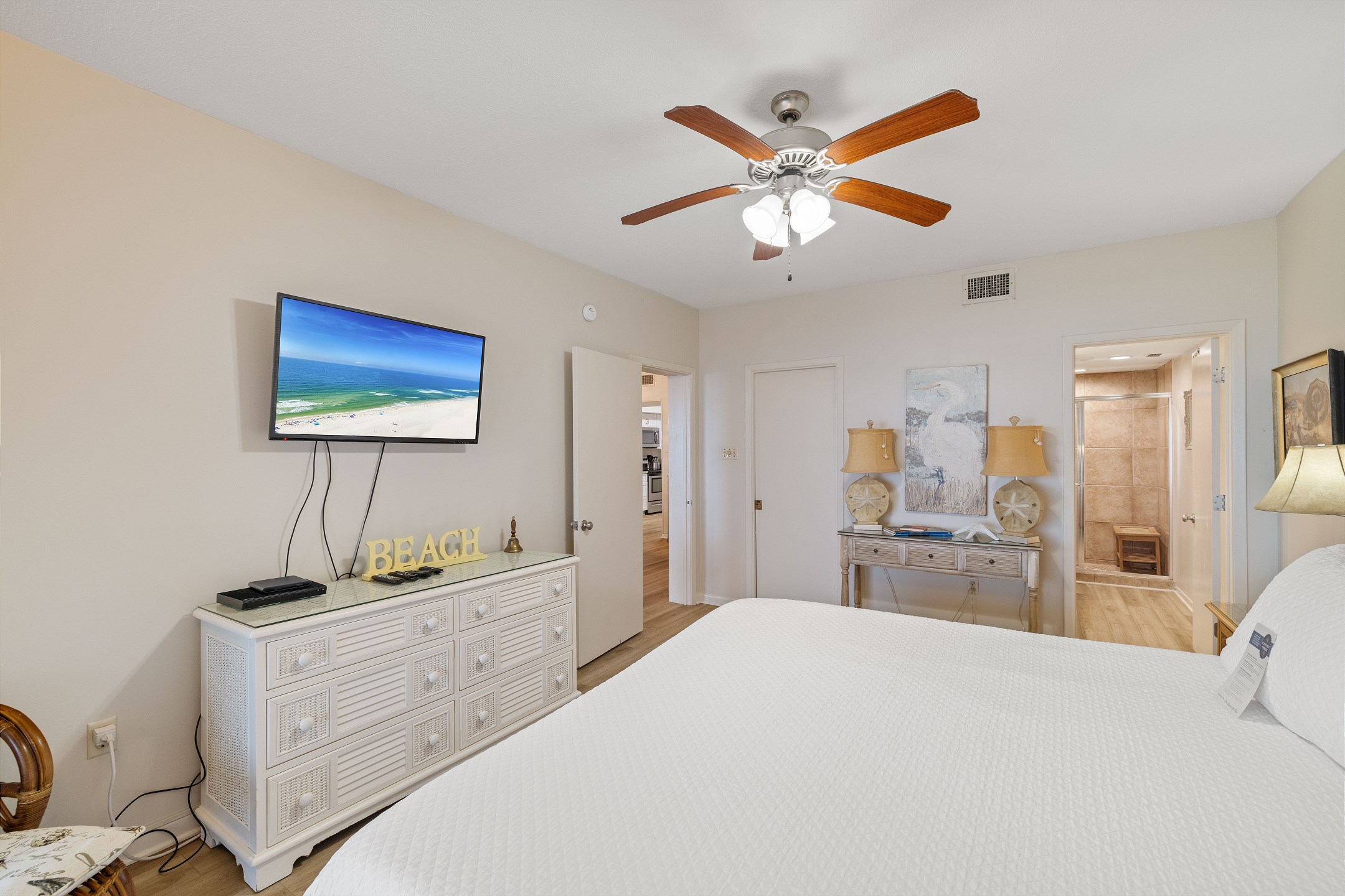 The Primary suite is a serene retreat, featuring a plush King-sized bed, balcony access, and a flat-screen TV for your entertainment. Step out onto the balcony and take in the breathtaking views of the Gulf, letting the gentle sea breeze wash over you. The Primary bath boasts a large tiled walk-in shower, providing a luxurious experience after a day of sun and sand.
