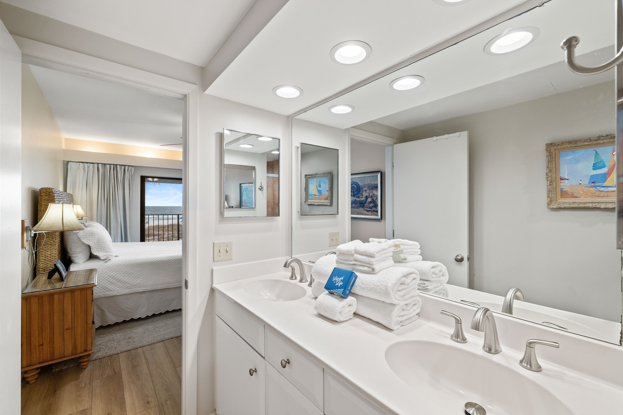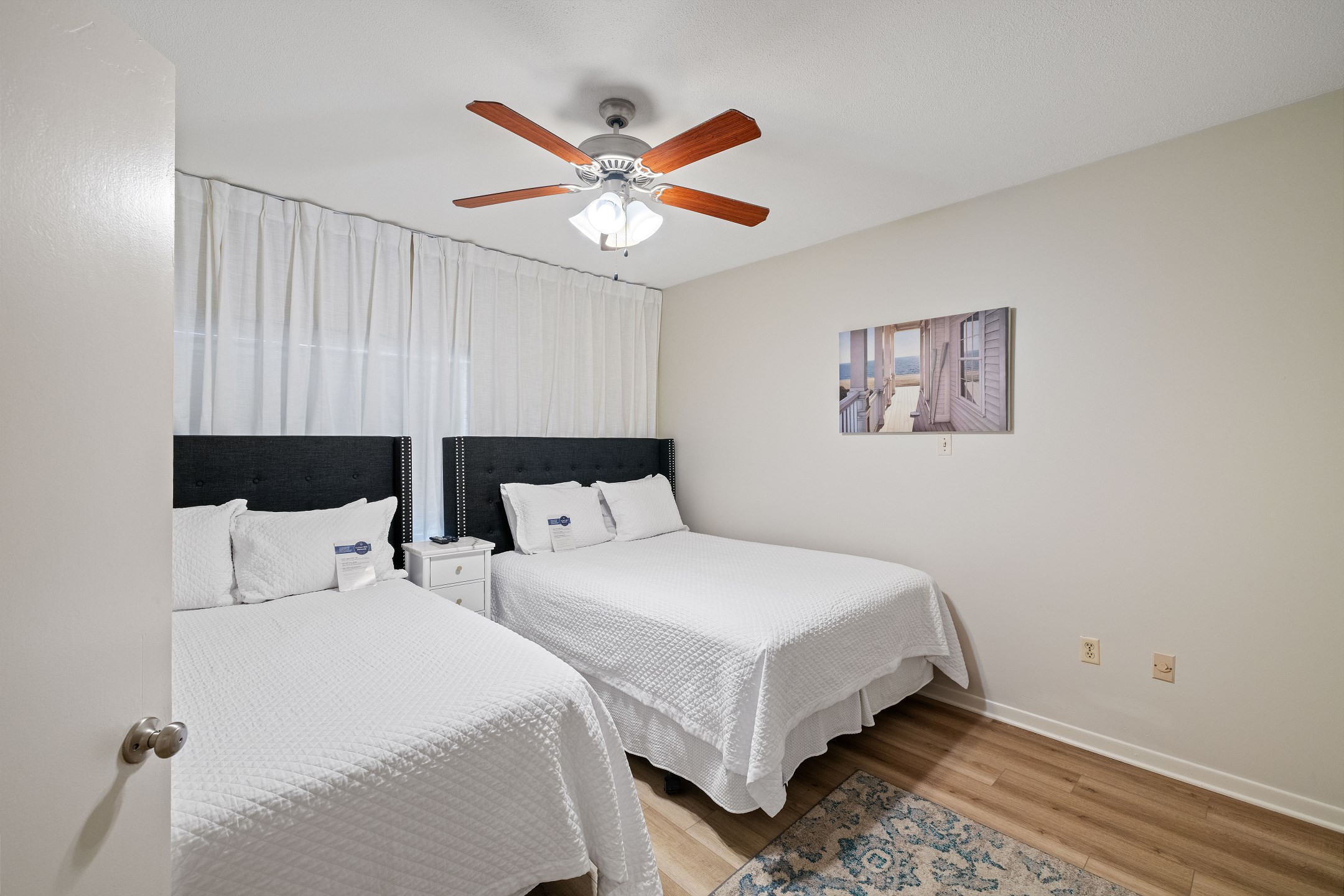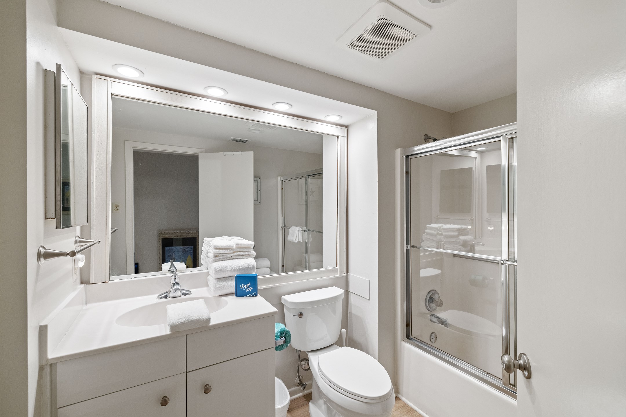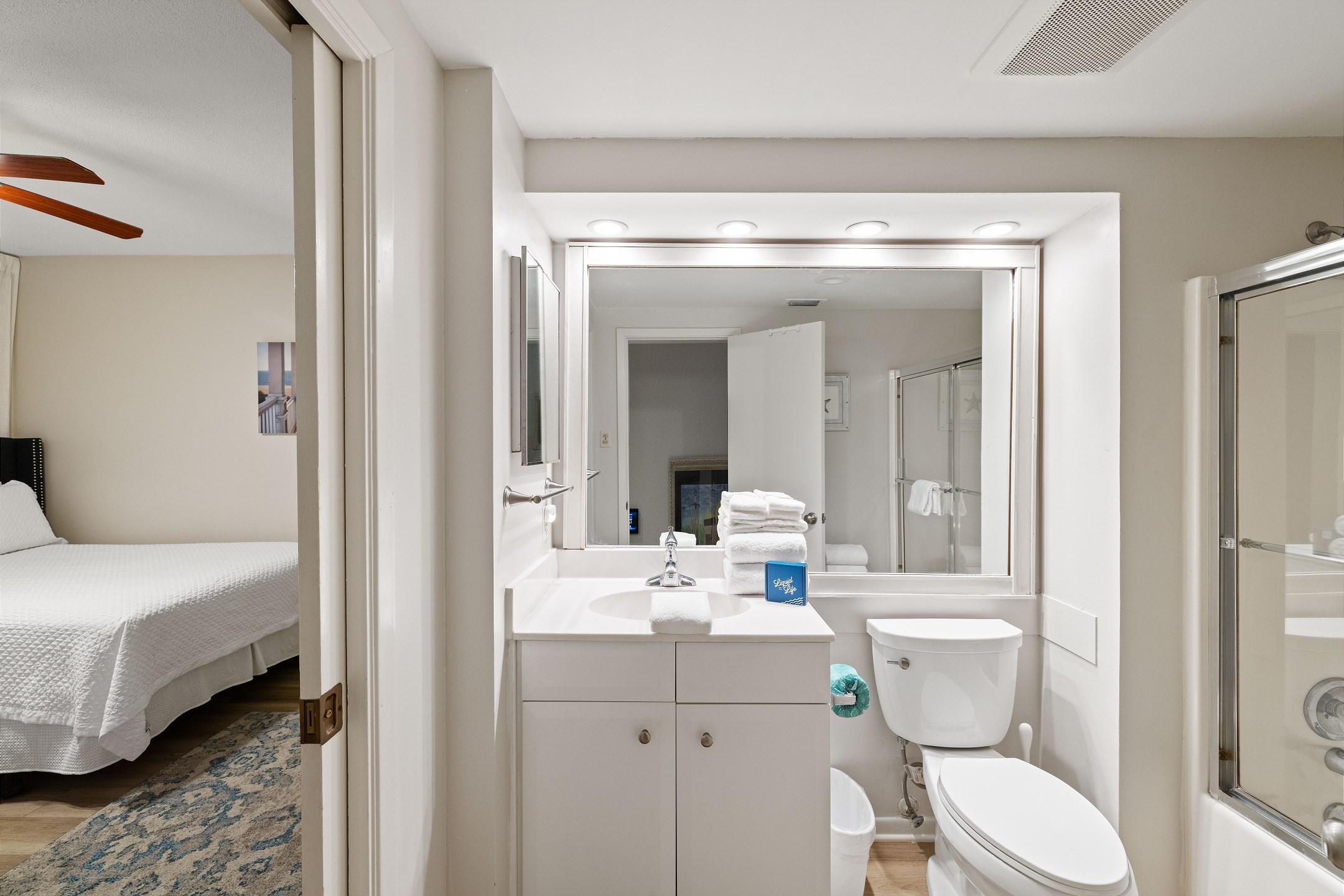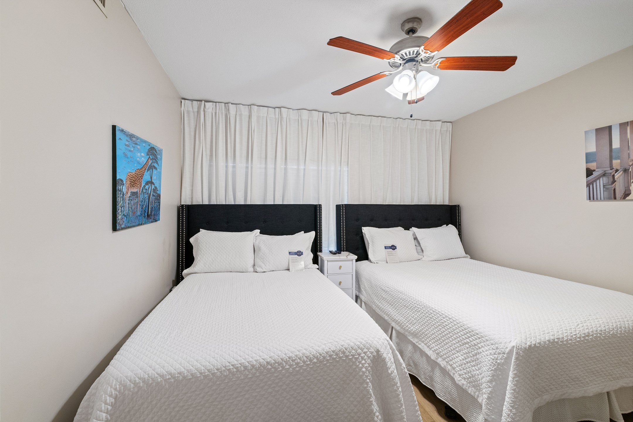 The Primary suite is a serene retreat, featuring a plush King-sized bed, balcony access, and a flat-screen TV for your entertainment. Step out onto the balcony and take in the breathtaking views of the Gulf, letting the gentle sea breeze wash over you. The Primary bath boasts a large tiled walk-in shower, providing a luxurious experience after a day of sun and sand.