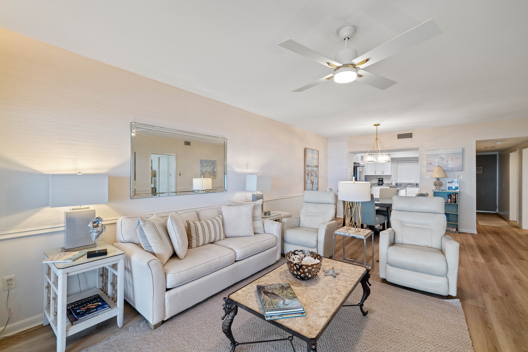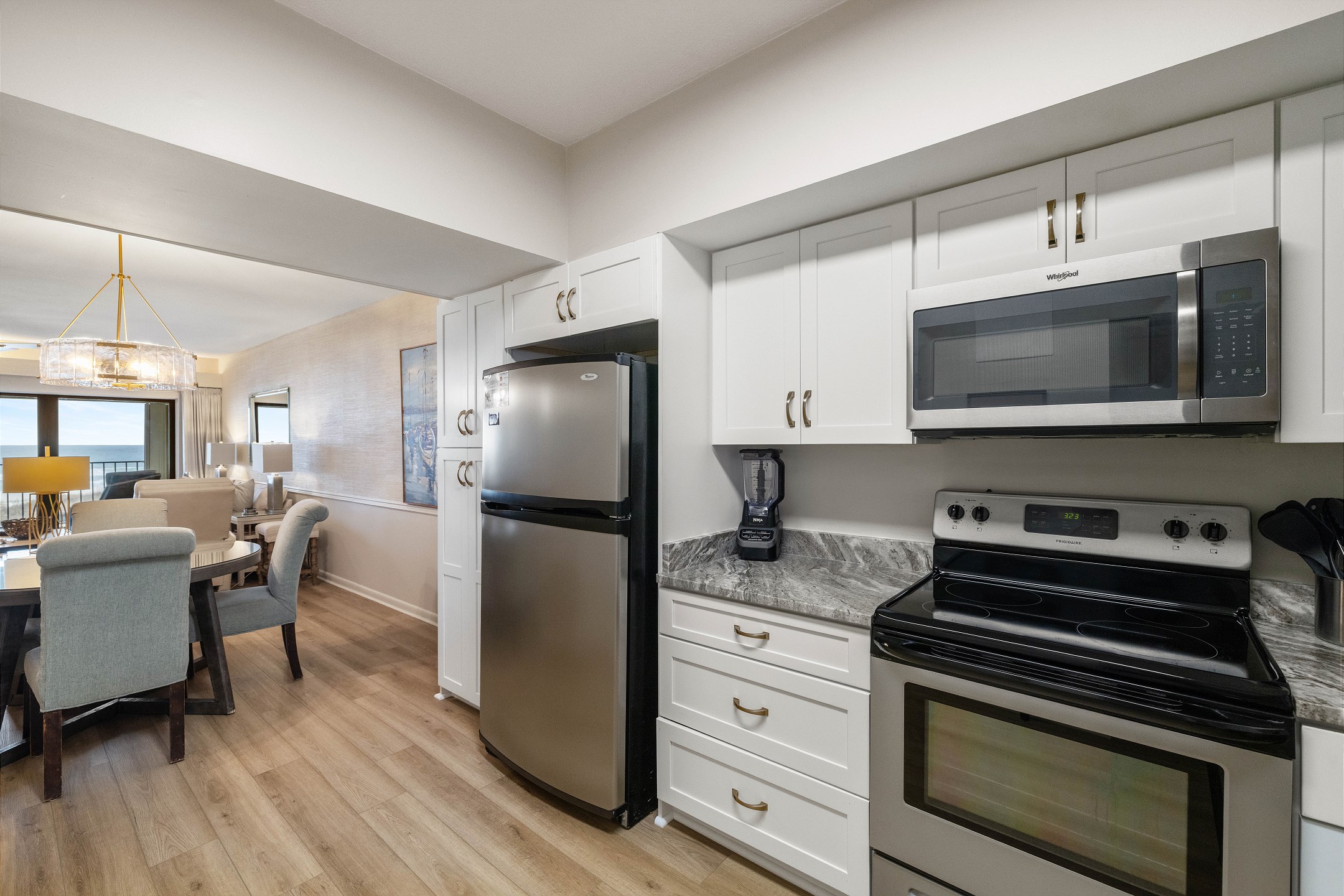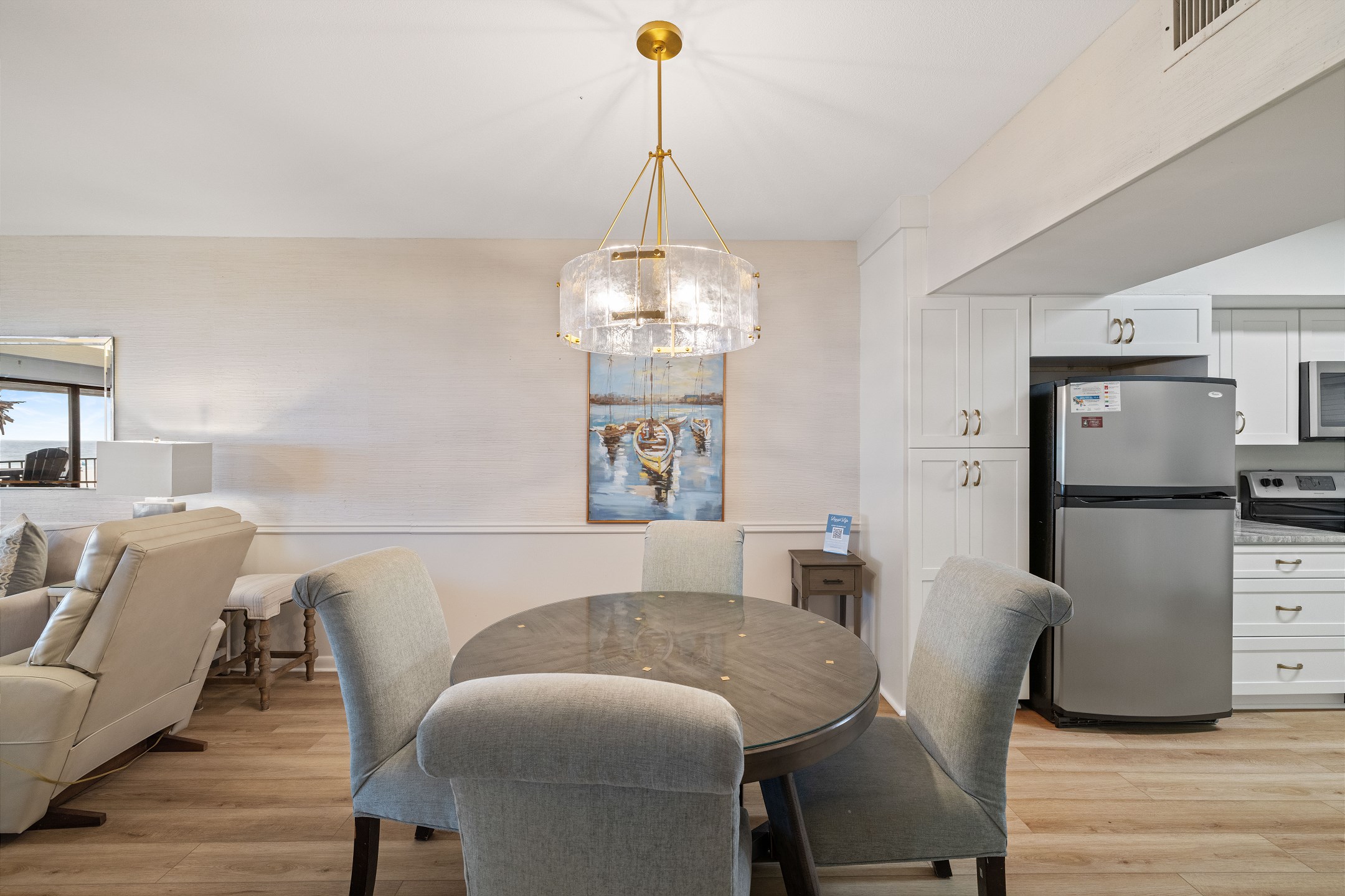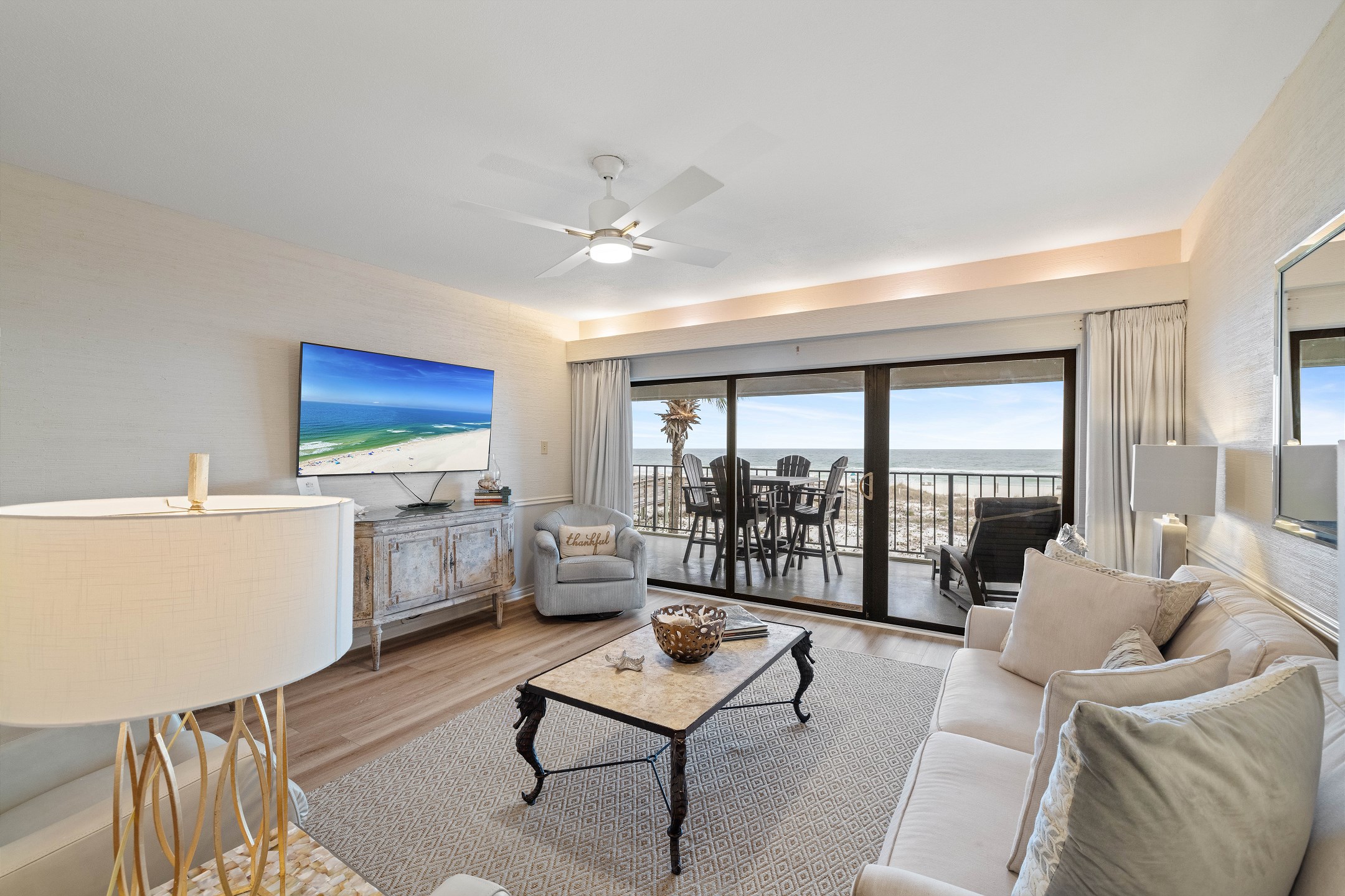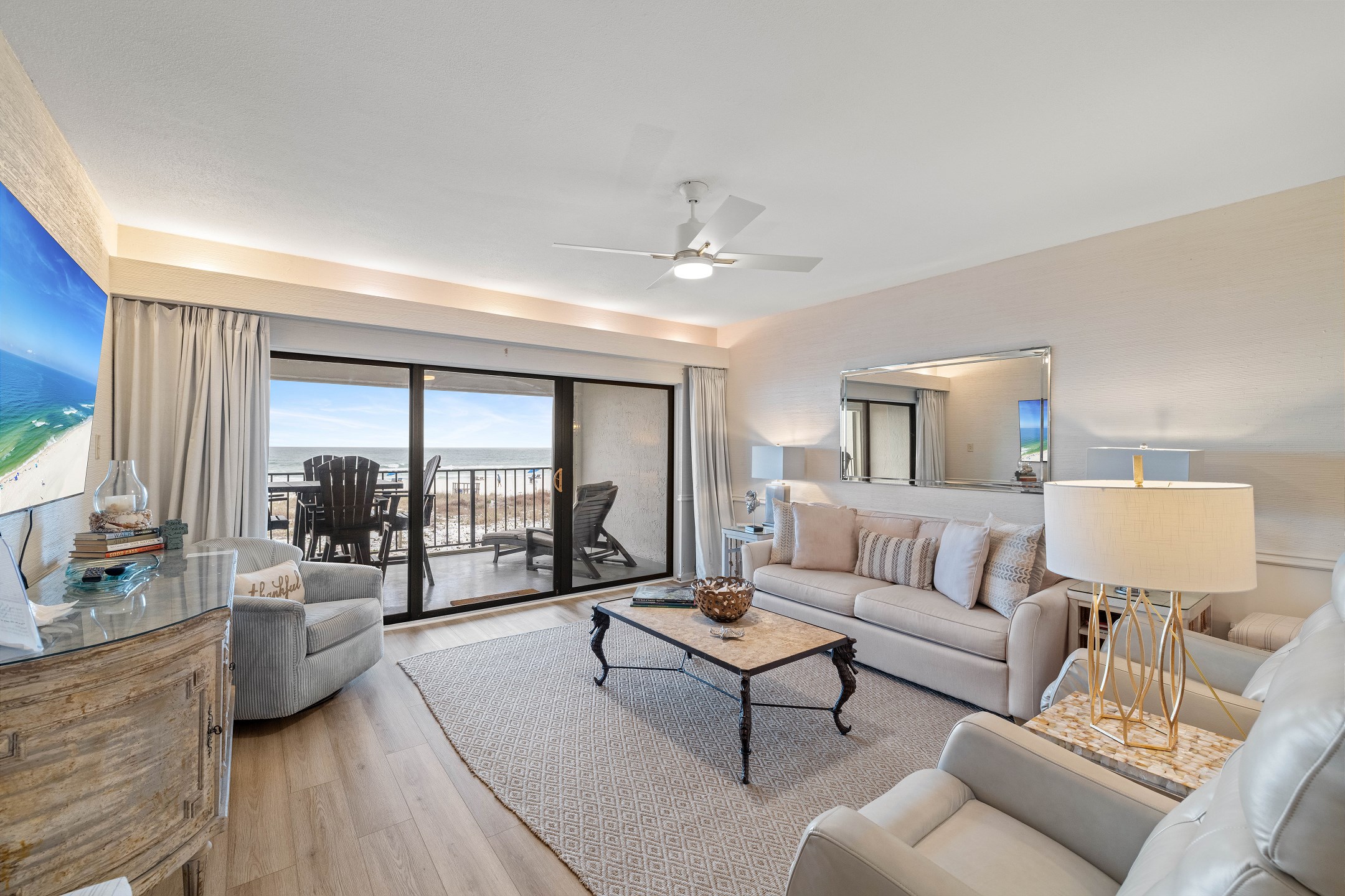The spacious living area is the heart of the condo, with floor-to-ceiling windows that showcase panoramic views of the Gulf and the surrounding sand dunes. Sink into the plush sofa sleeper and unwind as you take in the scenery or gather with loved ones for lively conversations and laughter.