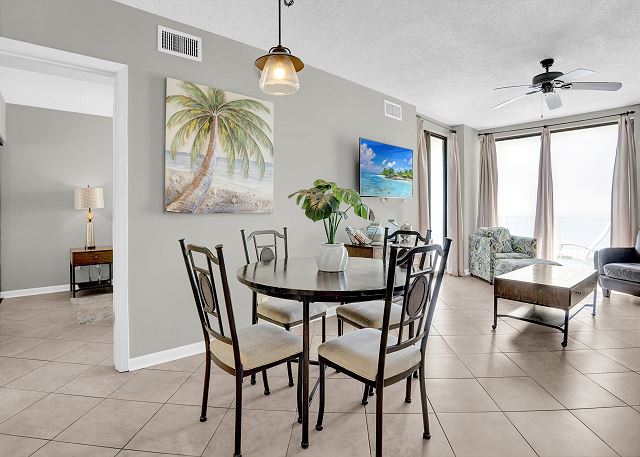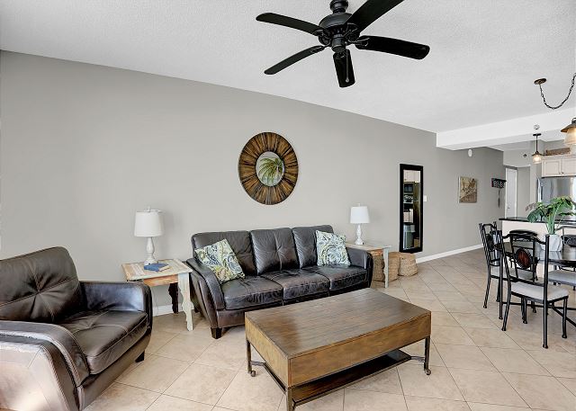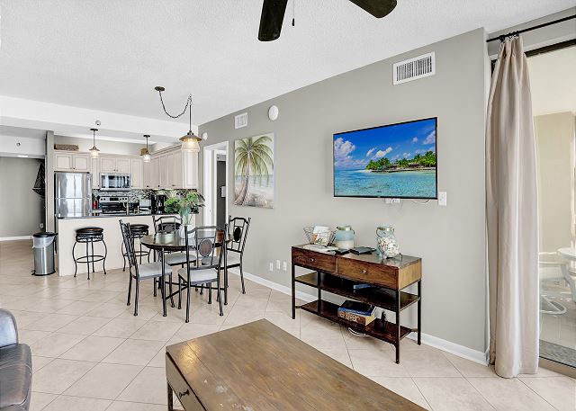 The stylishly furnished living room is perfect for relaxing after a day in the sun, with plenty of space and a flat-screen TV for everyone to enjoy. Whether you're cooking, relaxing, or simply enjoying the view, Shoalwater 802 offers a comfortable and inviting atmosphere for your beach getaway.