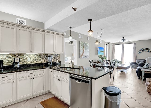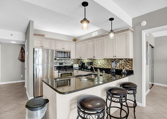 Inside, you'll find a well-appointed kitchen with granite countertops and stainless steel appliances, making meal preparation effortless. The kitchen is stocked with everything you need, including cookware, dishes, glasses, a microwave, blender, coffeemaker, and dishwasher for added convenience.