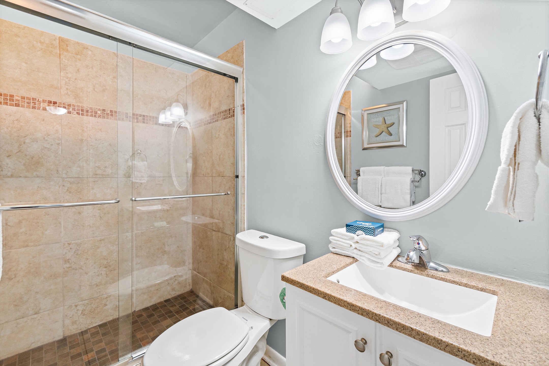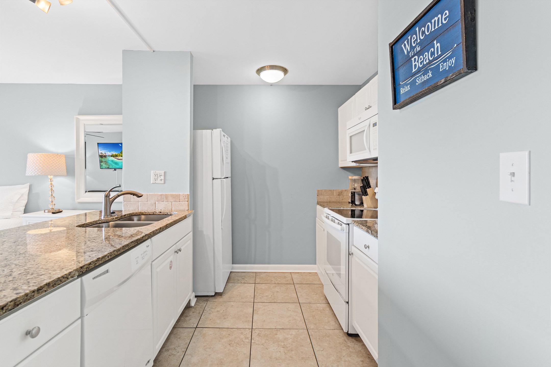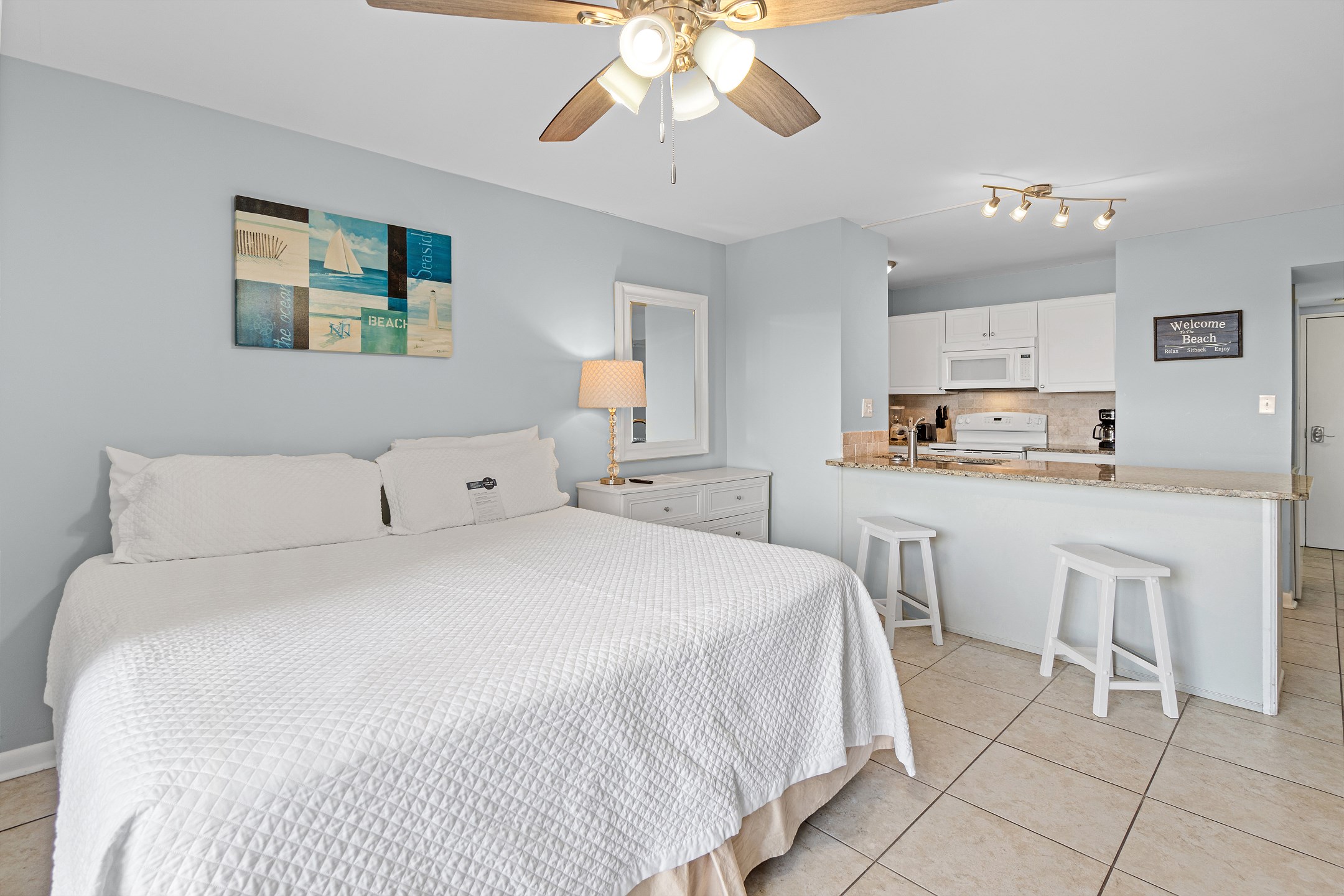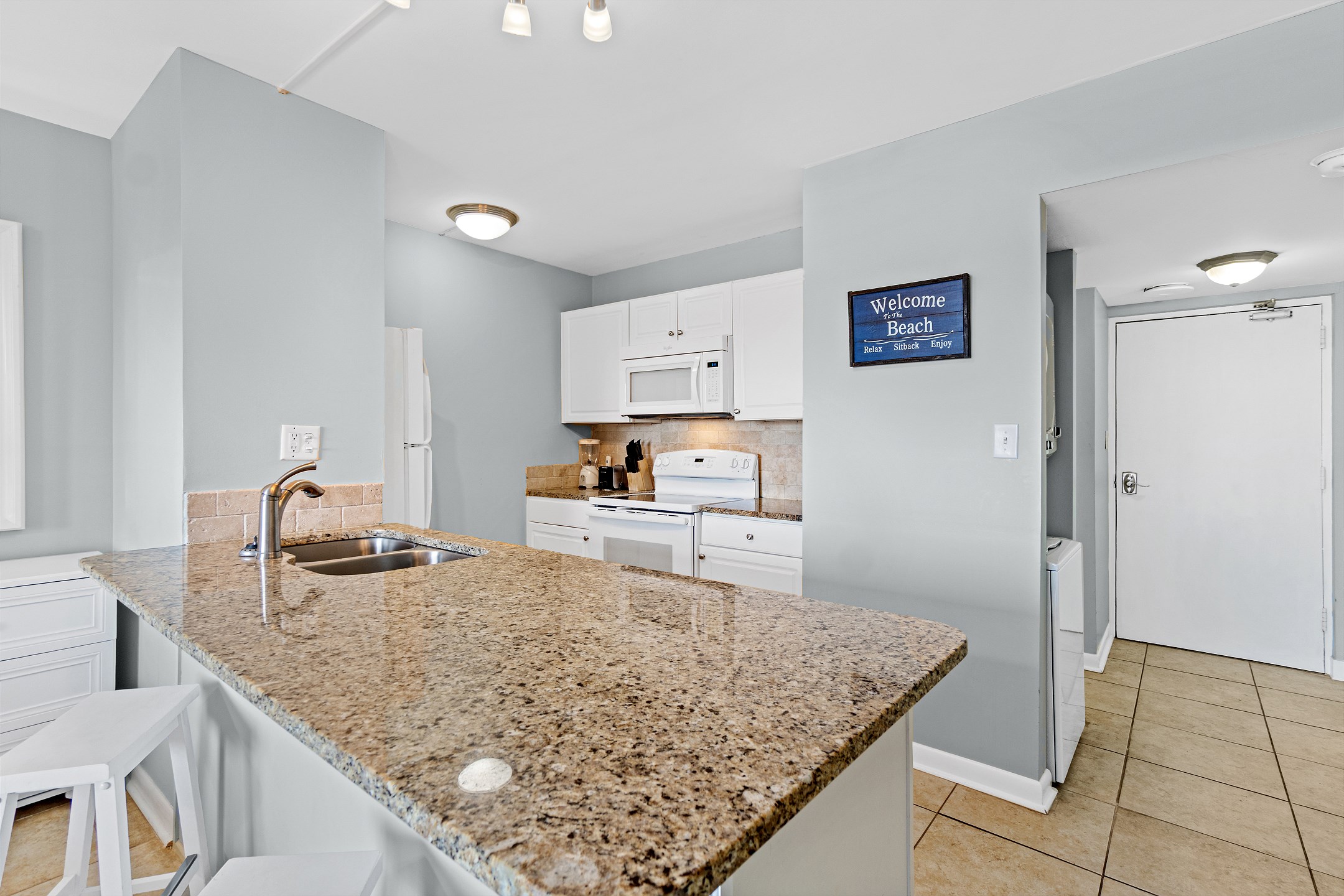 The fully equipped kitchen includes granite countertops and everything you need to prepare simple meals or snacks during your stay. The full bathroom features a tiled walk in shower, adding a modern and refreshing touch. A washer and dryer in the unit provide extra convenience, making longer stays easy and comfortable.