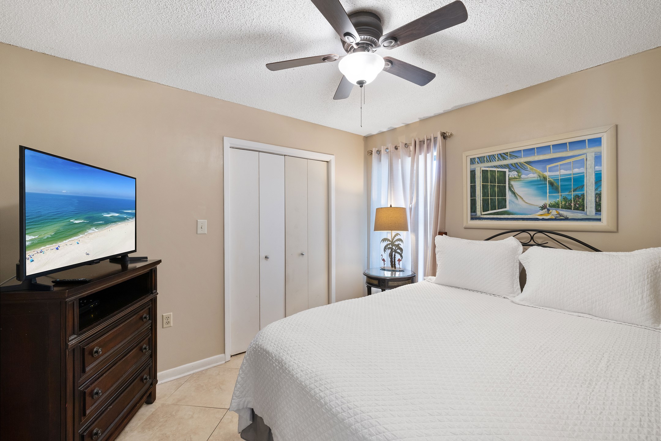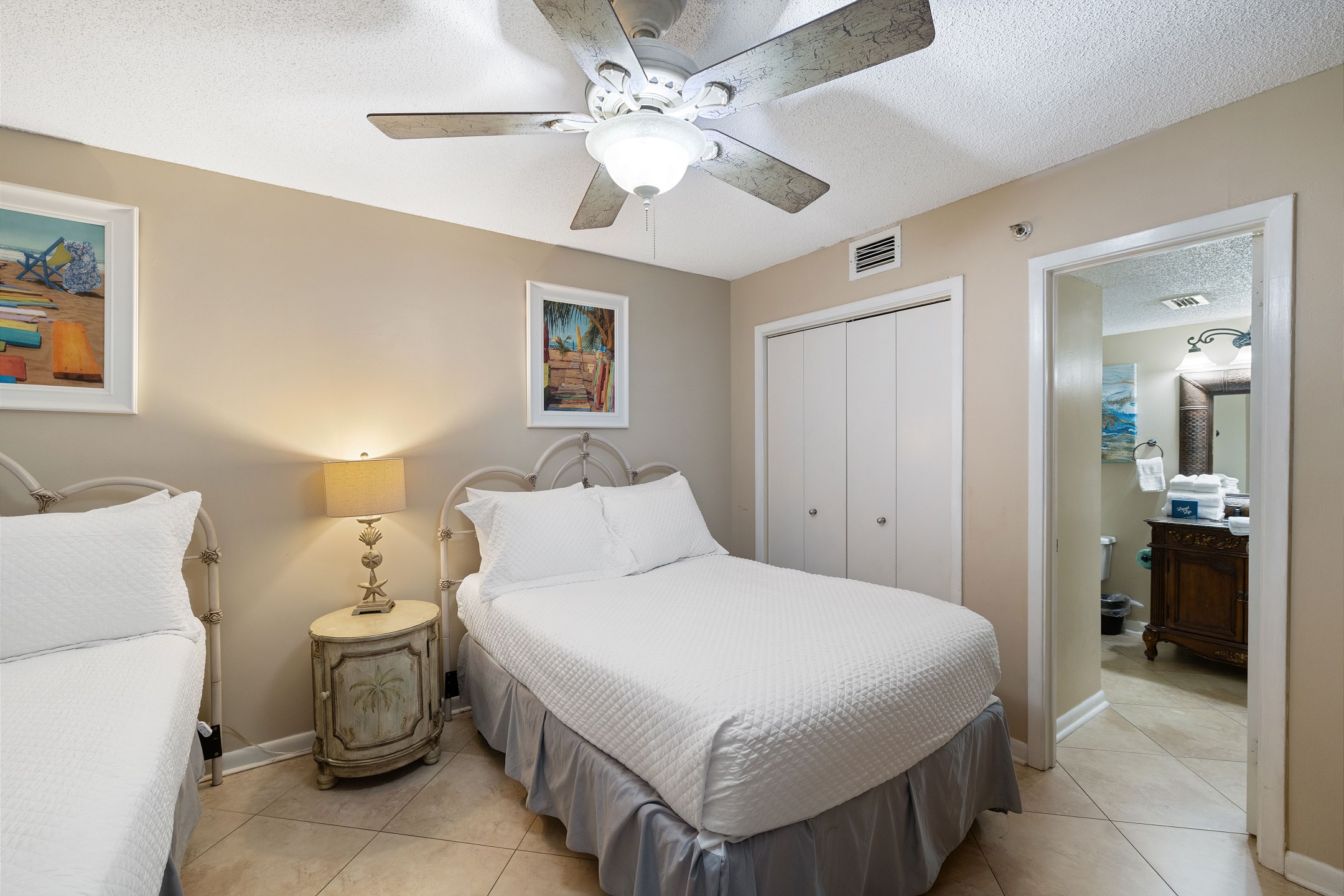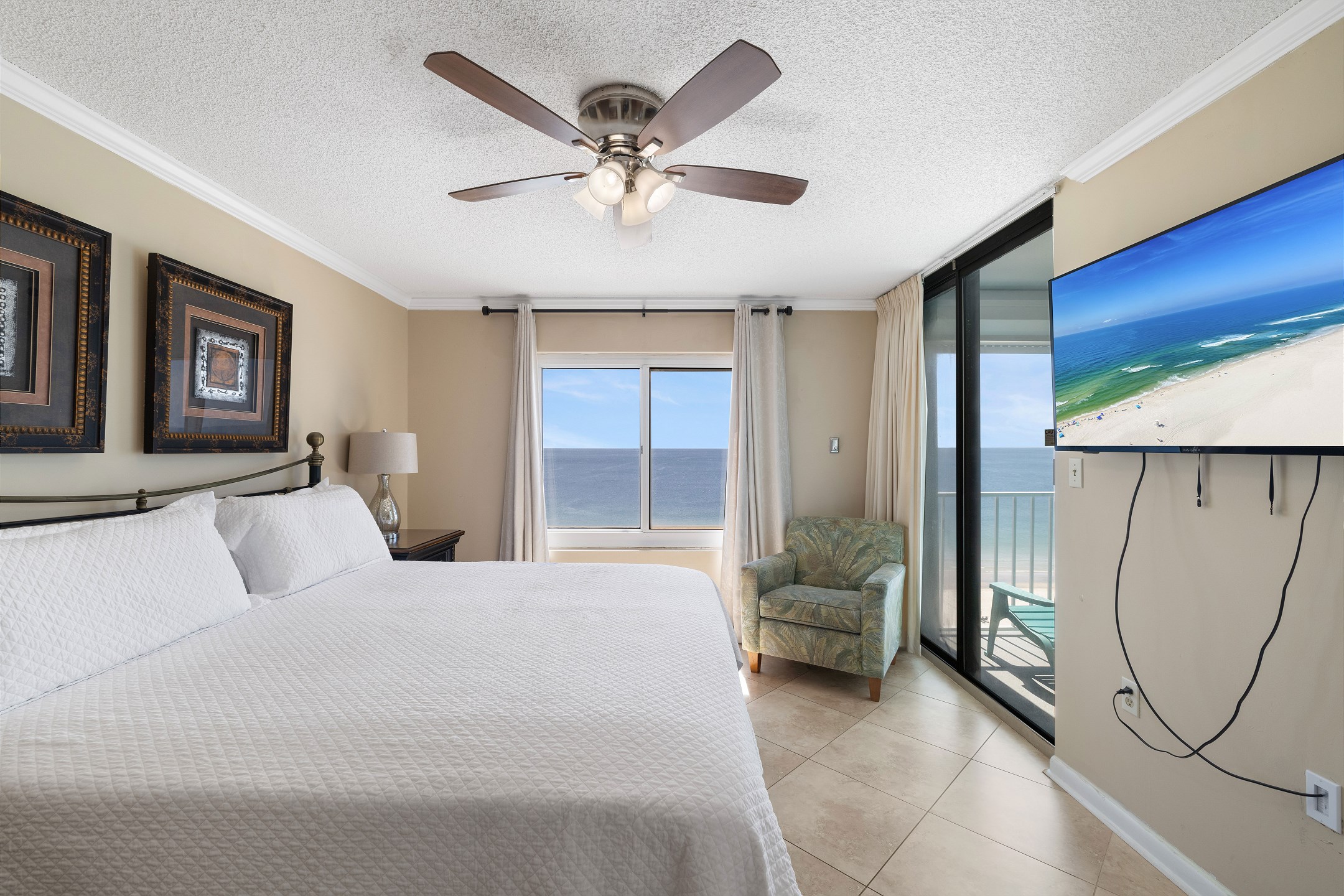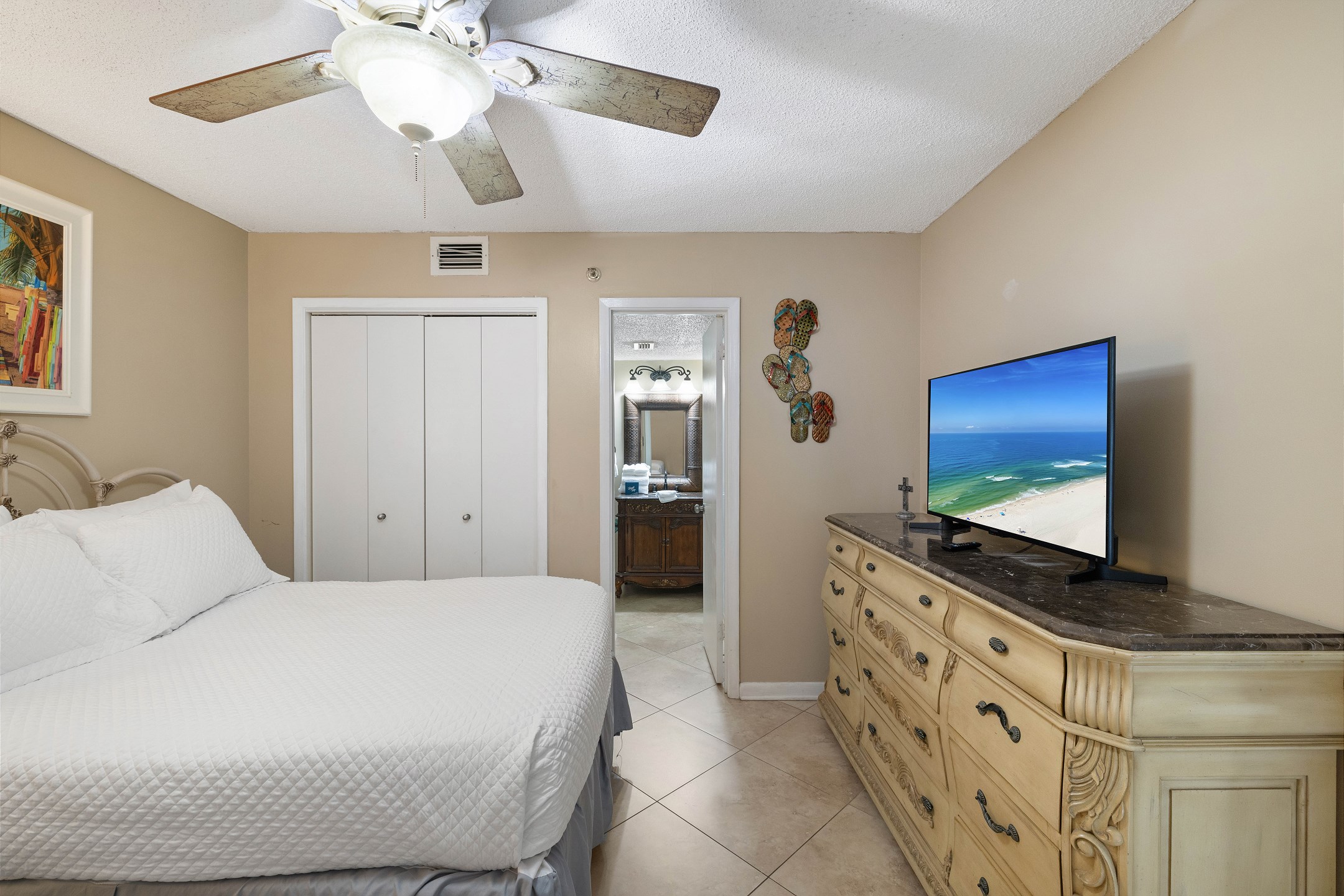 The primary bedroom is filled with natural light and features a king bed, flat screen TV, and floor-to-ceiling windows with balcony access. The ensuite bathroom includes a dual sink vanity and a beautifully tiled walk-in shower. The second bedroom offers a queen bed, along with a twin-over-twin bunk tucked neatly into the closet for additional sleeping space. The third bedroom includes two full-size beds and a flat-screen TV, with convenient access to the shared hall bathroom featuring a tiled shower-and-tub combination.