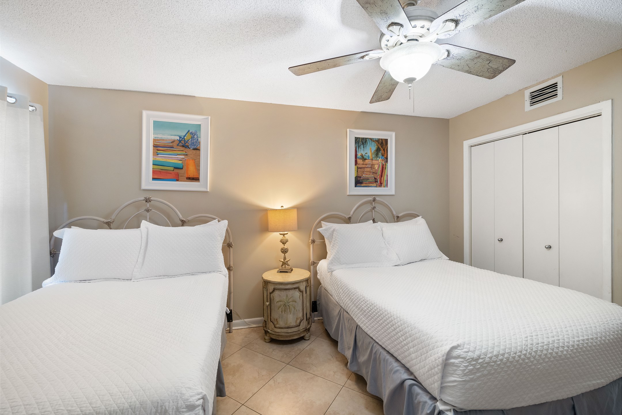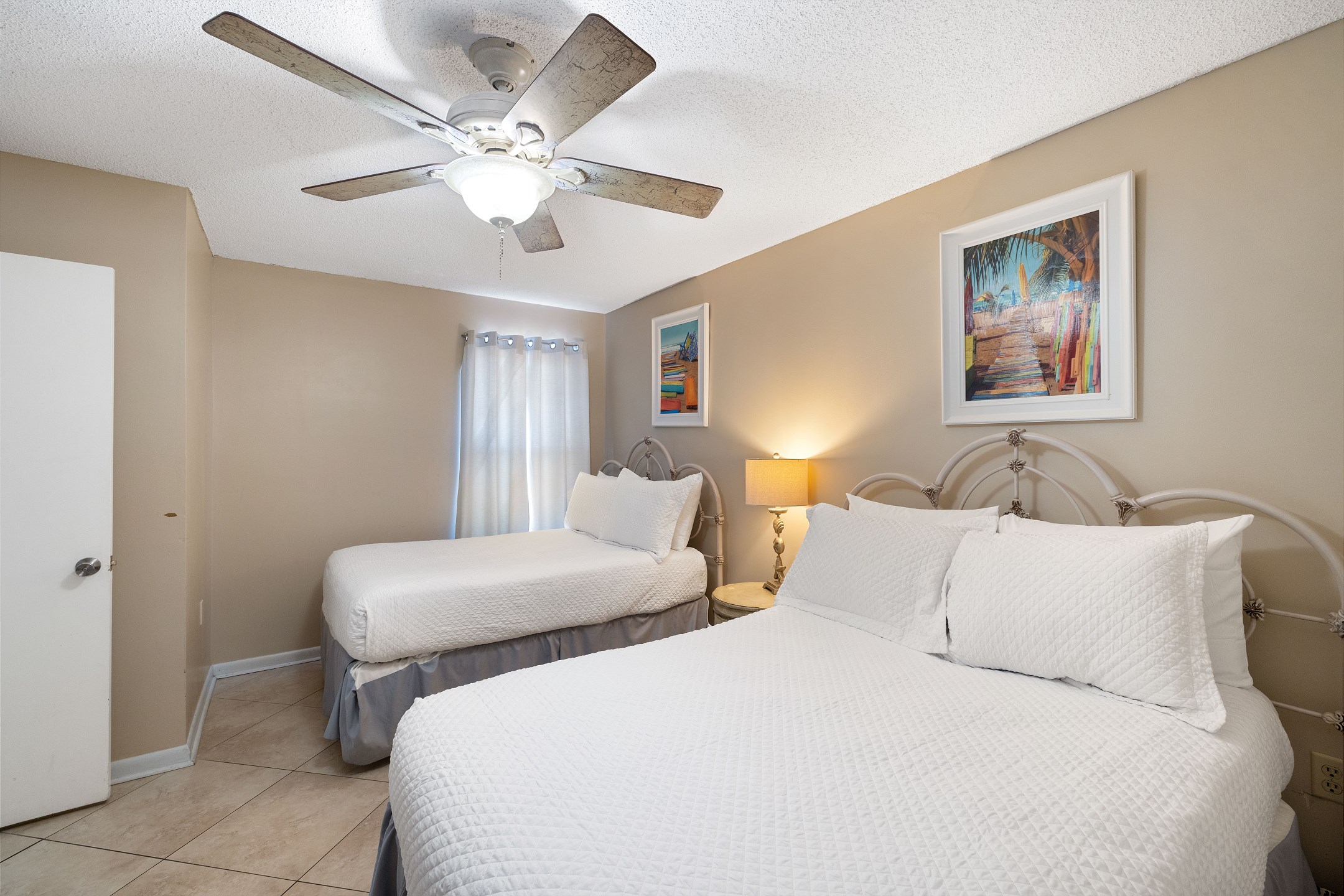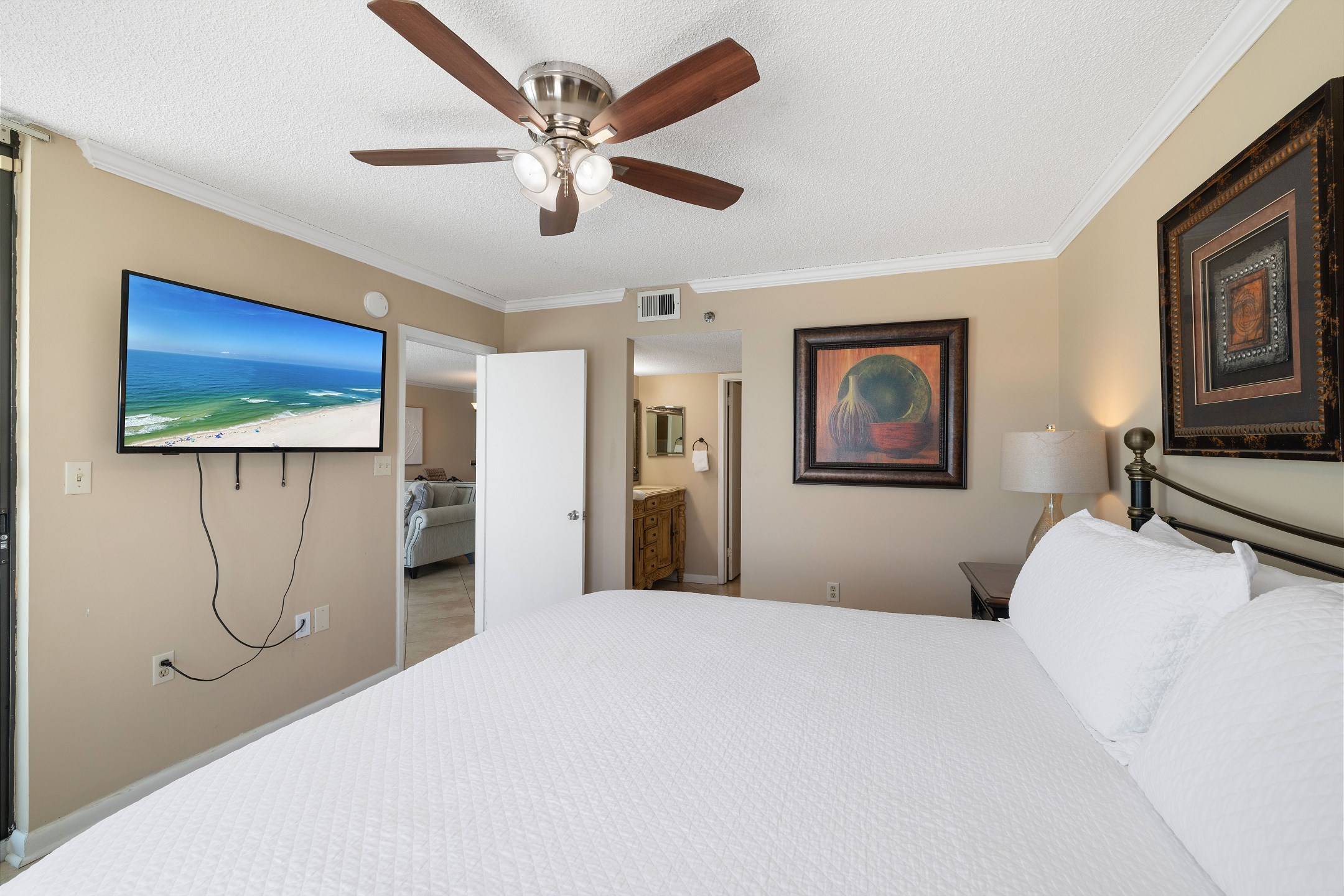 The primary bedroom is filled with natural light and features a king bed, flat screen TV, and floor-to-ceiling windows with balcony access. The ensuite bathroom includes a dual sink vanity and a beautifully tiled walk-in shower. The second bedroom offers a queen bed, along with a twin-over-twin bunk tucked neatly into the closet for additional sleeping space. The third bedroom includes two full-size beds and a flat-screen TV, with convenient access to the shared hall bathroom featuring a tiled shower-and-tub combination.