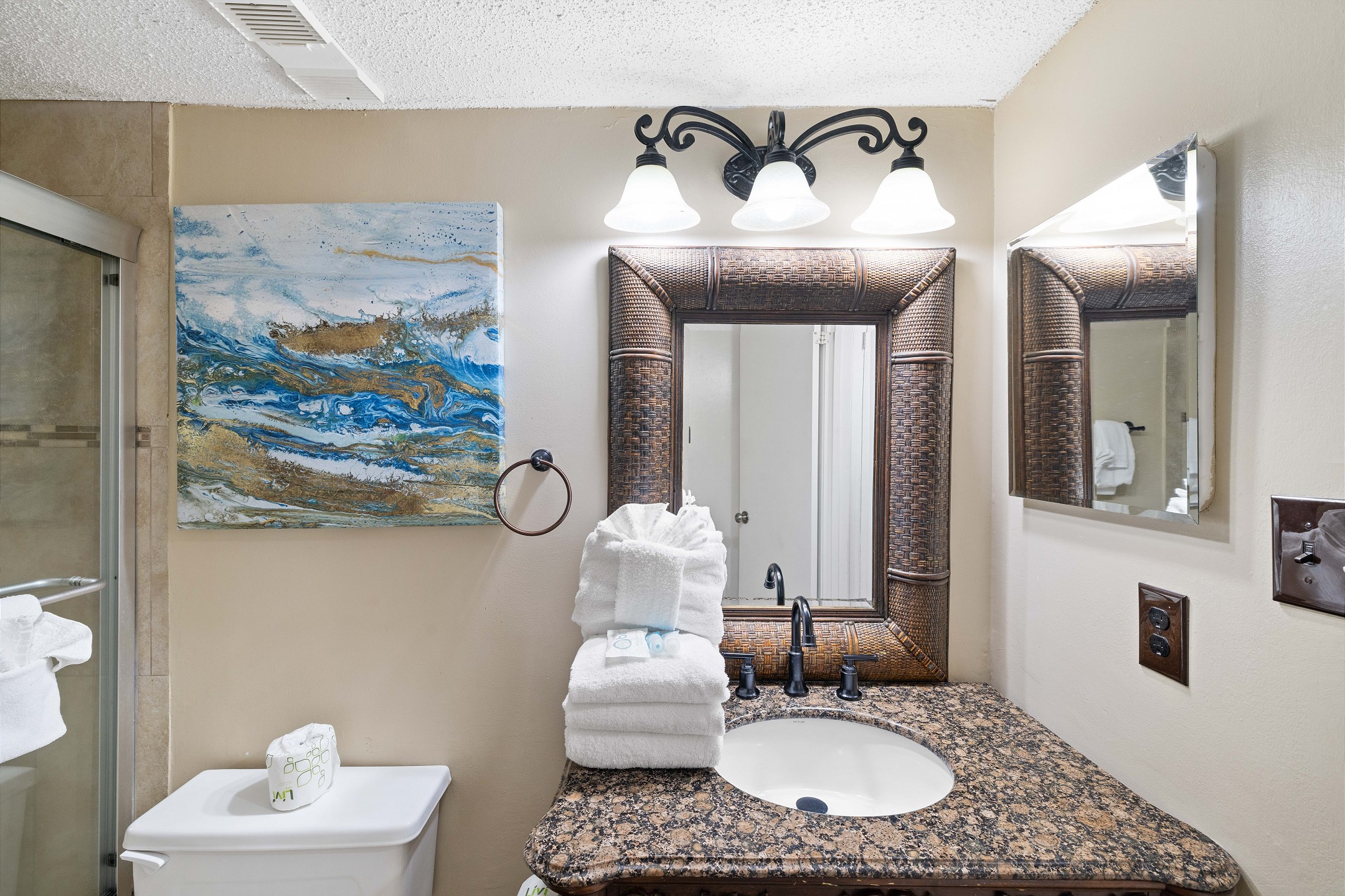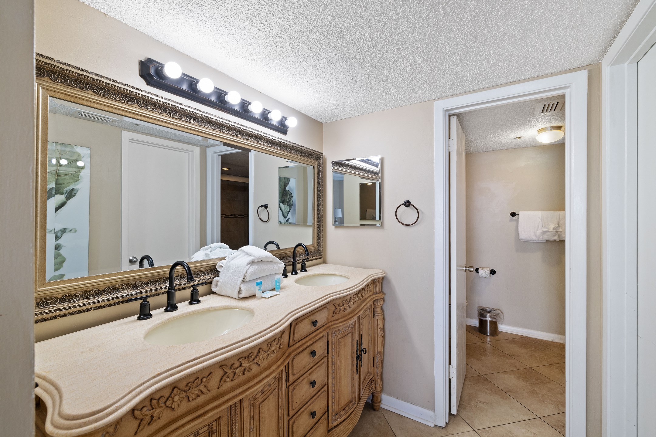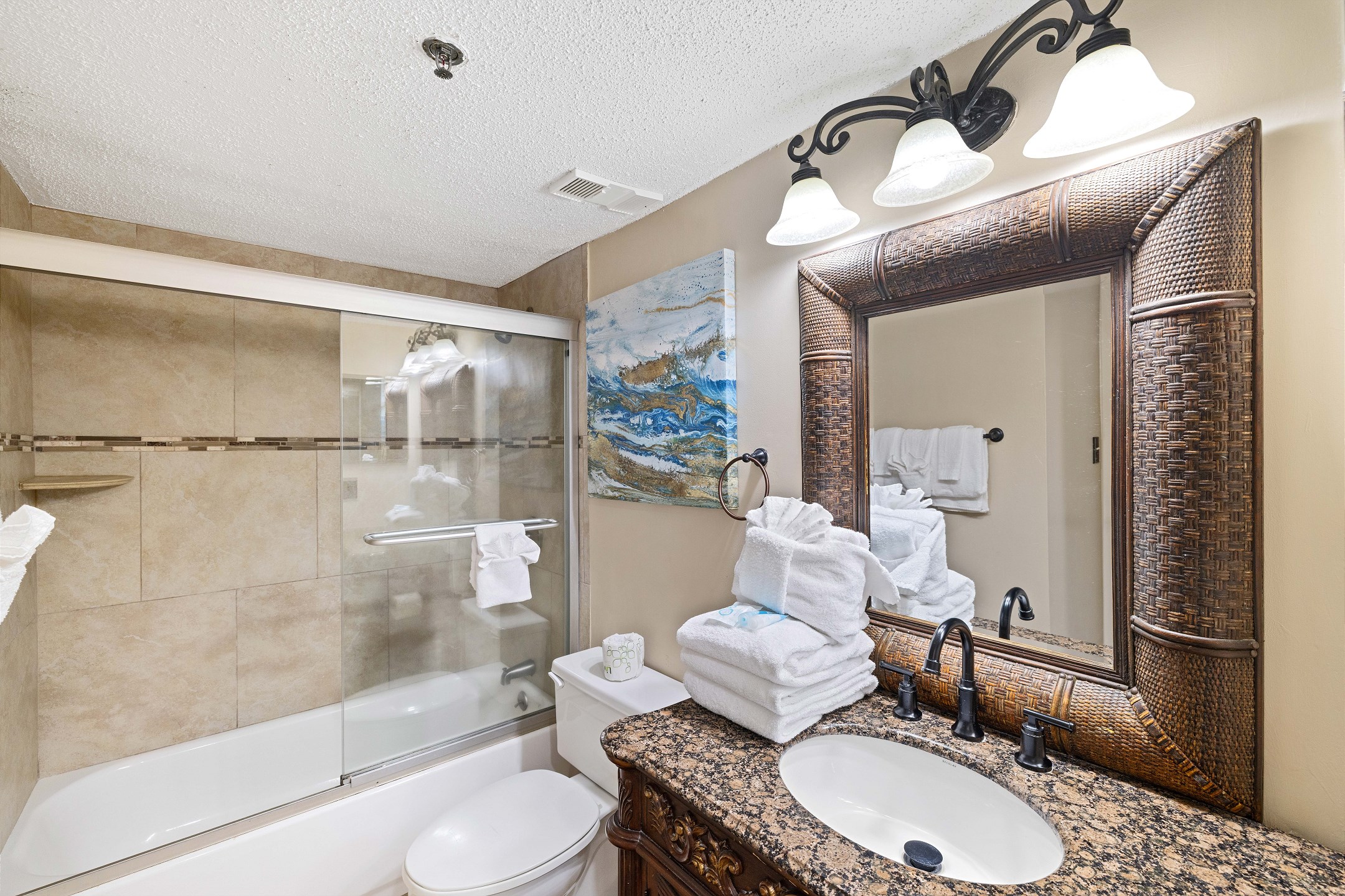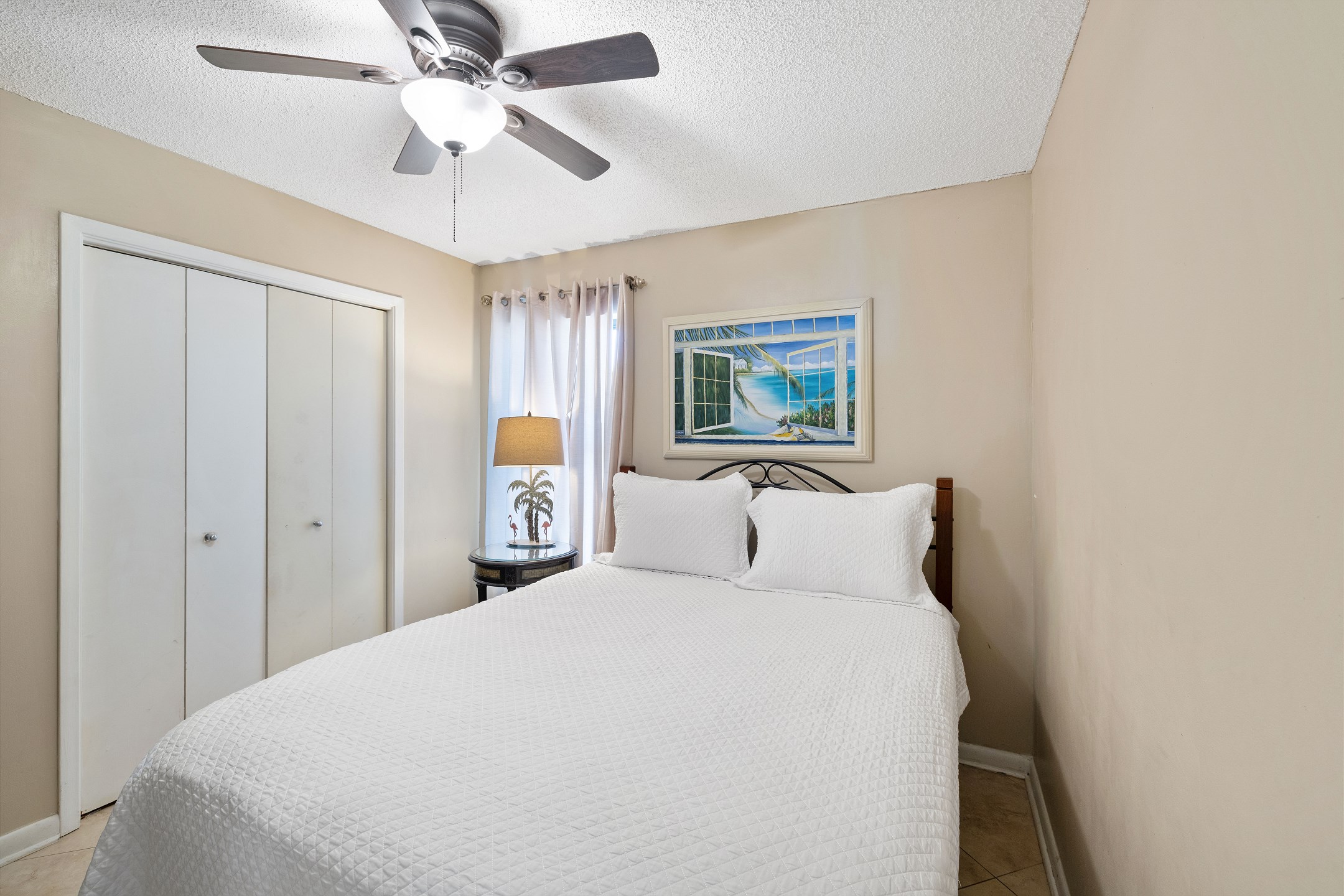 The primary bedroom is filled with natural light and features a king bed, flat screen TV, and floor-to-ceiling windows with balcony access. The ensuite bathroom includes a dual sink vanity and a beautifully tiled walk-in shower. The second bedroom offers a queen bed, along with a twin-over-twin bunk tucked neatly into the closet for additional sleeping space. The third bedroom includes two full-size beds and a flat-screen TV, with convenient access to the shared hall bathroom featuring a tiled shower-and-tub combination.