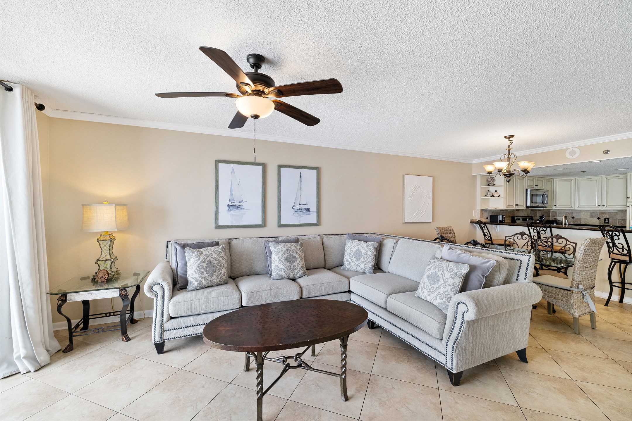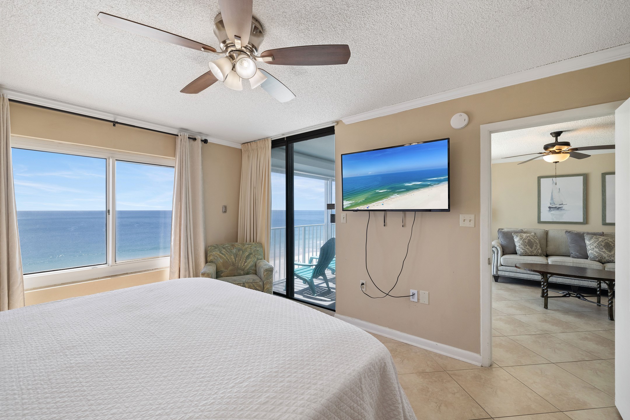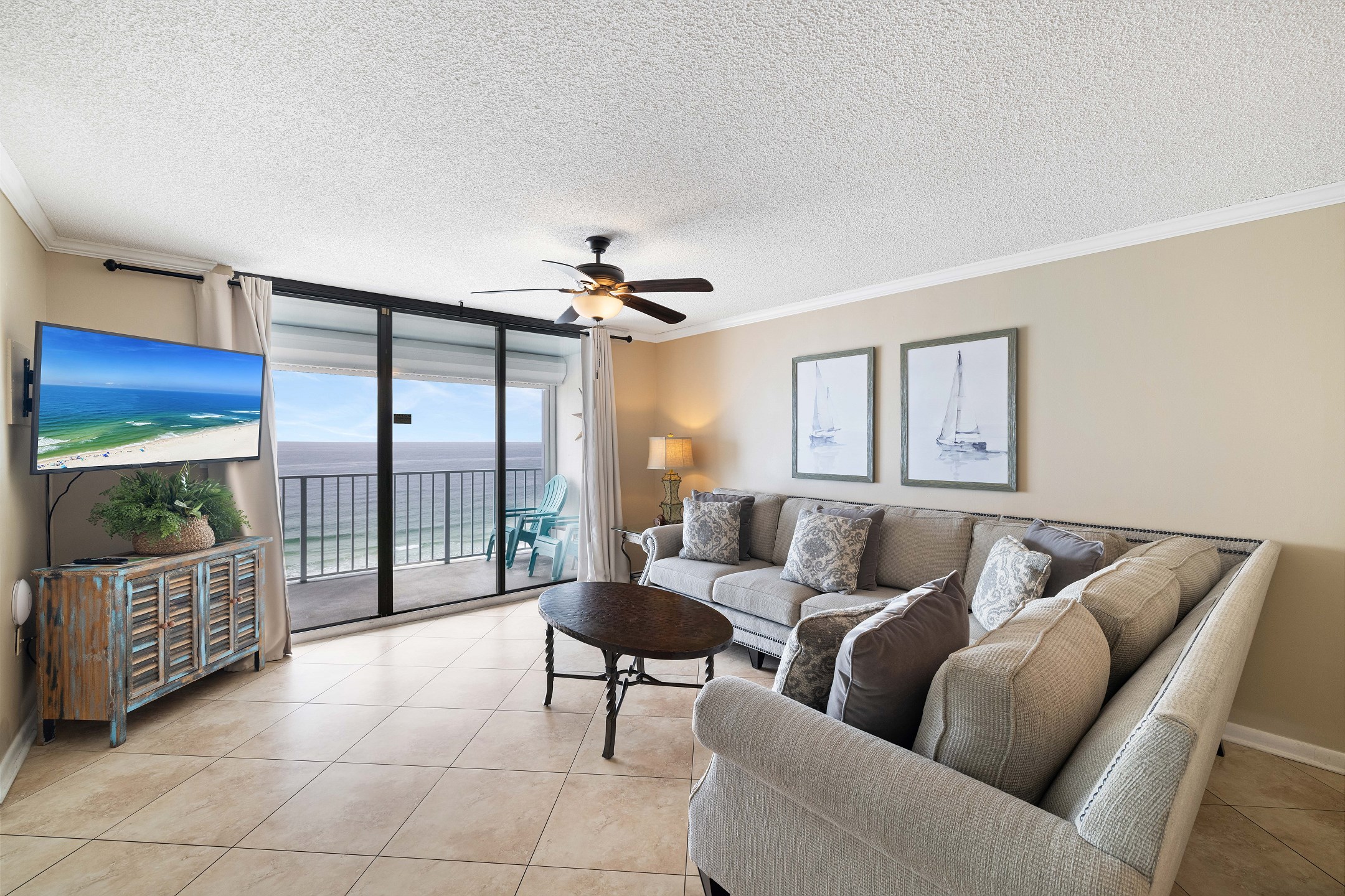 The living room features a large sectional sofa, a flat screen TV, and floor-to-ceiling windows that lead out to the private balcony overlooking the Gulf. The balcony offers plenty of seating, making it the perfect place to relax and enjoy the coastal views.