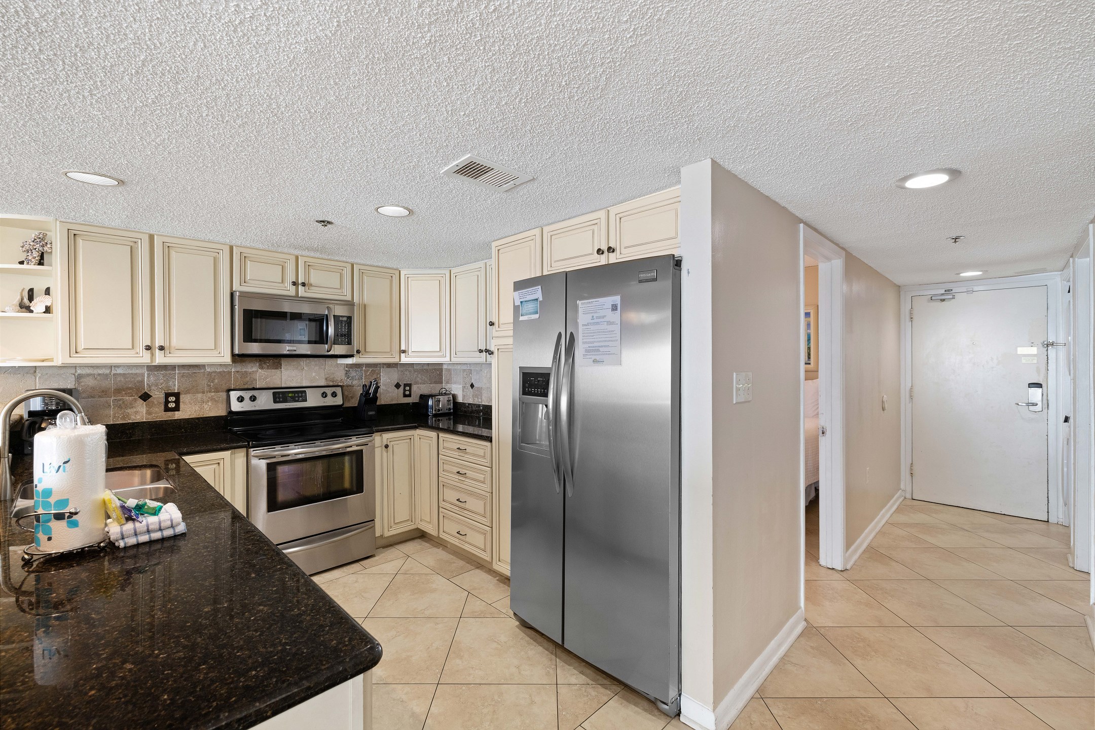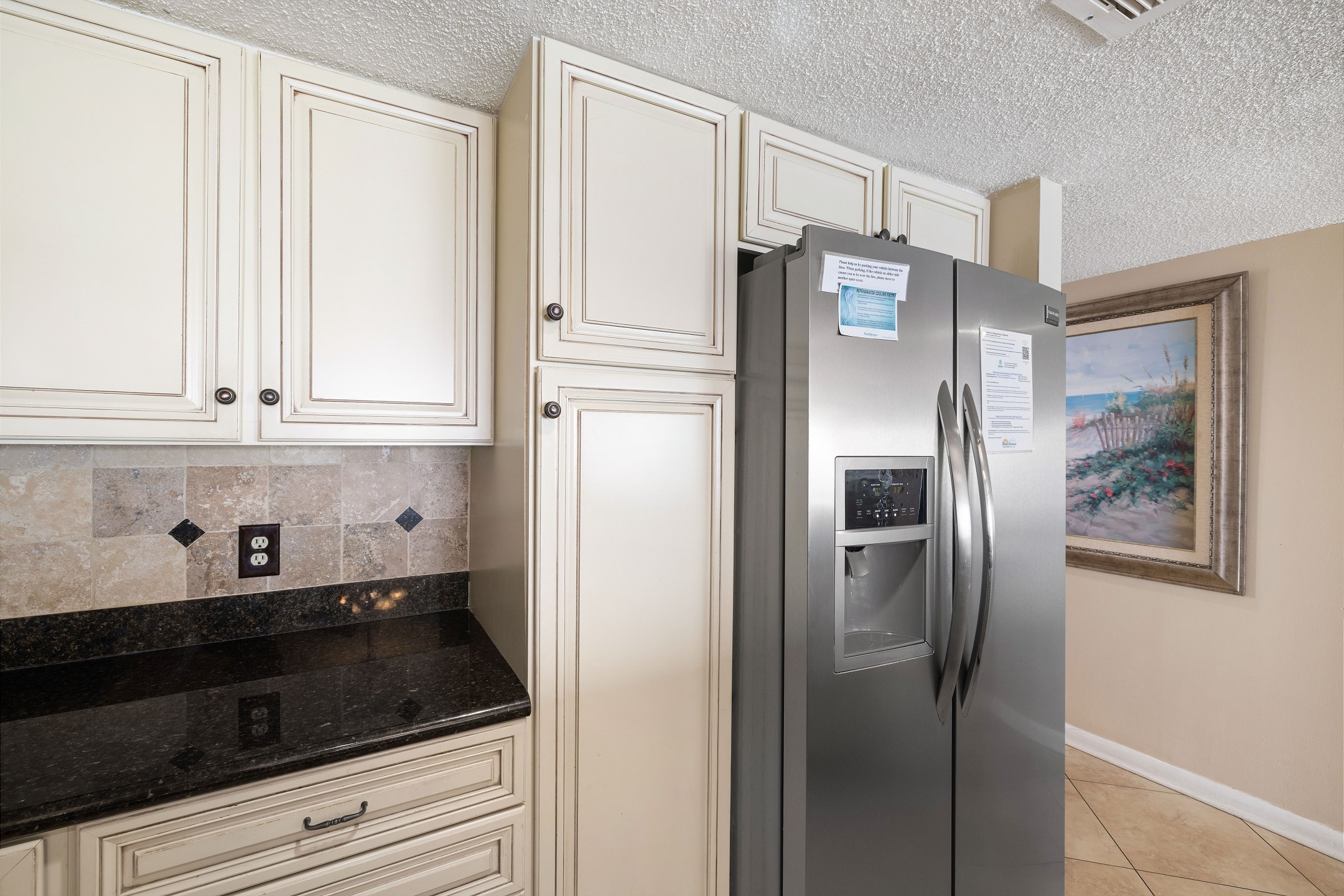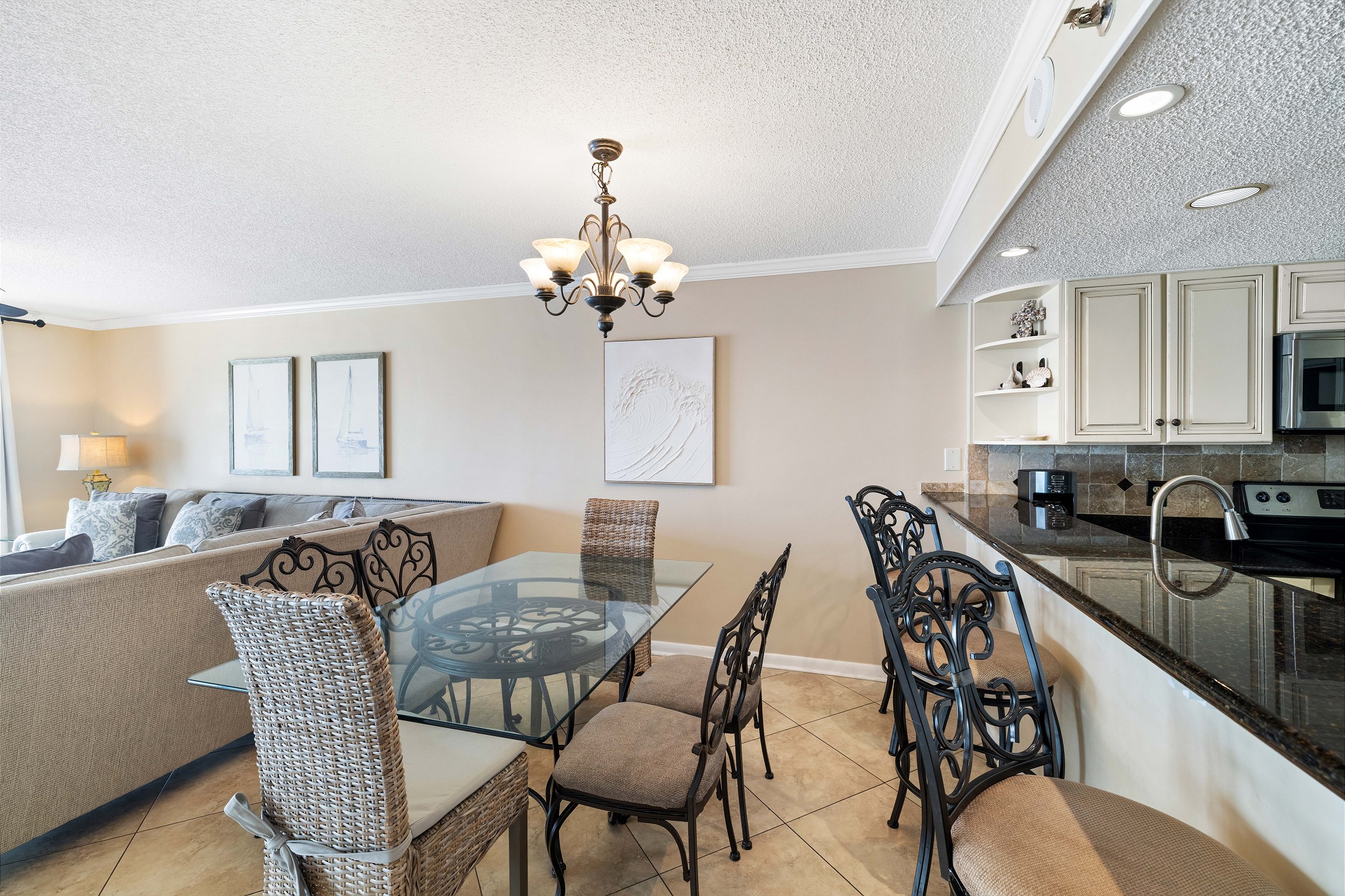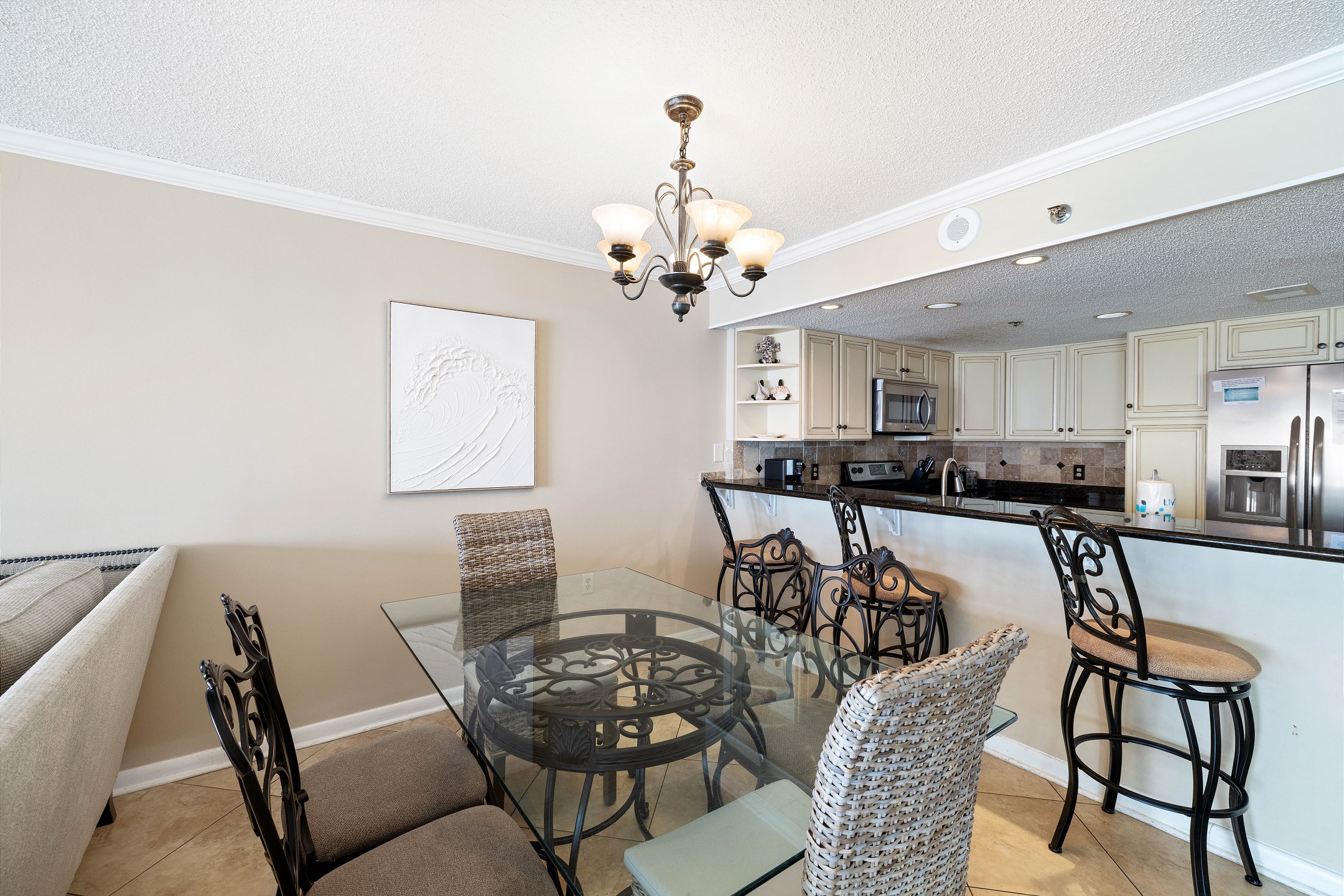 The fully equipped kitchen includes stainless steel appliances, granite countertops, and a dining table for gathering and sharing meals together.
