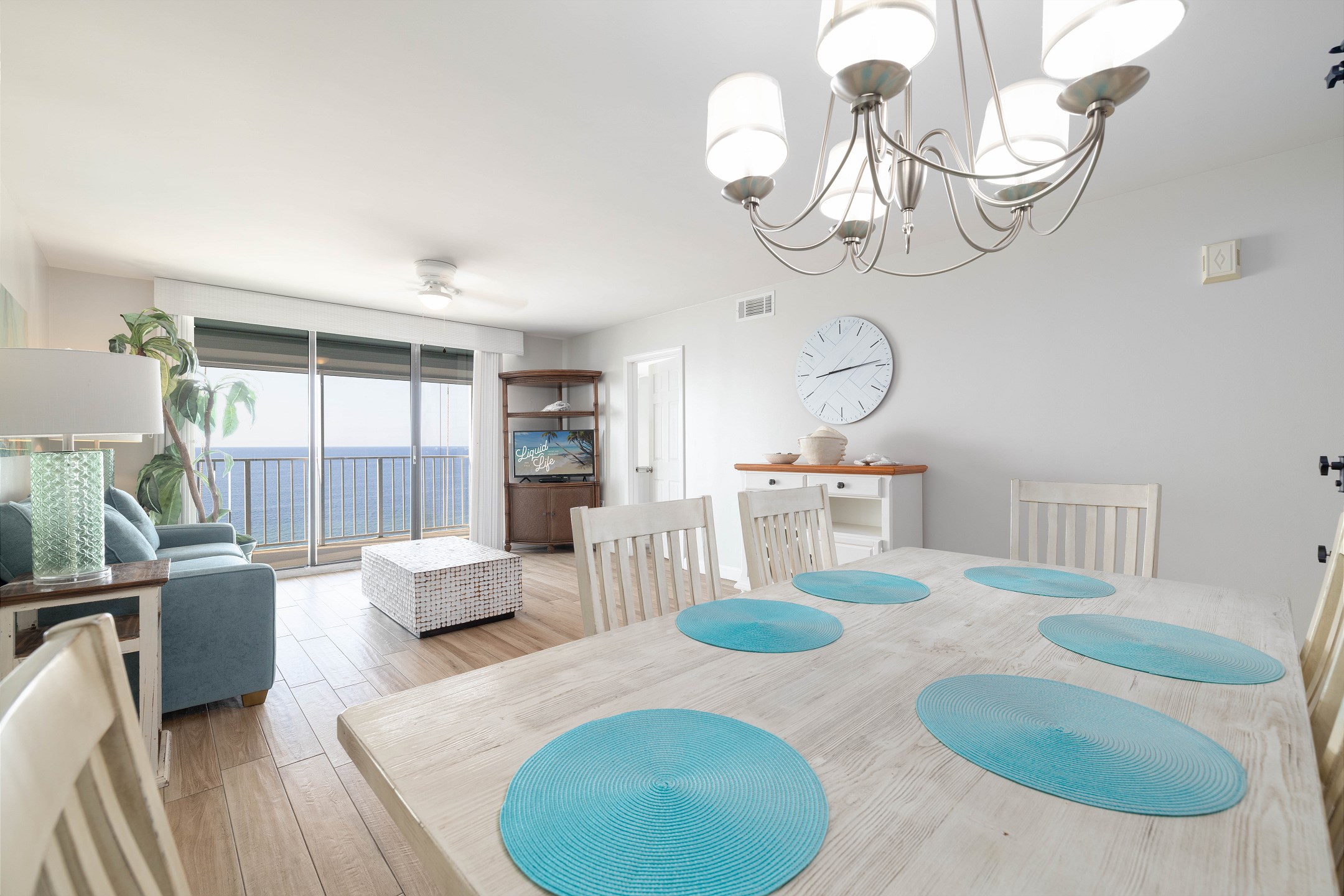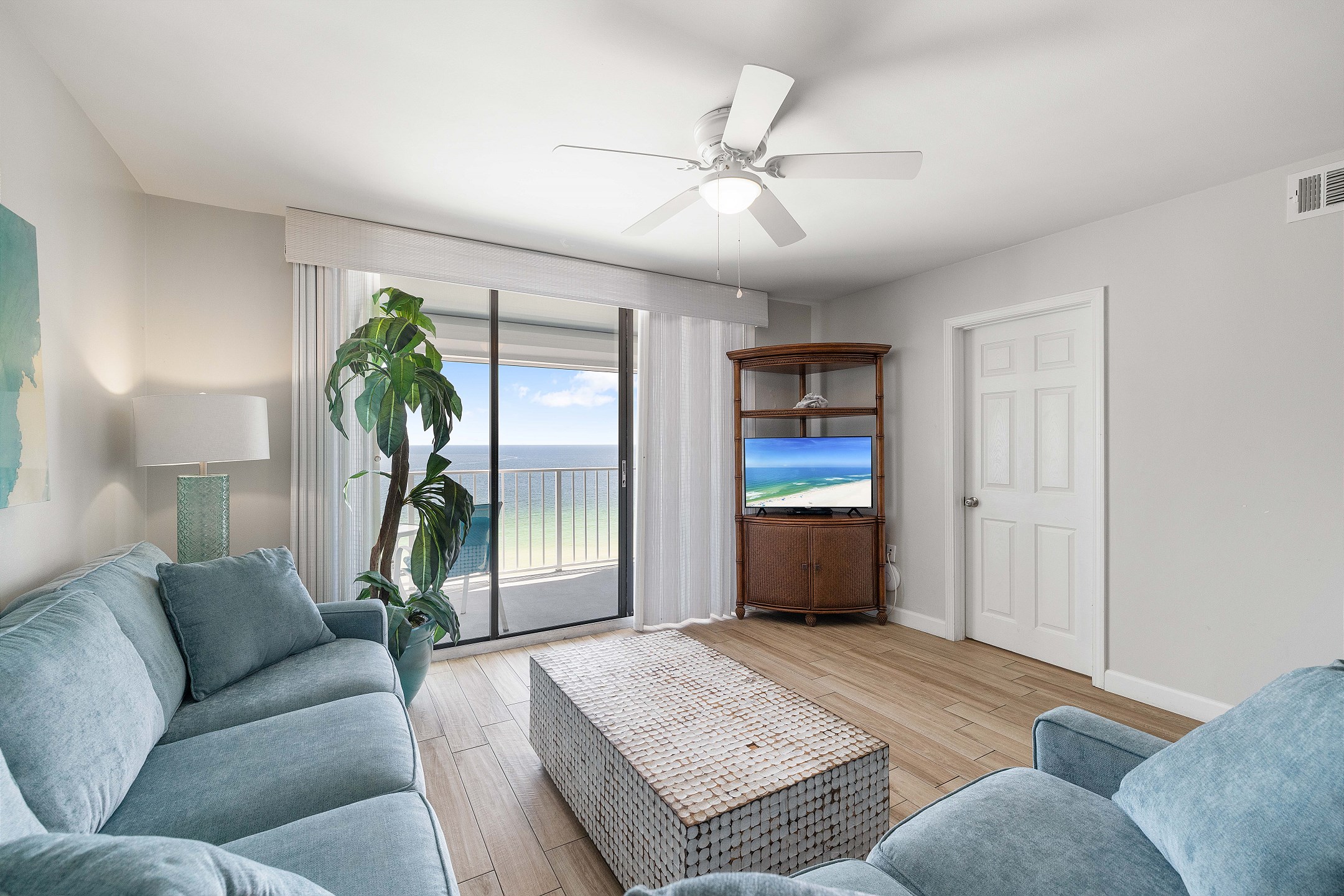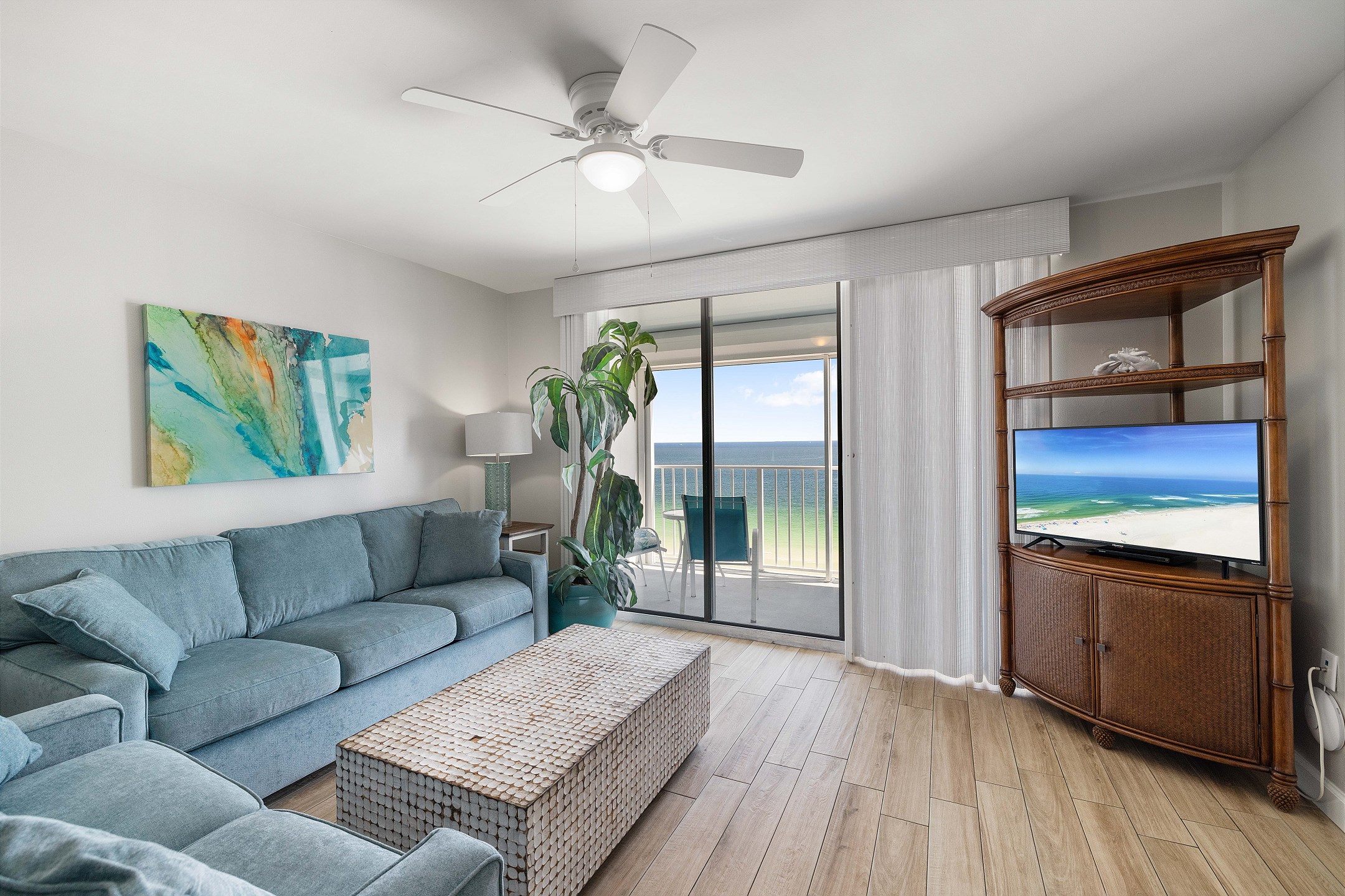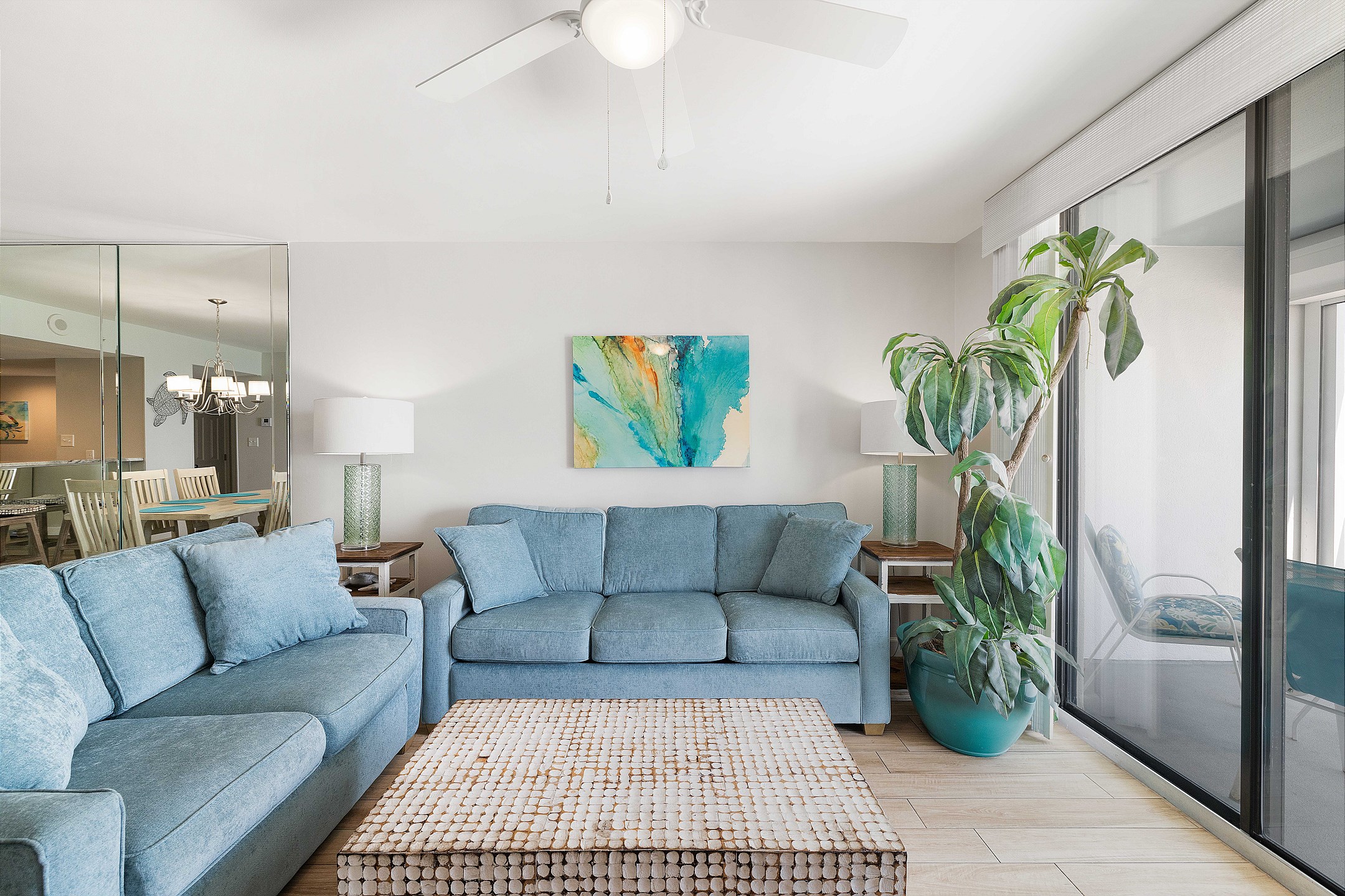 The condo's living room opens up to a private balcony, offering unparalleled views of the Gulf of Mexico. It's the perfect spot to breathe in the fresh Gulf air and soak in the vibrant hues of the horizon.