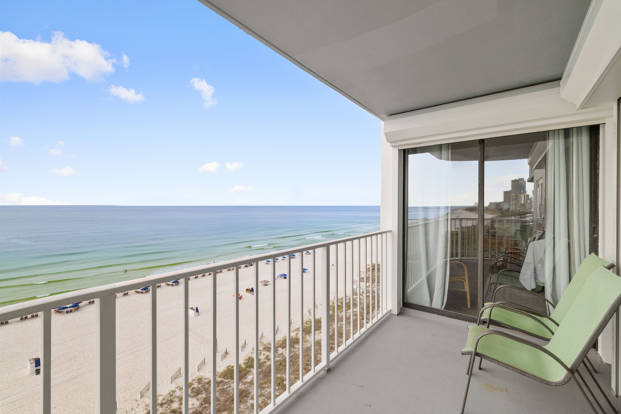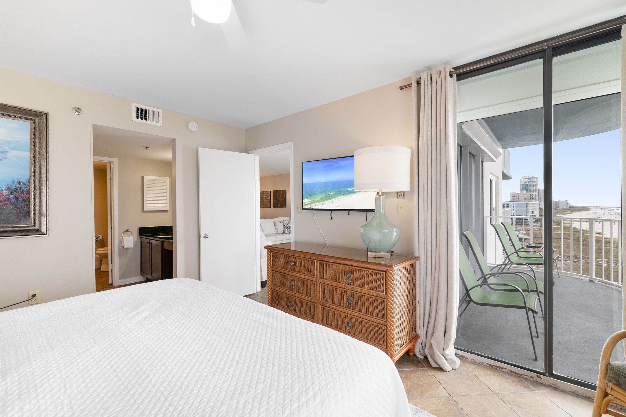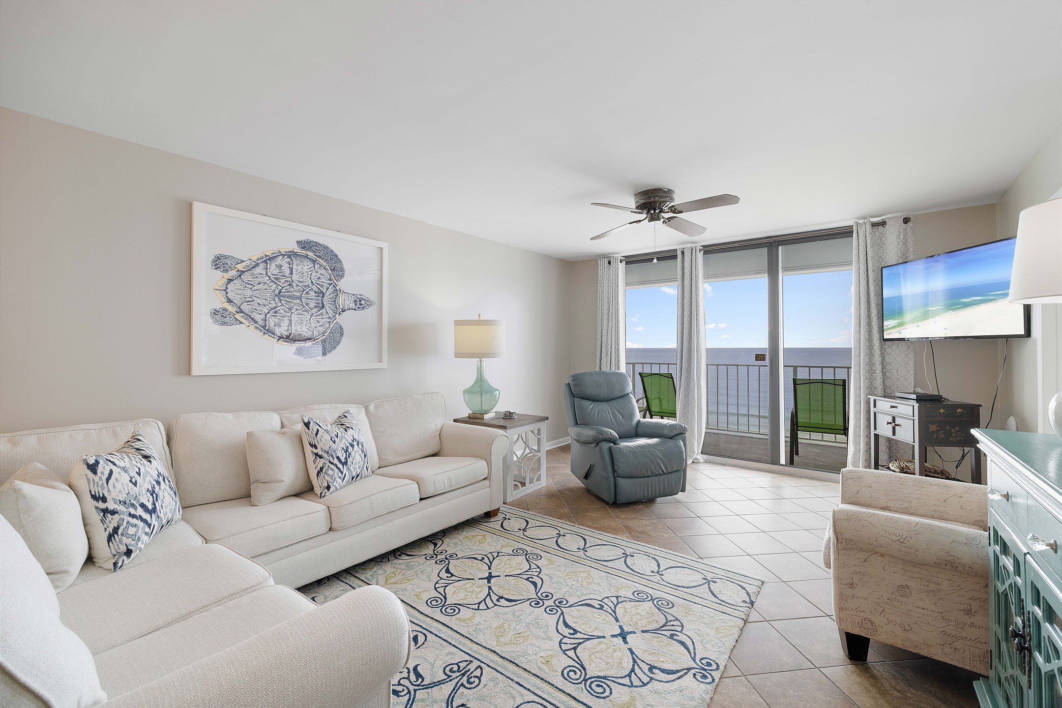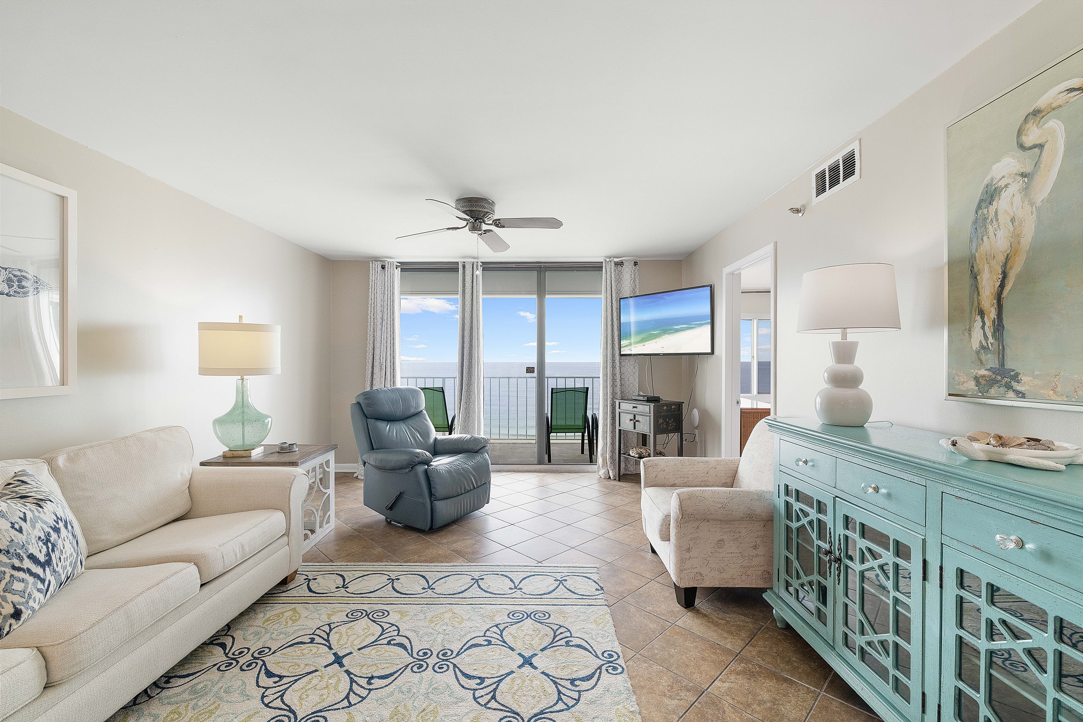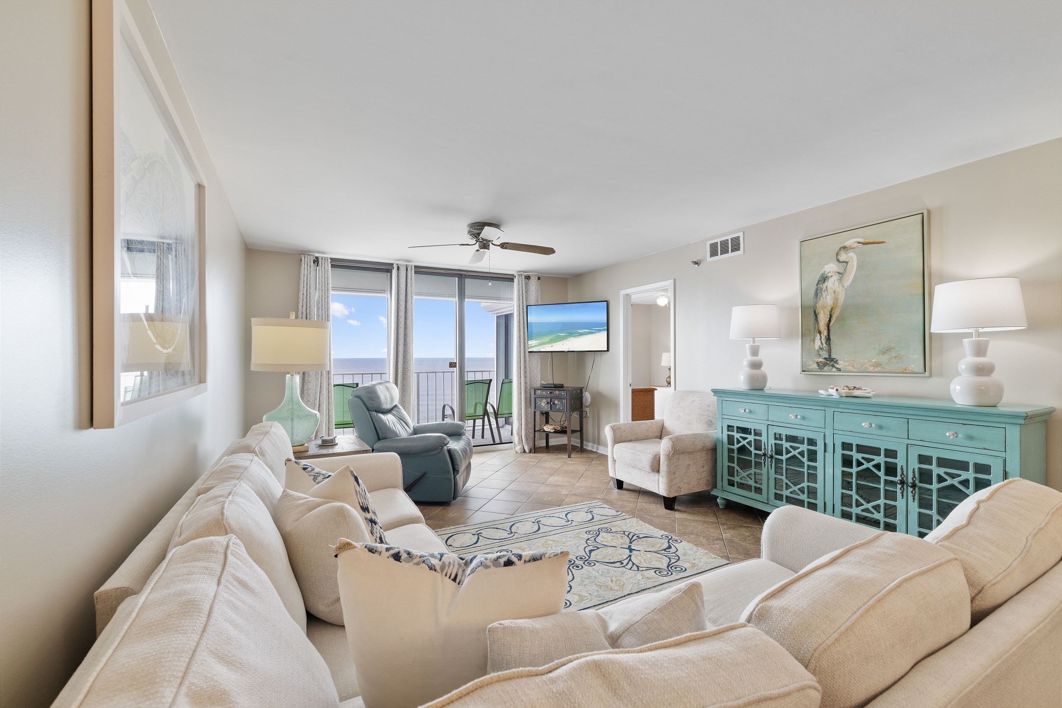 The condo's heart is its inviting living room, complete with a sofa sleeper for extra guests. Step onto the private balcony, accessible from both the living room and the Primary suite, and immerse yourself in the spectacular views of the Gulf of Mexico. It's the perfect spot for morning coffees, evening cocktails, or simply soaking up the sun's warmth.