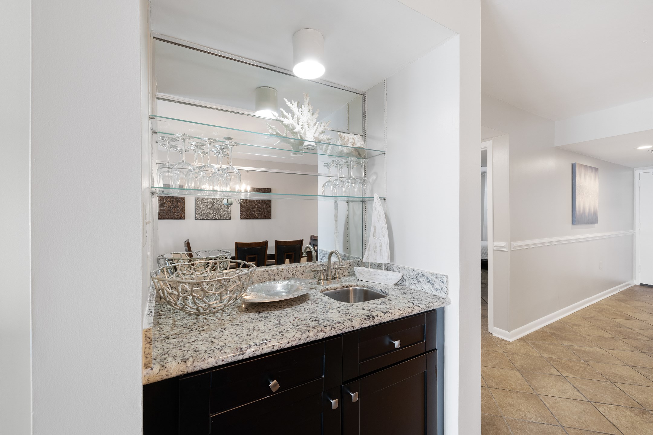 Modern amenities haven't been overlooked—free wireless internet access ensures you stay connected, while the fully equipped kitchen boasts granite countertops and stainless steel appliances, allowing you to cook and entertain with ease. A wet bar adds a touch of sophistication to your stay.