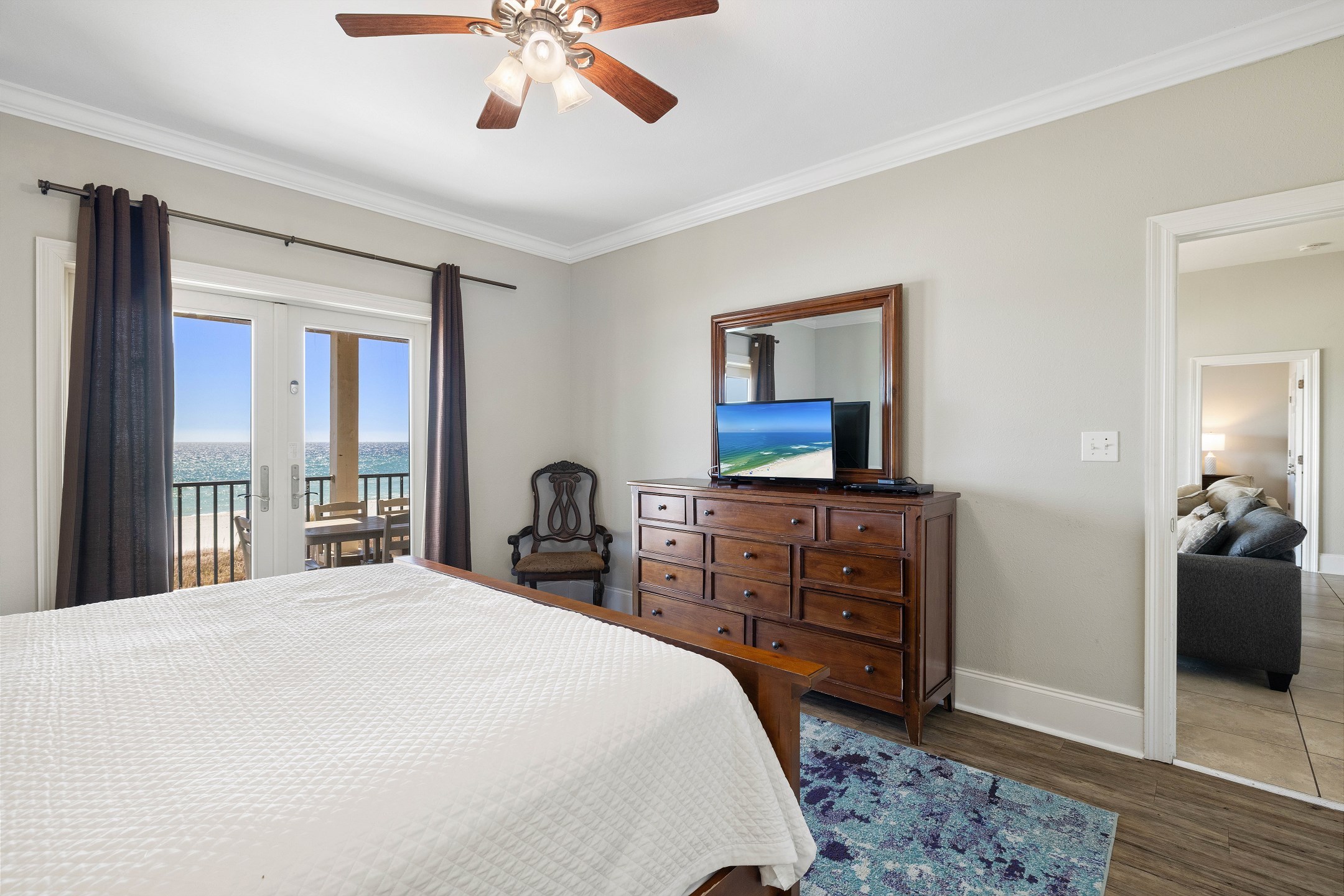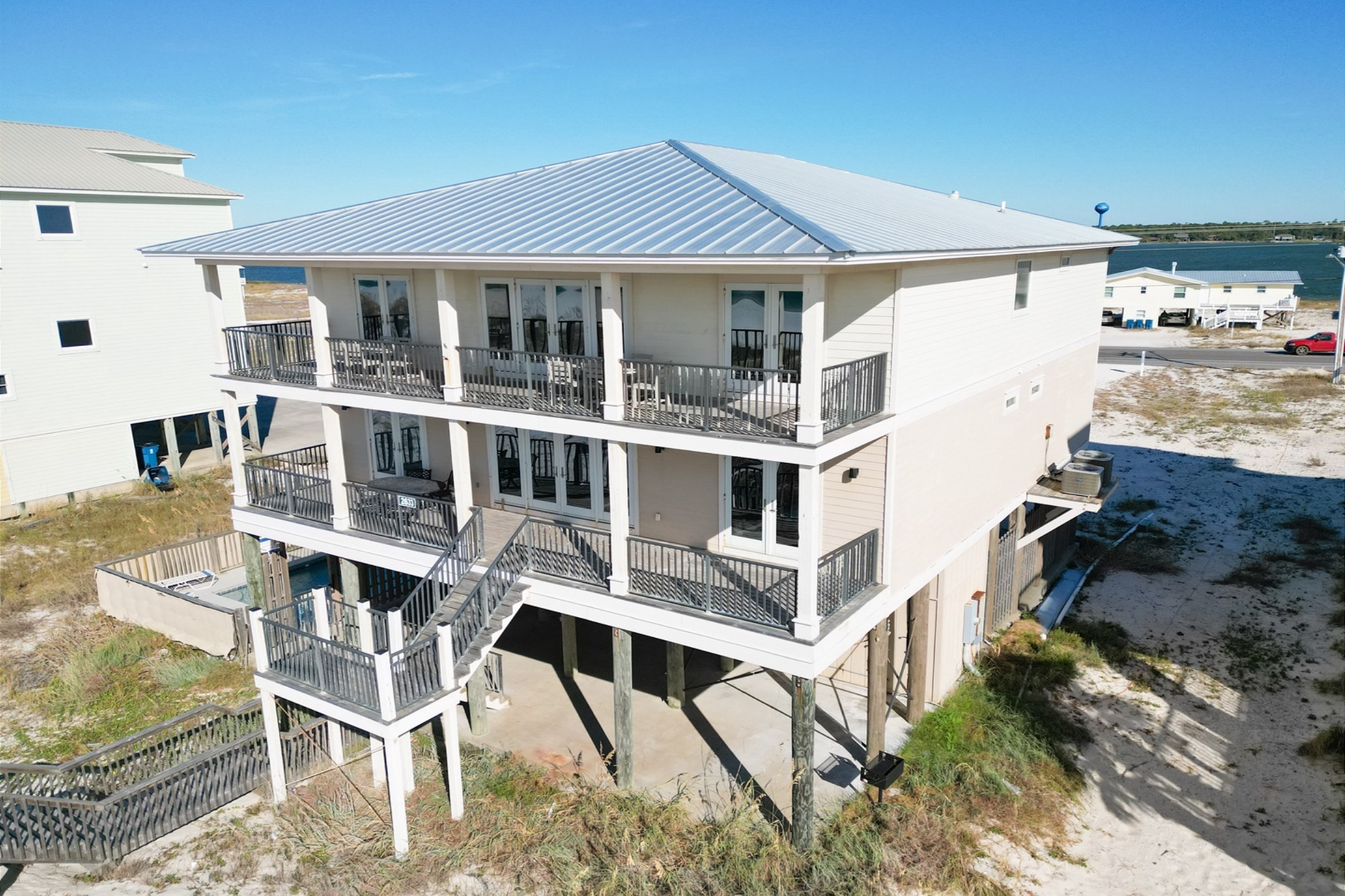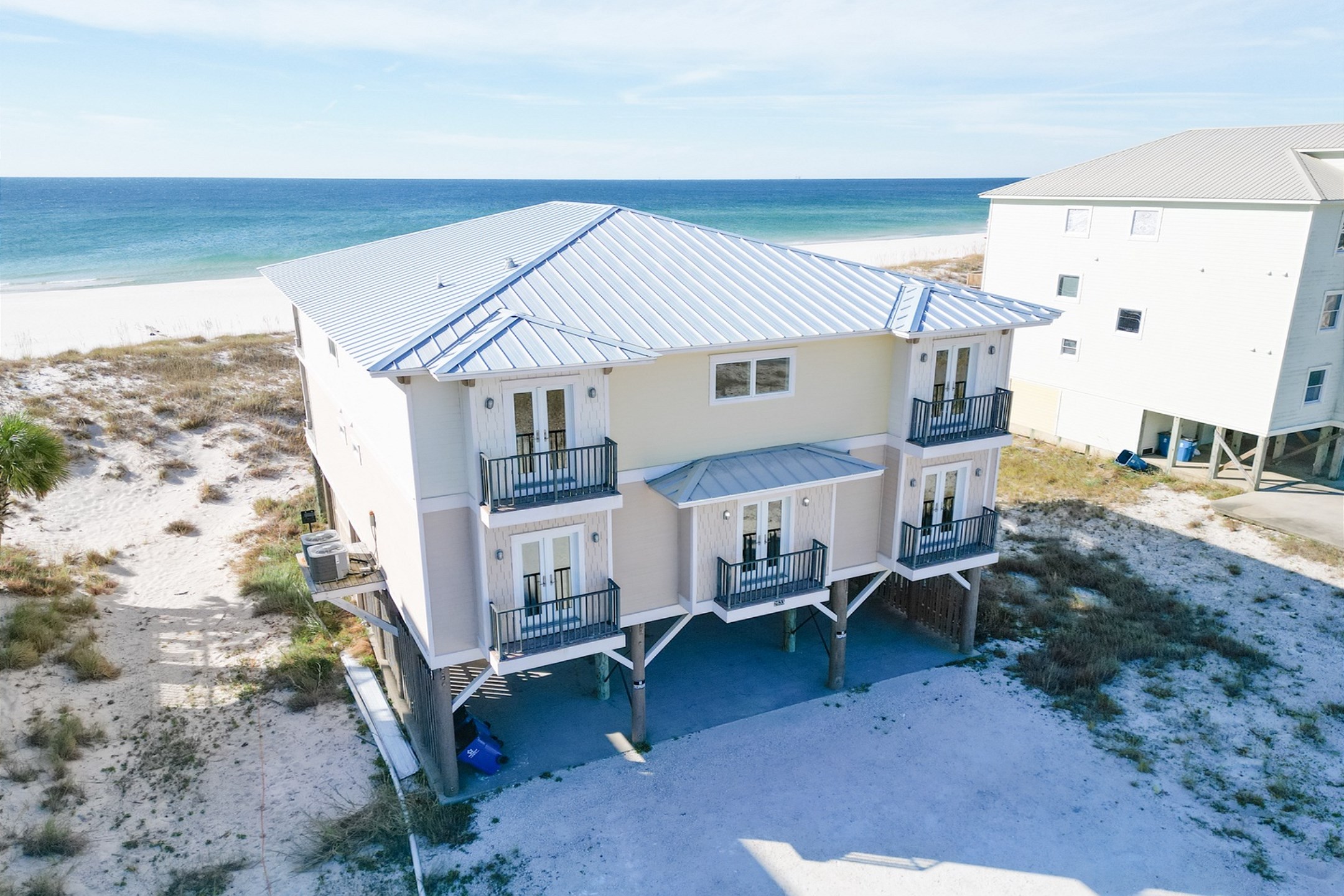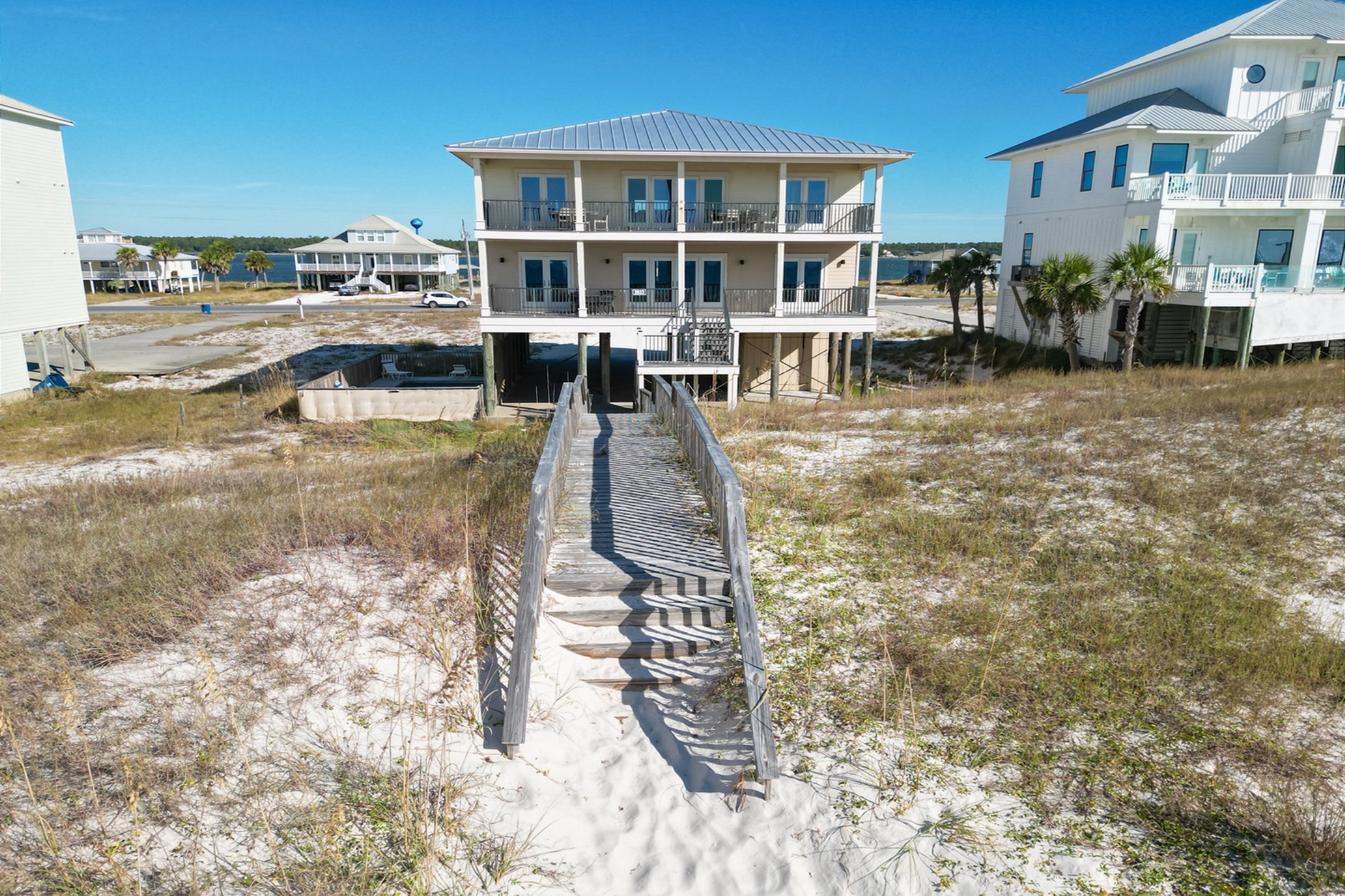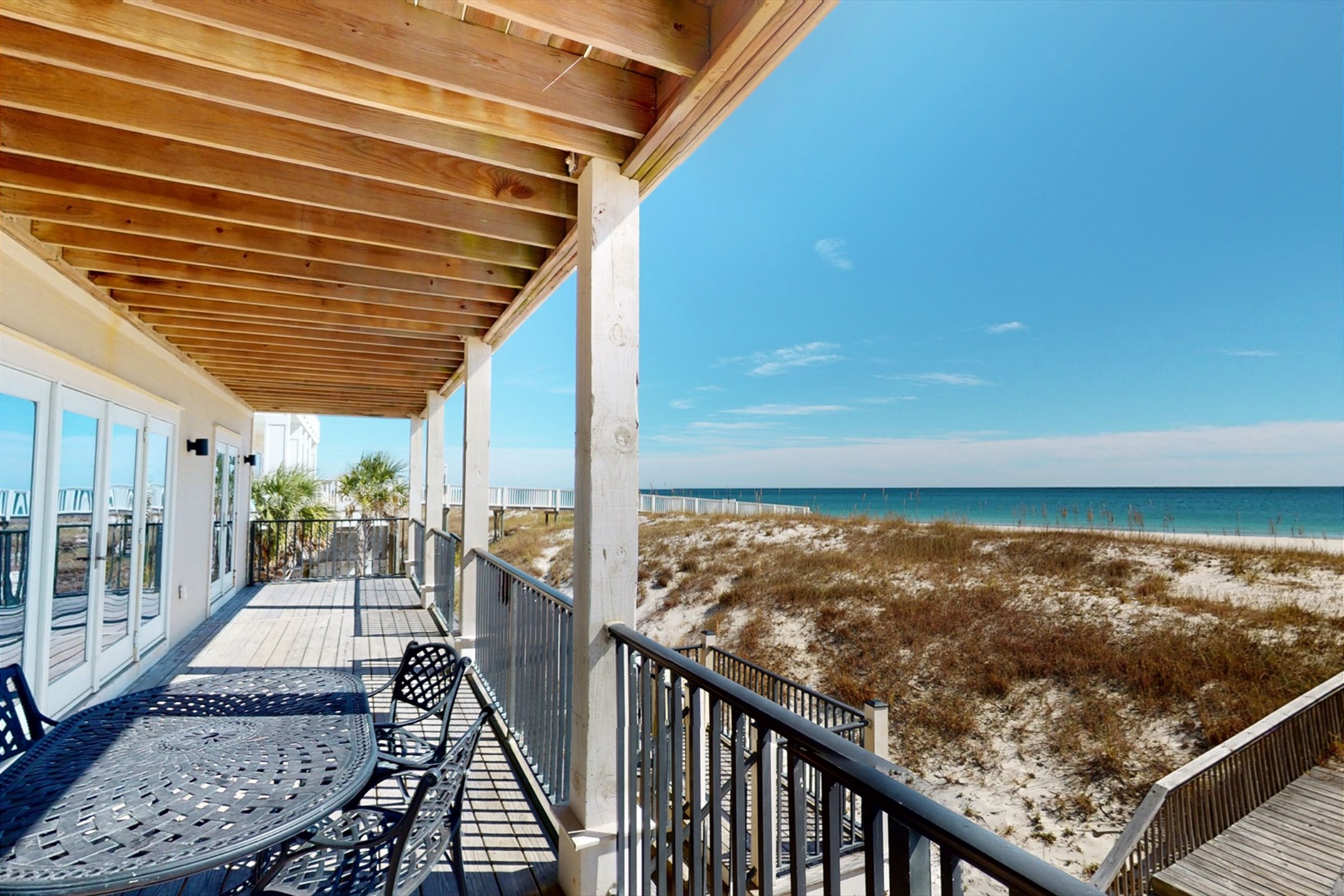 The main floor offers an open-concept living area with plenty of space for gathering, a fully equipped kitchen with two dishwashers, and two dining tables in a large dining area designed for group meals. Step outside to enjoy multiple balconies with shaded seating and breathtaking Gulf views, or head straight down your private boardwalk to the sugar-white sand. A private pool adds the perfect spot to relax between beach days.