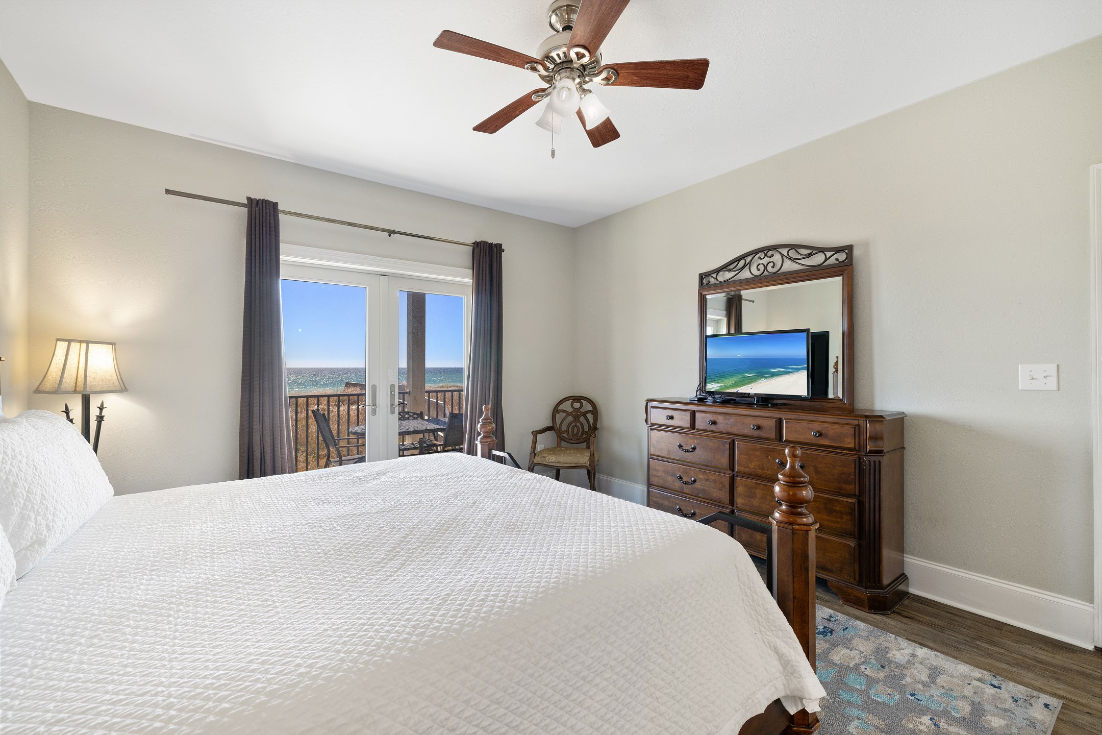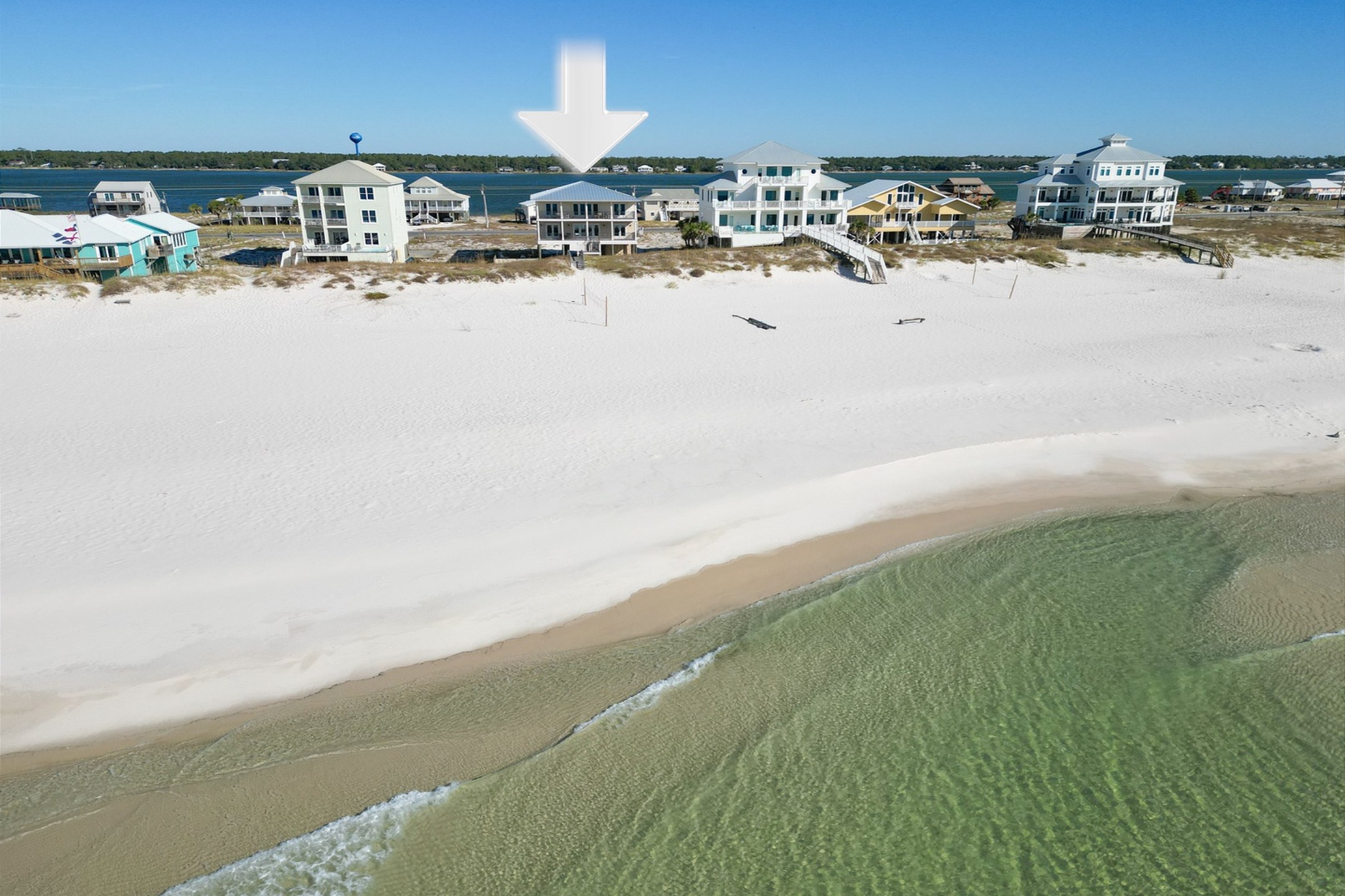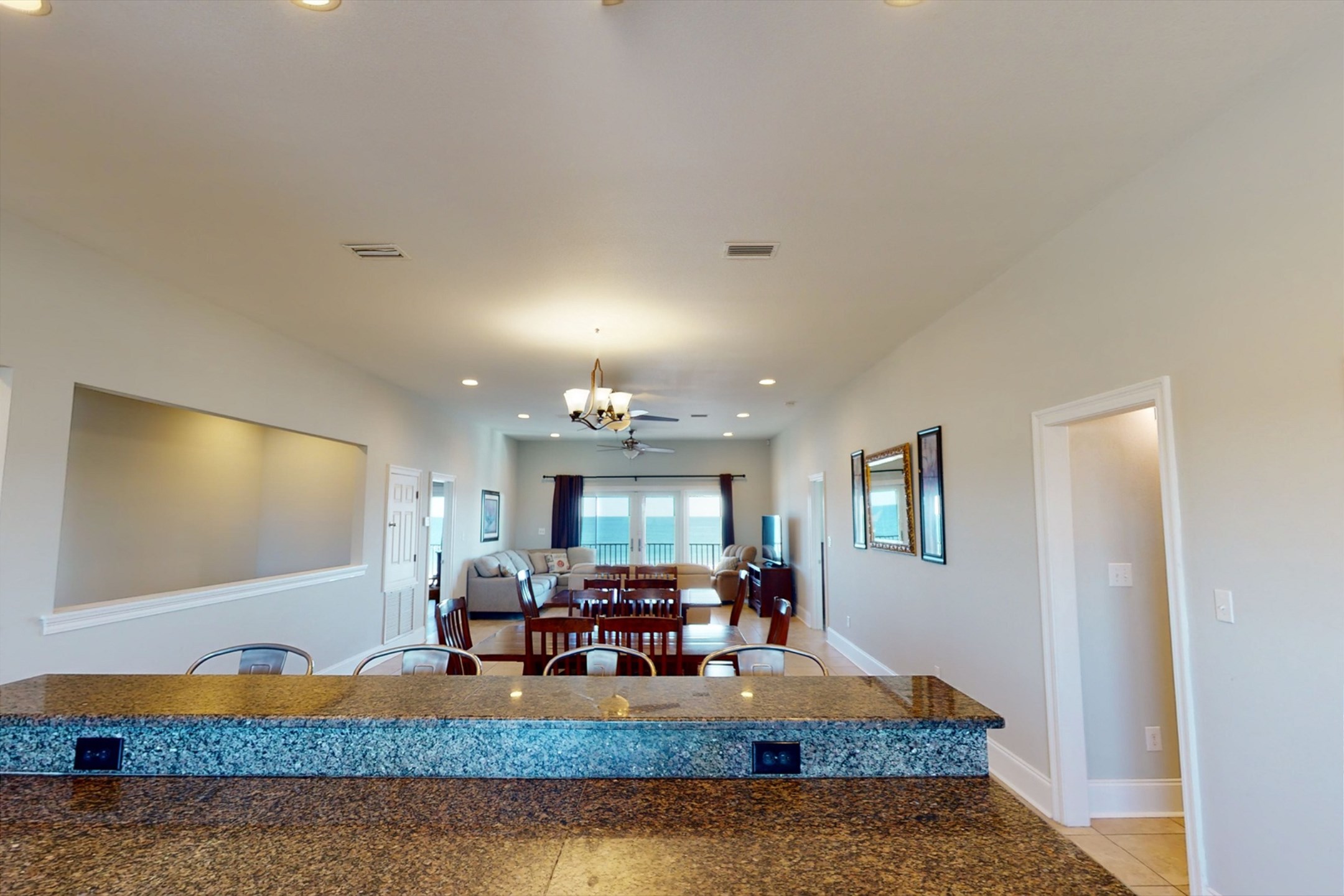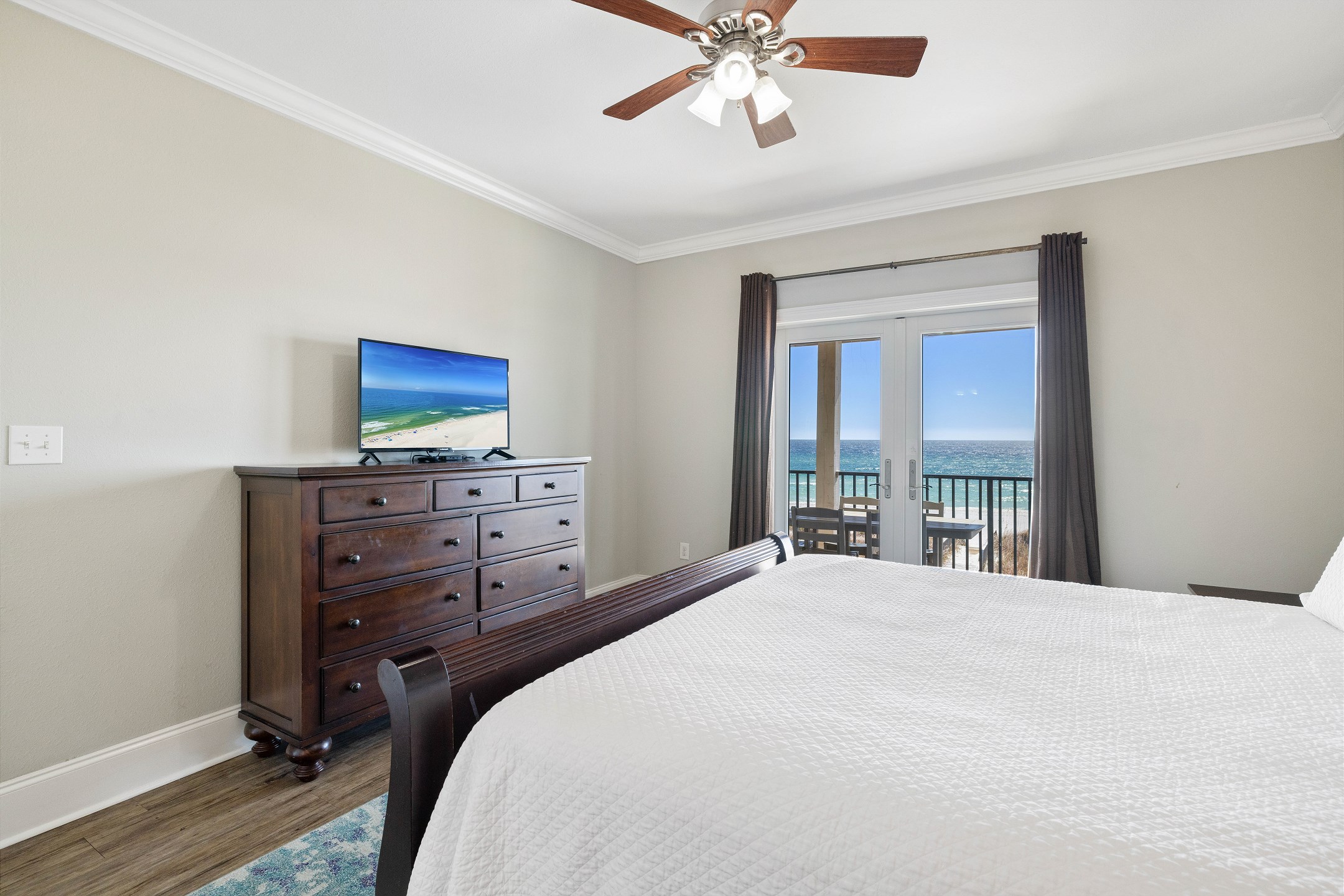The main floor offers an open-concept living area with plenty of space for gathering, a fully equipped kitchen with two dishwashers, and two dining tables in a large dining area designed for group meals. Step outside to enjoy multiple balconies with shaded seating and breathtaking Gulf views, or head straight down your private boardwalk to the sugar-white sand. A private pool adds the perfect spot to relax between beach days.