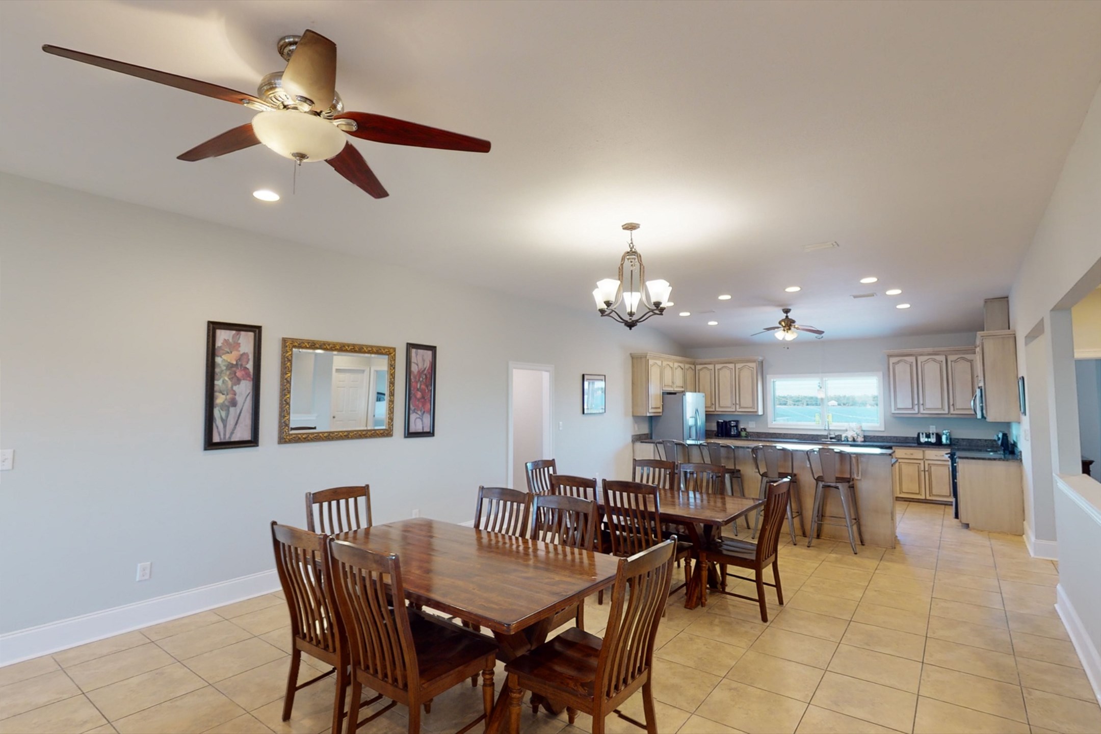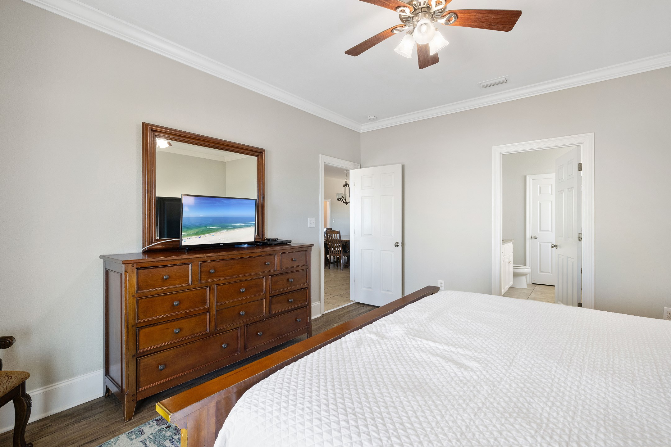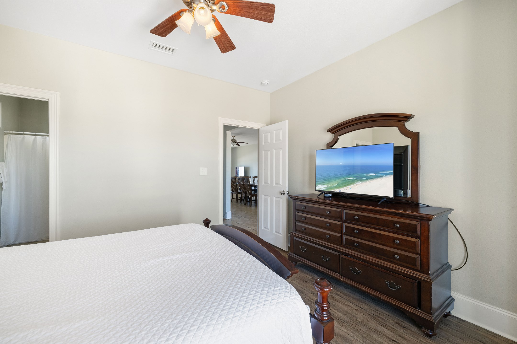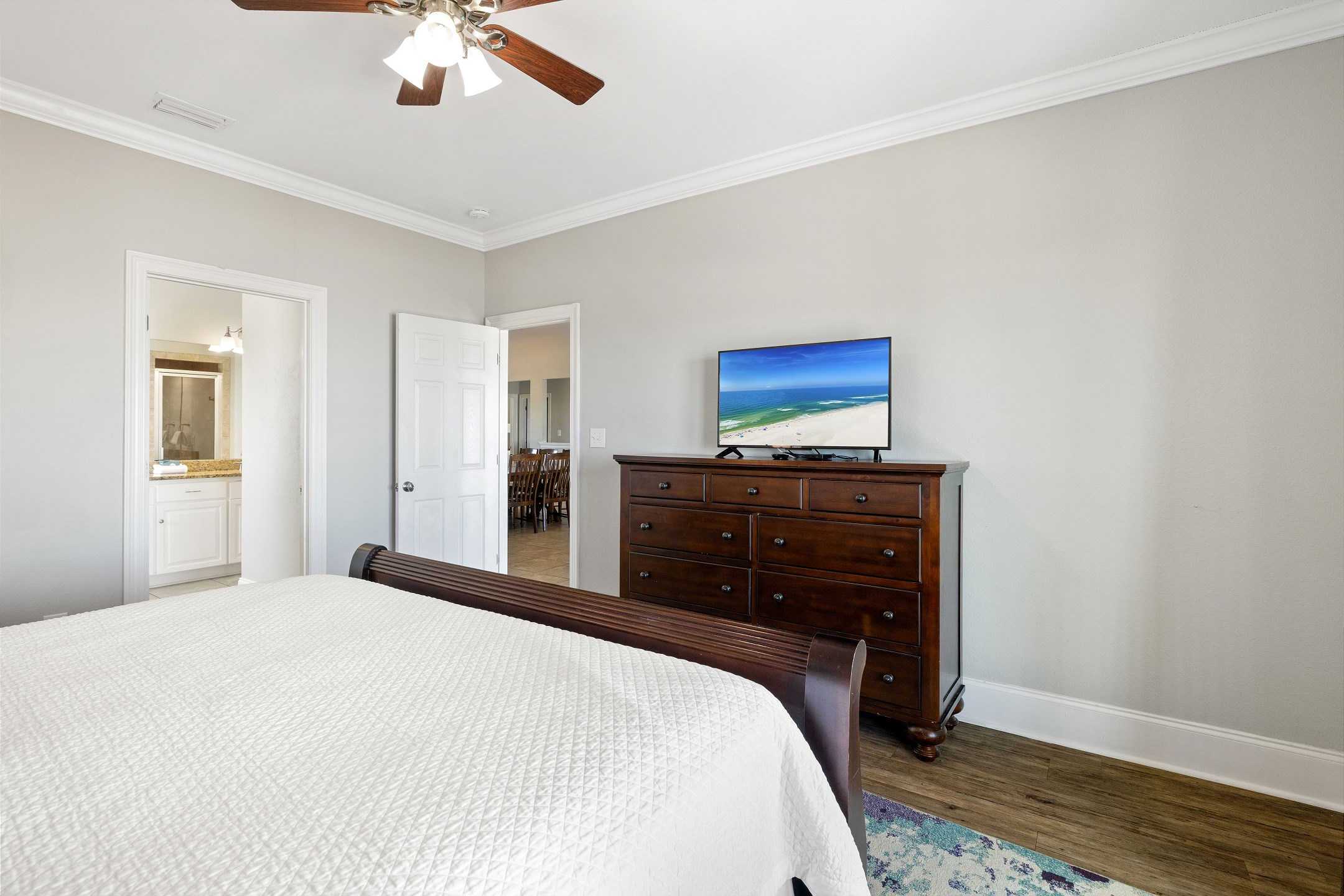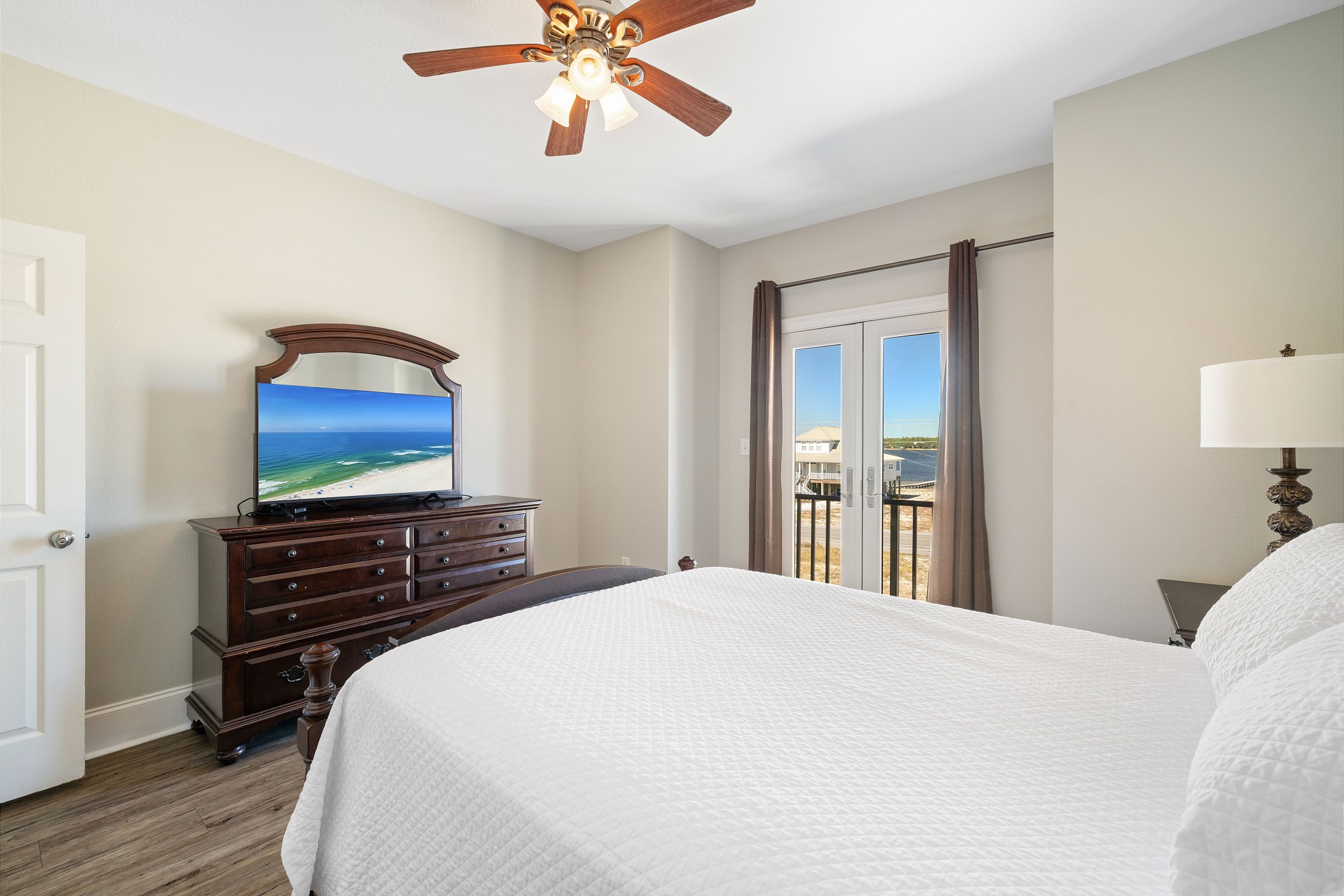 The main floor offers an open-concept living area with plenty of space for gathering, a fully equipped kitchen with two dishwashers, and two dining tables in a large dining area designed for group meals. Step outside to enjoy multiple balconies with shaded seating and breathtaking Gulf views, or head straight down your private boardwalk to the sugar-white sand. A private pool adds the perfect spot to relax between beach days.