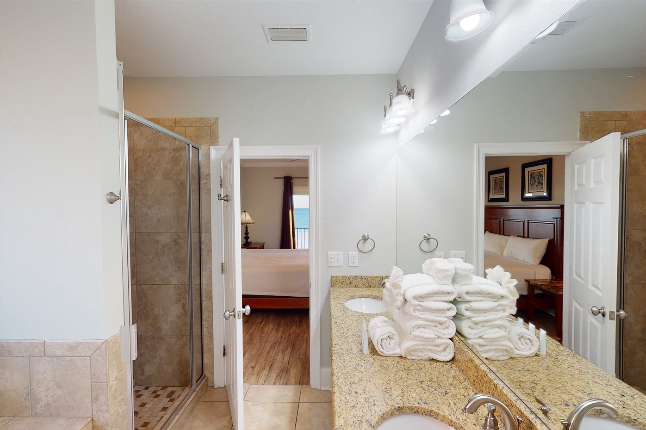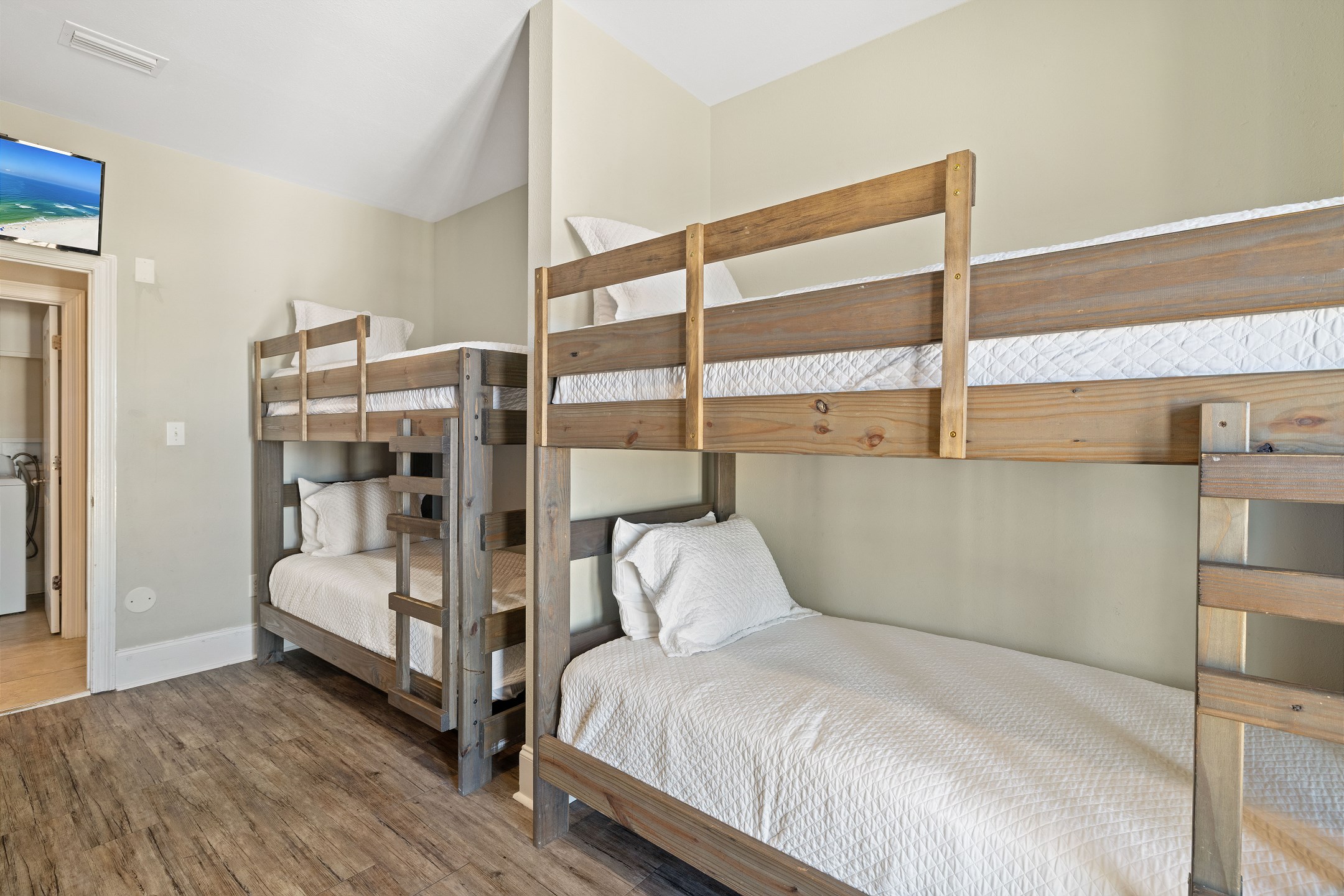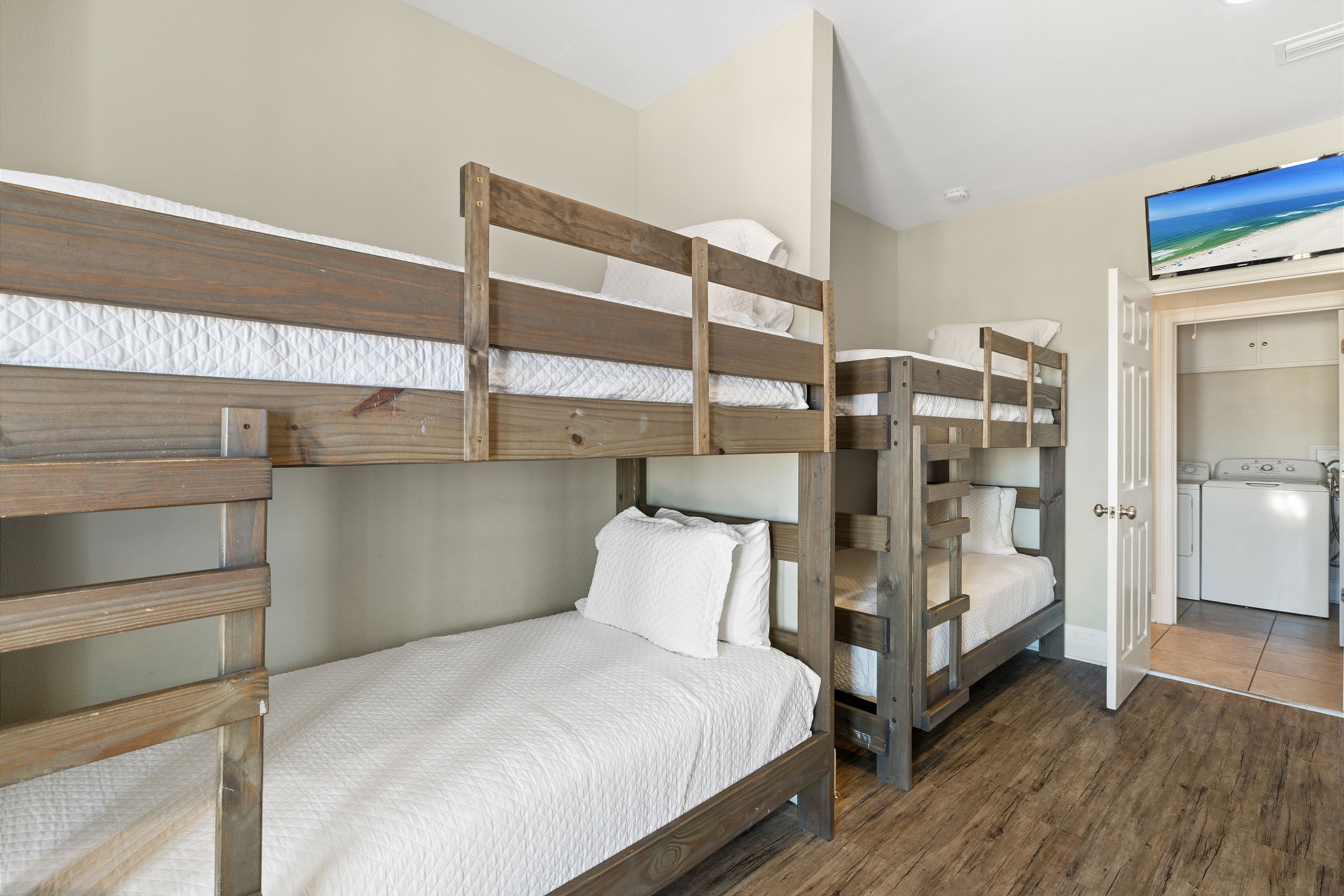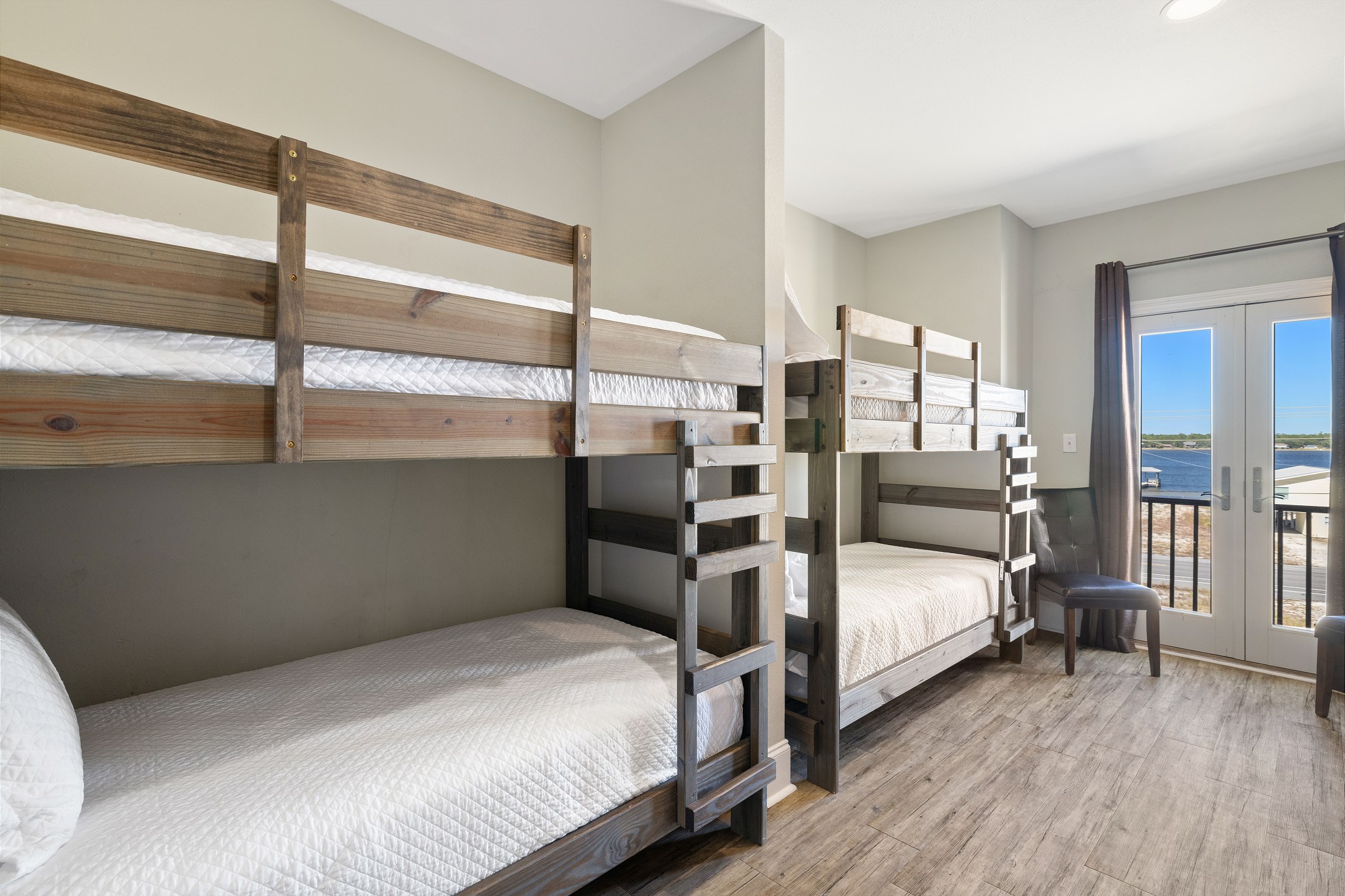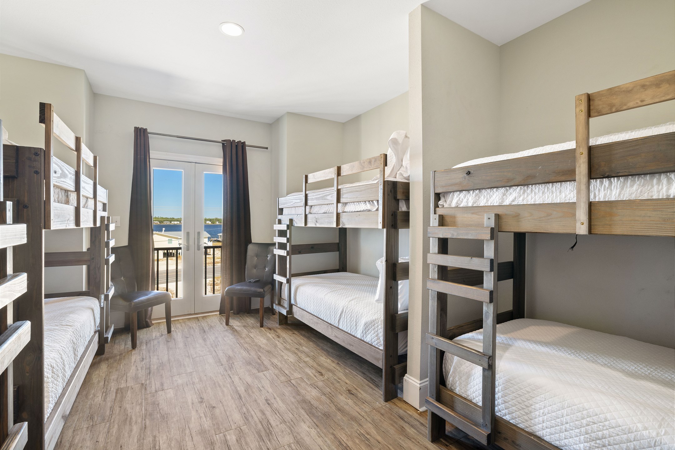The first floor is home to five bedrooms, including two with king beds and three with queen beds, each paired with its own private bathroom. Upstairs, you'll find four more bedrooms, offering two with king beds, one with a queen bed, and a large bunk room with four twin-over-twin bunk beds, all complete with private bathrooms as well. This thoughtful layout ensures comfort and privacy for every guest while still offering plenty of shared spaces to enjoy together.