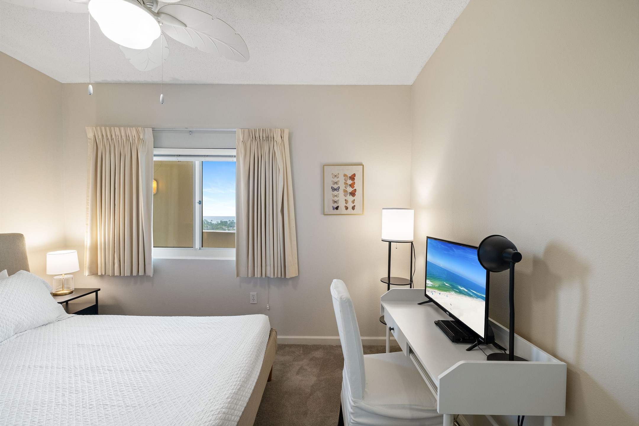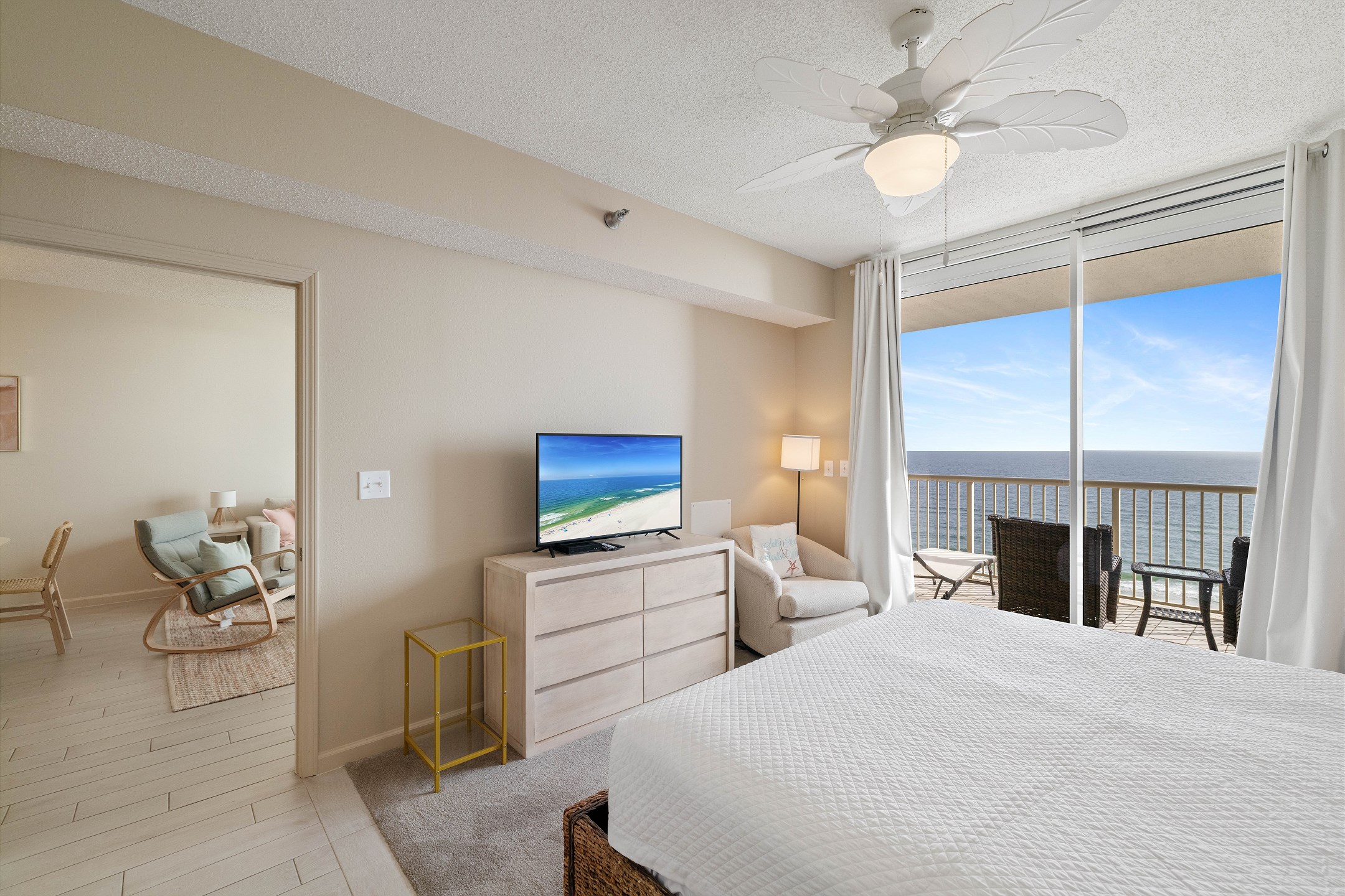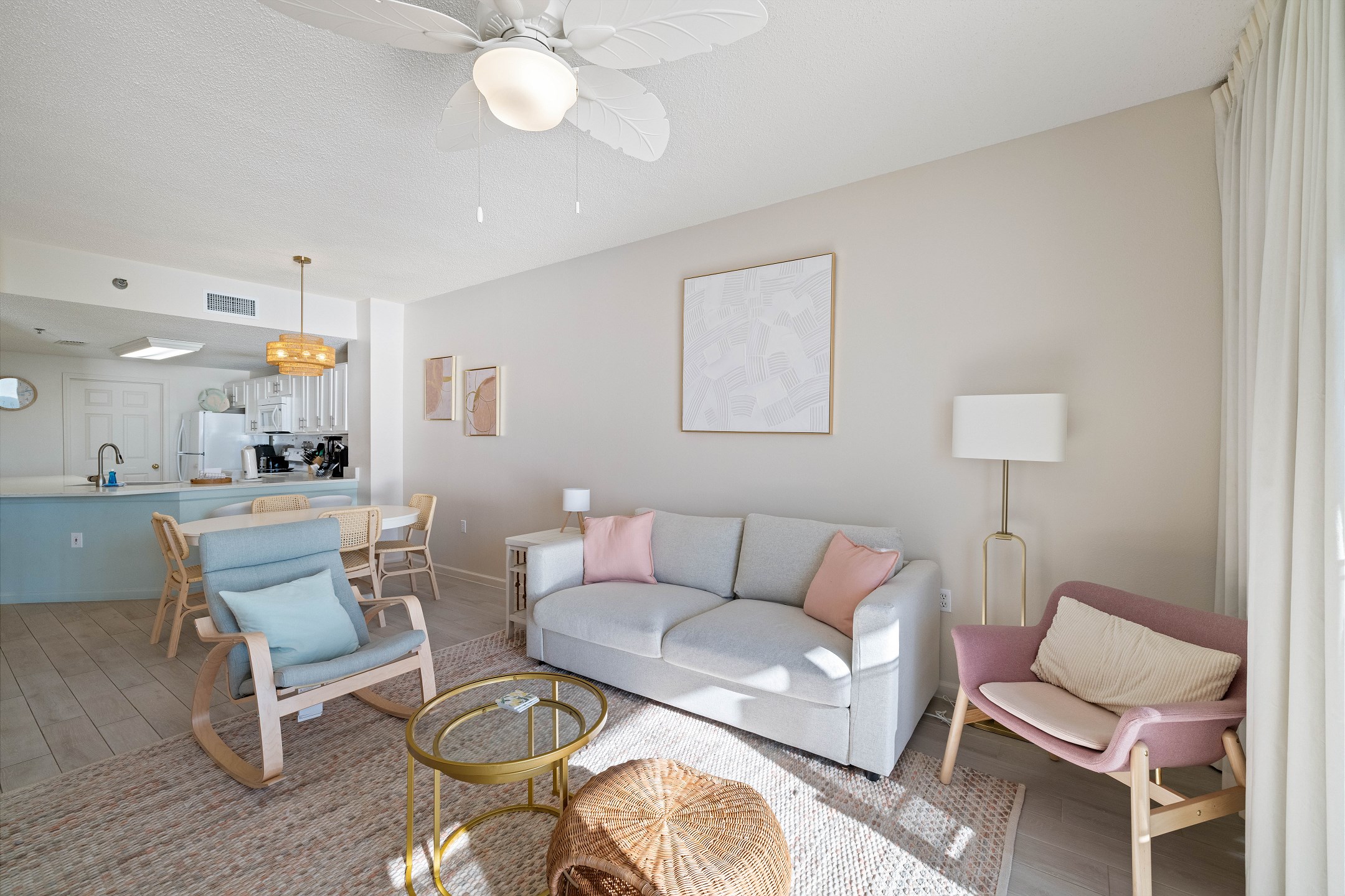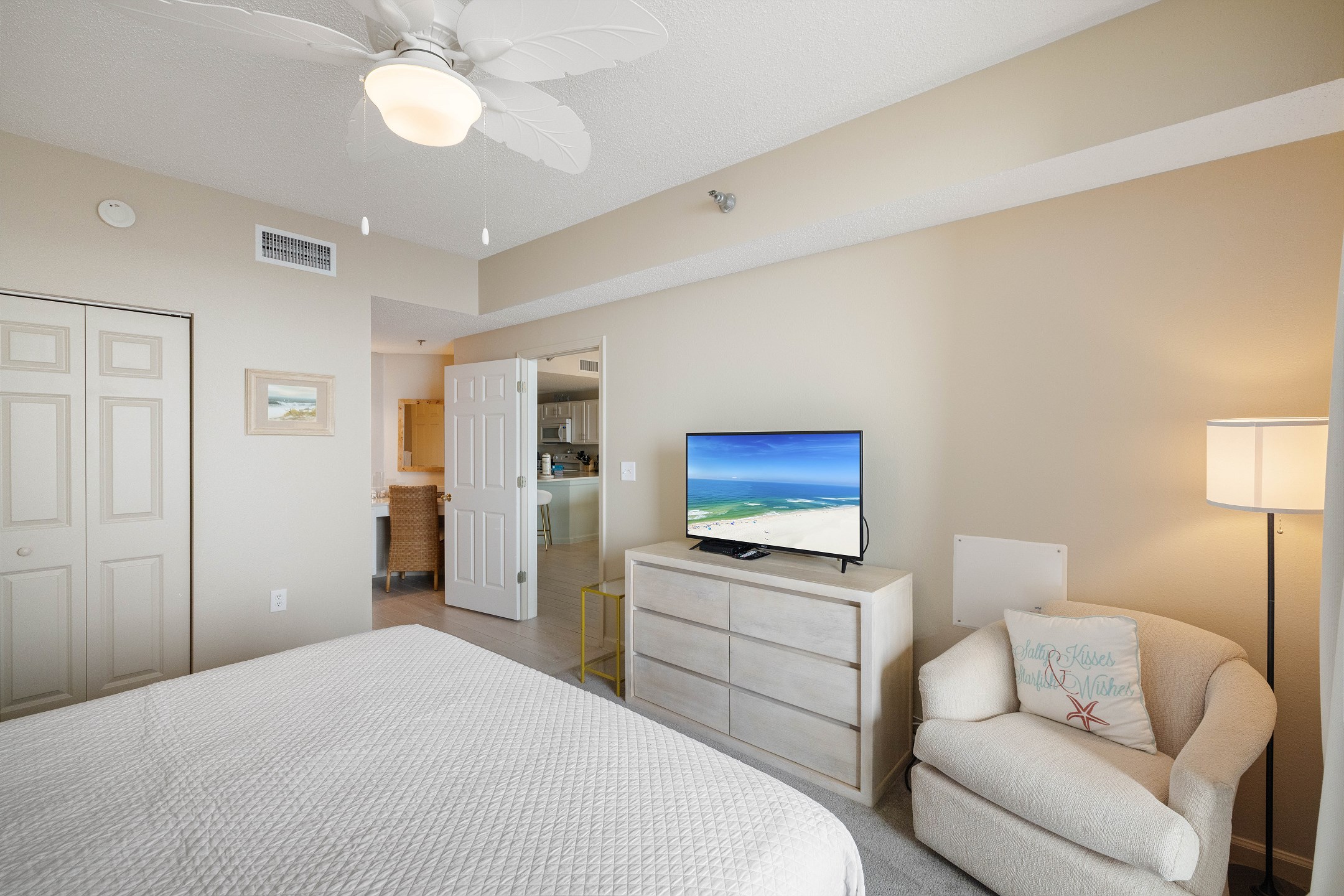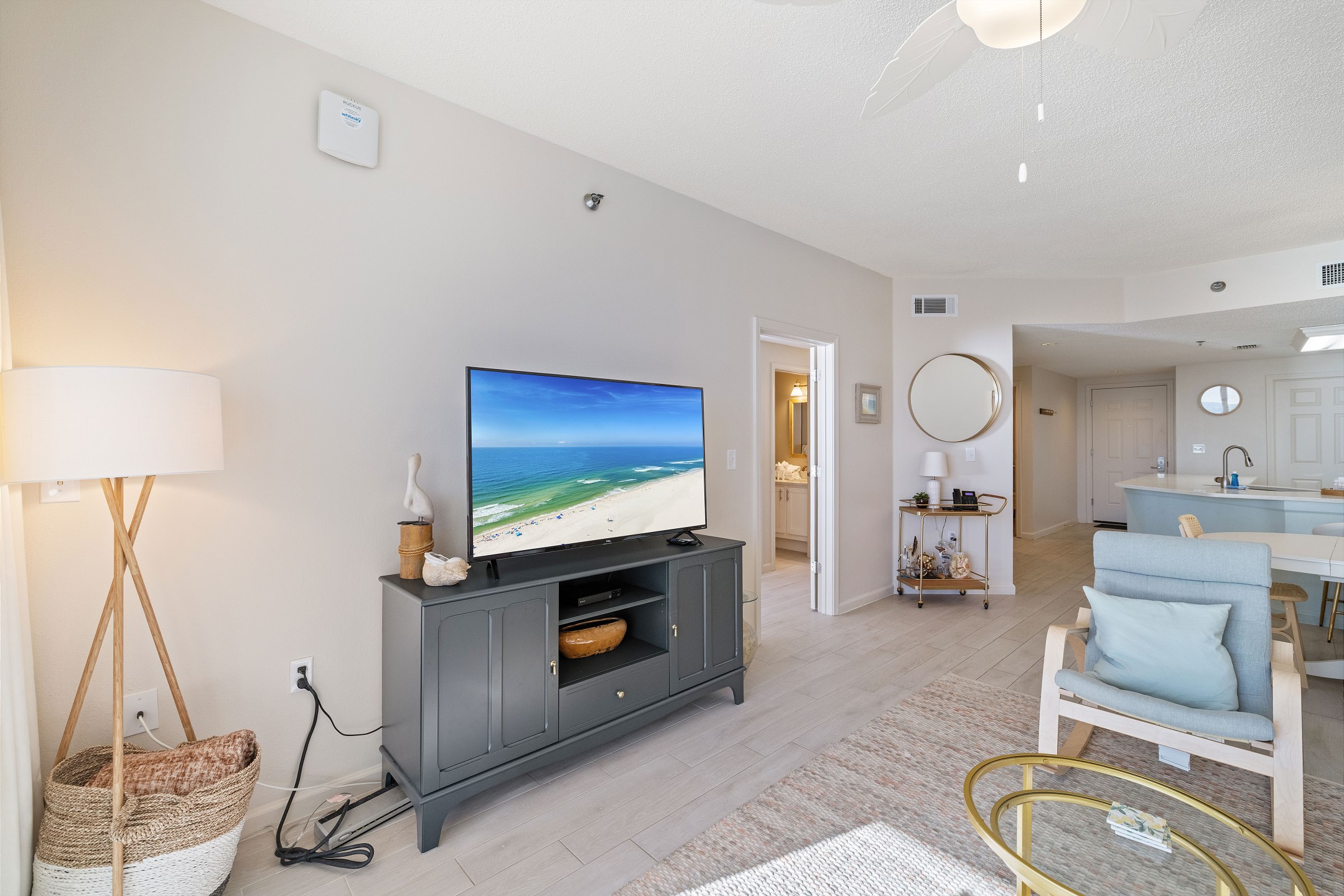 The spacious living room features floor-to-ceiling windows that fill the space with natural light and lead out to a private balcony overlooking the Gulf. Enjoy movie nights on the flat-screen TV or unwind on the comfortable sofa, which also converts into a sleeper for extra guests.