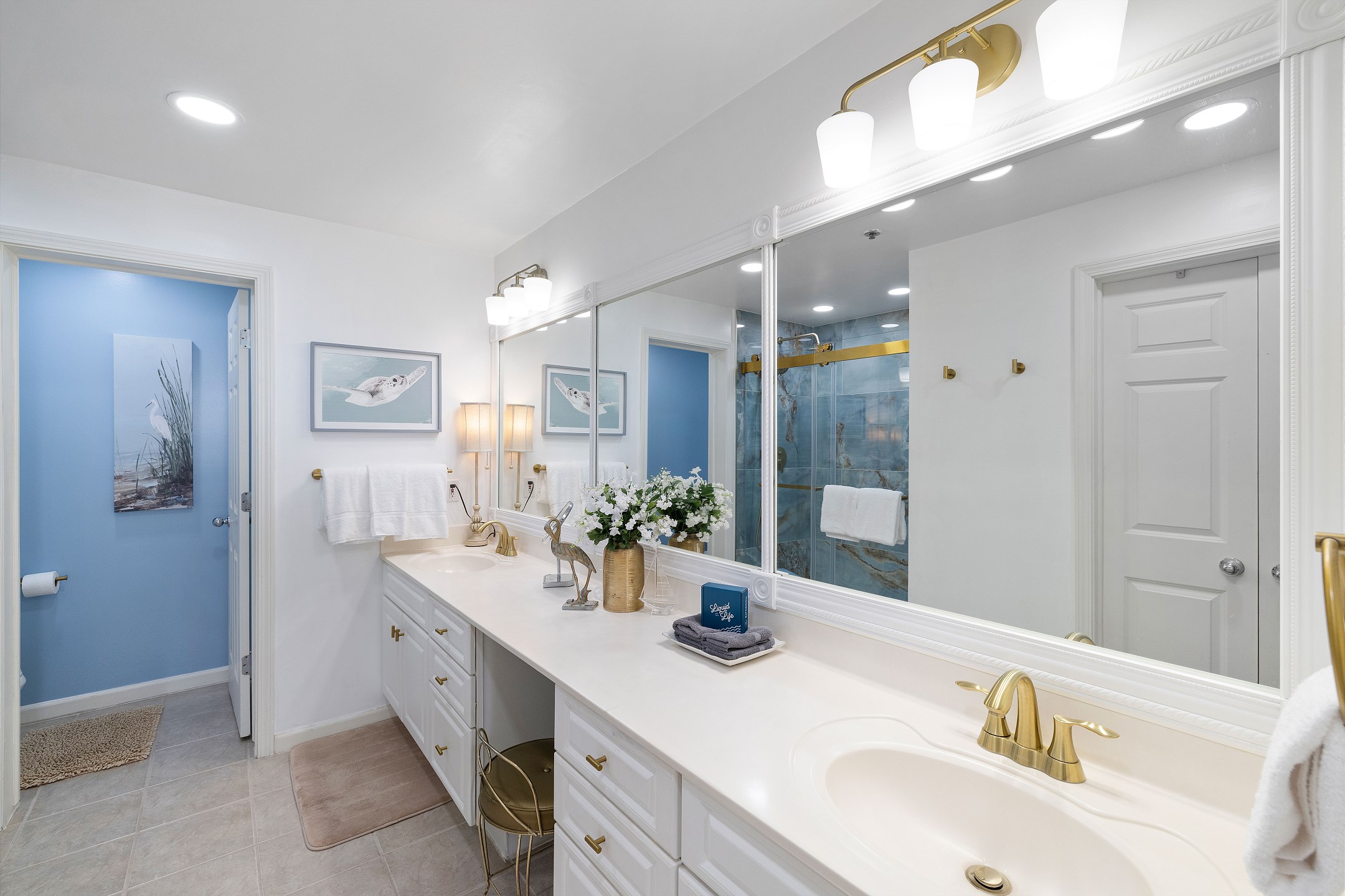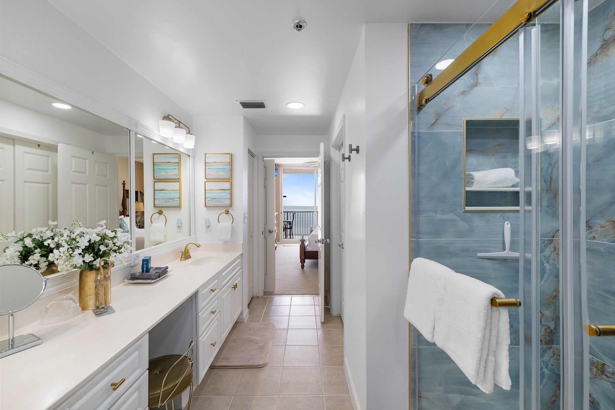 The primary bedroom features a king bed, floor-to-ceiling windows with balcony access, a flat-screen TV, and an ensuite bathroom with a double vanity and a beautifully tiled walk-in shower. The second bedroom features a queen bed and its own ensuite bathroom with a walk-in shower, providing privacy and comfort for additional guests.