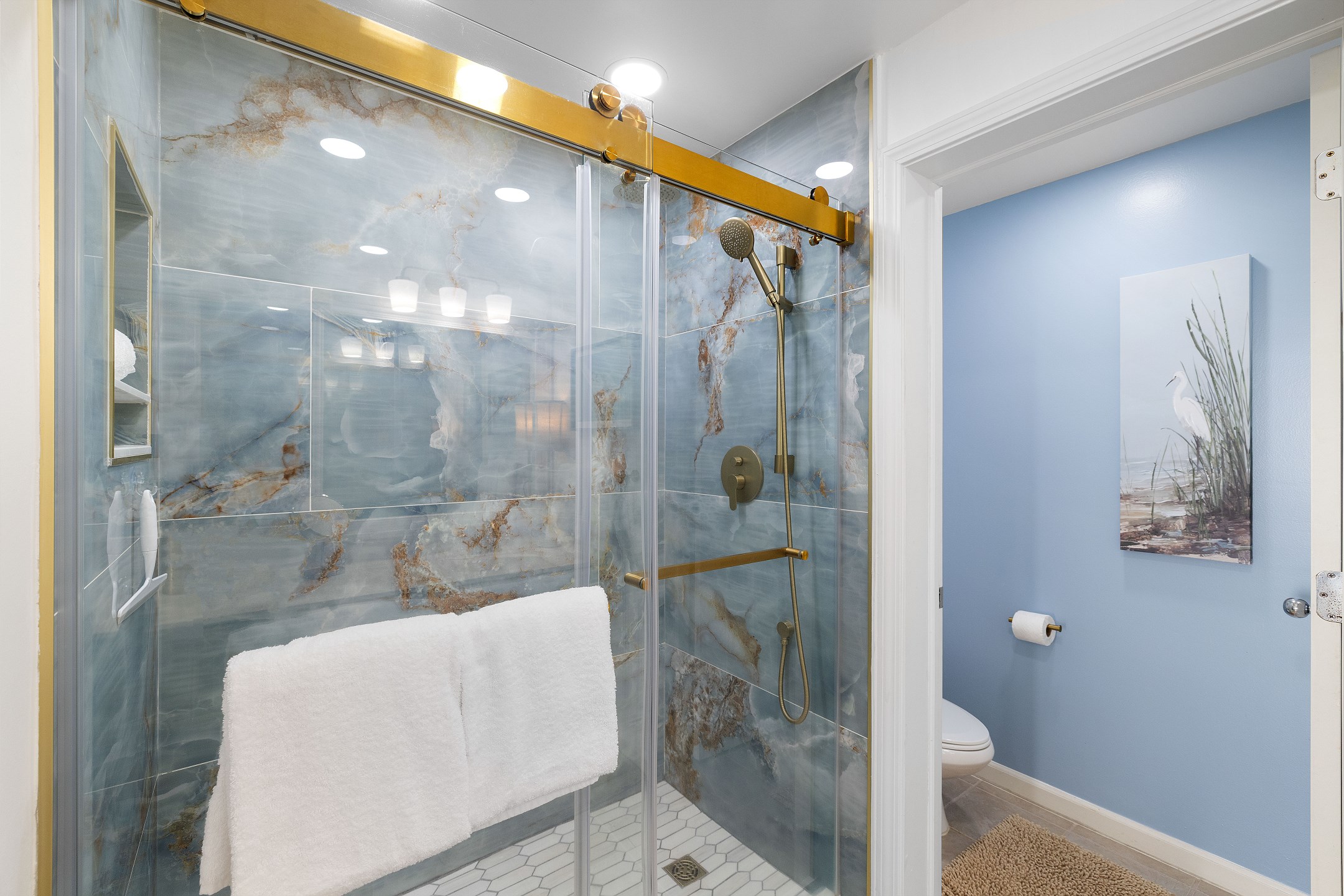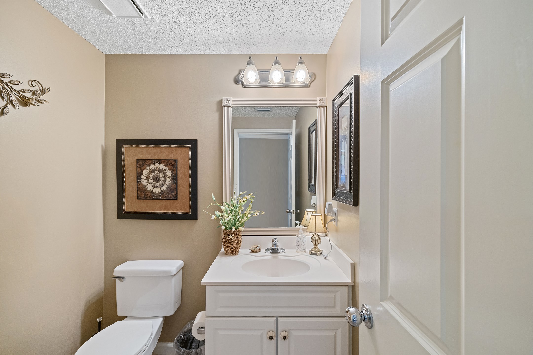 The fully equipped kitchen includes granite countertops and a large dining table, making it easy to prepare and enjoy meals together during your stay. A convenient half bathroom adds extra comfort for guests.