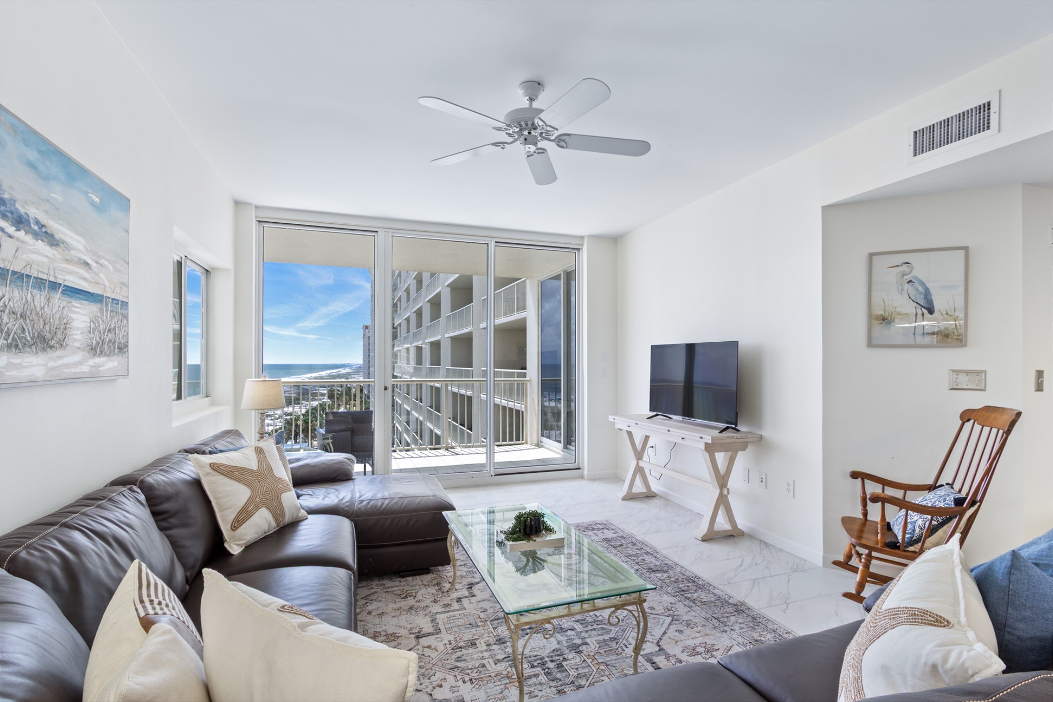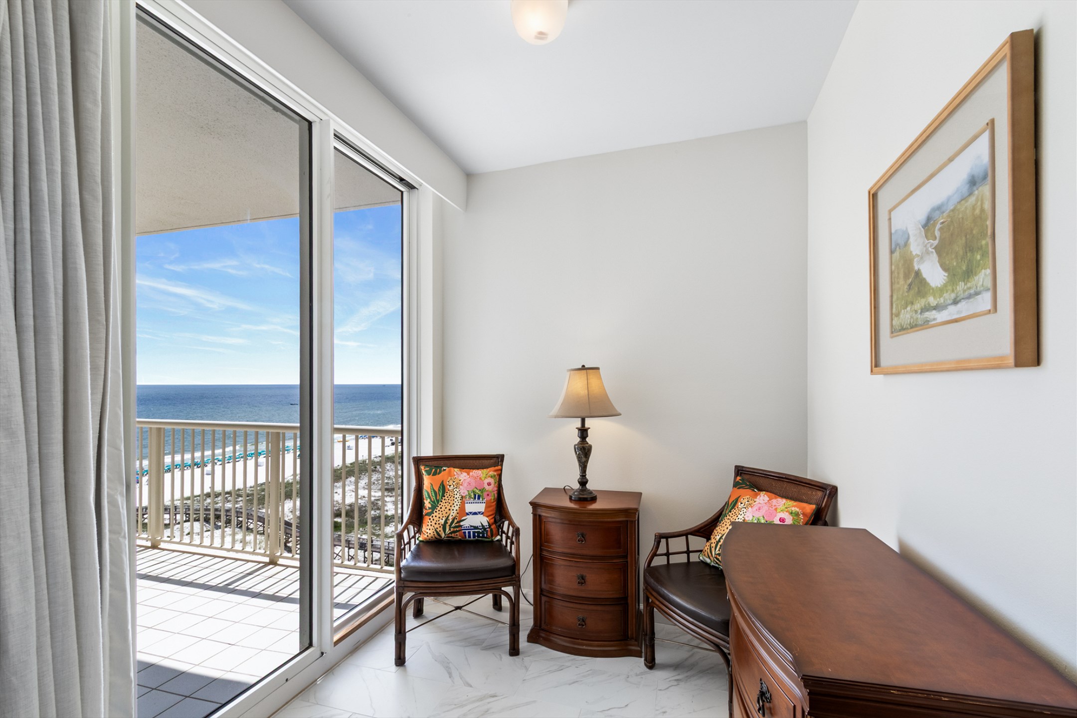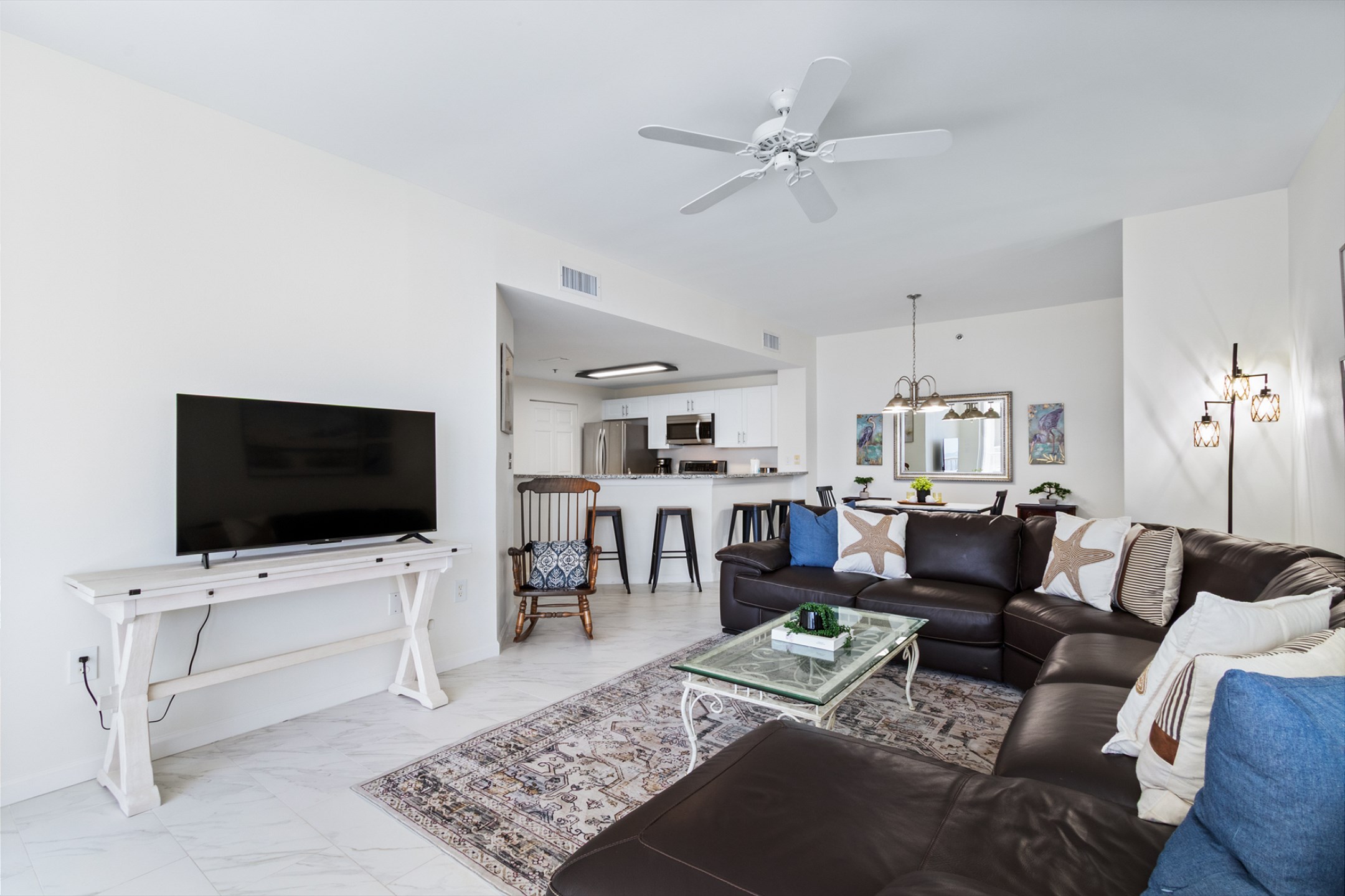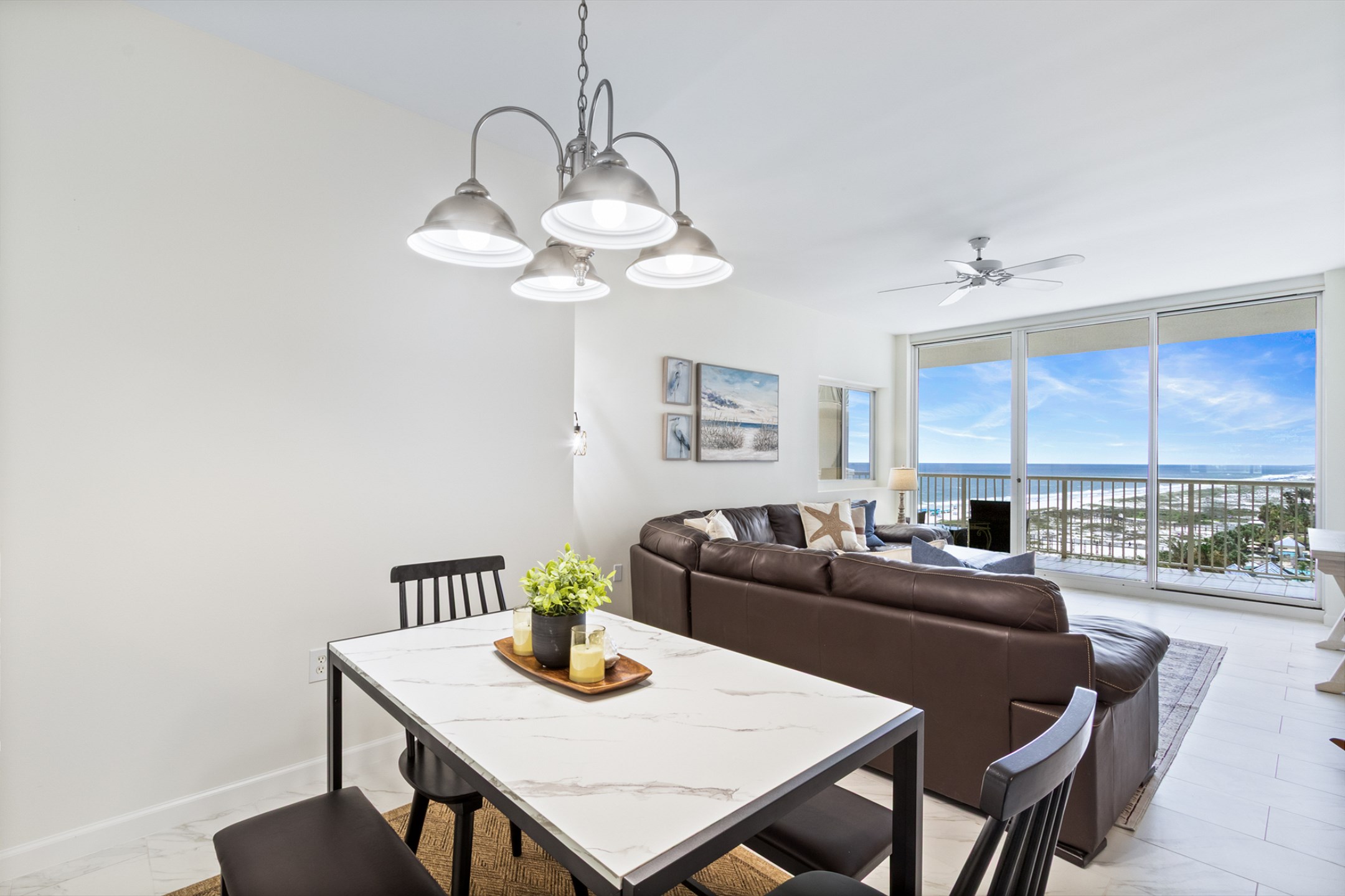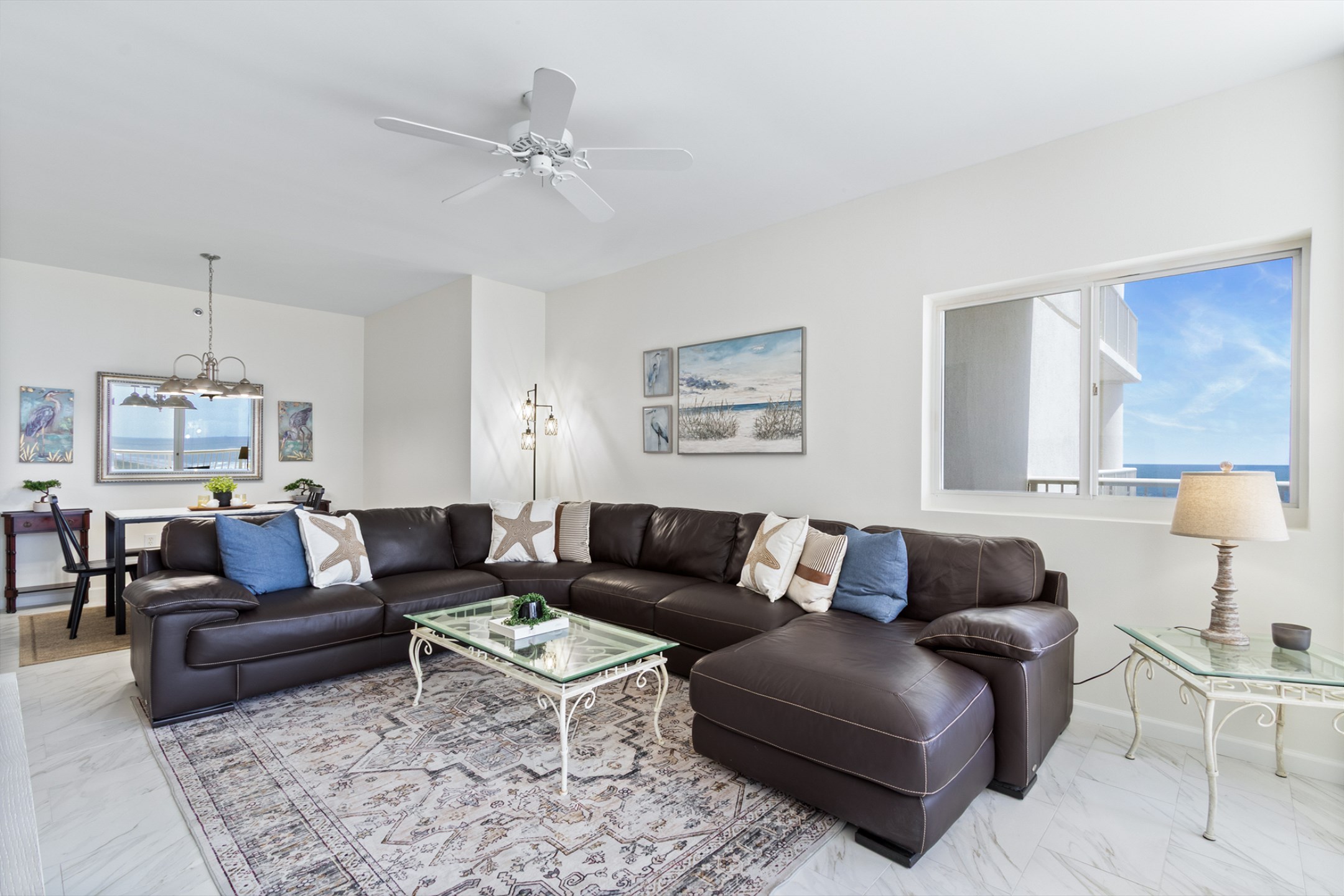 The spacious living room features a large sectional and stunning floor-to-ceiling windows that lead out to a generous private balcony, where you can soak in sweeping views of the Gulf. The fully equipped kitchen boasts stainless steel appliances, granite countertops, and ample space for meal preparation, while the adjacent dining area is perfect for gathering over family meals.
