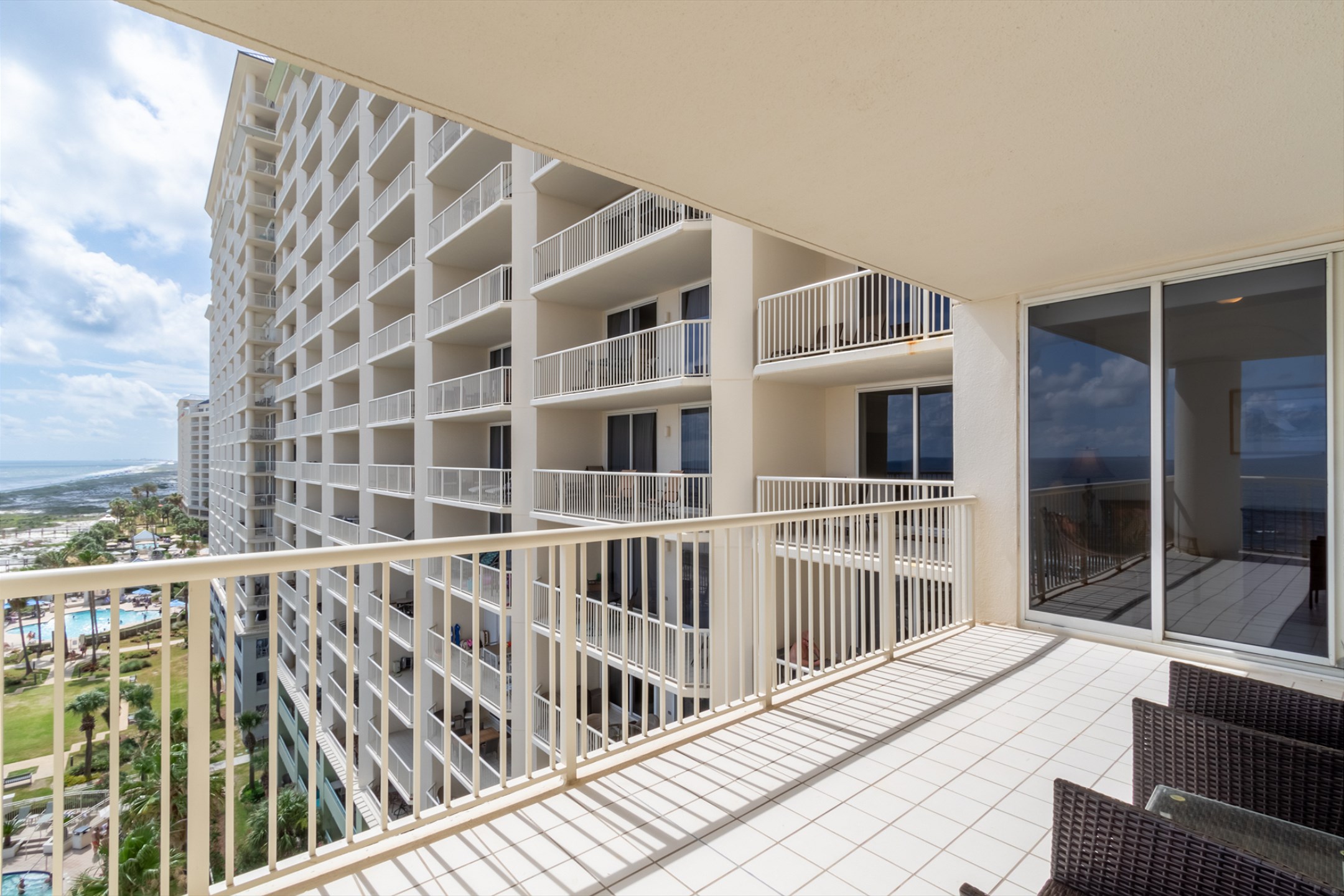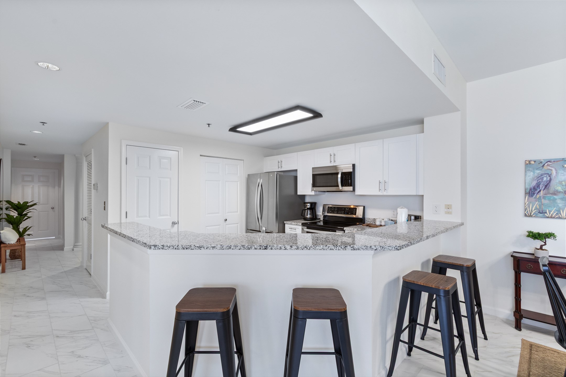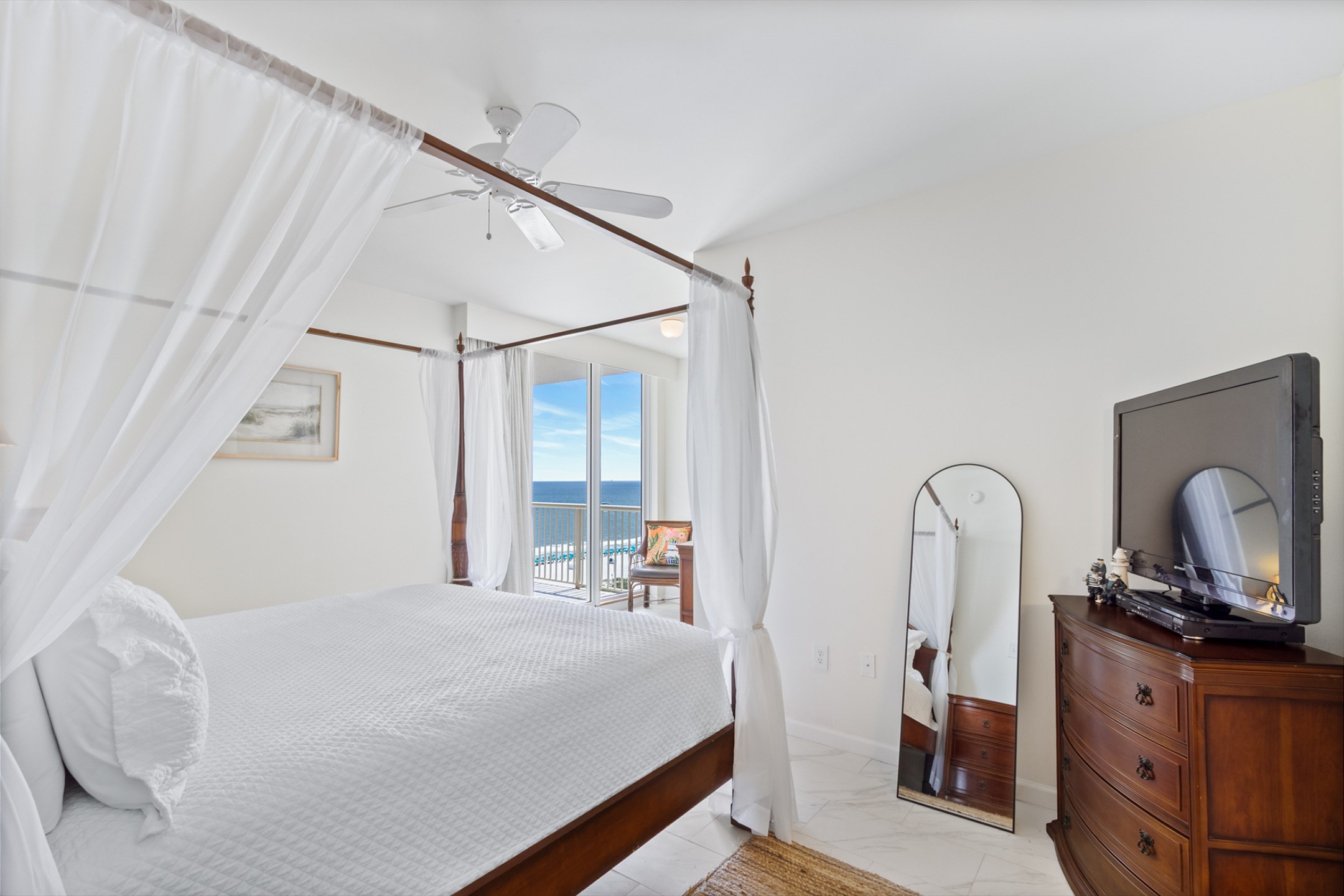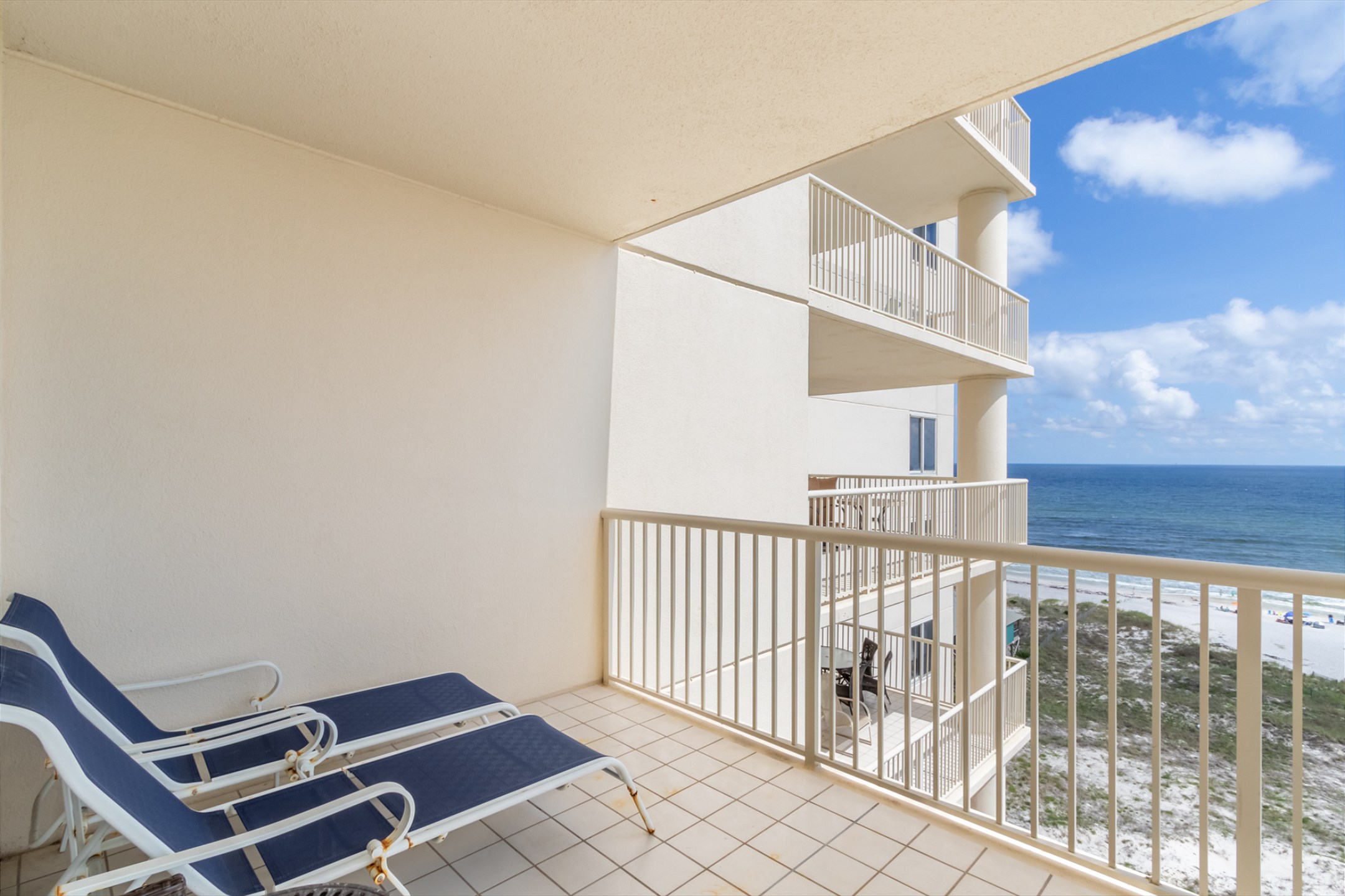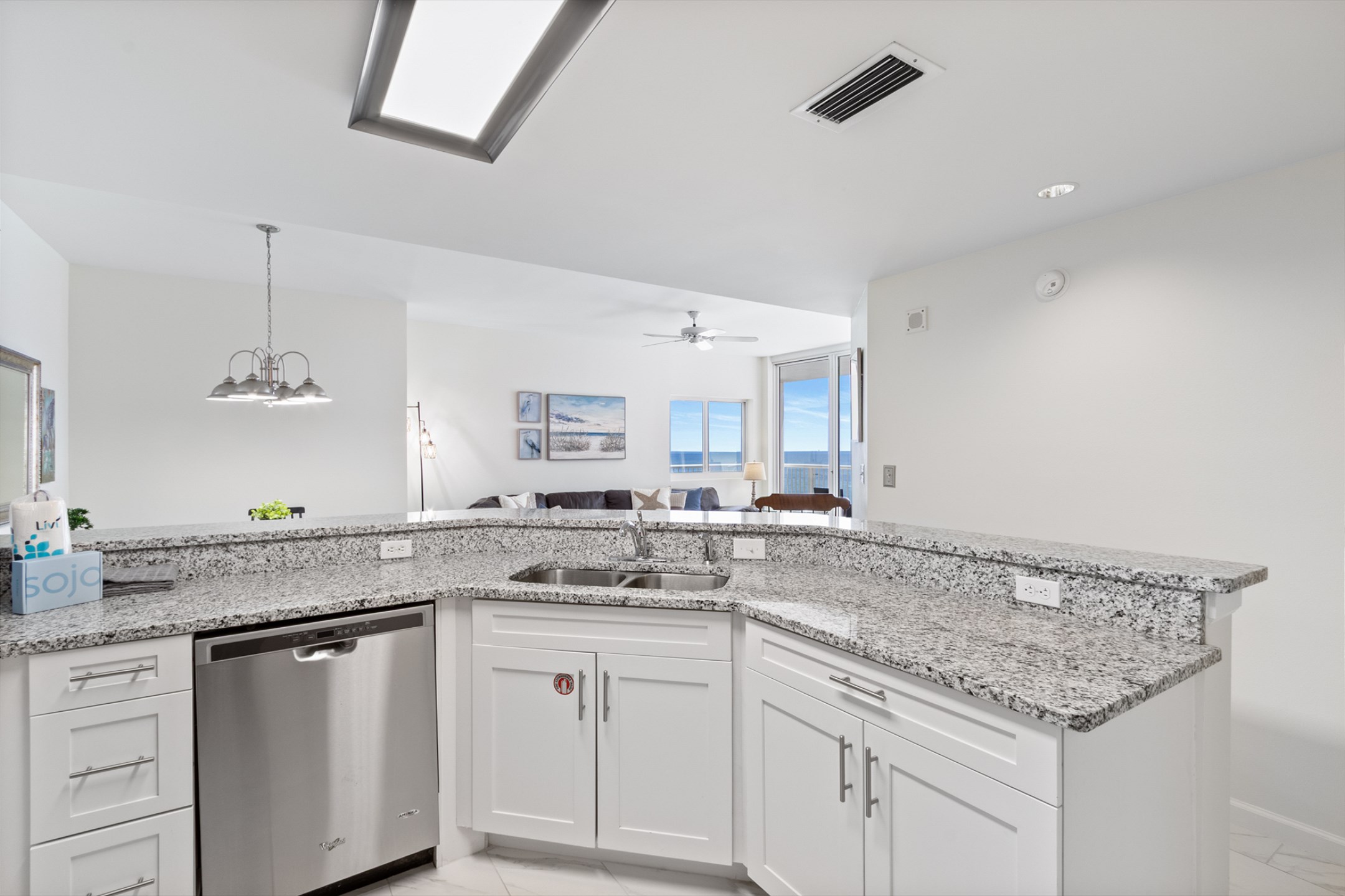 The spacious living room features a large sectional and stunning floor-to-ceiling windows that lead out to a generous private balcony, where you can soak in sweeping views of the Gulf. The fully equipped kitchen boasts stainless steel appliances, granite countertops, and ample space for meal preparation, while the adjacent dining area is perfect for gathering over family meals.