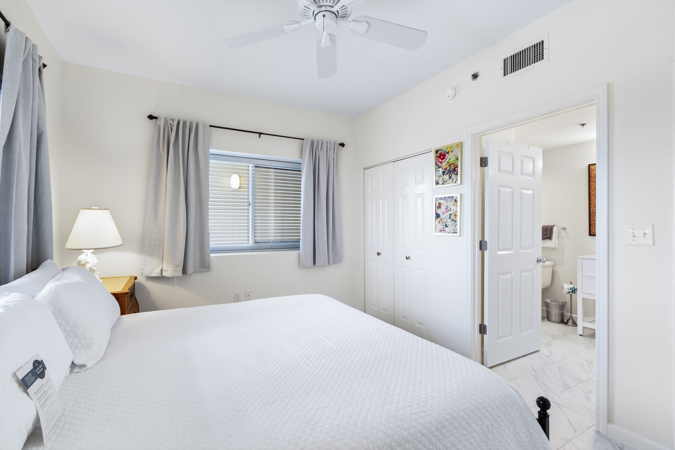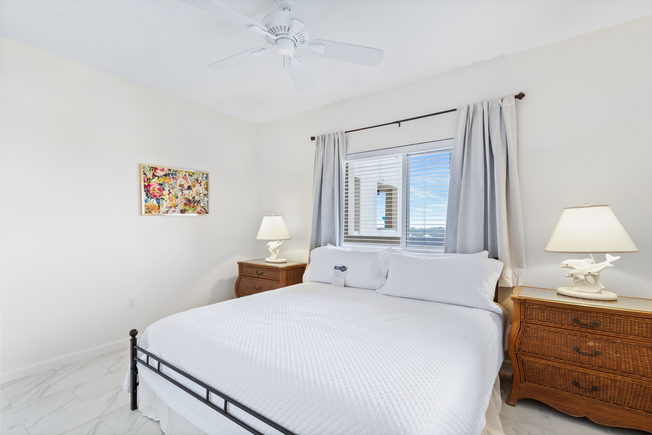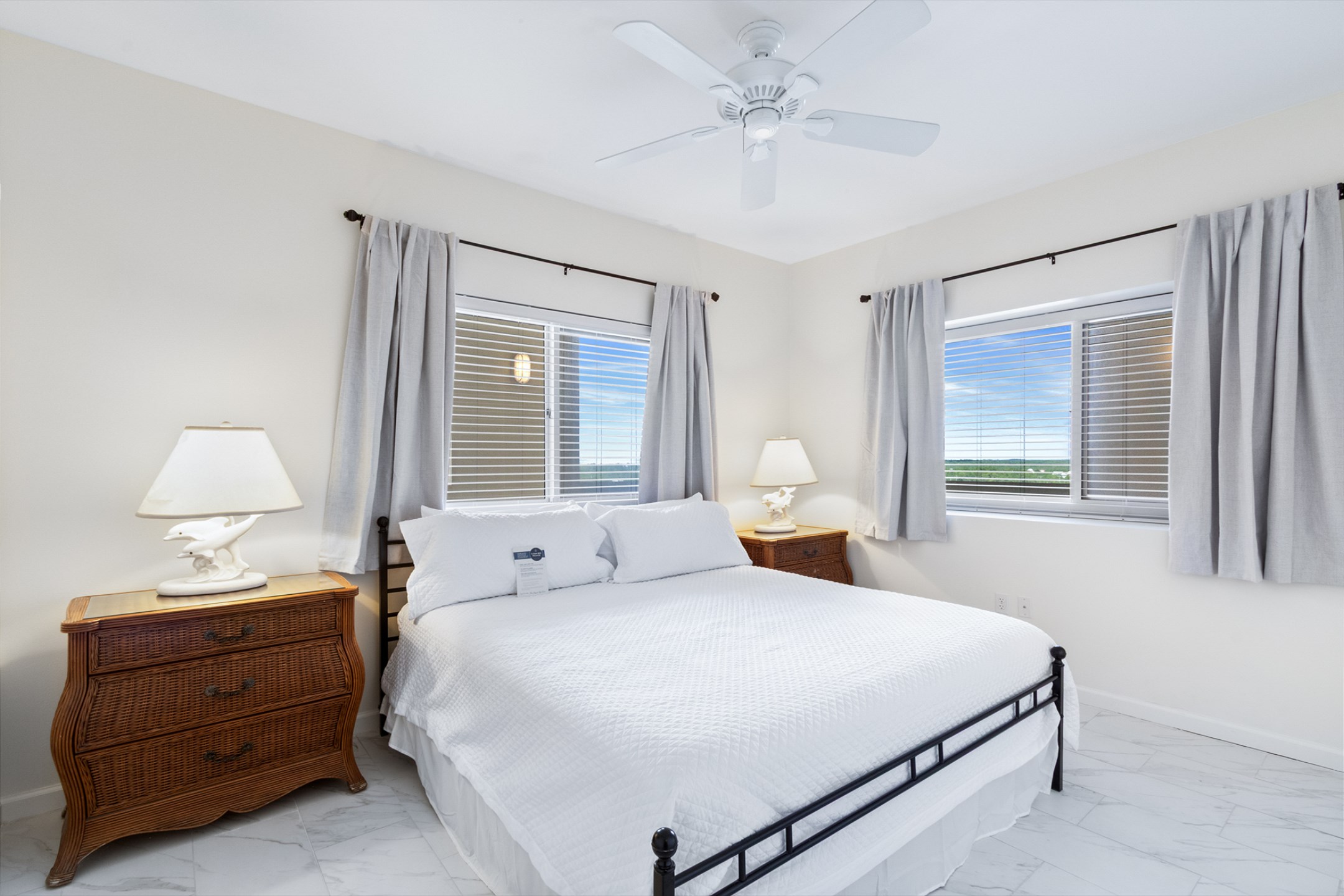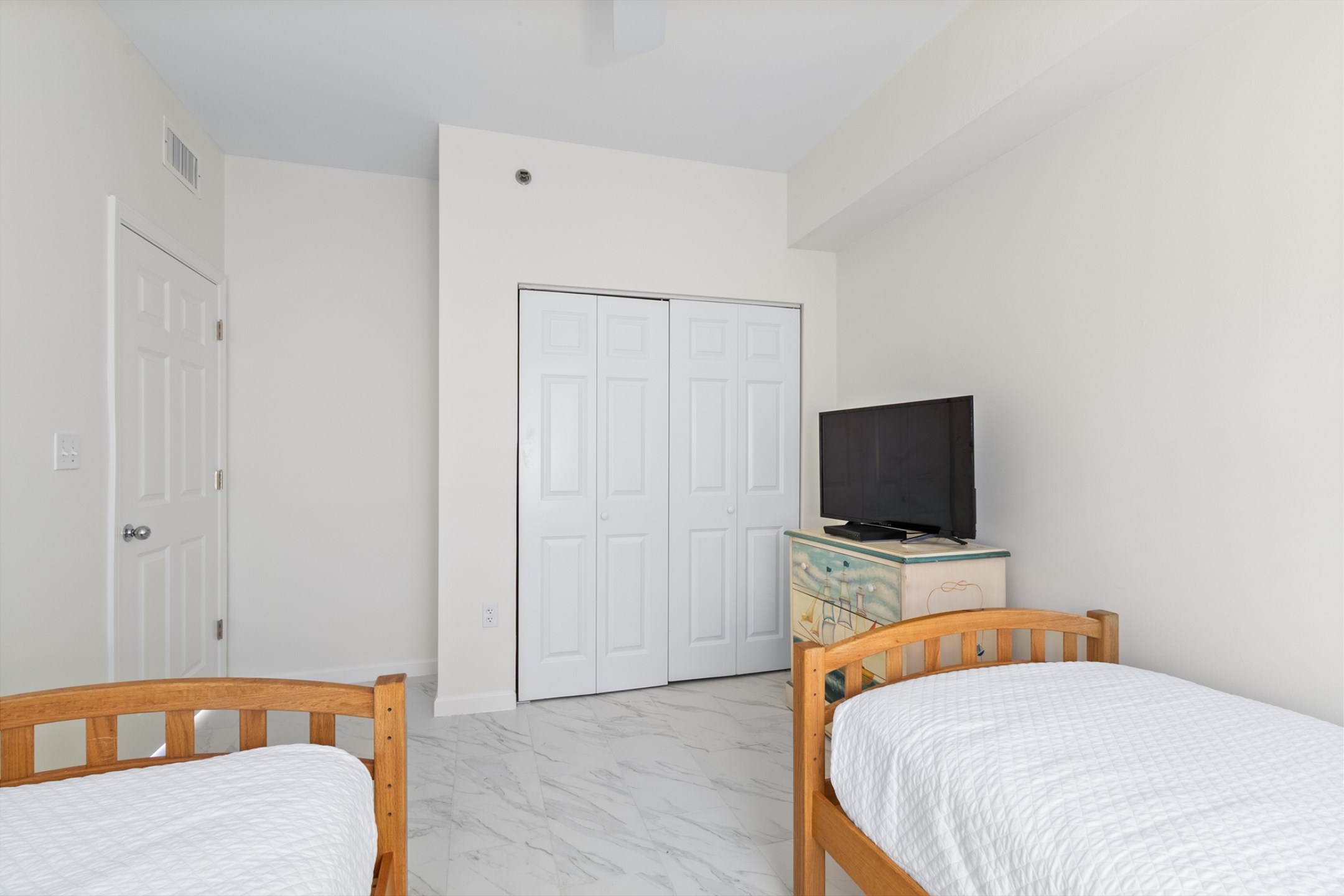 The primary bedroom is a serene escape with a king bed, private balcony access, and an ensuite bathroom with a beautifully tiled walk-in shower. The second bedroom also offers a king bed, and the third bedroom includes two twin beds—ideal for children or extra guests. These rooms share a beautifully updated bathroom with a tiled shower/tub combo.