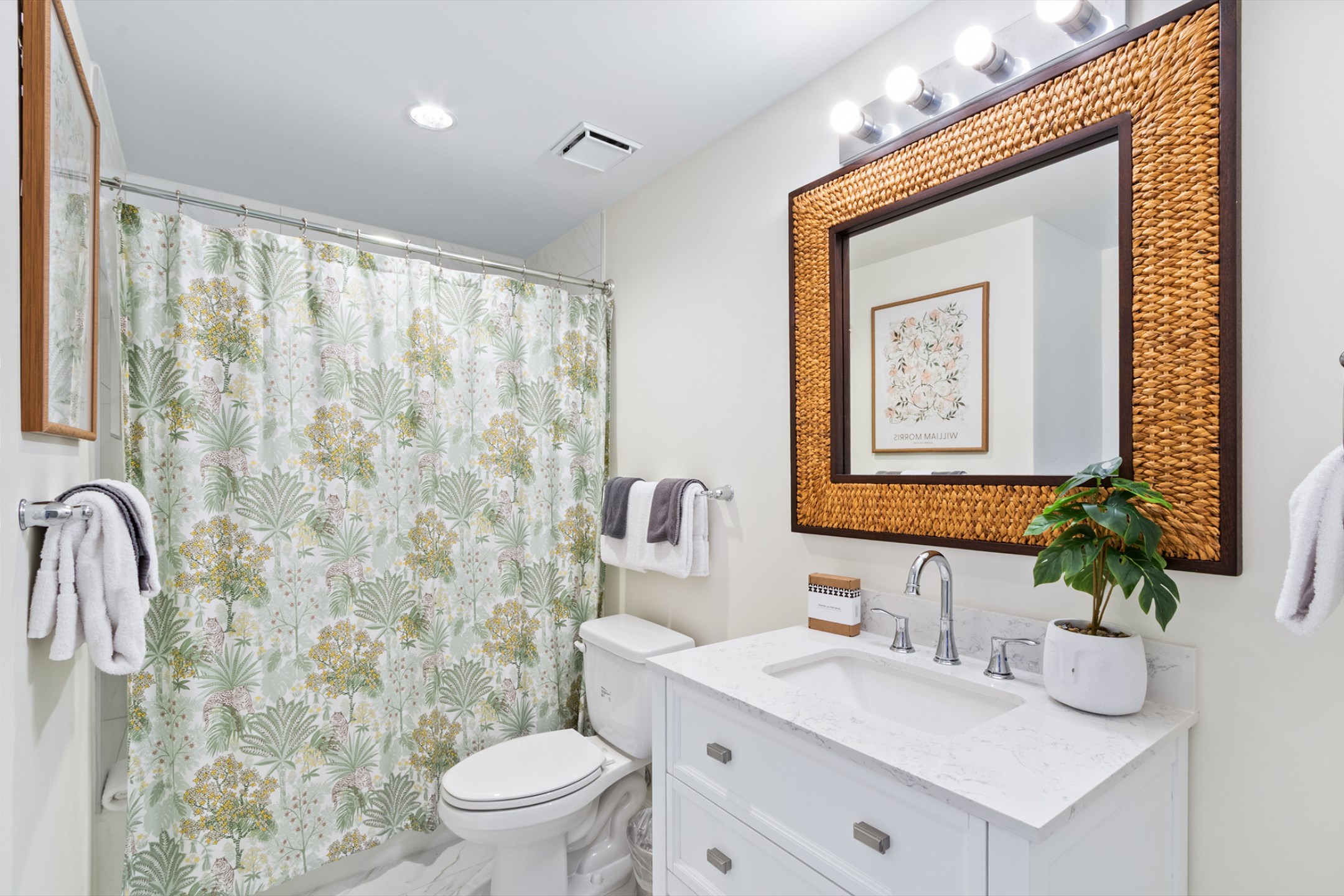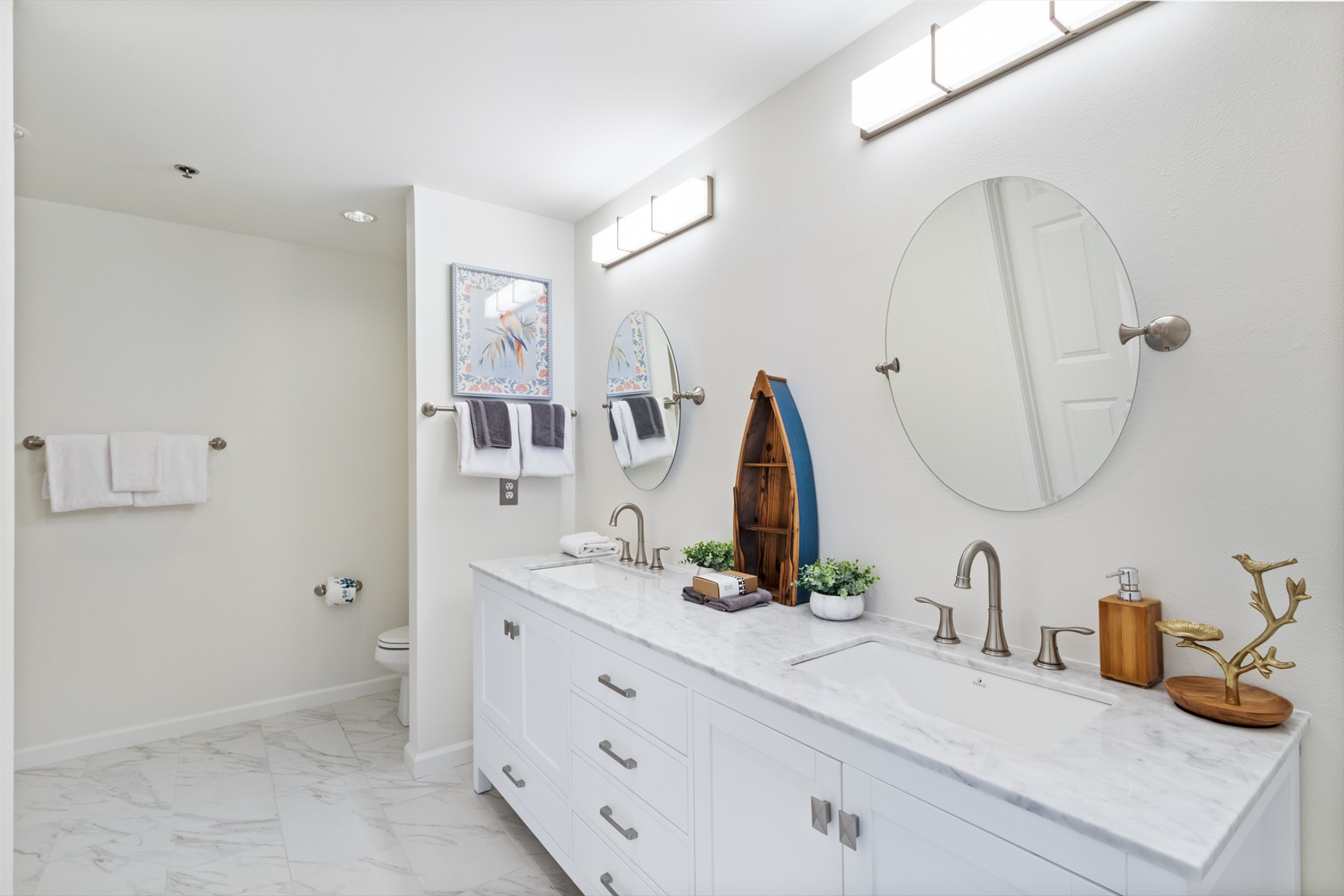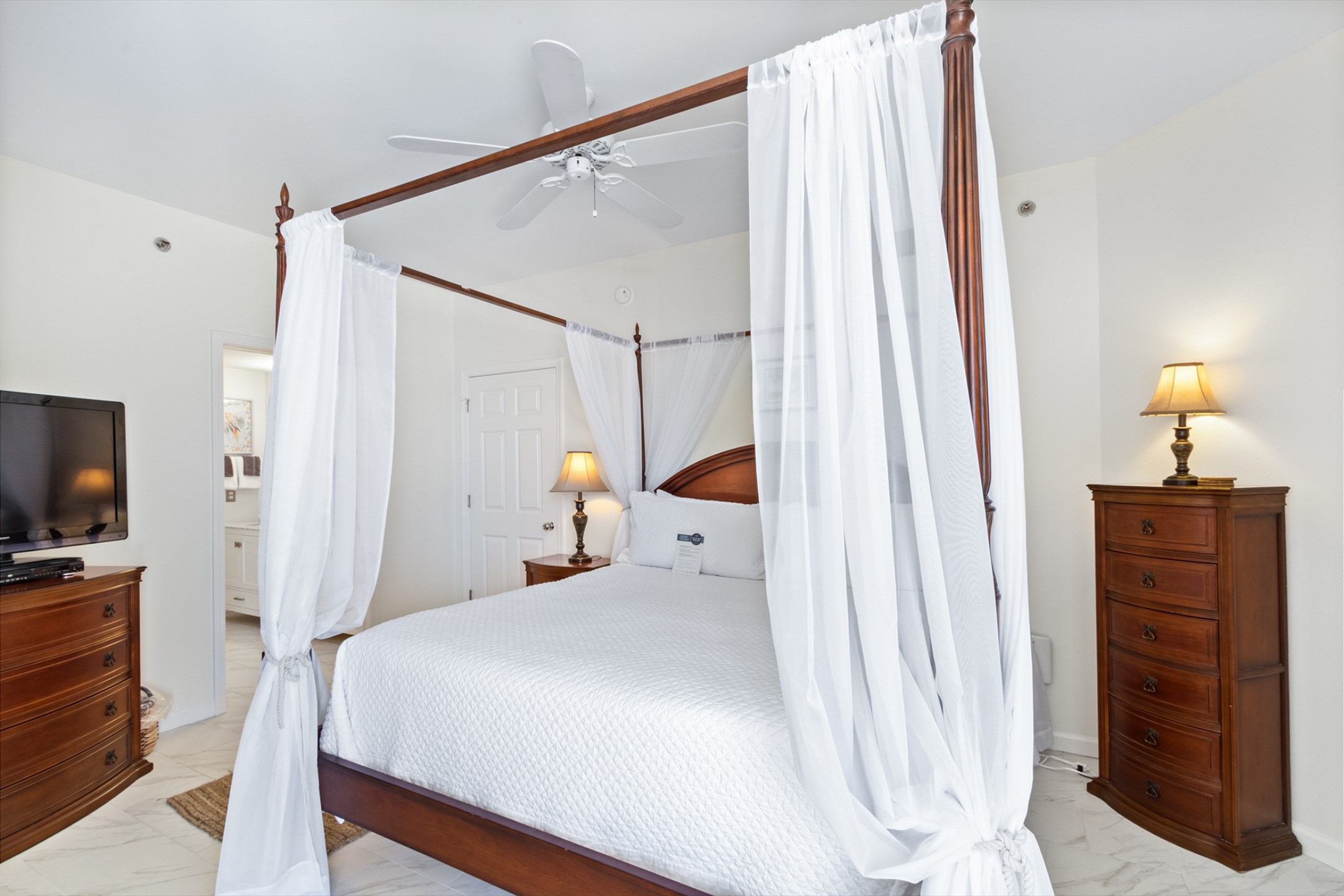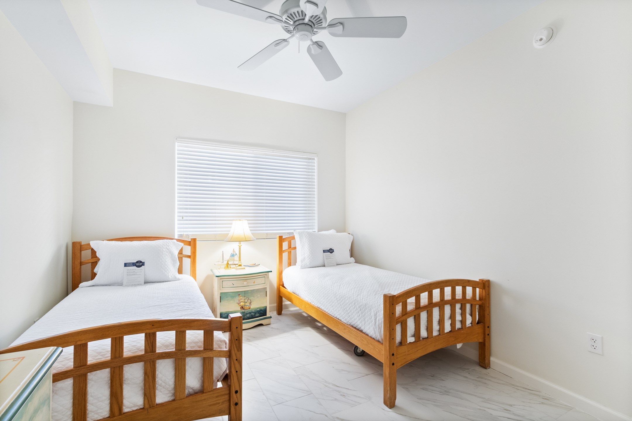 The primary bedroom is a serene escape with a king bed, private balcony access, and an ensuite bathroom with a beautifully tiled walk-in shower. The second bedroom also offers a king bed, and the third bedroom includes two twin beds—ideal for children or extra guests. These rooms share a beautifully updated bathroom with a tiled shower/tub combo.