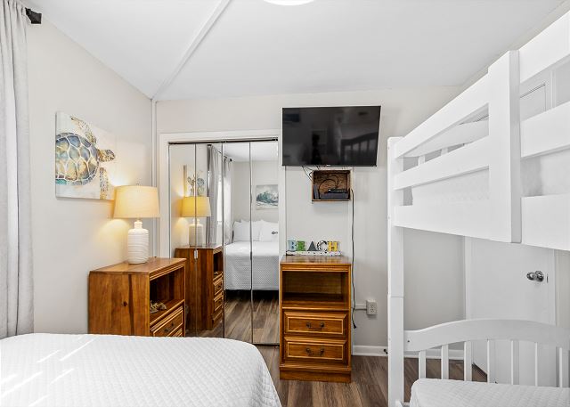 The primary bedroom features a king-sized bed and a spacious walk-in shower in the ensuite bathroom, ensuring comfort and privacy. The guest bedroom is ideal for children or additional guests, with a double bed and a twin bunk bed. This bedroom has access to a bathroom with a tub/shower combination.