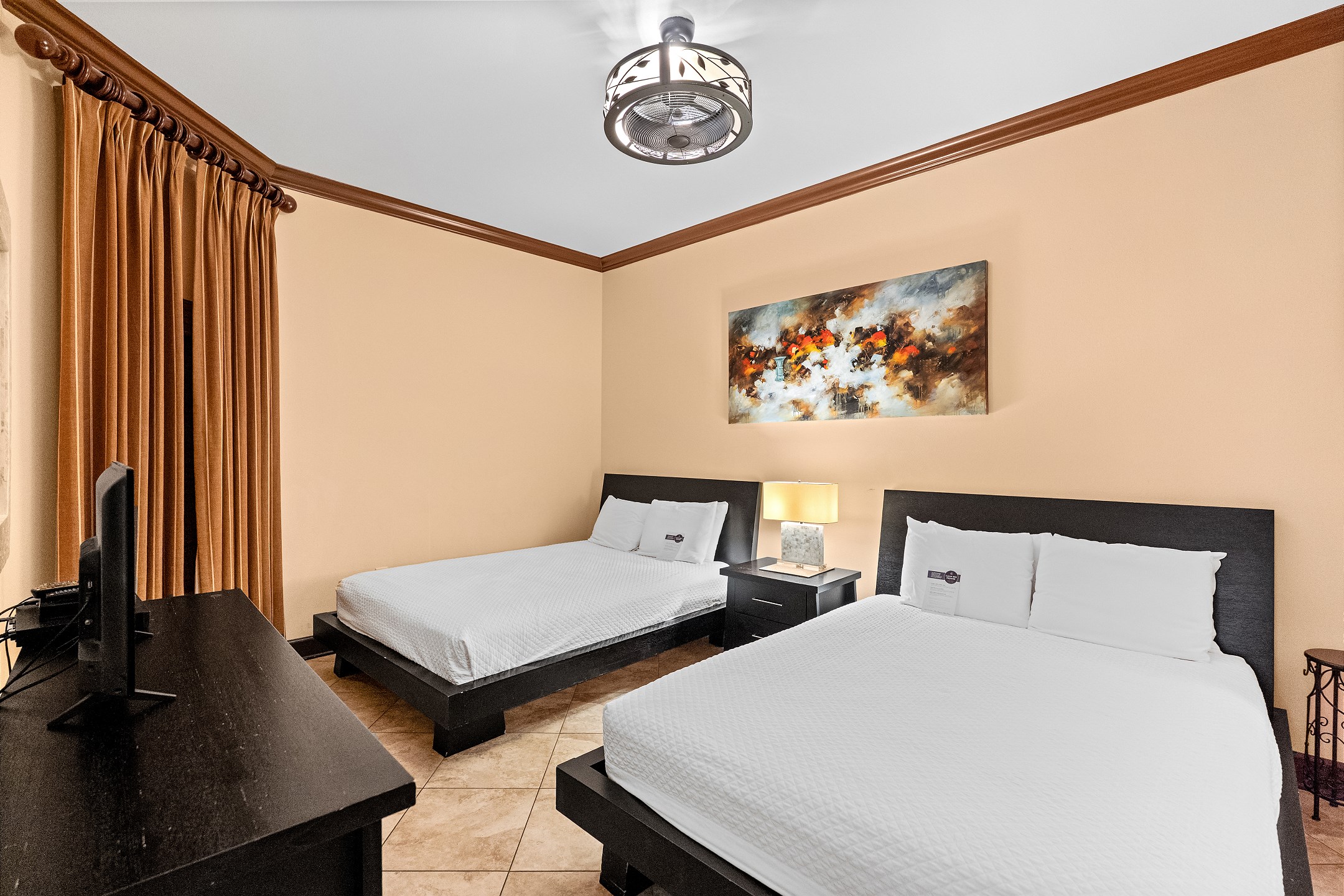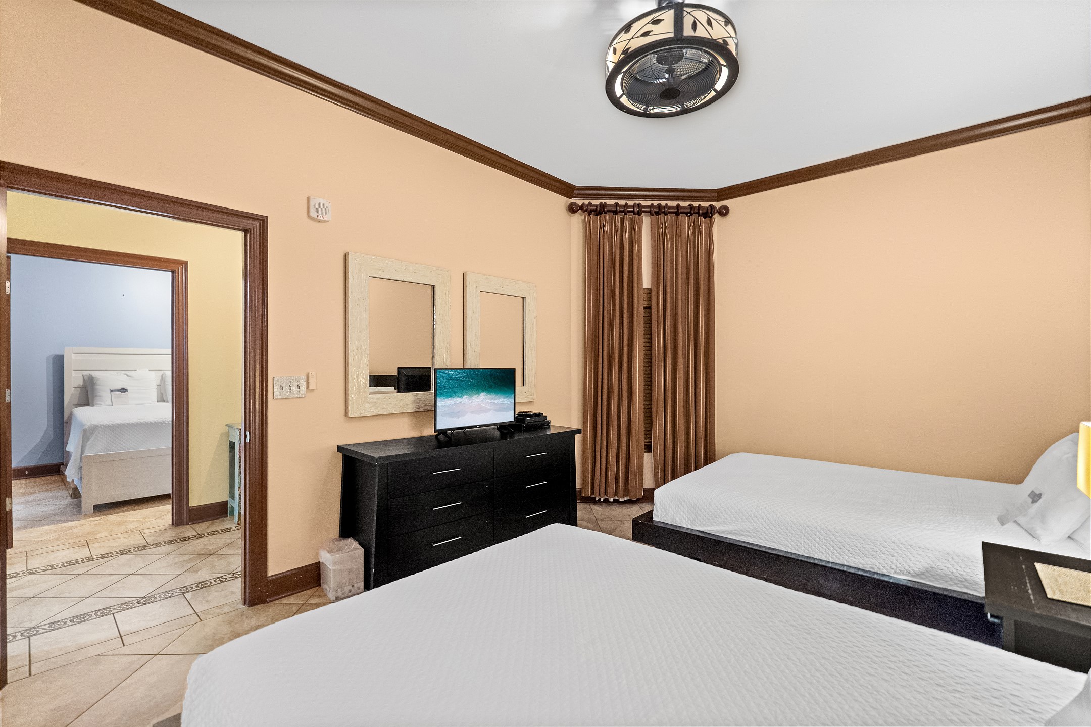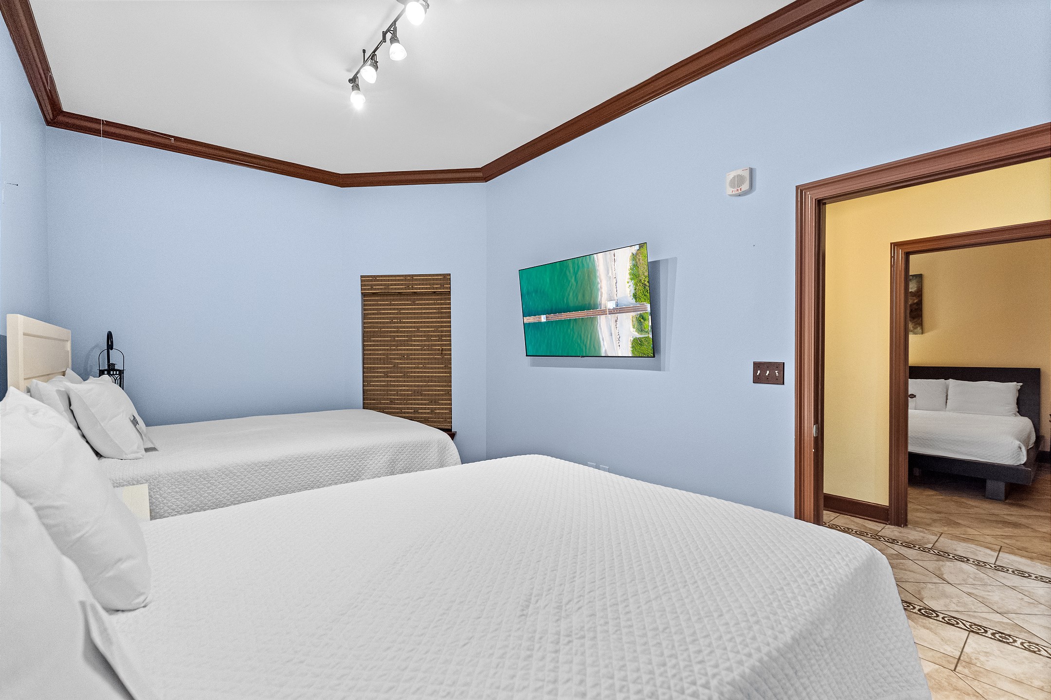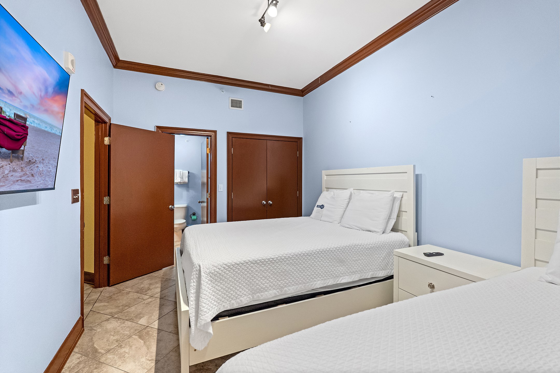 The primary suite offers a king bed, flat screen TV, and a spacious ensuite bathroom with a jetted tub, separate walk in shower with dual shower heads, double vanity, and a private water closet. The second and third bedrooms each feature two queen beds, a flat screen TV, and their own private bathroom with a shower and tub combination.