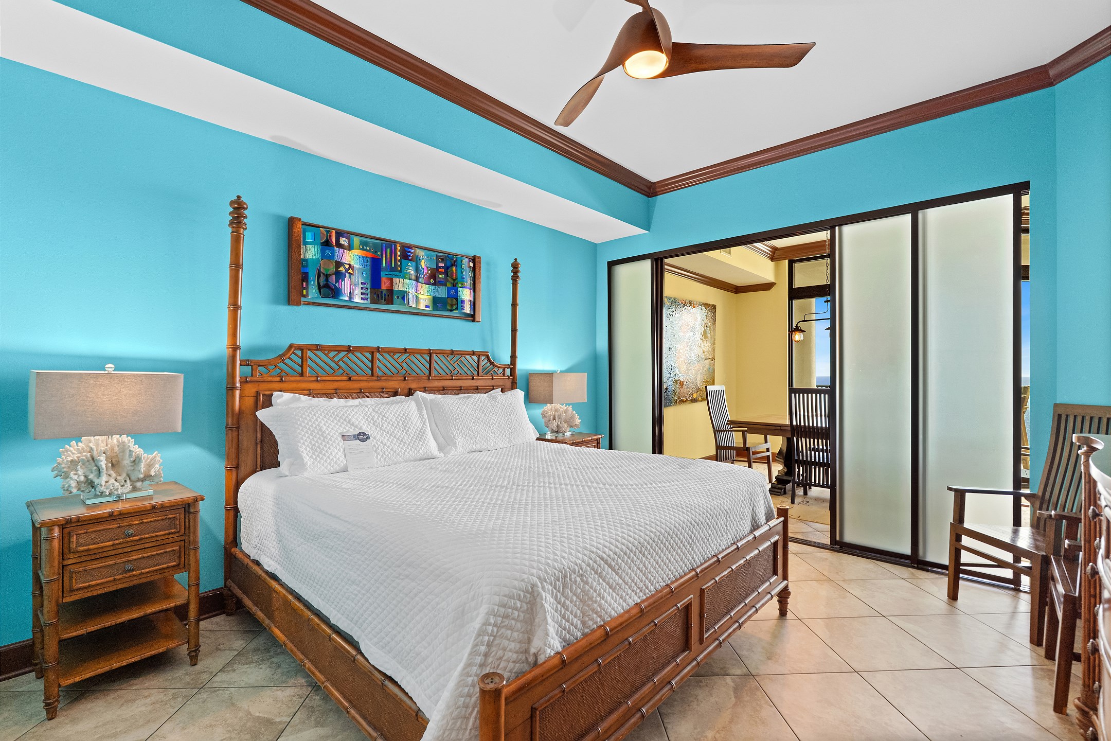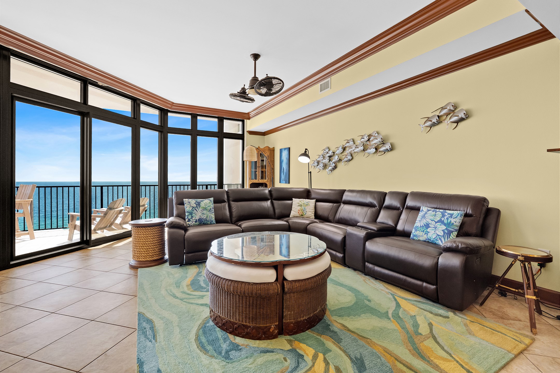 Step inside to floor to ceiling windows that fill the living area with natural light and provide direct access to the private balcony overlooking the Gulf. The living room features a large flat screen TV and a comfortable sectional, creating the perfect space to relax after a day at the beach.