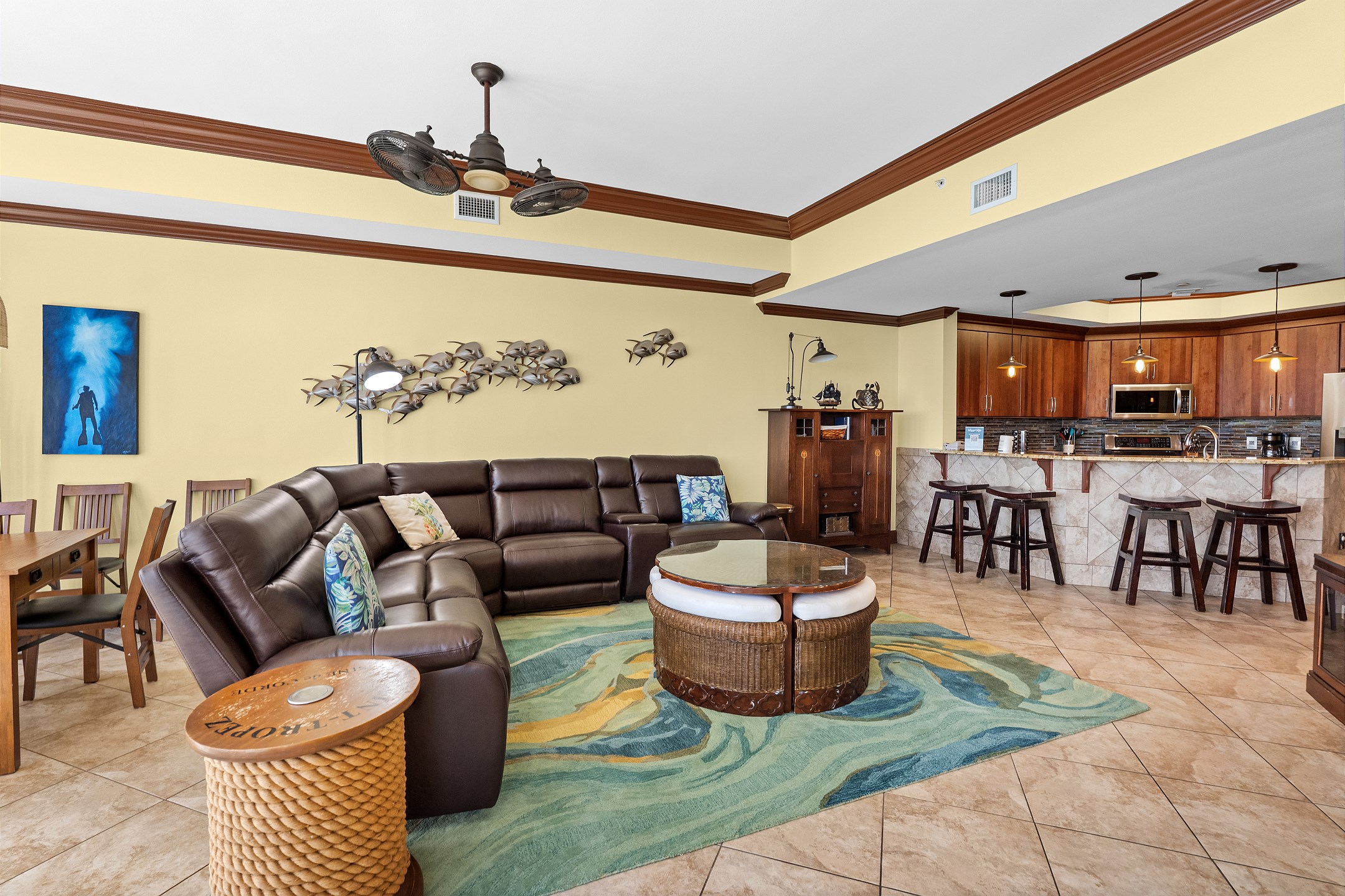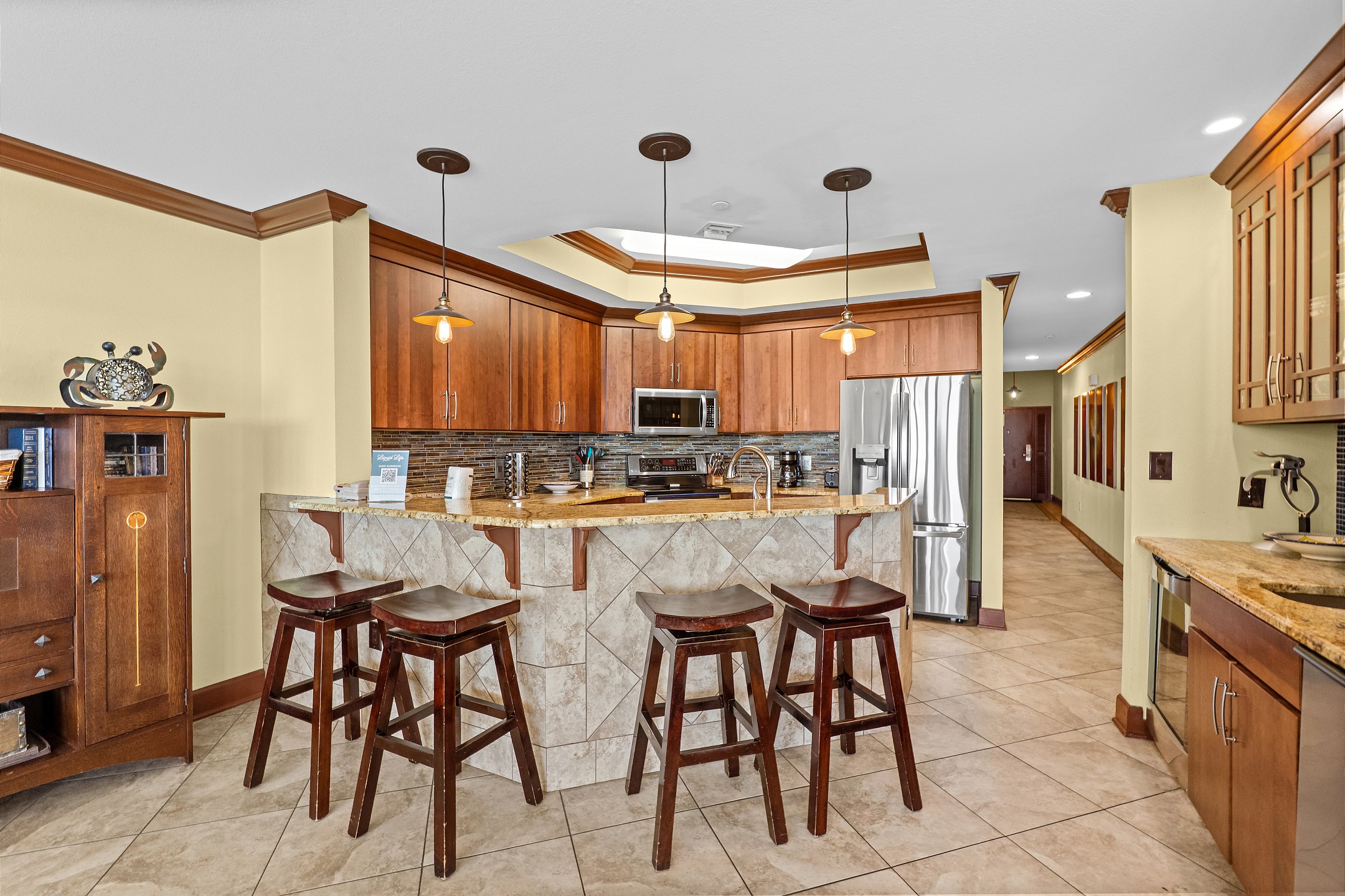 The fully equipped kitchen features stainless steel appliances and everything needed to prepare meals during your stay. A separate wet bar with a built in ice maker and beverage cooler adds an extra touch of convenience for entertaining. The dining area includes a large table positioned to enjoy the Gulf views.