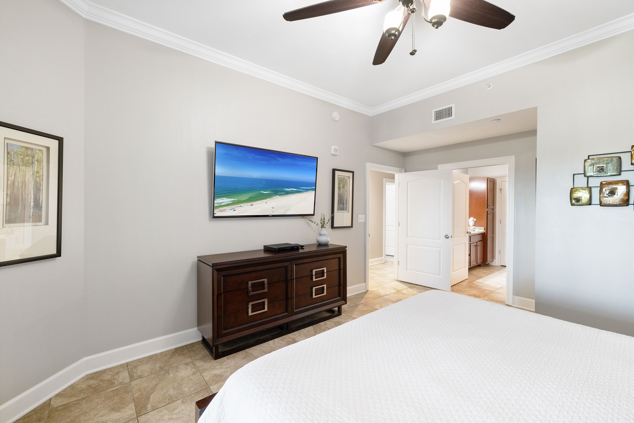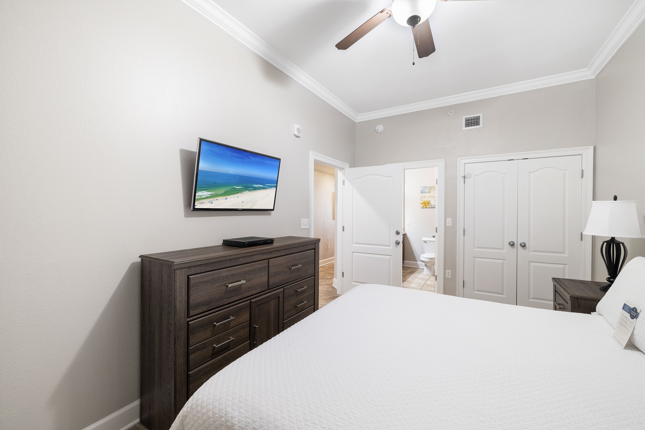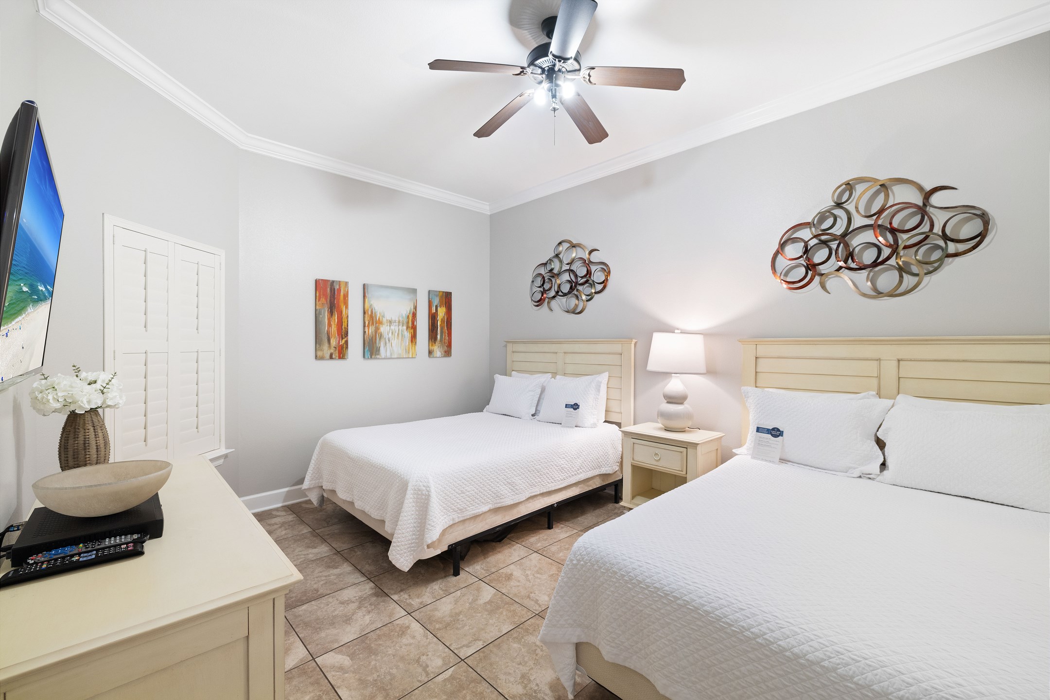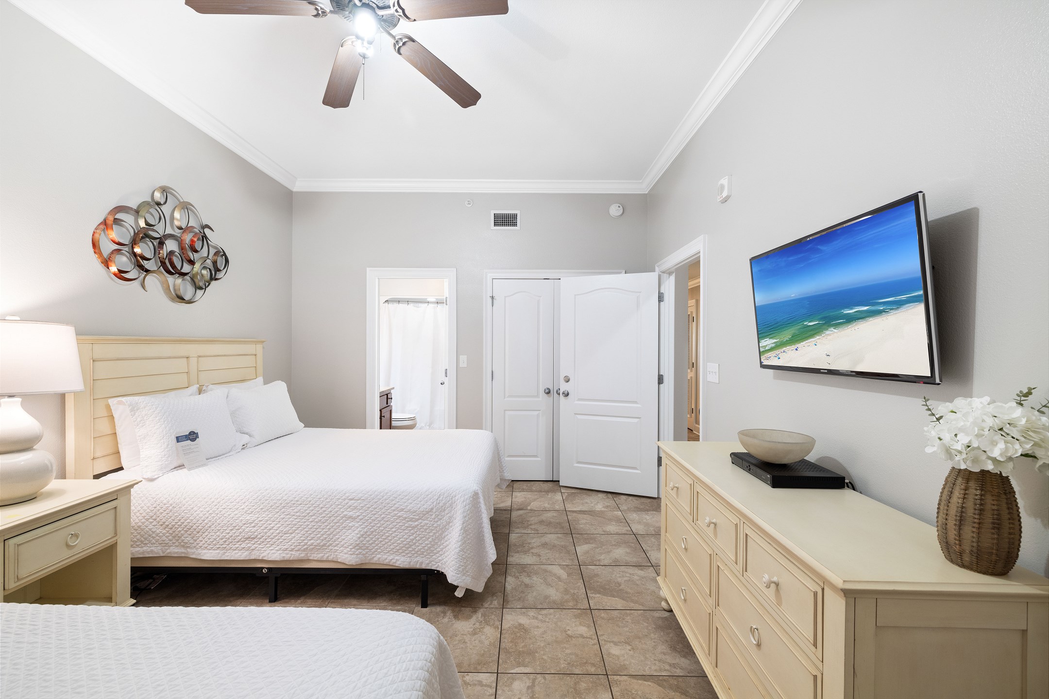 The primary suite is a private sanctuary with a king bed and an ensuite bathroom featuring a jacuzzi tub and a walk-in shower. The second bedroom also includes a king bed, while the third bedroom is designed for flexibility and comfort with two queen beds and a private ensuite bathroom. A fourth full bathroom with a walk-in shower adds extra convenience, and a sofa sleeper in the living room accommodates additional guests.