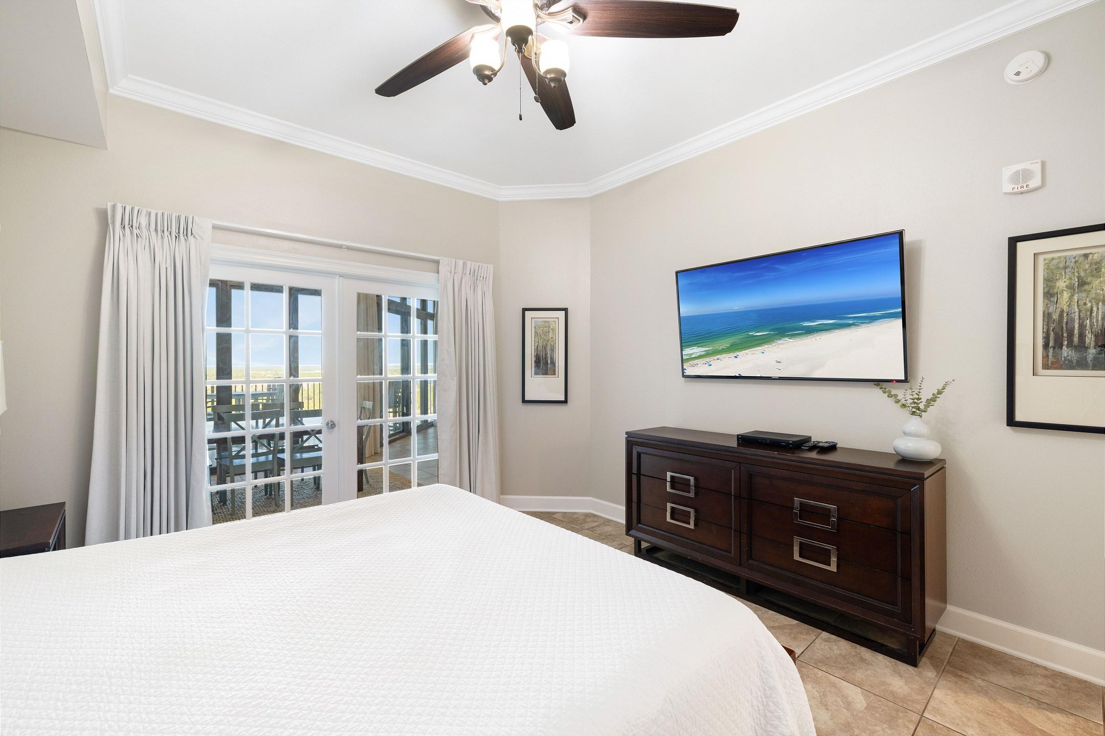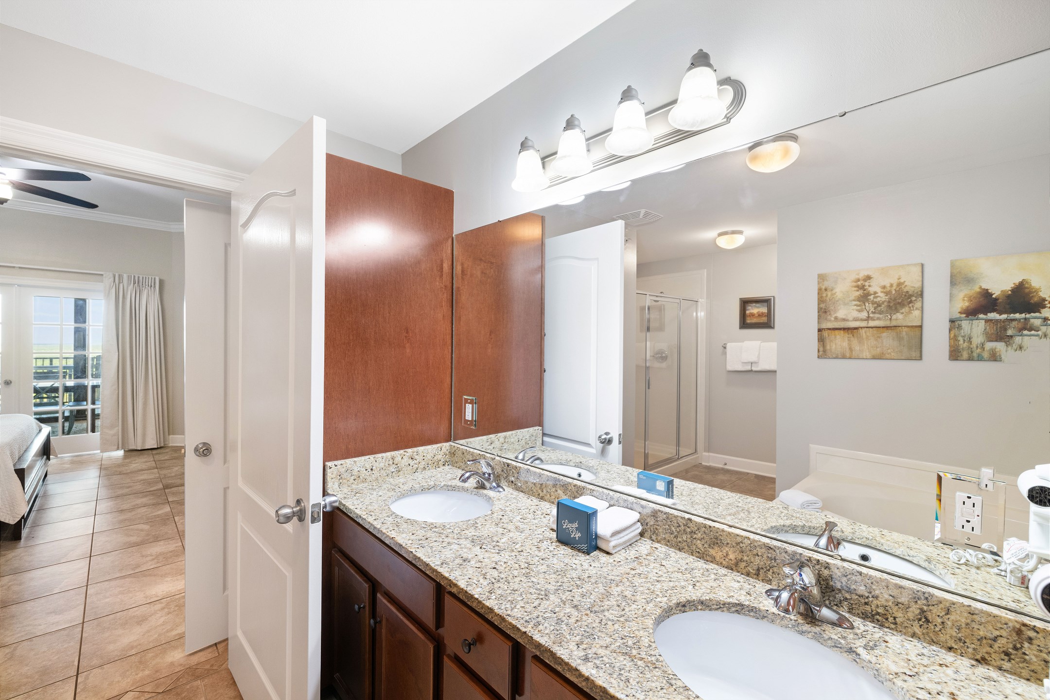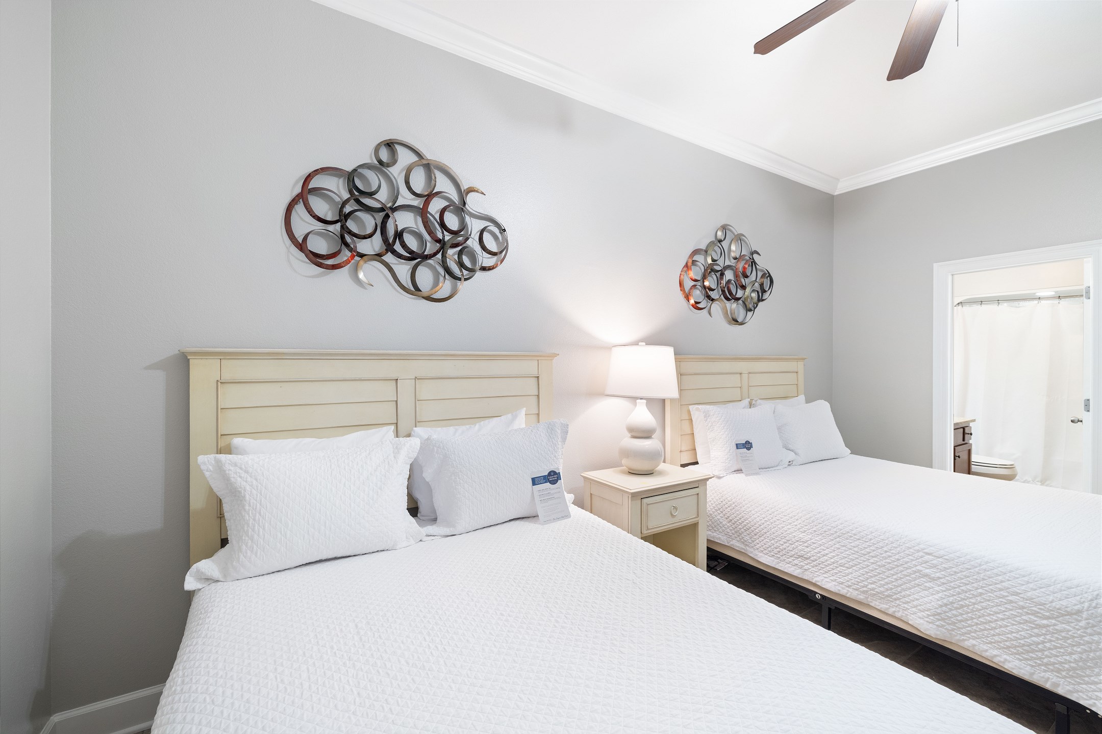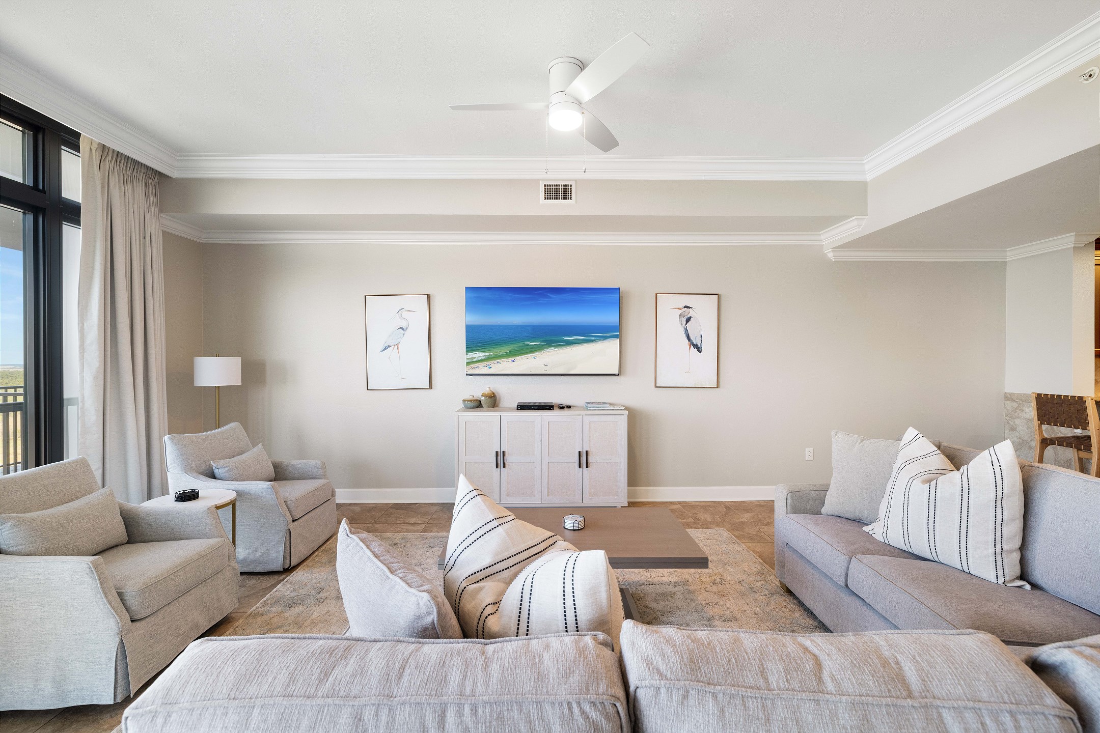 The primary suite is a private sanctuary with a king bed and an ensuite bathroom featuring a jacuzzi tub and a walk-in shower. The second bedroom also includes a king bed, while the third bedroom is designed for flexibility and comfort with two queen beds and a private ensuite bathroom. A fourth full bathroom with a walk-in shower adds extra convenience, and a sofa sleeper in the living room accommodates additional guests.