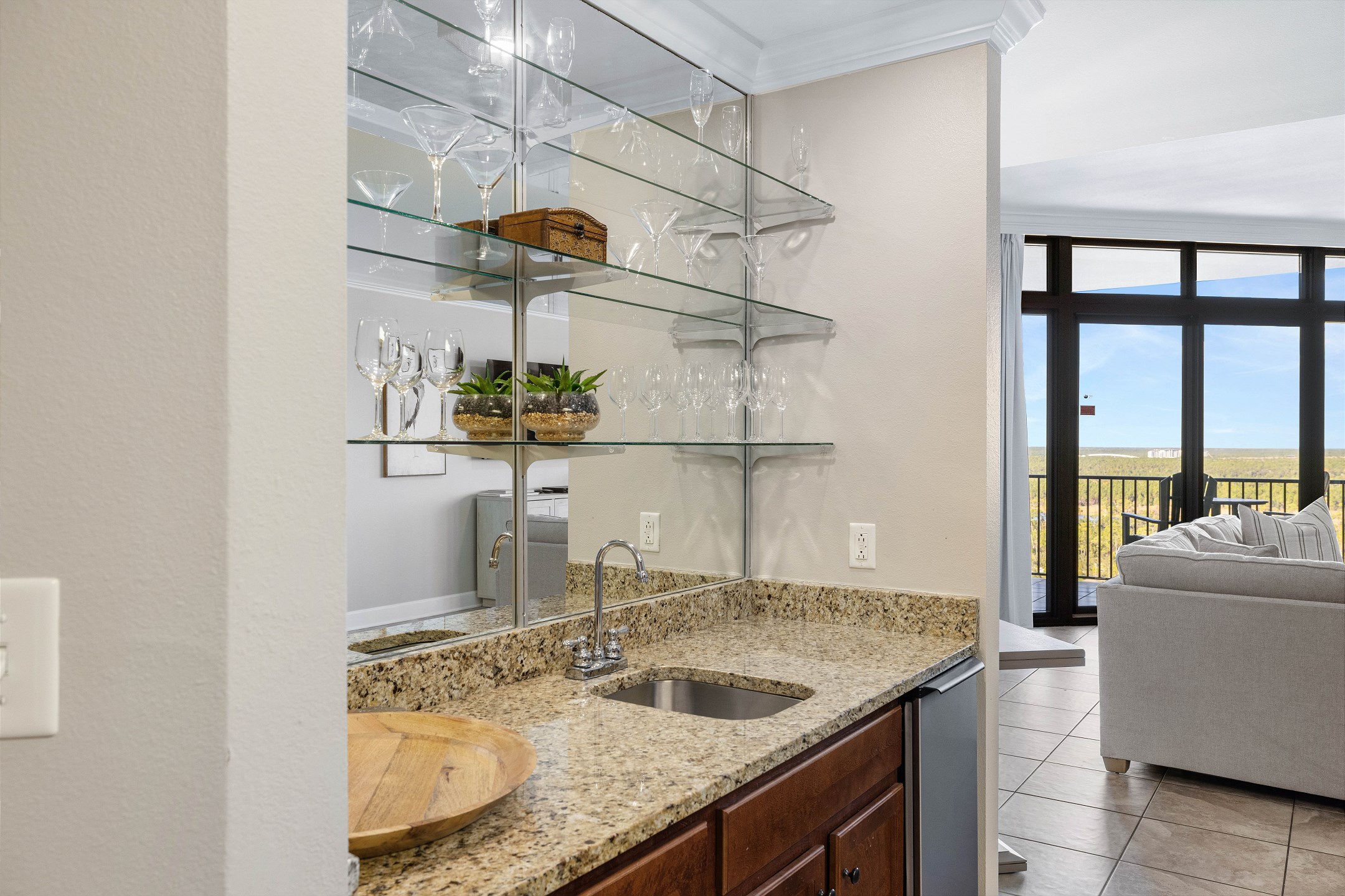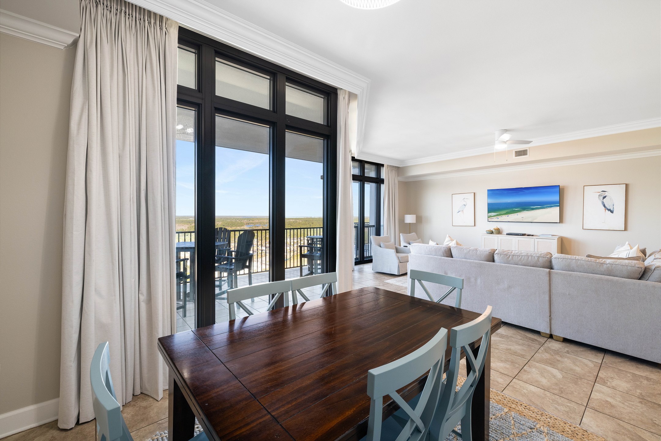 Step into the expansive living room, where a wall of floor-to-ceiling windows floods the space with natural light and leads out to a private balcony—perfect for relaxing with a morning coffee or unwinding at sunset. The fully equipped kitchen features stainless steel appliances and is complemented by a wet bar and a large dining table in the dining area, ideal for entertaining and shared meals.