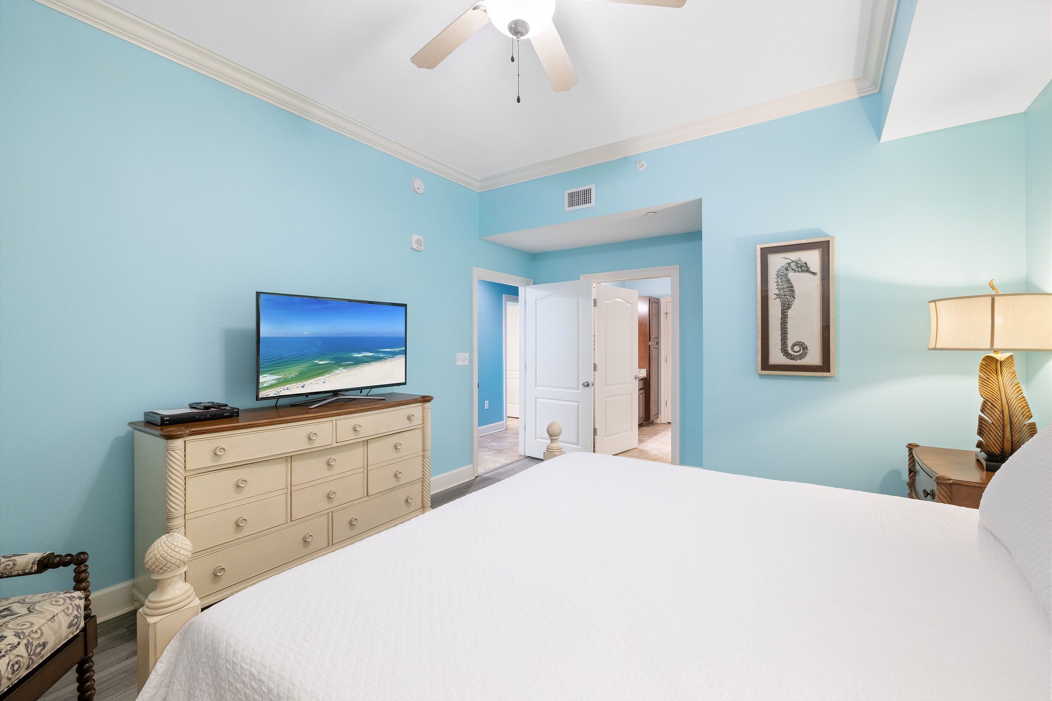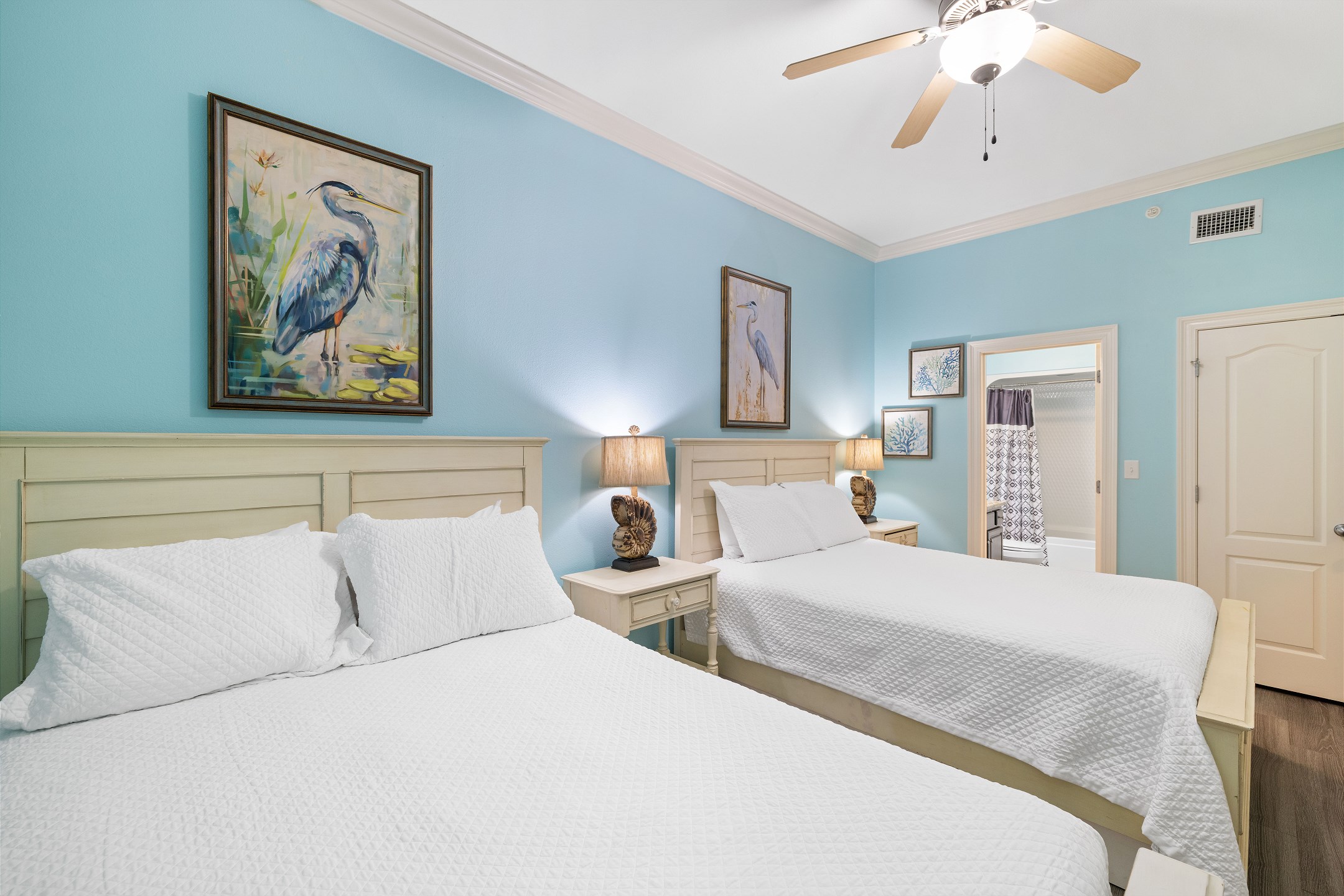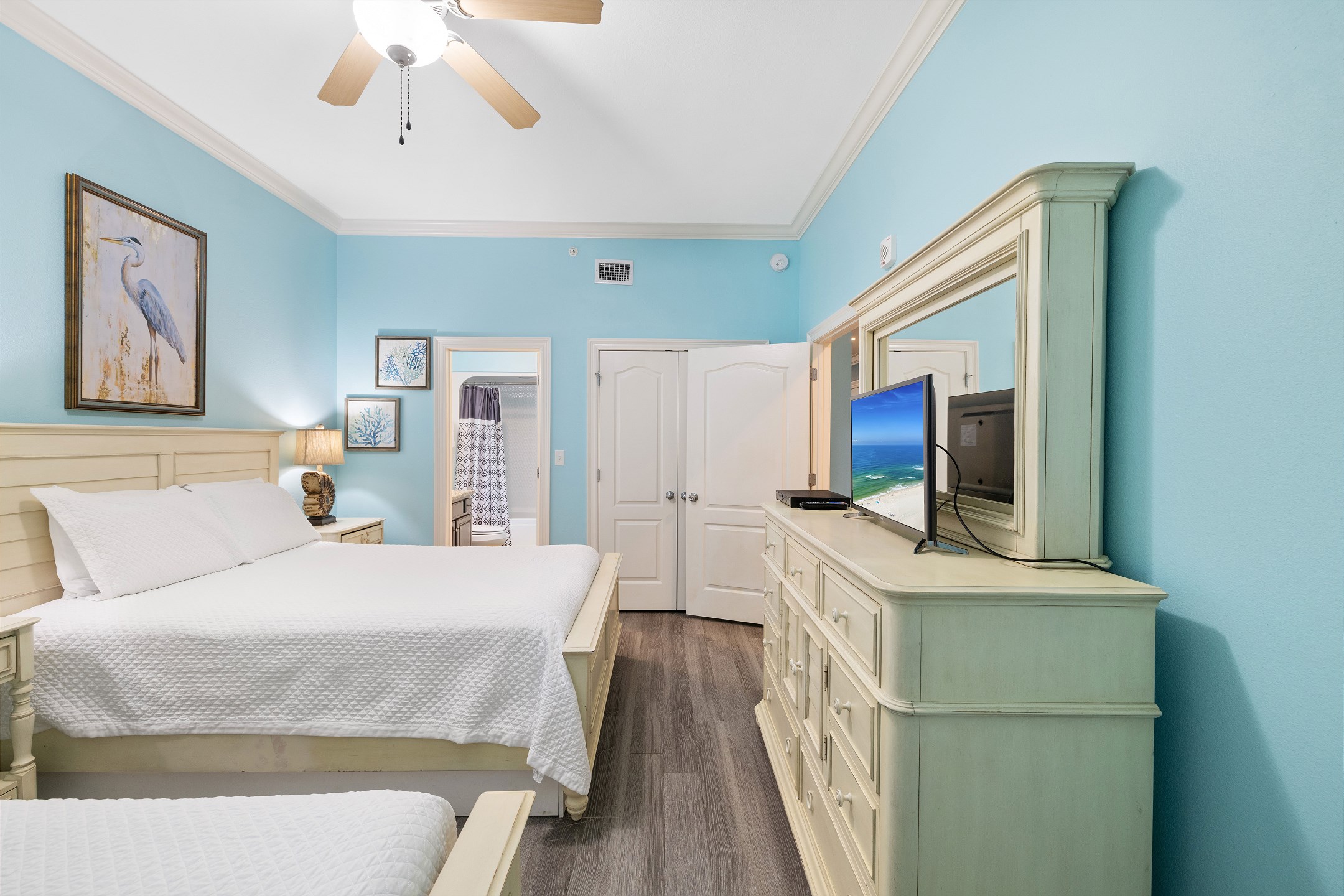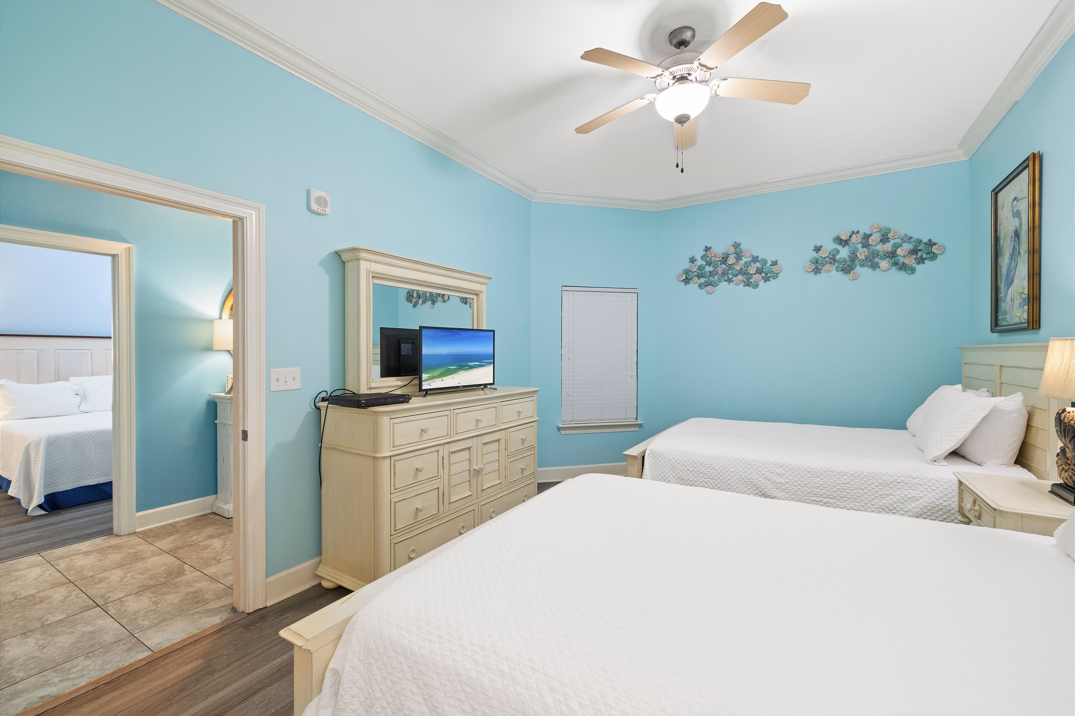 The primary suite is a peaceful retreat with a king bed, balcony access, and an ensuite bathroom featuring a double vanity, jetted tub, and a walk in shower. The second bedroom offers two queen beds and a private ensuite bathroom, while the third bedroom includes two full size beds and its own ensuite bathroom. An additional full bathroom with a walk in shower provides extra convenience. A sofa sleeper in the living room adds even more sleeping space, and a washer and dryer in the unit make longer stays comfortable and stress free.