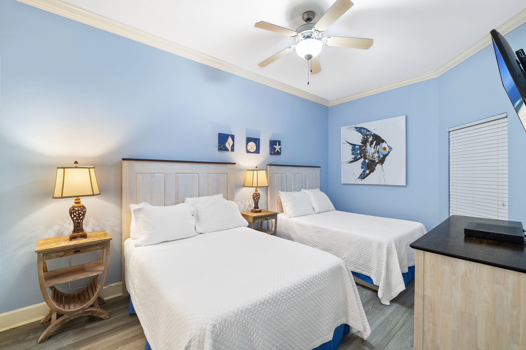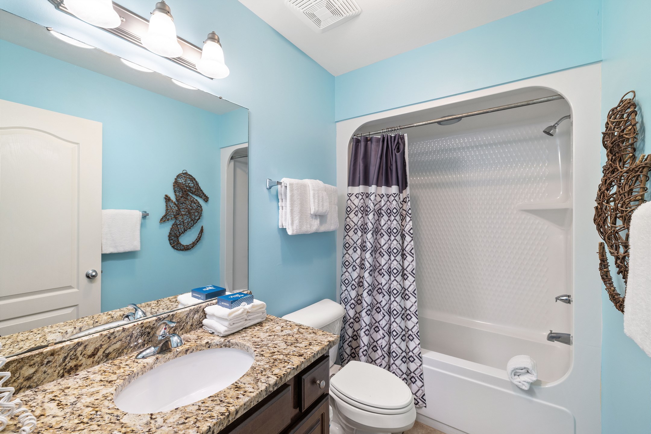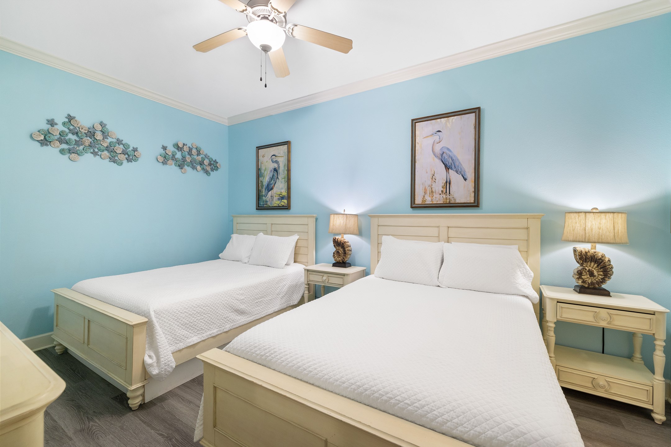 The primary suite is a peaceful retreat with a king bed, balcony access, and an ensuite bathroom featuring a double vanity, jetted tub, and a walk in shower. The second bedroom offers two queen beds and a private ensuite bathroom, while the third bedroom includes two full size beds and its own ensuite bathroom. An additional full bathroom with a walk in shower provides extra convenience. A sofa sleeper in the living room adds even more sleeping space, and a washer and dryer in the unit make longer stays comfortable and stress free.