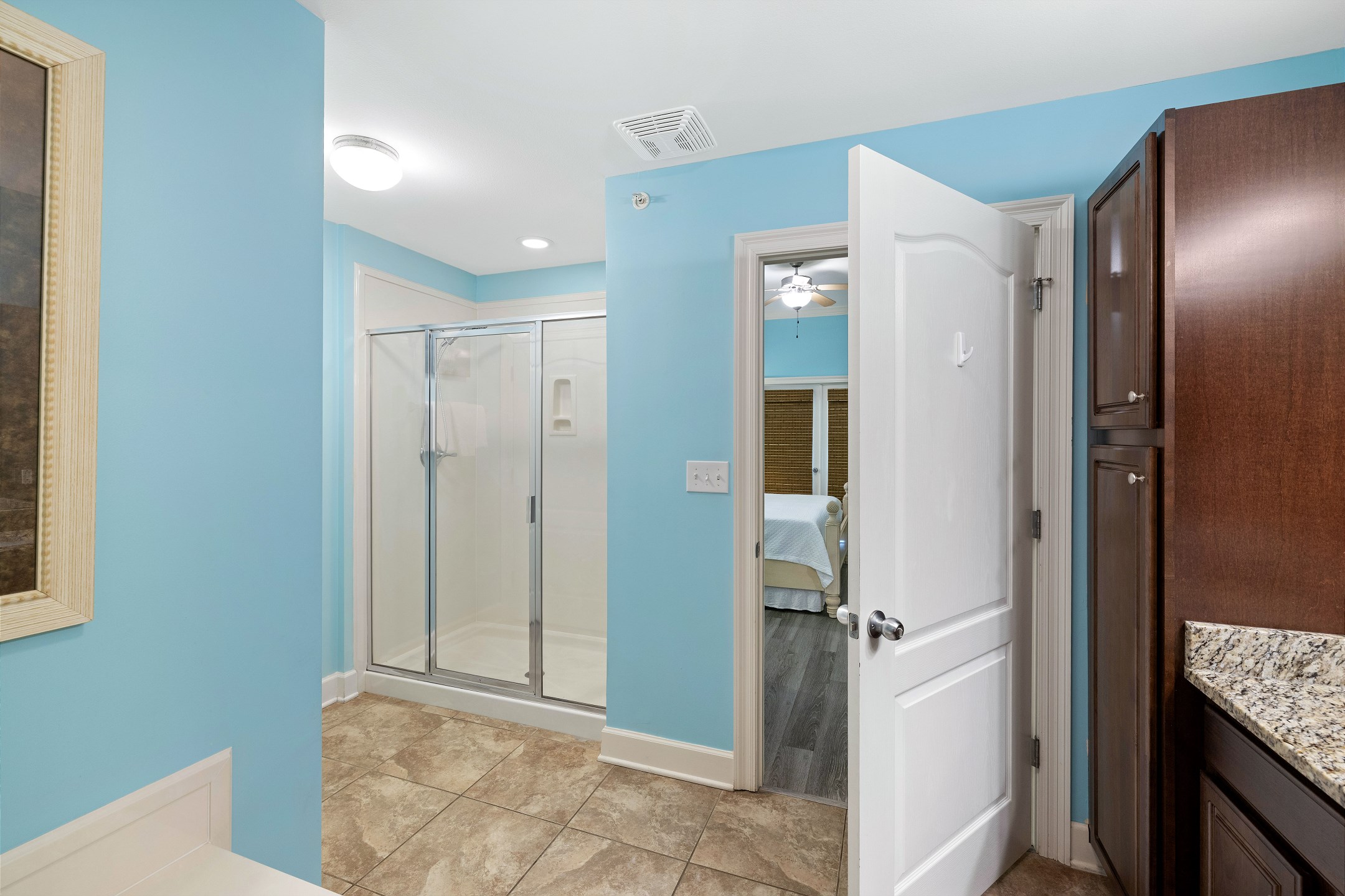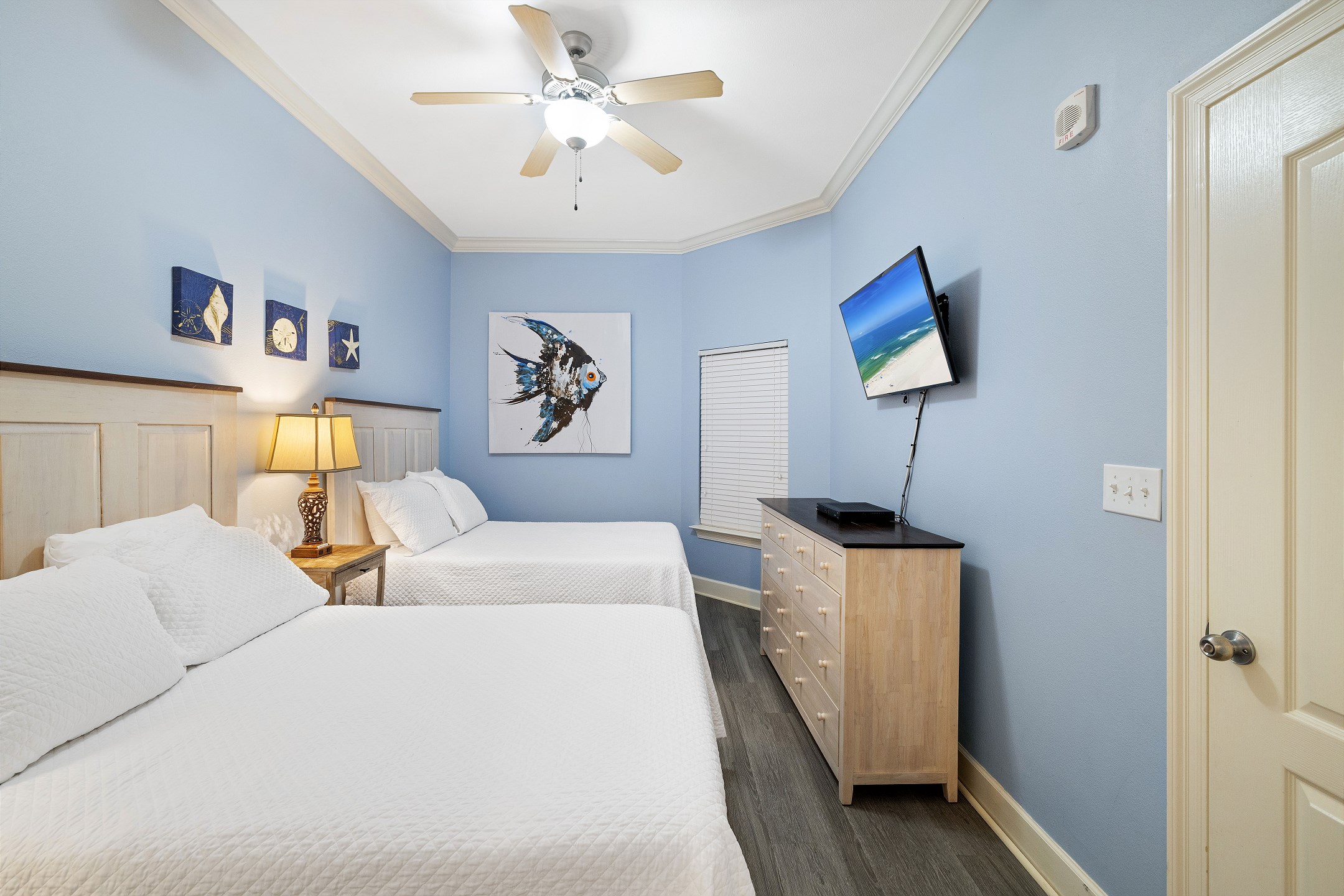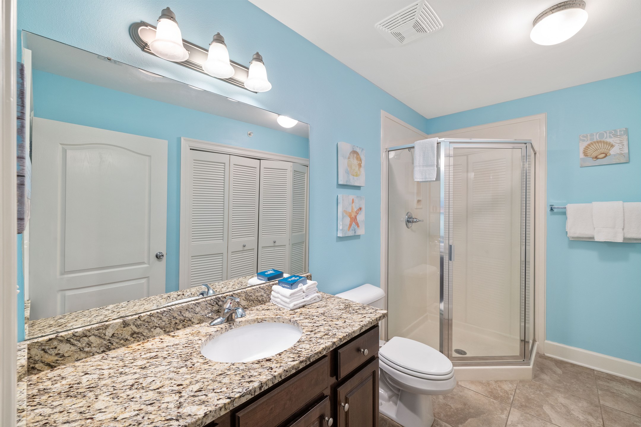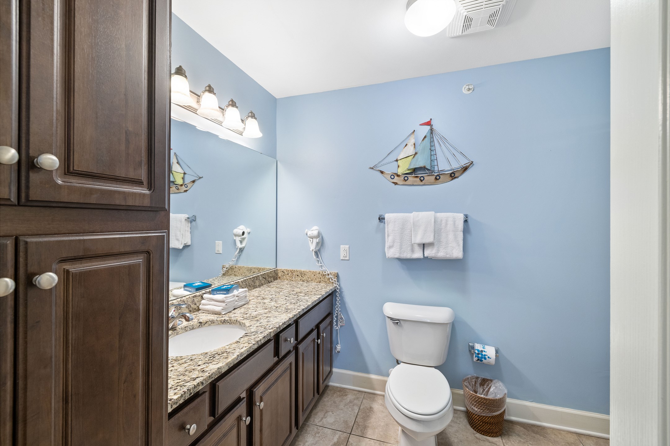 The primary suite is a peaceful retreat with a king bed, balcony access, and an ensuite bathroom featuring a double vanity, jetted tub, and a walk in shower. The second bedroom offers two queen beds and a private ensuite bathroom, while the third bedroom includes two full size beds and its own ensuite bathroom. An additional full bathroom with a walk in shower provides extra convenience. A sofa sleeper in the living room adds even more sleeping space, and a washer and dryer in the unit make longer stays comfortable and stress free.