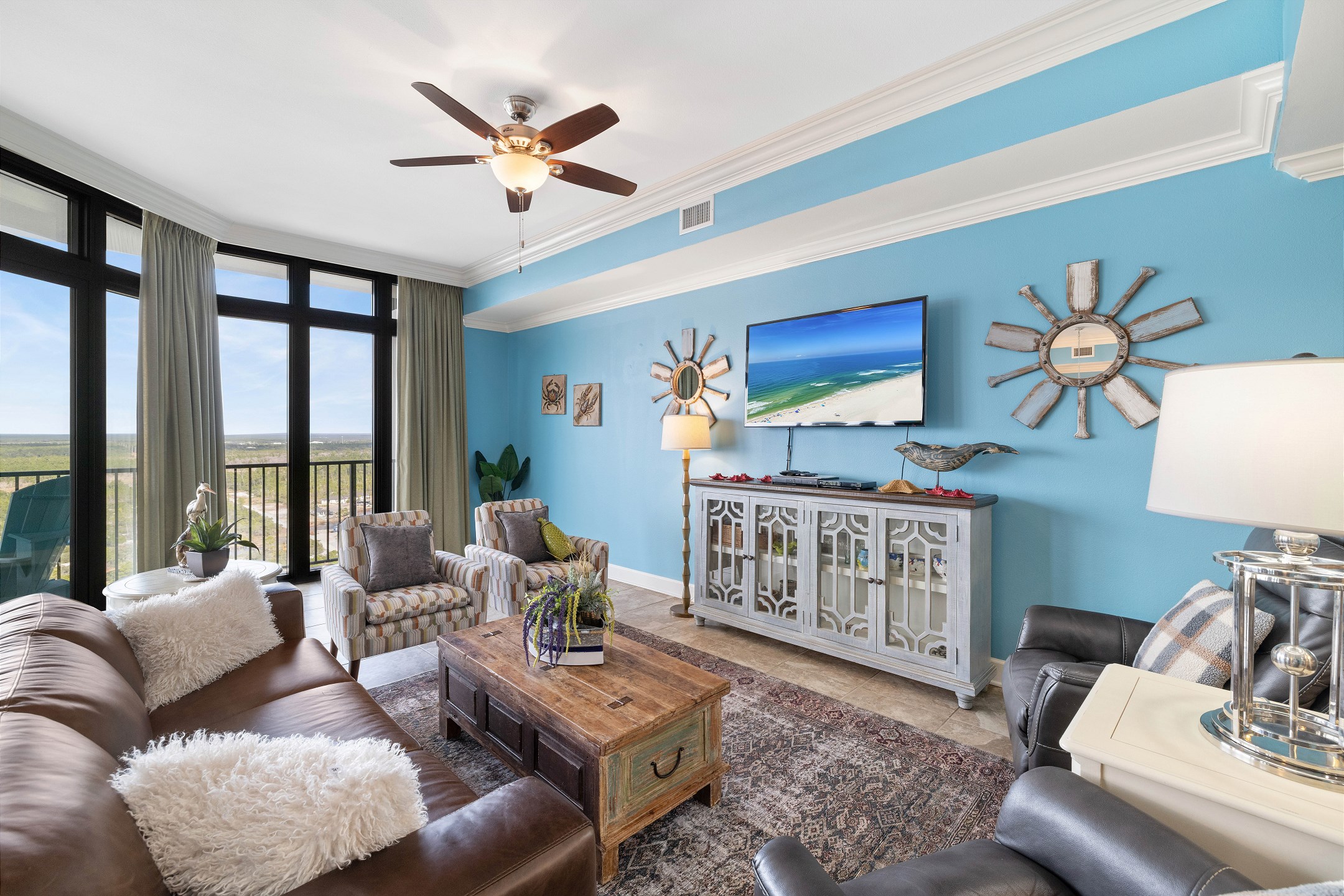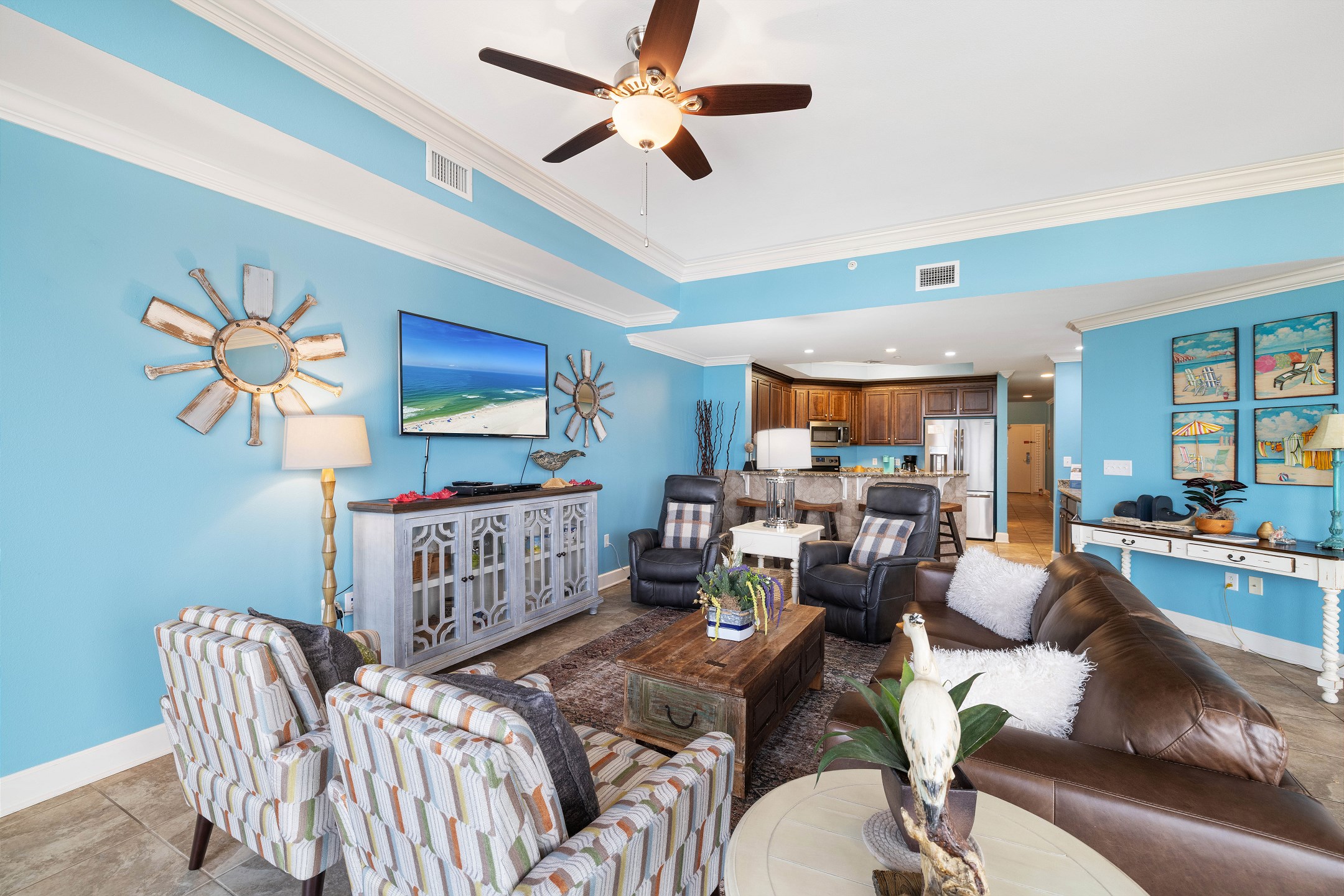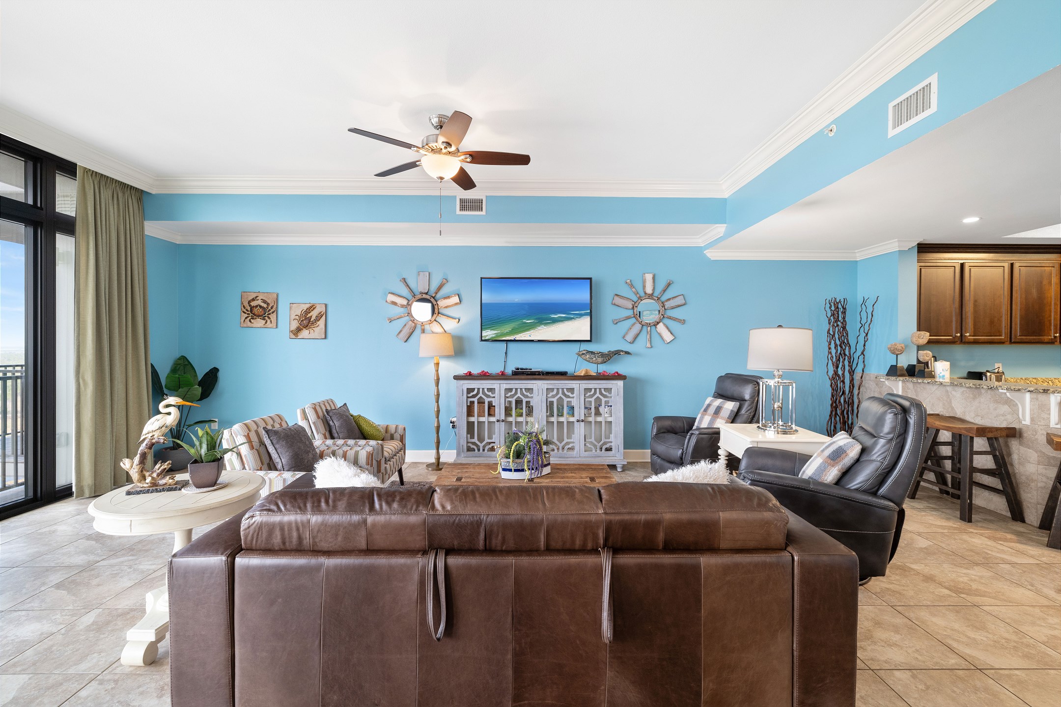 The living room is bright and welcoming, featuring panoramic floor to ceiling windows, a large comfortable sectional, and two recliners. Step out onto the expansive private balcony to take in stunning views, enjoy your morning coffee, or unwind as the sun sets. The fully equipped kitchen includes stainless steel appliances, granite countertops, a dining table for group meals, and a wet bar with an ice maker, making entertaining easy and enjoyable.