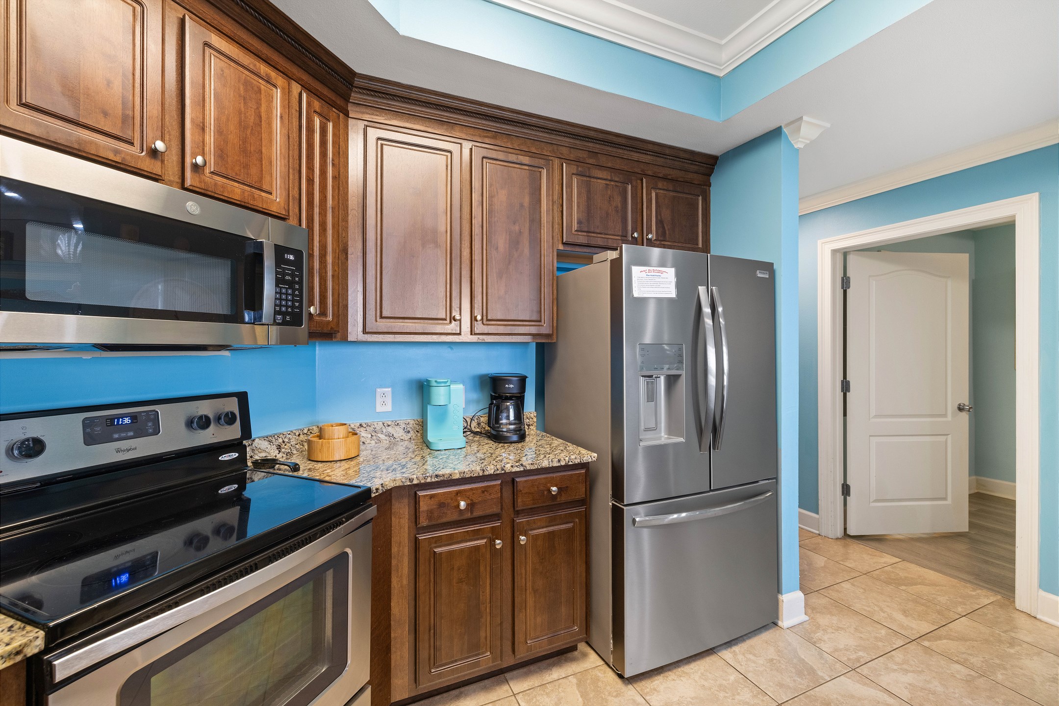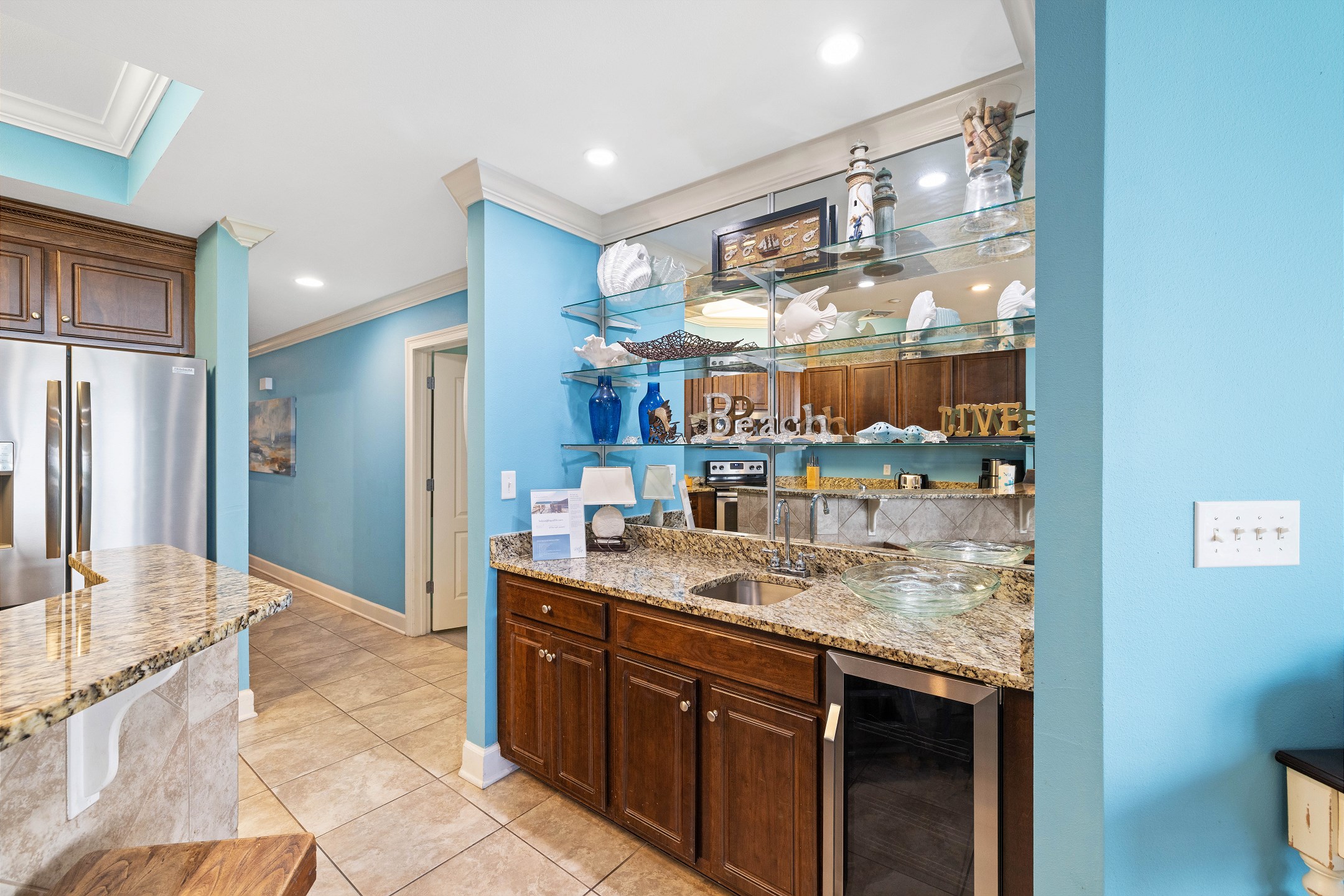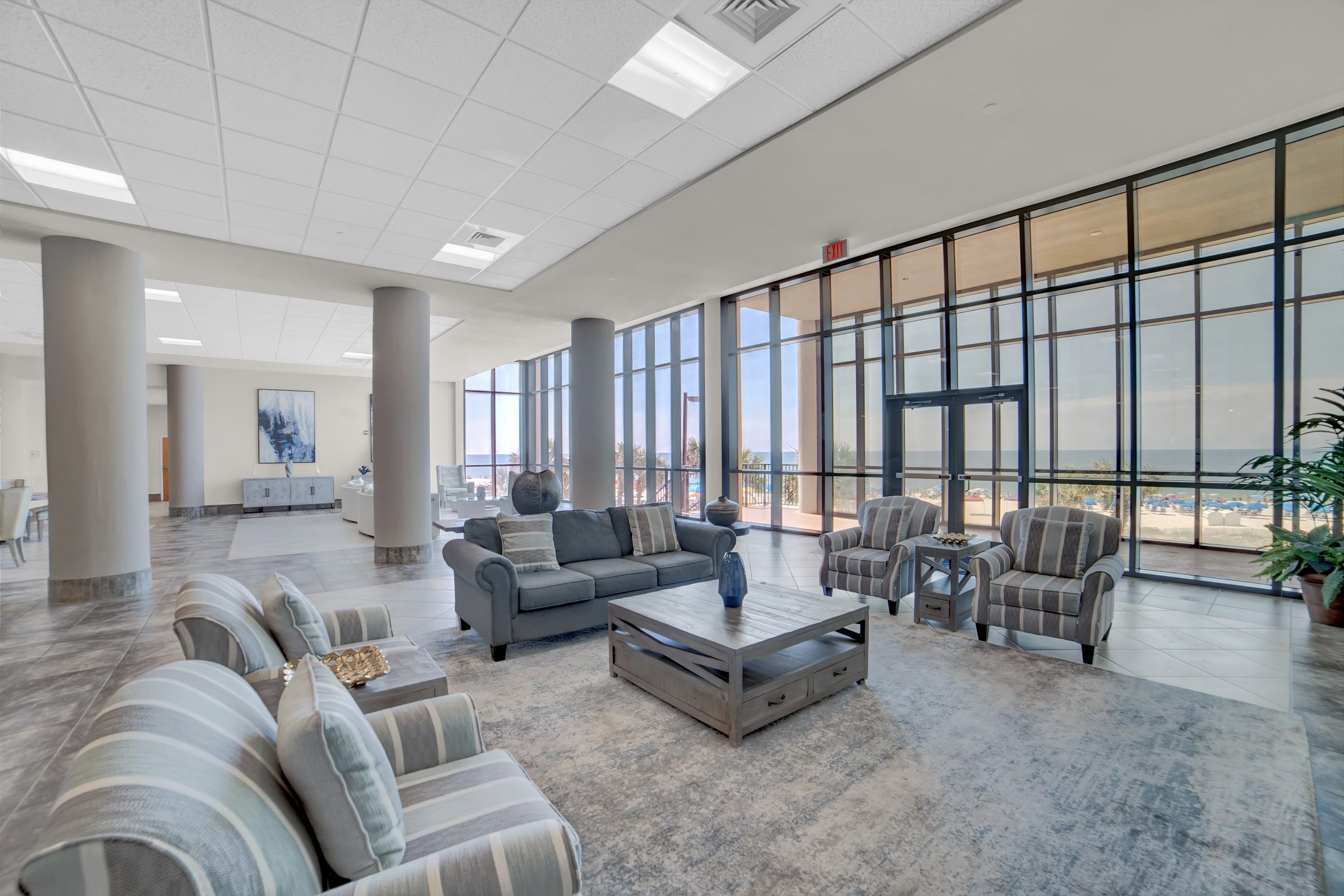 The living room is bright and welcoming, featuring panoramic floor to ceiling windows, a large comfortable sectional, and two recliners. Step out onto the expansive private balcony to take in stunning views, enjoy your morning coffee, or unwind as the sun sets. The fully equipped kitchen includes stainless steel appliances, granite countertops, a dining table for group meals, and a wet bar with an ice maker, making entertaining easy and enjoyable.