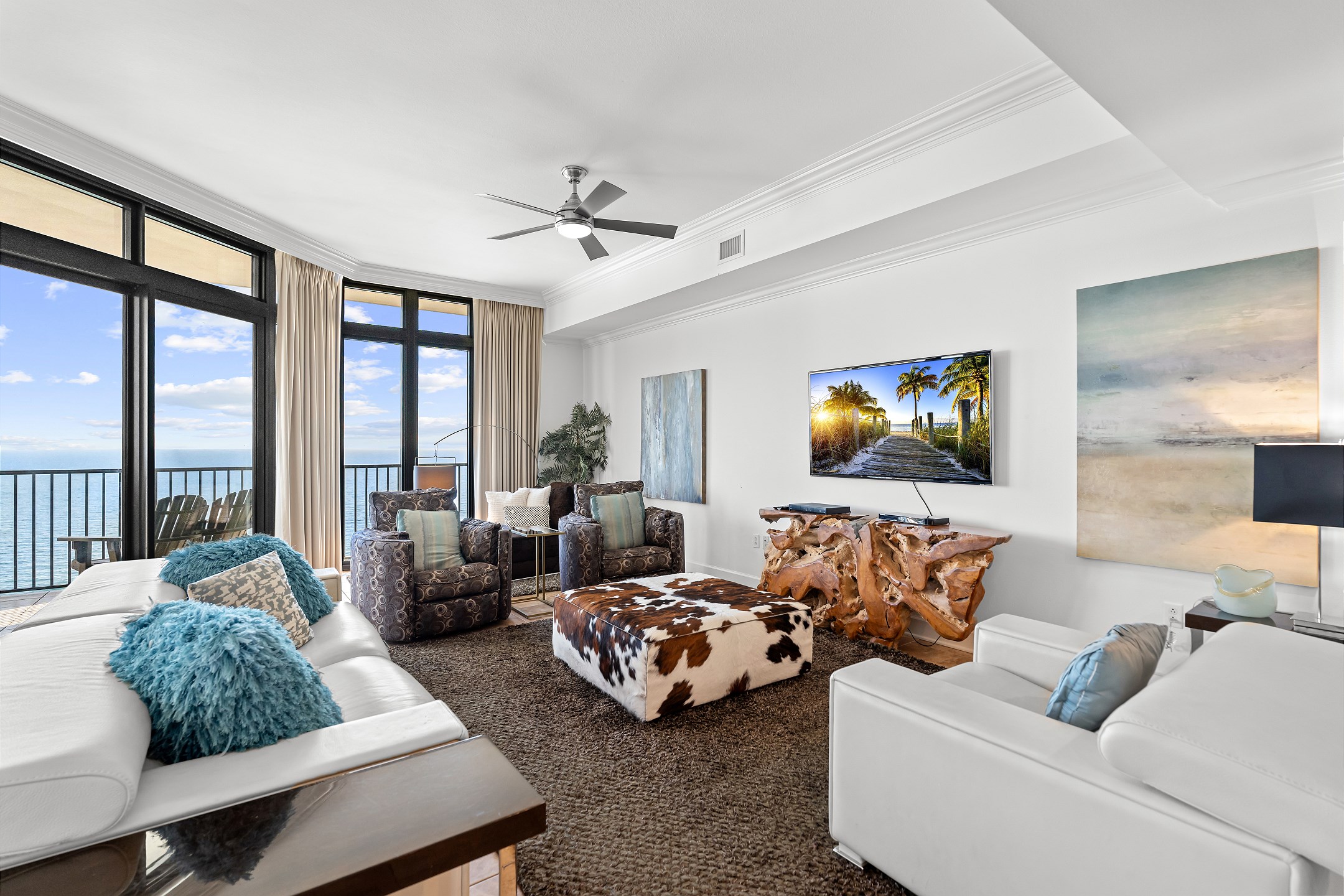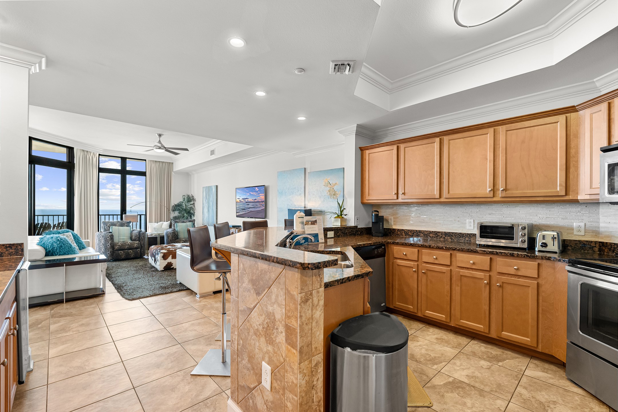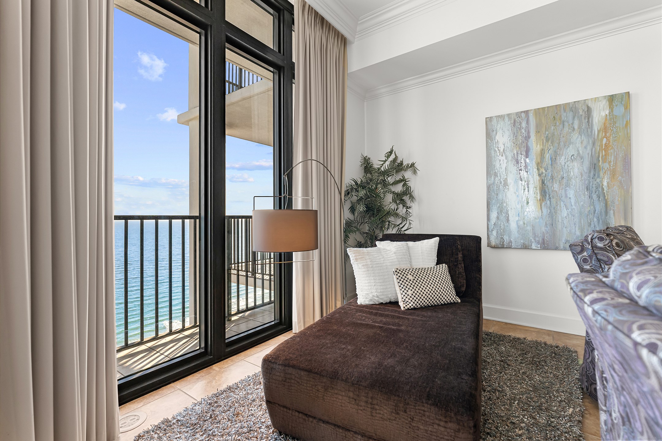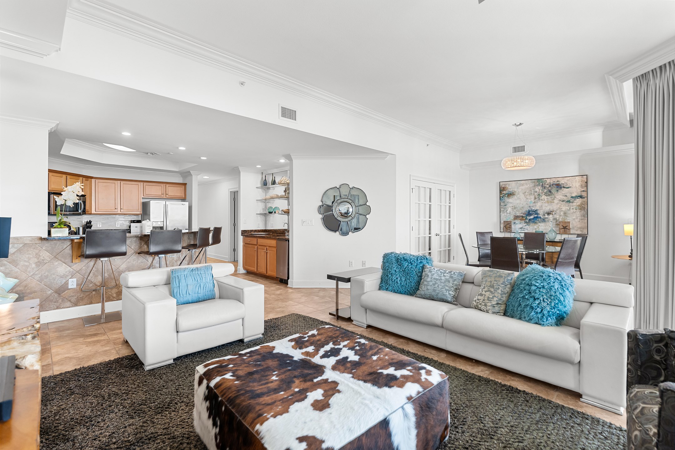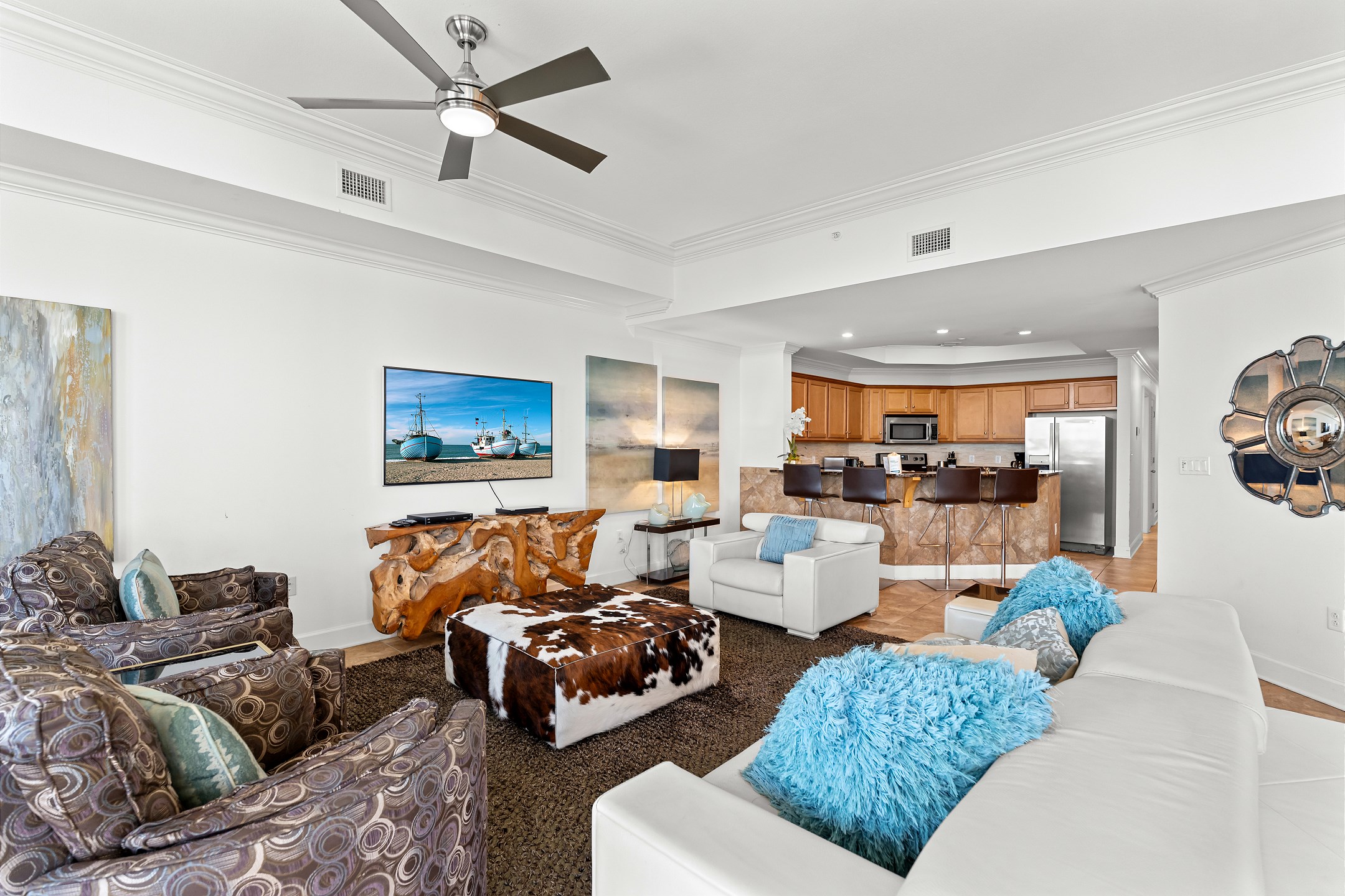 The bright and inviting living room is filled with natural light from a wall of floor to ceiling windows that lead out to the private balcony overlooking the Gulf. With plenty of comfortable seating, a flat screen TV, and a sofa sleeper, this space is perfect for relaxing and gathering together.