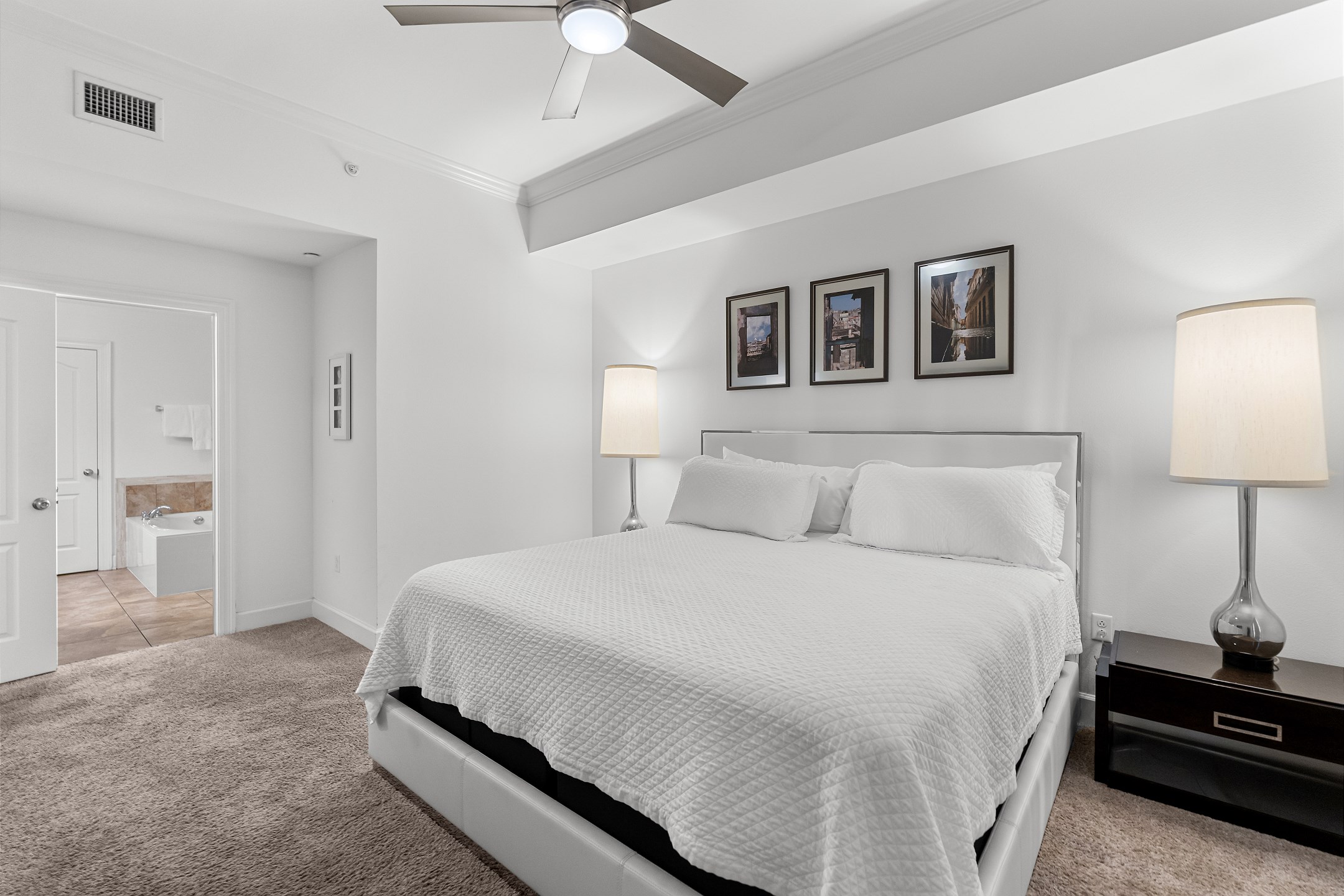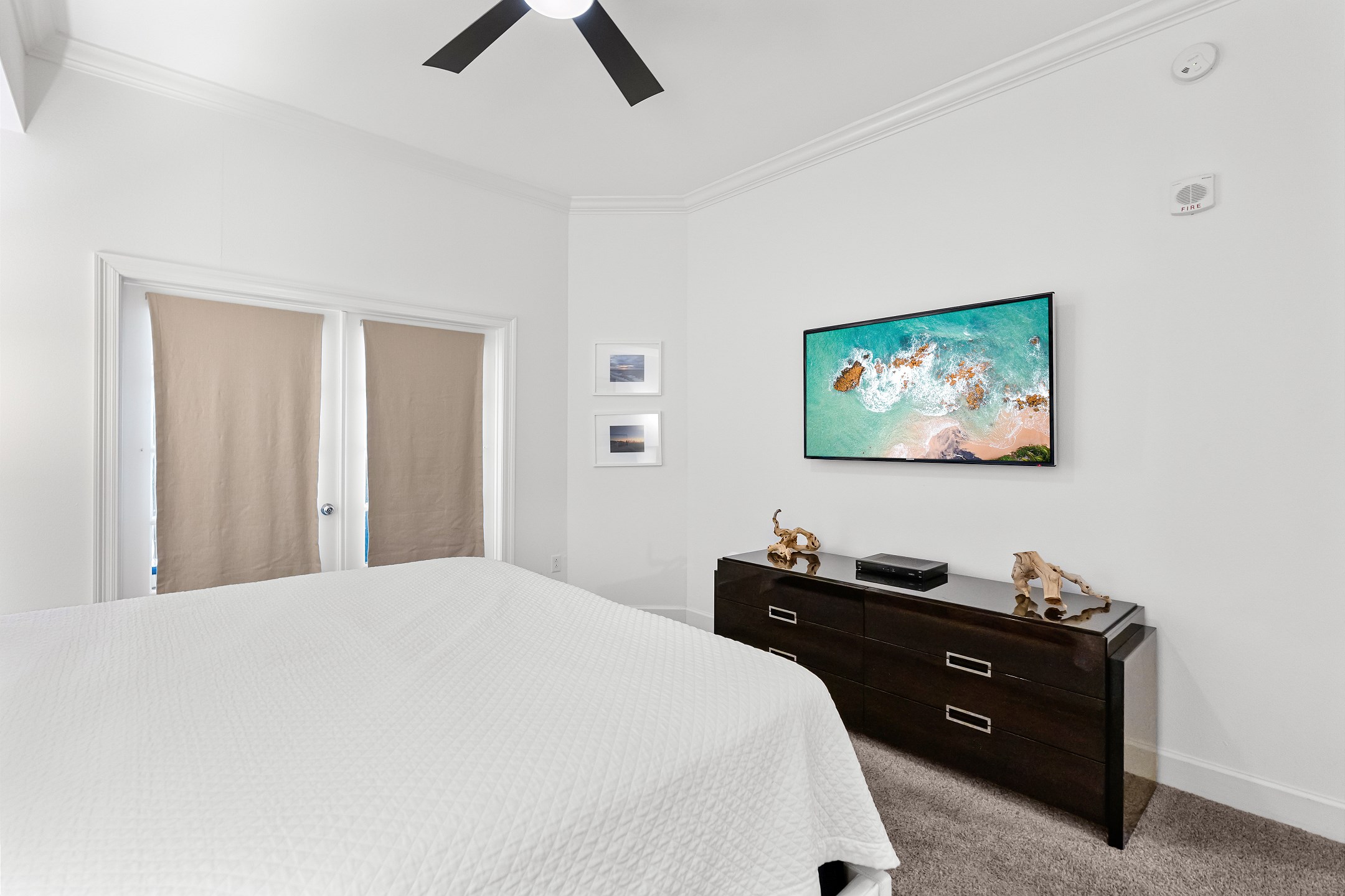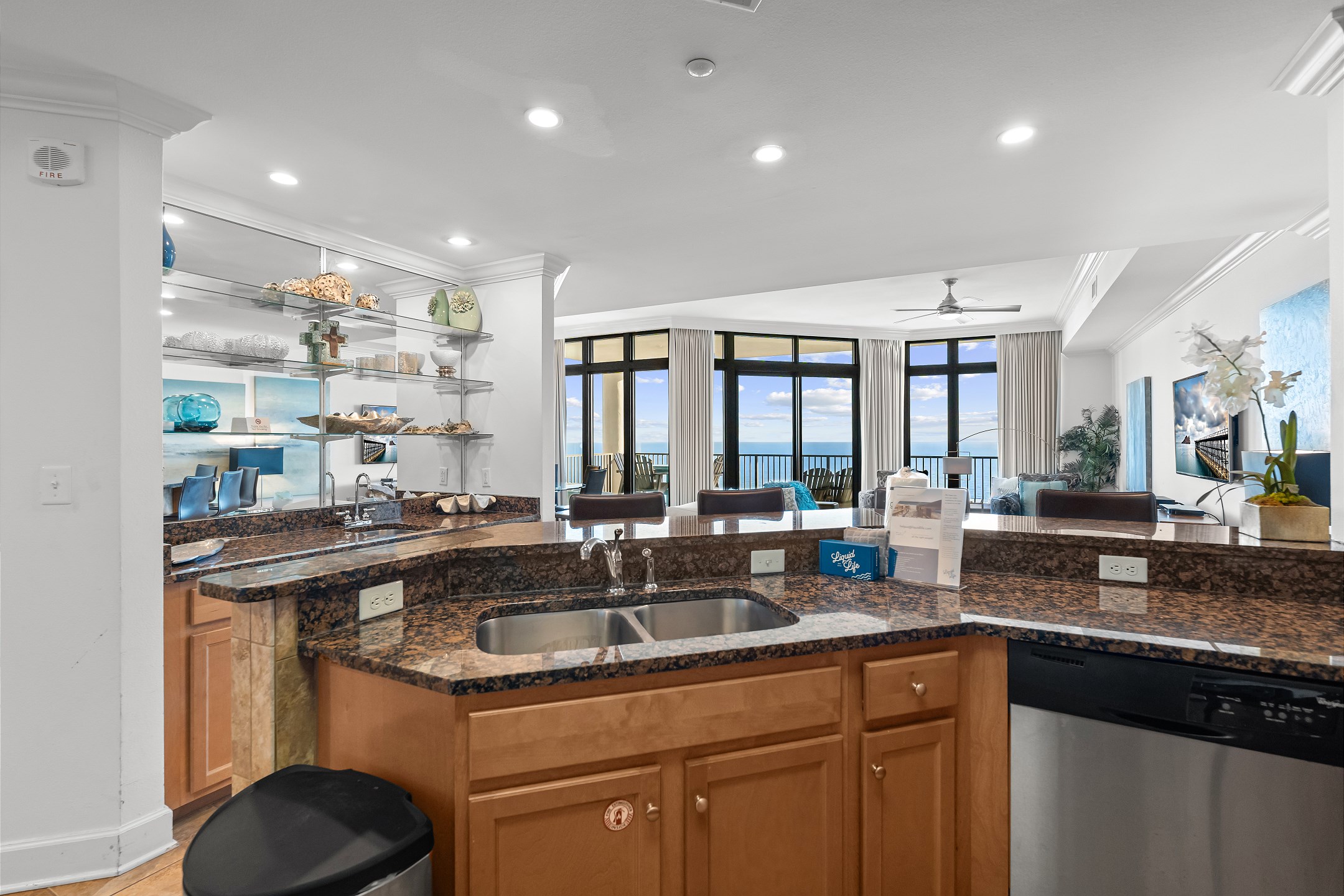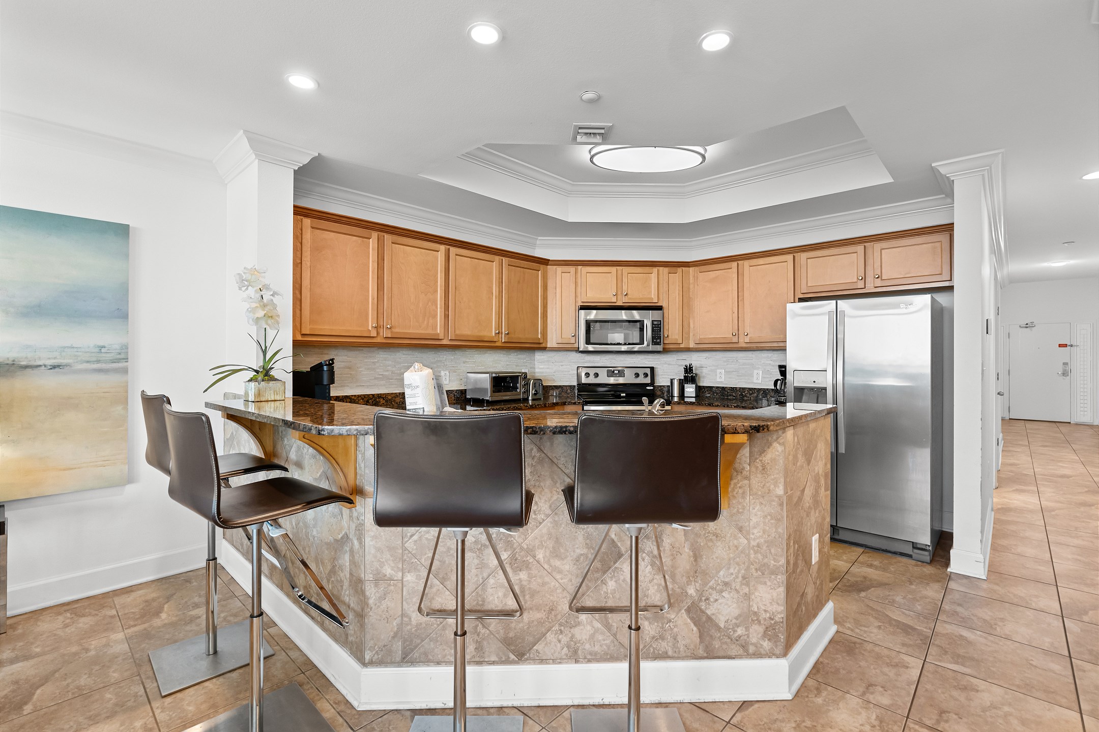 The bright and inviting living room is filled with natural light from a wall of floor to ceiling windows that lead out to the private balcony overlooking the Gulf. With plenty of comfortable seating, a flat screen TV, and a sofa sleeper, this space is perfect for relaxing and gathering together.