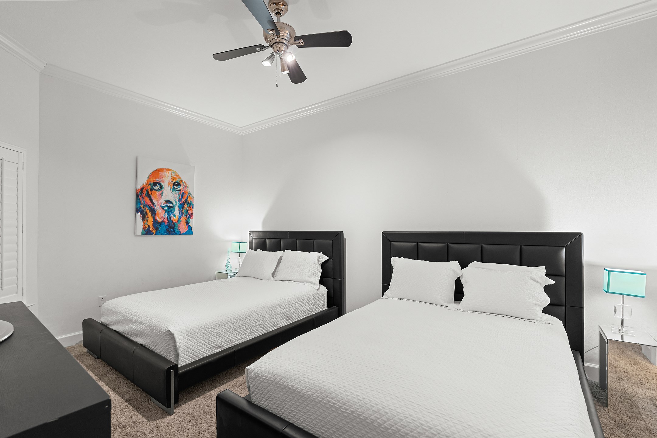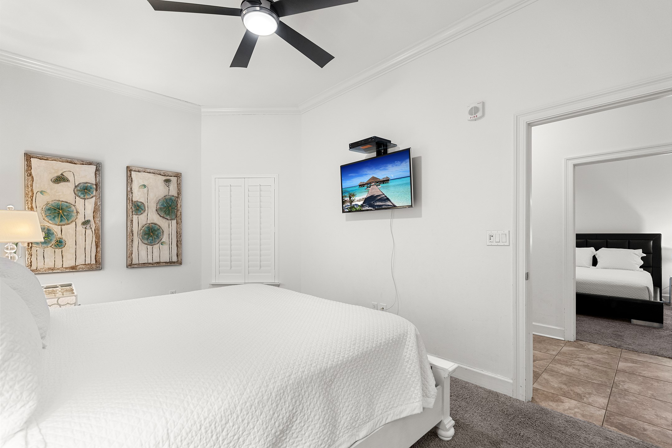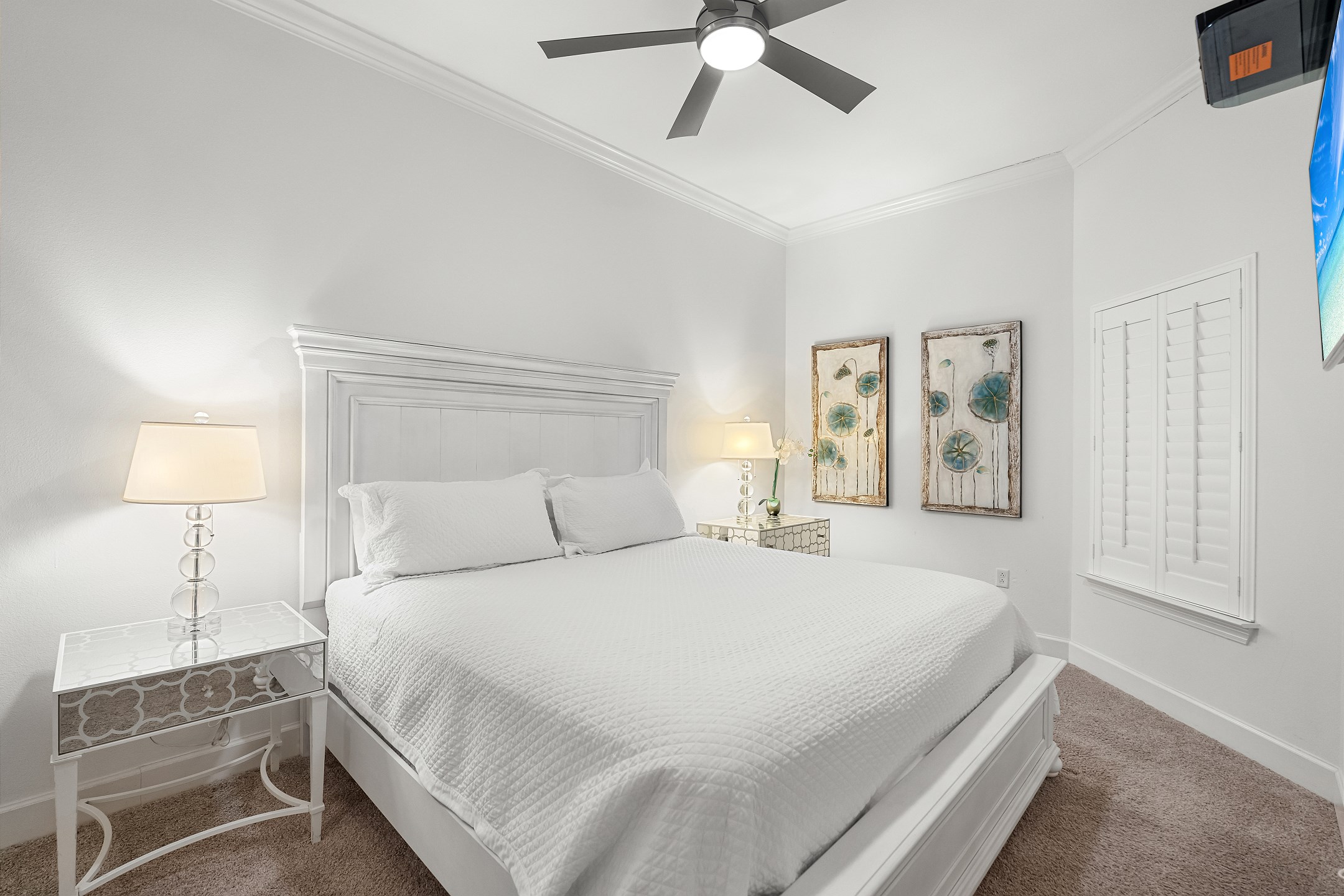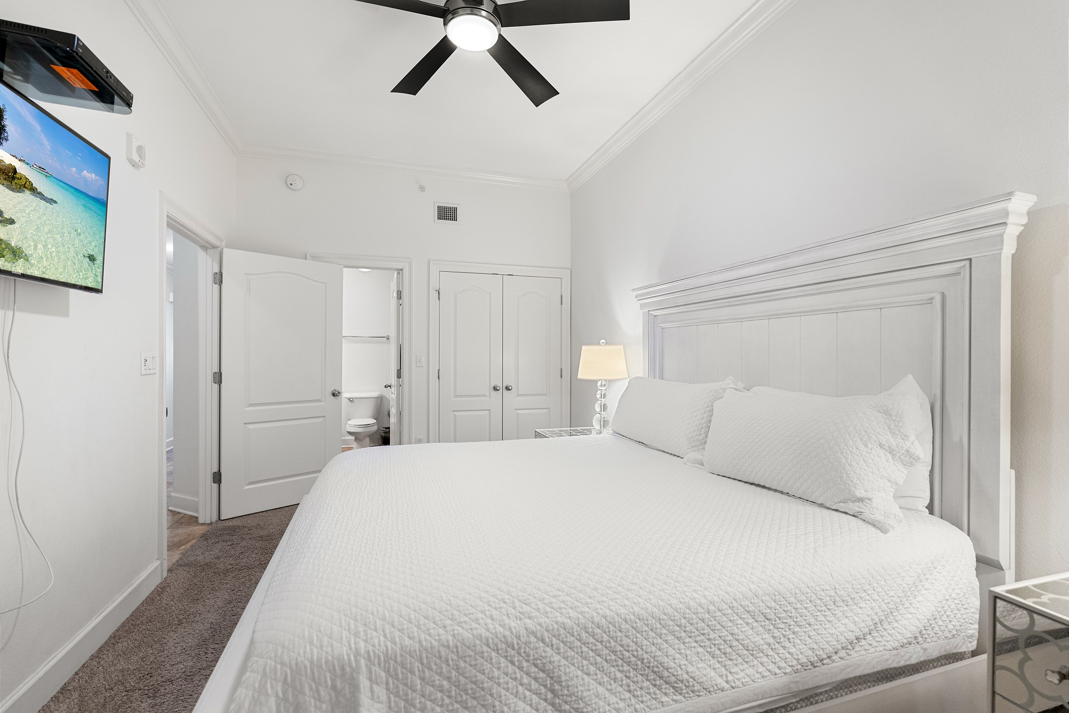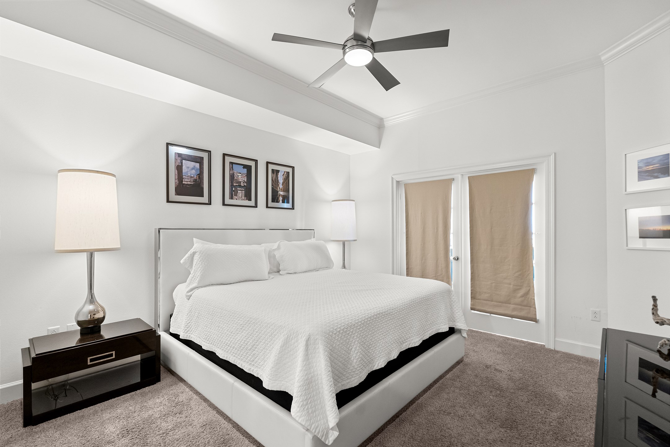 The bright and inviting living room is filled with natural light from a wall of floor to ceiling windows that lead out to the private balcony overlooking the Gulf. With plenty of comfortable seating, a flat screen TV, and a sofa sleeper, this space is perfect for relaxing and gathering together.