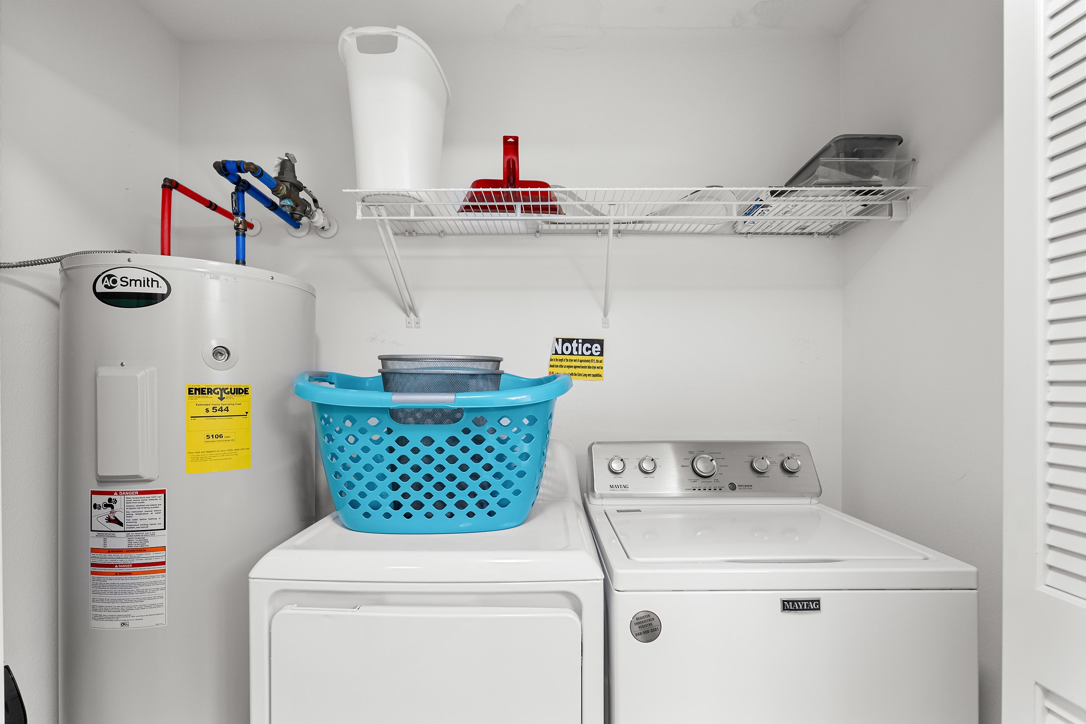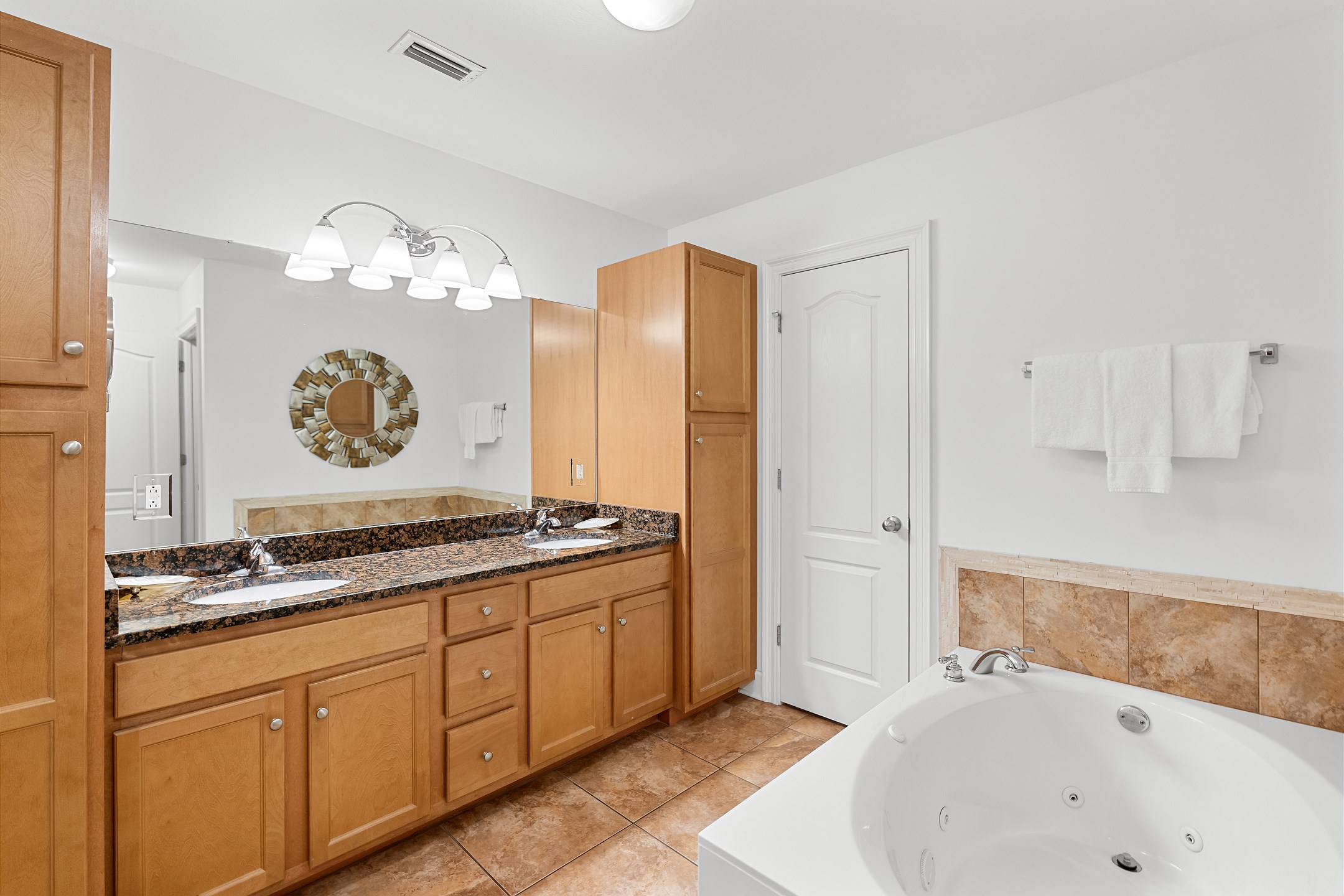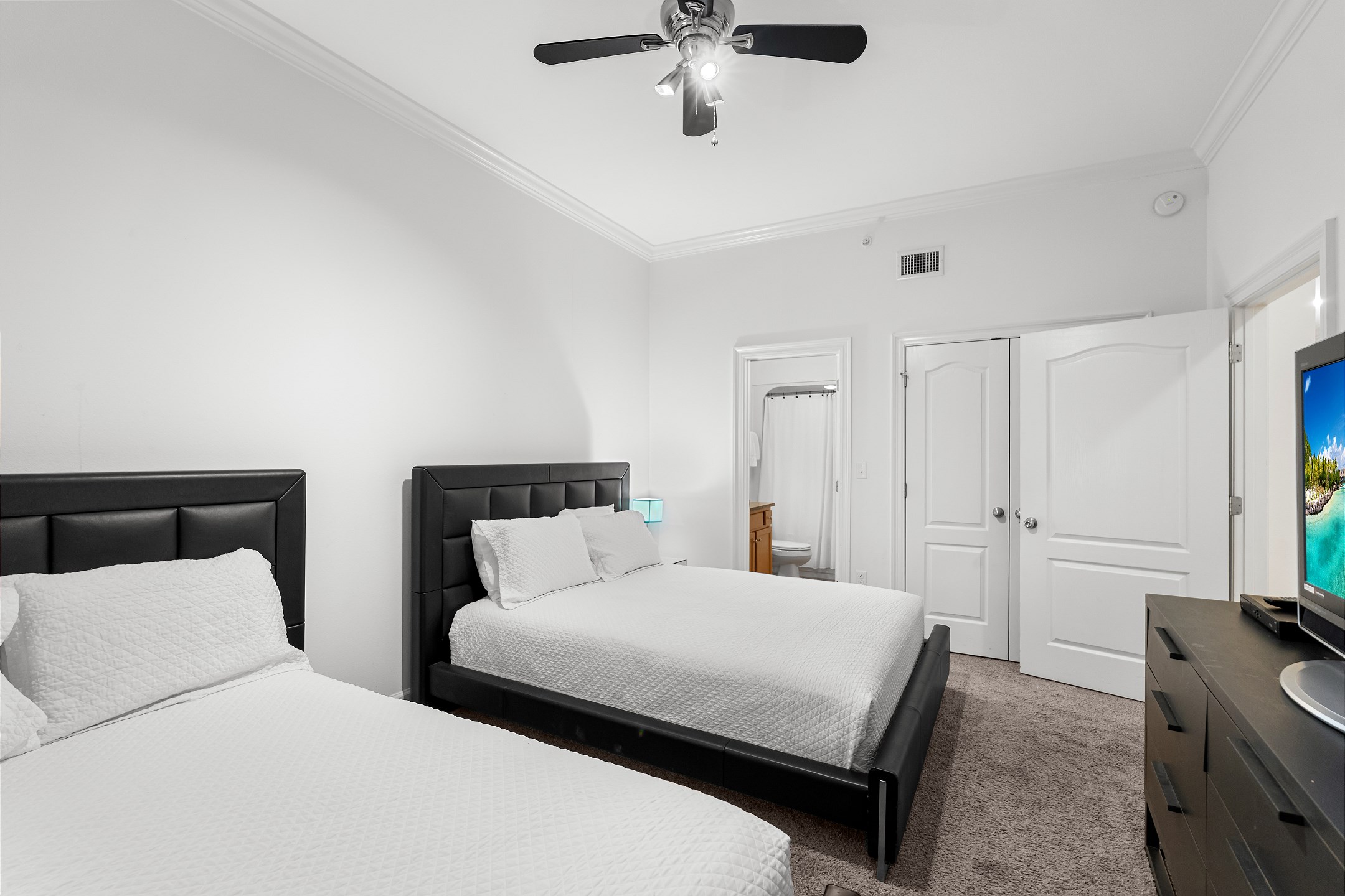 The primary bedroom offers a king bed, flat screen TV, and a luxurious ensuite bathroom with granite countertops, a dual sink vanity, a jacuzzi tub, and a walk in shower. The second bedroom also features a king bed, flat screen TV, and an ensuite bathroom with a shower and tub combination. The third bedroom includes two queen beds and an ensuite bathroom with a shower and tub combination. A full size washer and dryer are conveniently located in the laundry room, along with an additional full bathroom featuring a walk in shower.