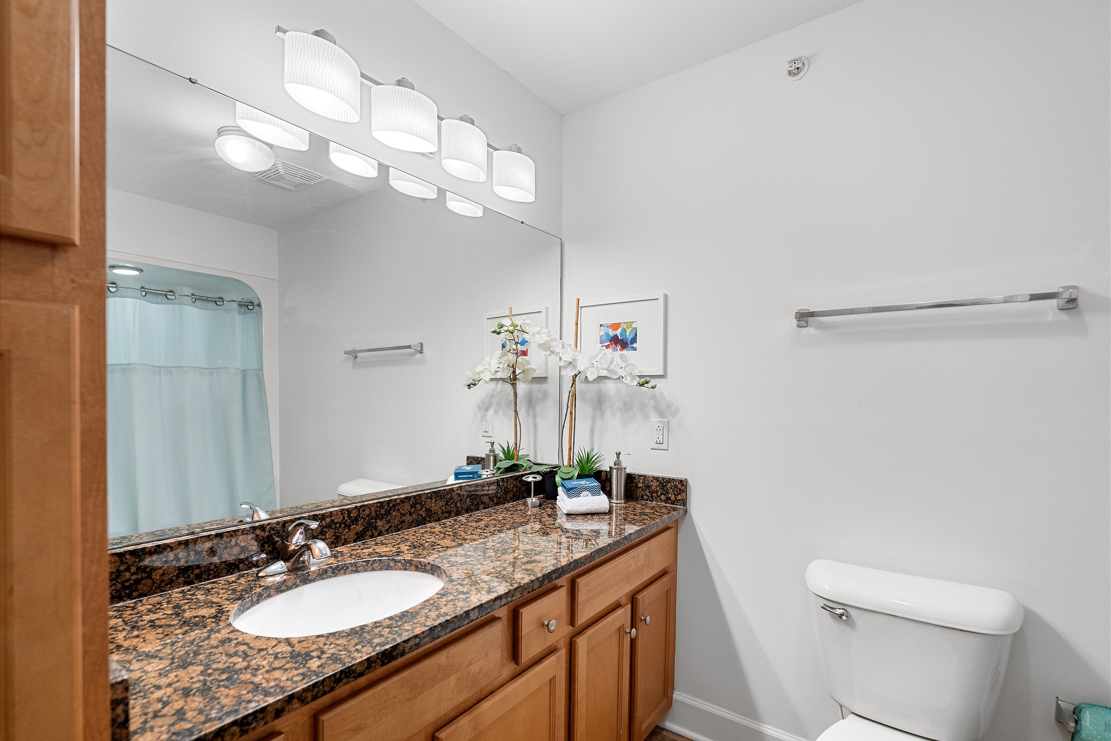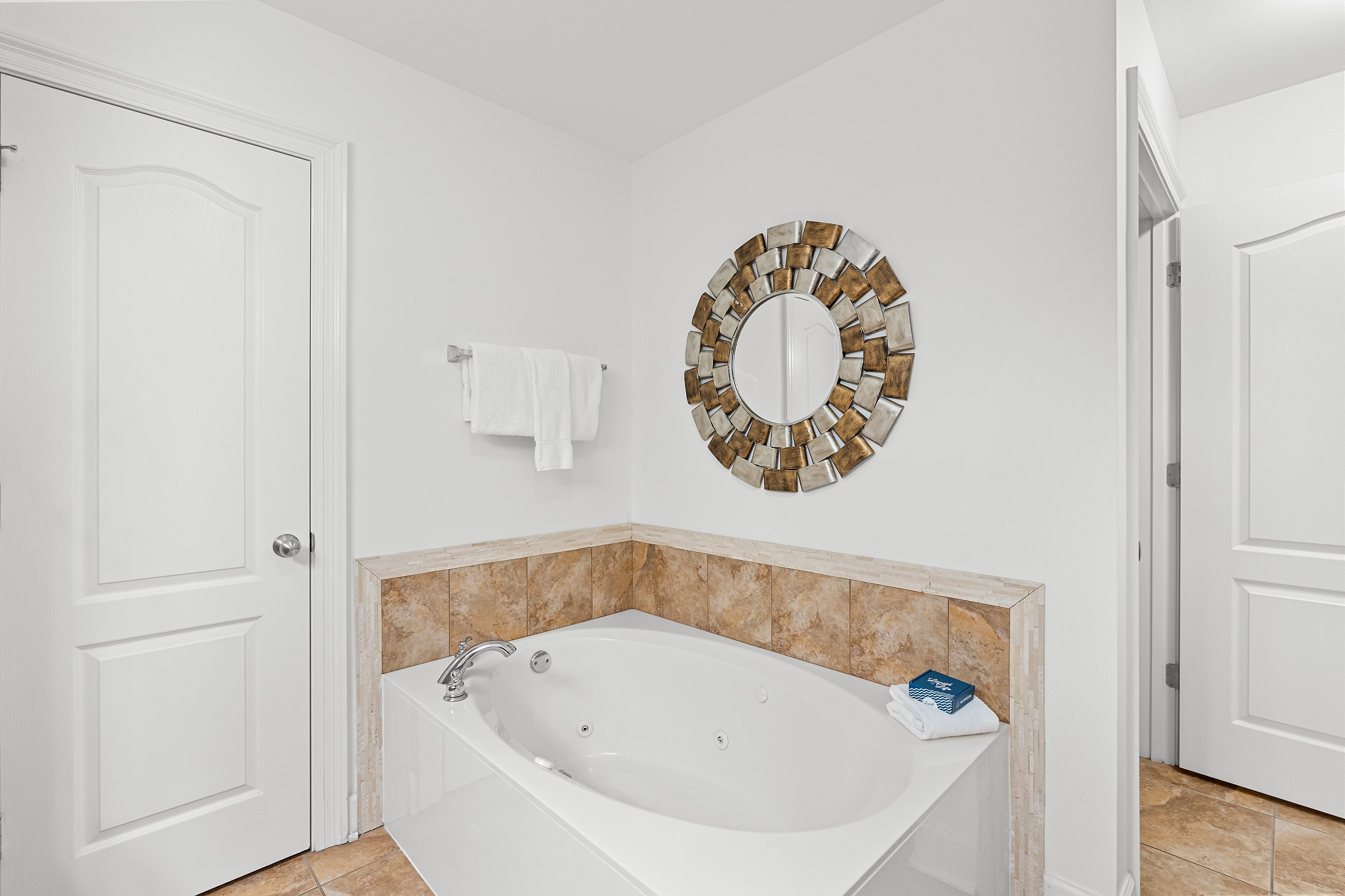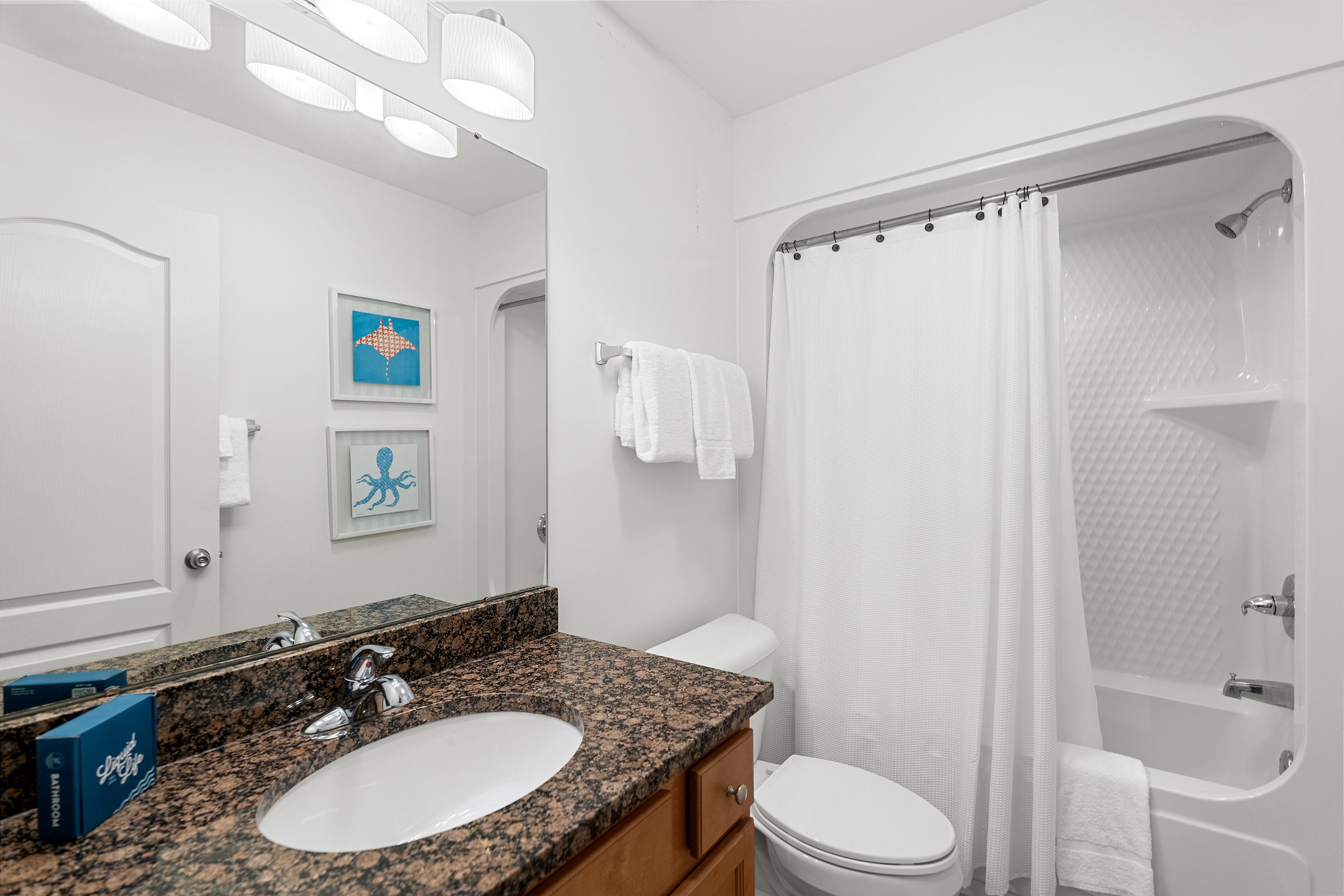 The primary bedroom offers a king bed, flat screen TV, and a luxurious ensuite bathroom with granite countertops, a dual sink vanity, a jacuzzi tub, and a walk in shower. The second bedroom also features a king bed, flat screen TV, and an ensuite bathroom with a shower and tub combination. The third bedroom includes two queen beds and an ensuite bathroom with a shower and tub combination. A full size washer and dryer are conveniently located in the laundry room, along with an additional full bathroom featuring a walk in shower.