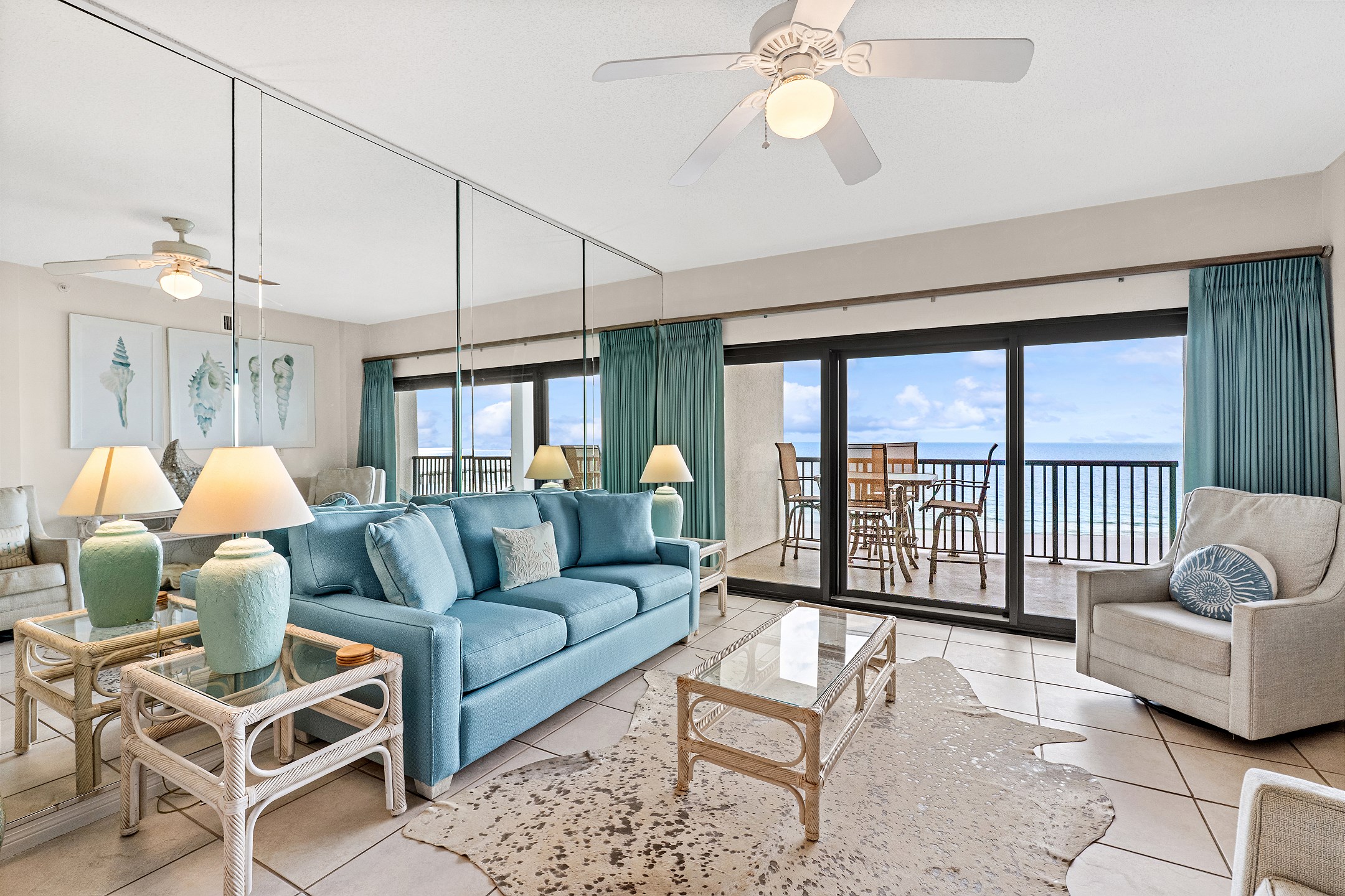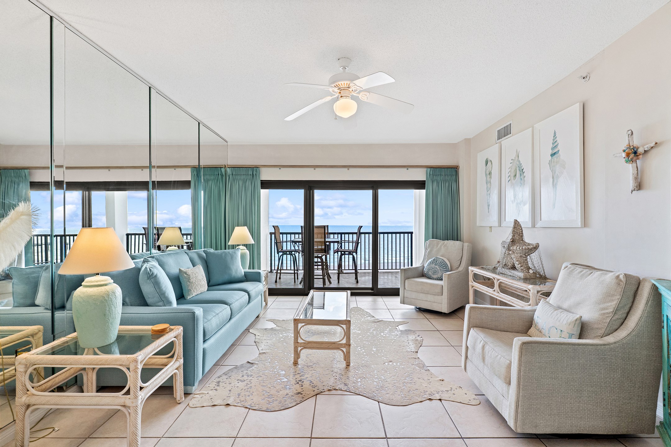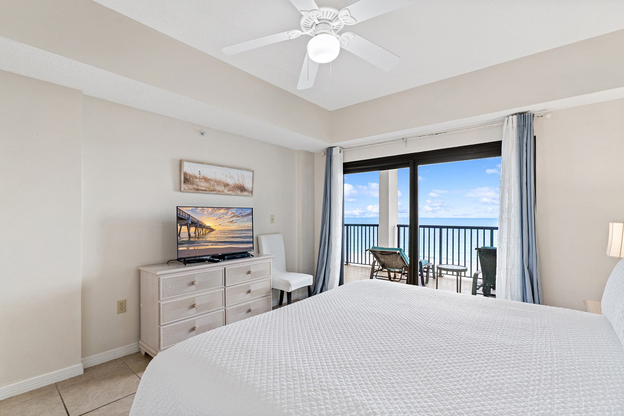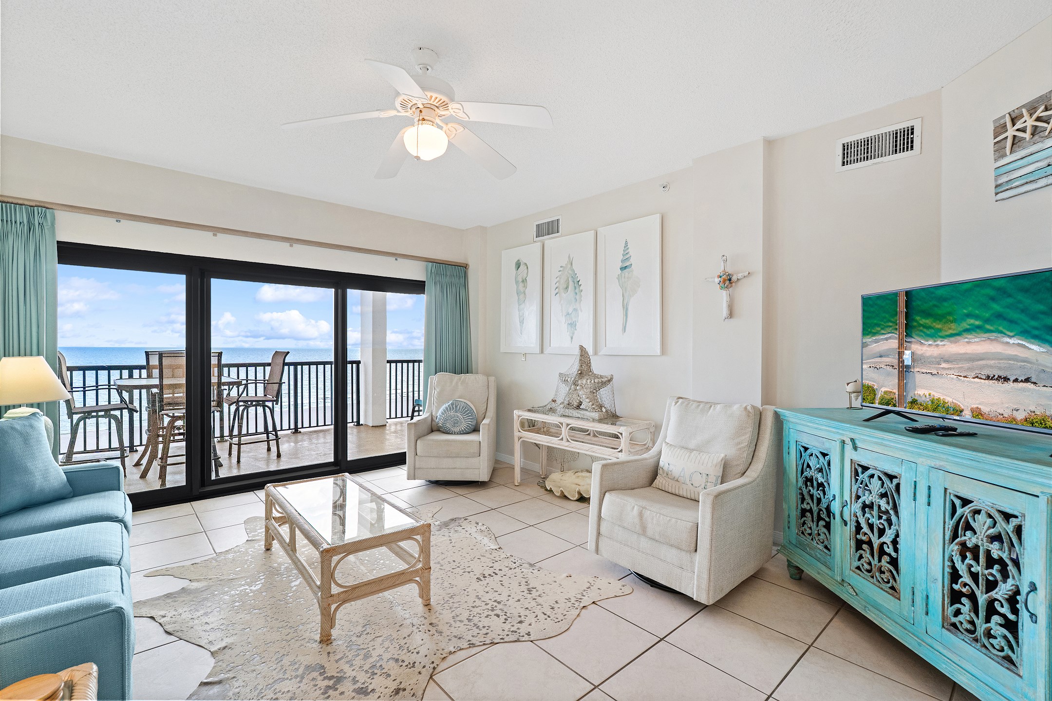 The living room, a cozy space for relaxation and socializing, includes a Queen sofa sleeper, expanding the condo's accommodation capacity to 6 people. Floor-to-ceiling doors open onto a huge private balcony, offering stunning views and a perfect spot for morning coffees or evening cocktails.