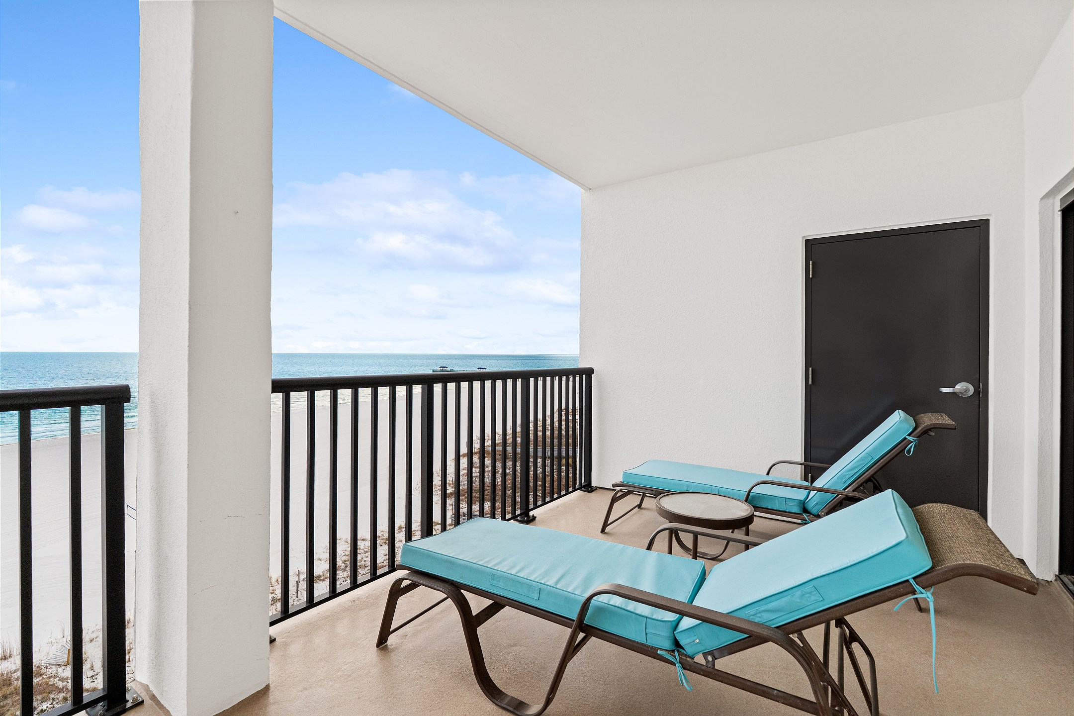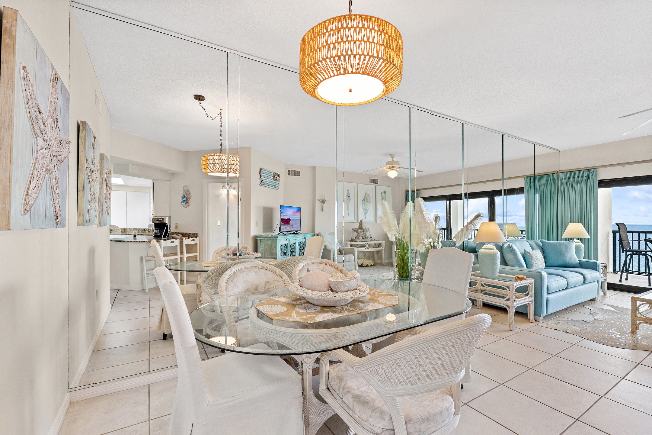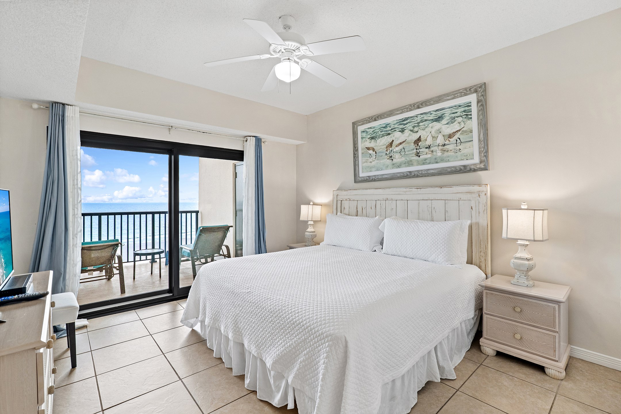 The living room, a cozy space for relaxation and socializing, includes a Queen sofa sleeper, expanding the condo's accommodation capacity to 6 people. Floor-to-ceiling doors open onto a huge private balcony, offering stunning views and a perfect spot for morning coffees or evening cocktails.