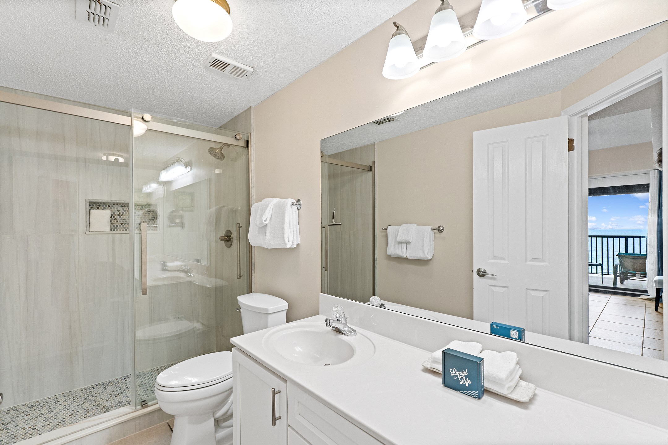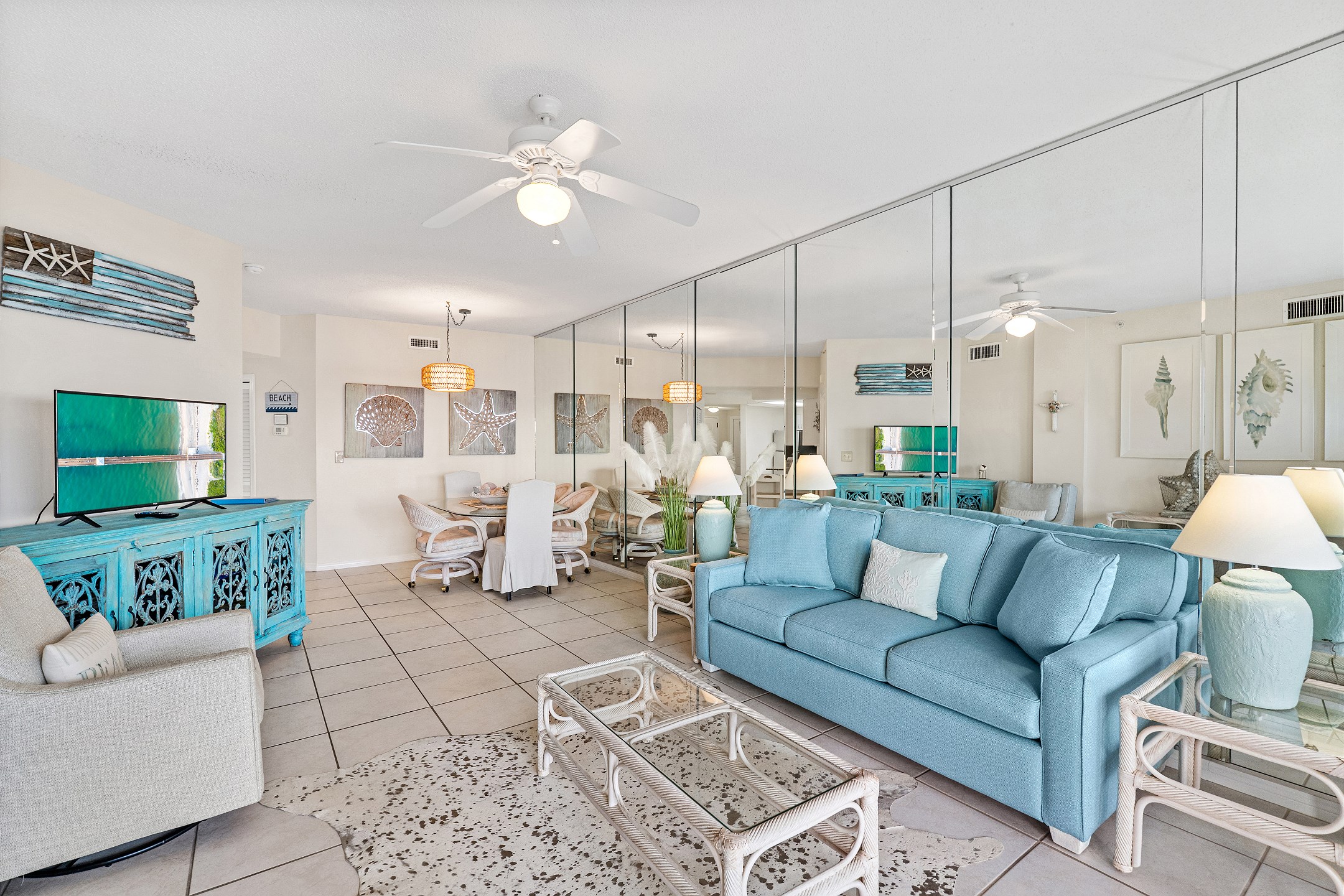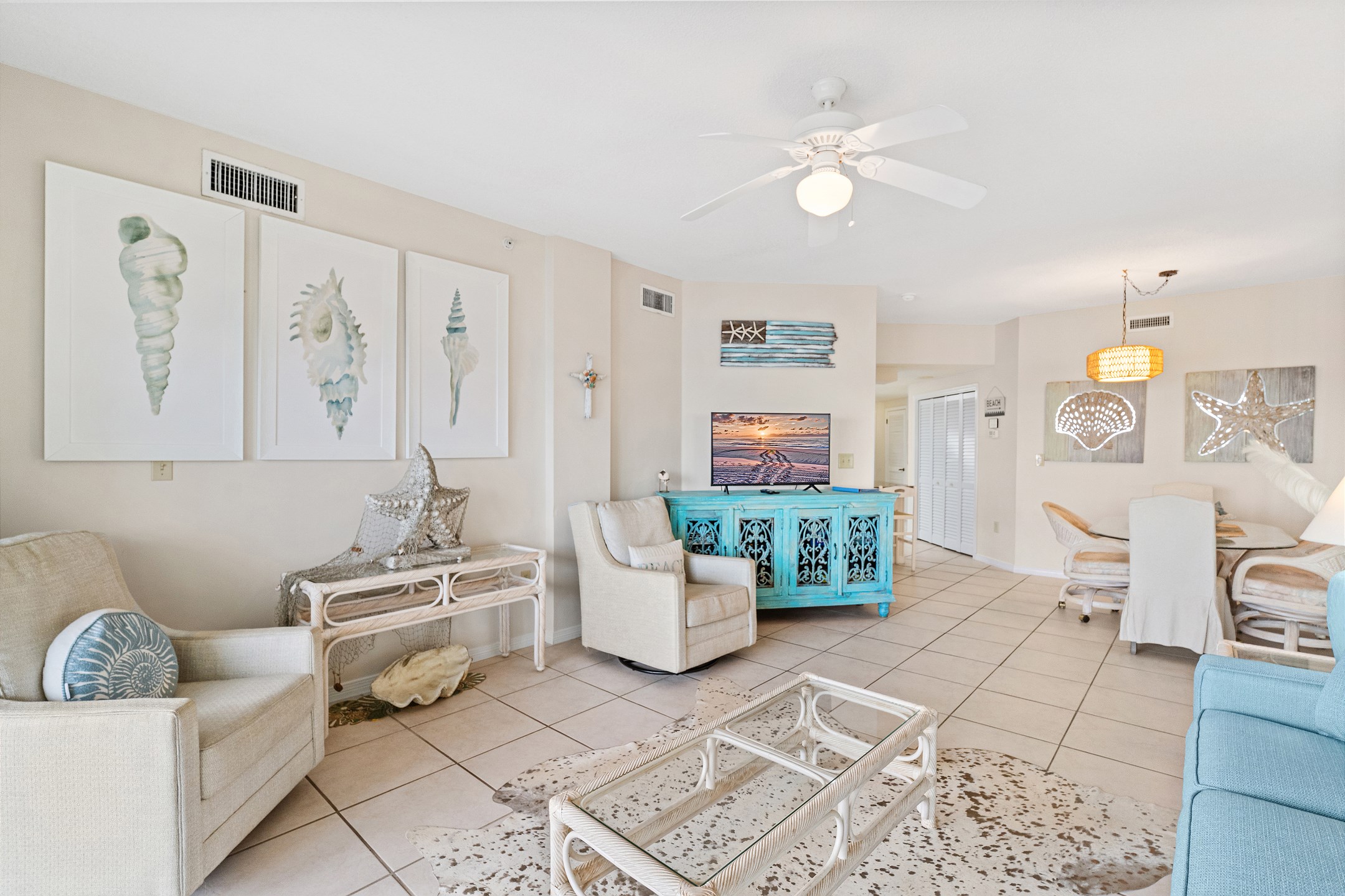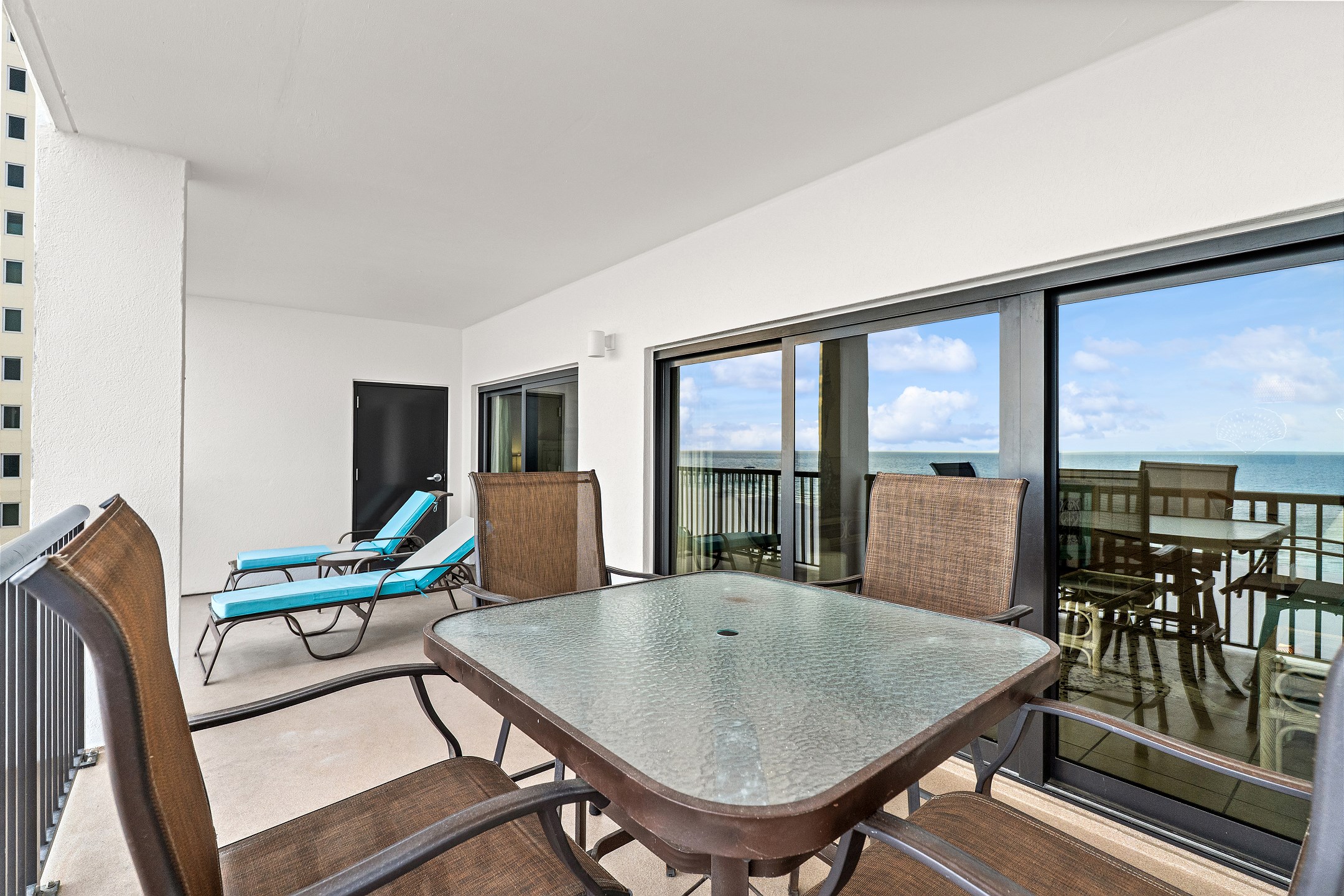 The living room, a cozy space for relaxation and socializing, includes a Queen sofa sleeper, expanding the condo's accommodation capacity to 6 people. Floor-to-ceiling doors open onto a huge private balcony, offering stunning views and a perfect spot for morning coffees or evening cocktails.