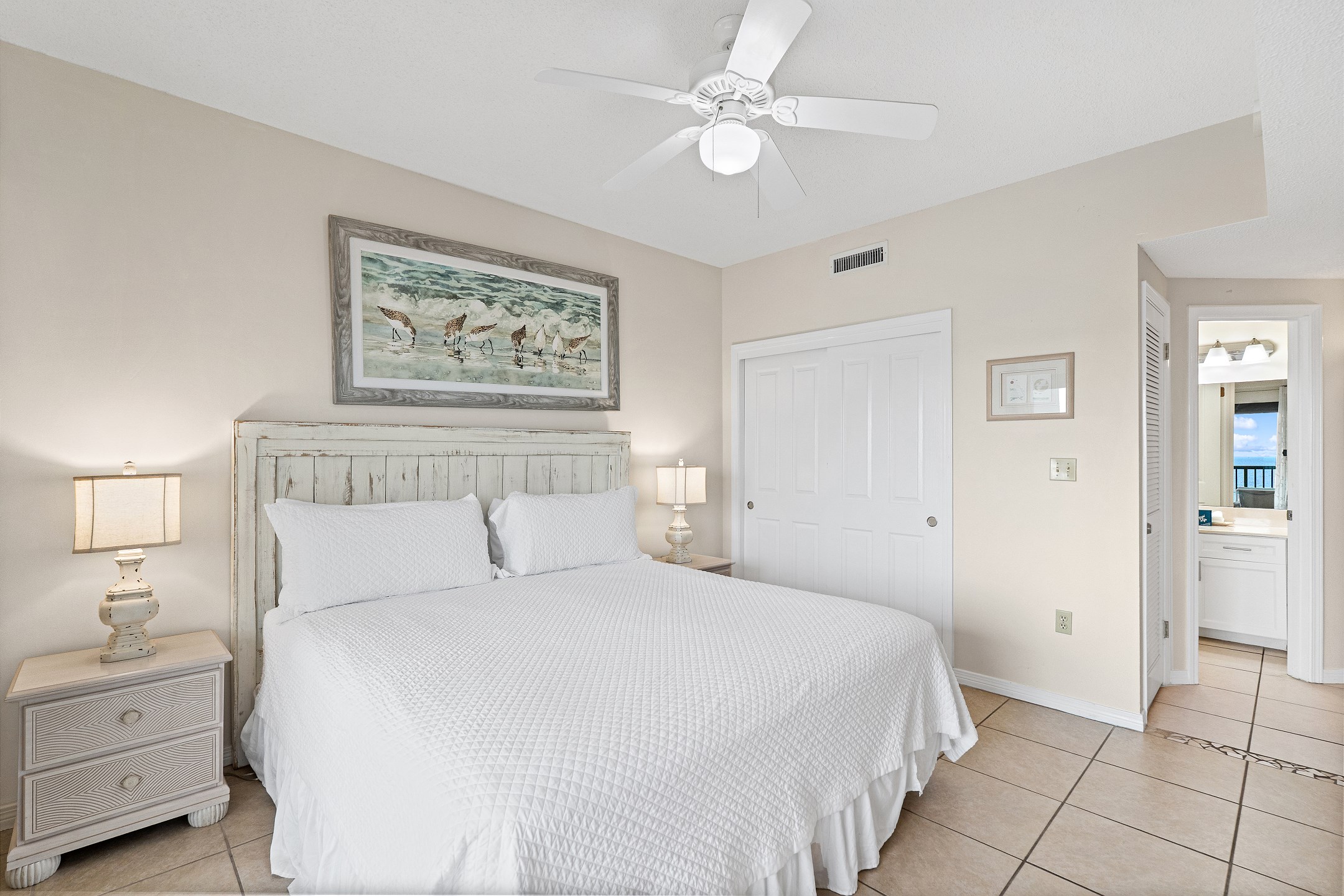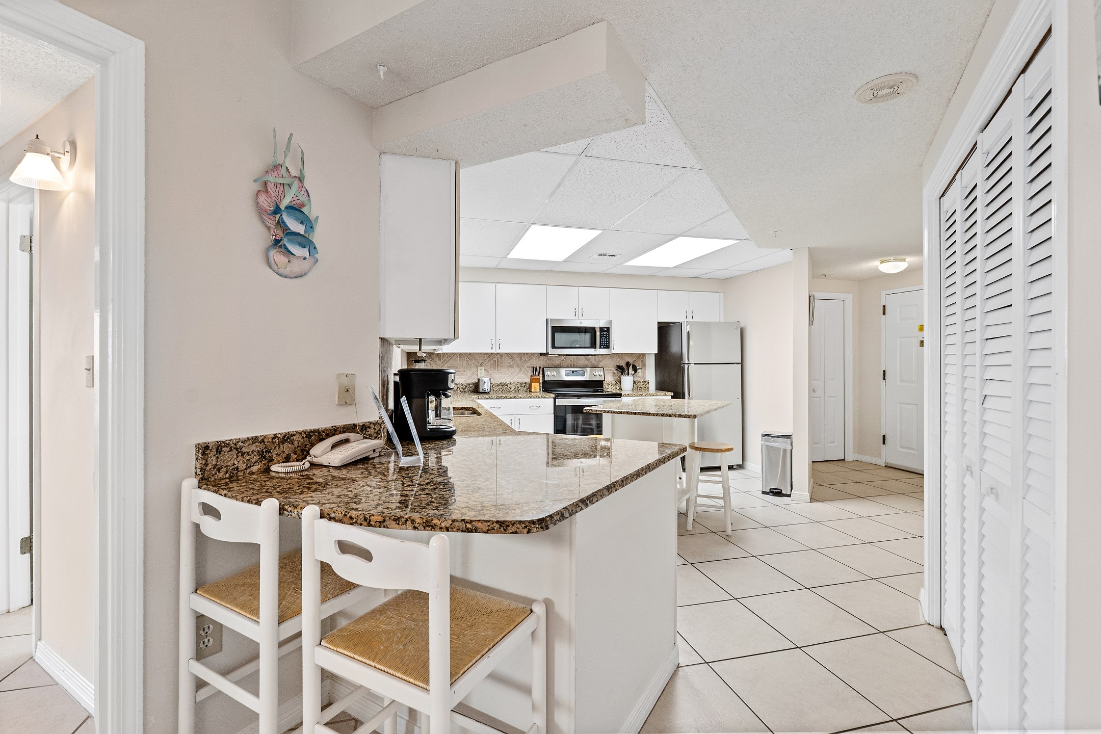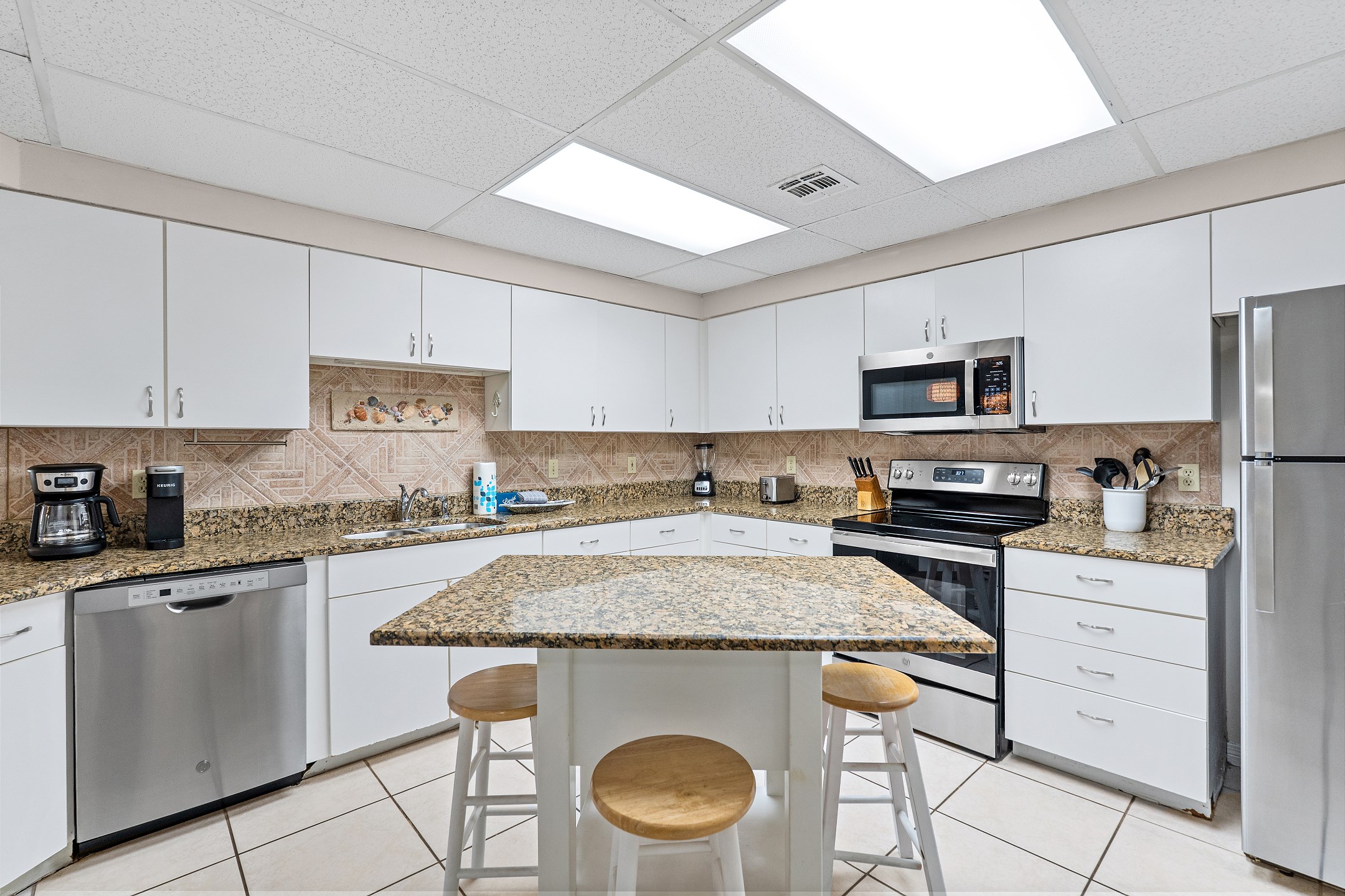 Whip up delicious meals in the fully equipped kitchen, complete with a Keurig coffee maker for your morning brew. The unit also boasts tile floors throughout, adding a touch of elegance and ease of maintenance.
